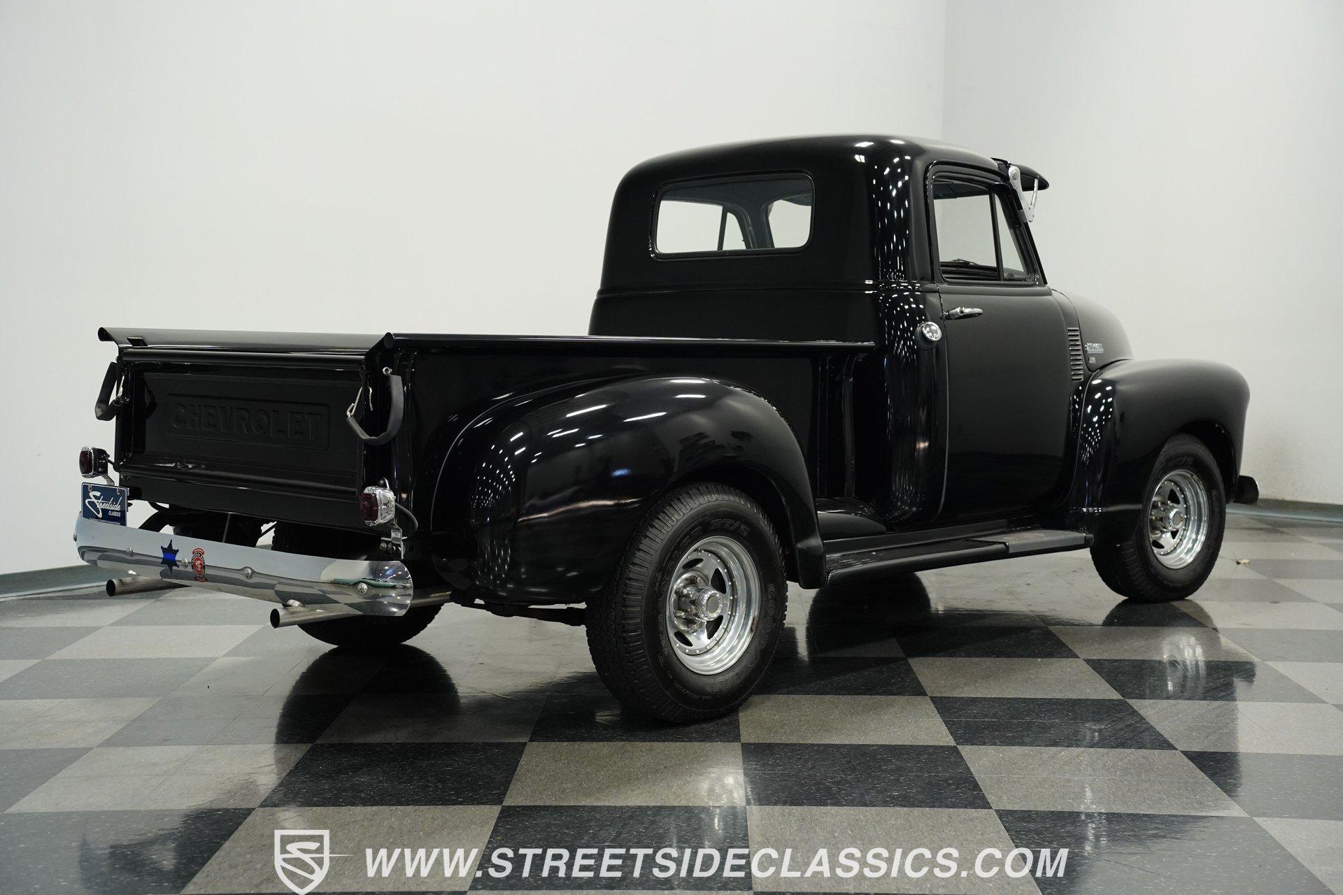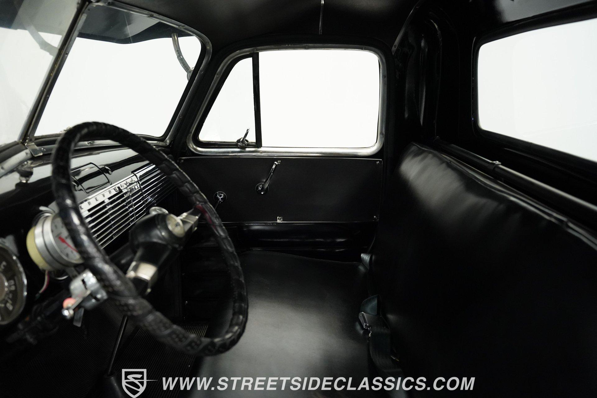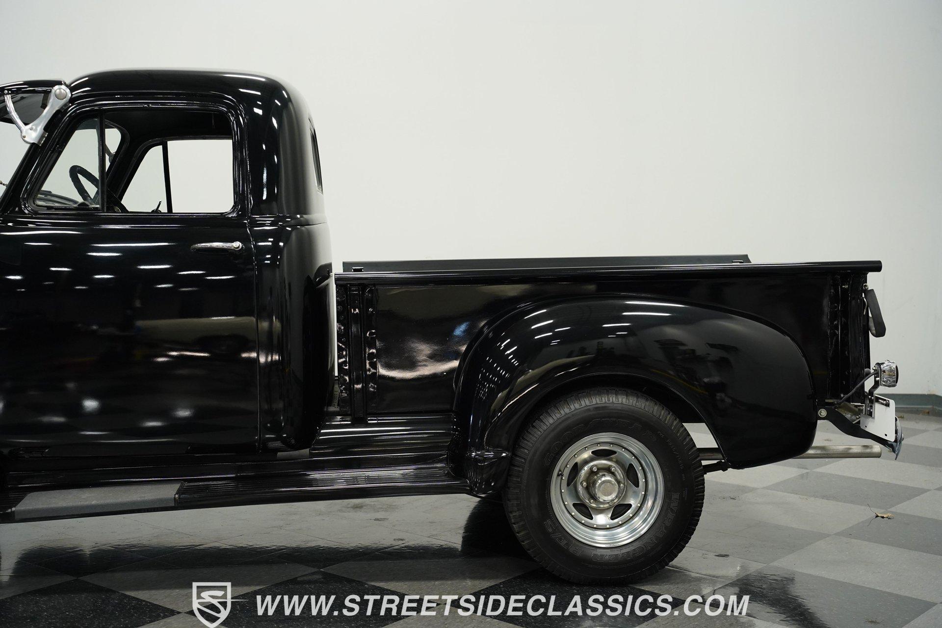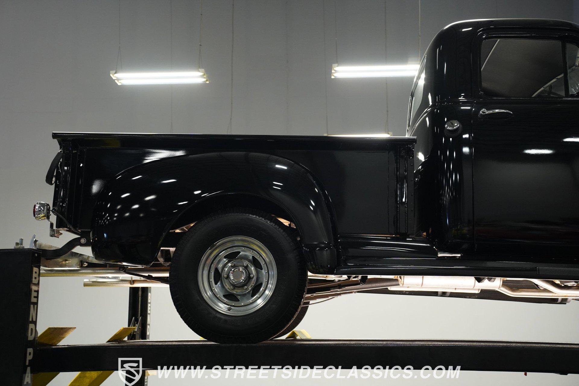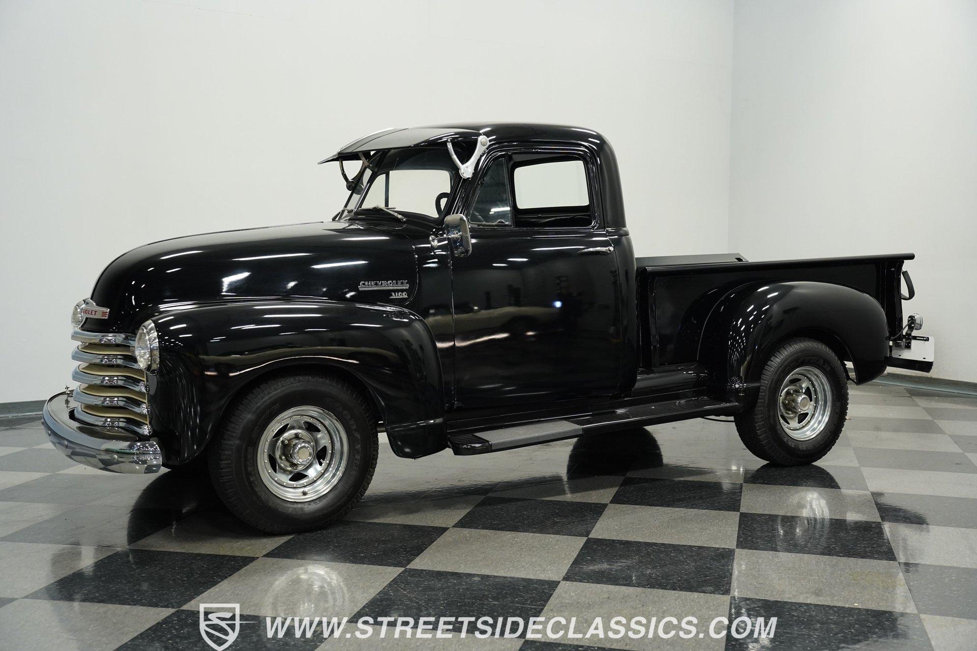 Restored to excellent condition in 2013, the 1952 Chevrolet 3100 pickup displays its black paint with remarkable clarity. Every body panel shows quality finish work, giving the truck a uniform appearance from front to back. An exterior sun visor shields the windshield, adding both function and period-correct style. The 15-inch aftermarket chrome wheels fit properly beneath the fenders, wrapped in P235/75R15 radial tires for improved roadholding. A fresh wood bed adds authentic detail to the rear, while all brightwork has been refreshed during restoration. The short bed design maintains original proportions while the overall look remains clean and direct. Black vinyl covers the bench seat, offering straightforward comfort in traditional pickup style. The dashboard keeps its factory layout while adding helpful upgrades for modern use. Extra instrumentation includes a tachometer mounted on the steering column plus auxiliary gauges below the dash for monitoring engine conditions. The floor houses a Lokar shifter for easy gear selection. The original-style steering wheel features a comfortable wrap, connecting directly to the manual steering for authentic road feel. Seatbelts add safety to the otherwise period-correct cabin. A 350 cubic inch V8 sits front and center, featuring a Holley 4-barrel carburetor for optimal fuel and air mixing. The engine bay shows attention to detail with clean, painted firewall and chrome valve covers. A 700R4 4-speed automatic transmission directs power to a later GM 12-bolt rear axle for improved durability. The dual exhaust system gives off an appropriate V8 sound. Power disc brakes handle stopping duties while the truck maintains its traditional character with leaf spring suspension both front and rear, supported by shock absorbers for better road control. HIGHLIGHTS: 350 V8 Engine 700R4 4-Speed Automatic Transmission Holley 4-Barrel Carburetor Power Disc Brakes Later GM 12-Bolt Rear Axle Dual Exhaust System Leaf Spring Suspension Shock Absorbers Black Paint 15" Chrome Wheels P235/75R15 Radial Tires Fresh Wood Bed Short Bed Exterior Sun Visor Black Interior With Bench Seat Floor-Mounted Lokar Shifter Tachometer On Steering Column Auxiliary Gauges Under Dash Wrapped Steering Wheel Seatbelts Handwritten Notes Of Restoration Process Classic truck styling with V8 power makes the 1952 Chevrolet 3100 an excellent addition to any collection. The updated mechanicals allow for regular use while the carefully restored exterior maintains original appeal. For truck enthusiasts looking for a solid early fifties Chevrolet with improved drivability, this pickup deserves consideration. Call today!
