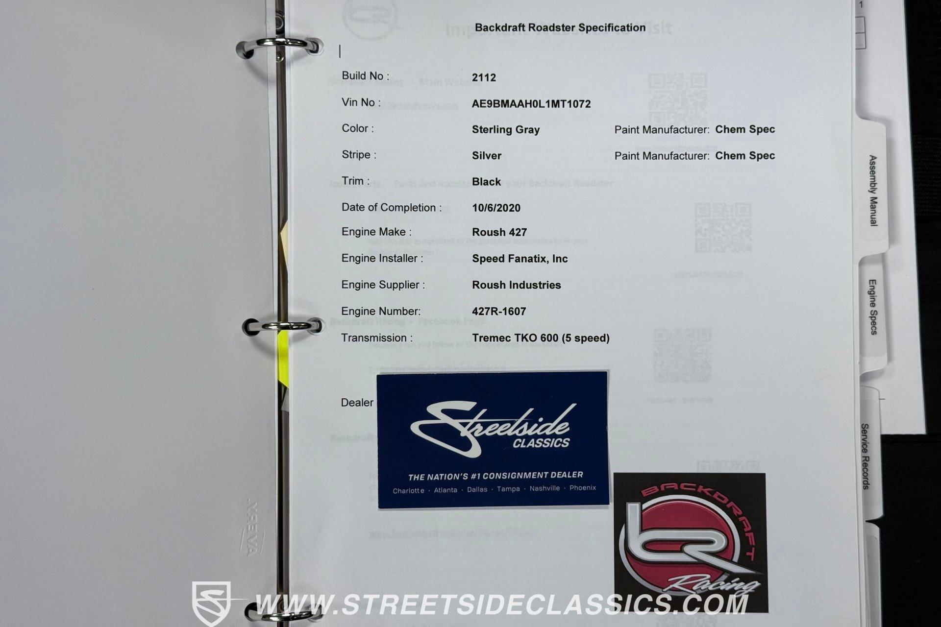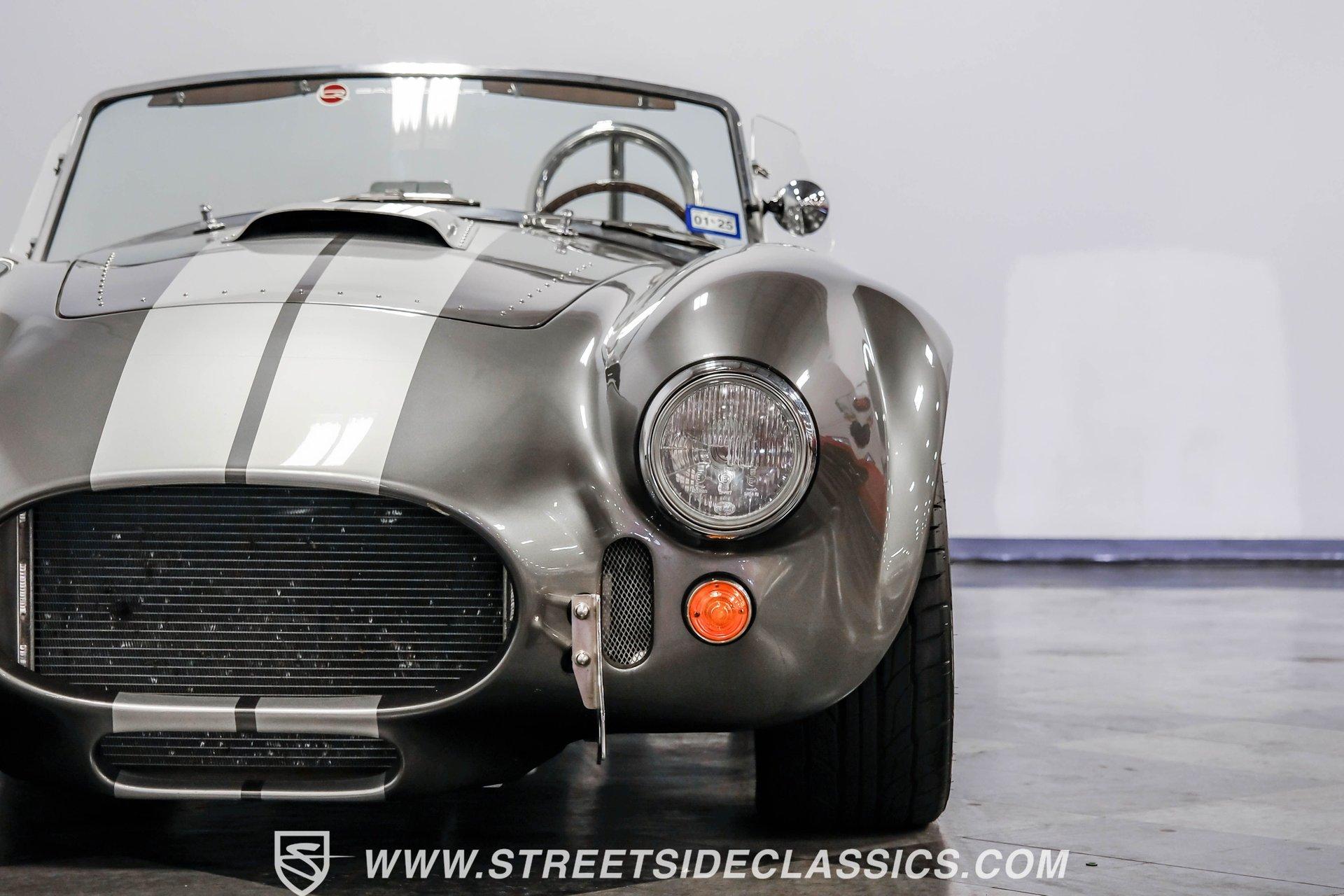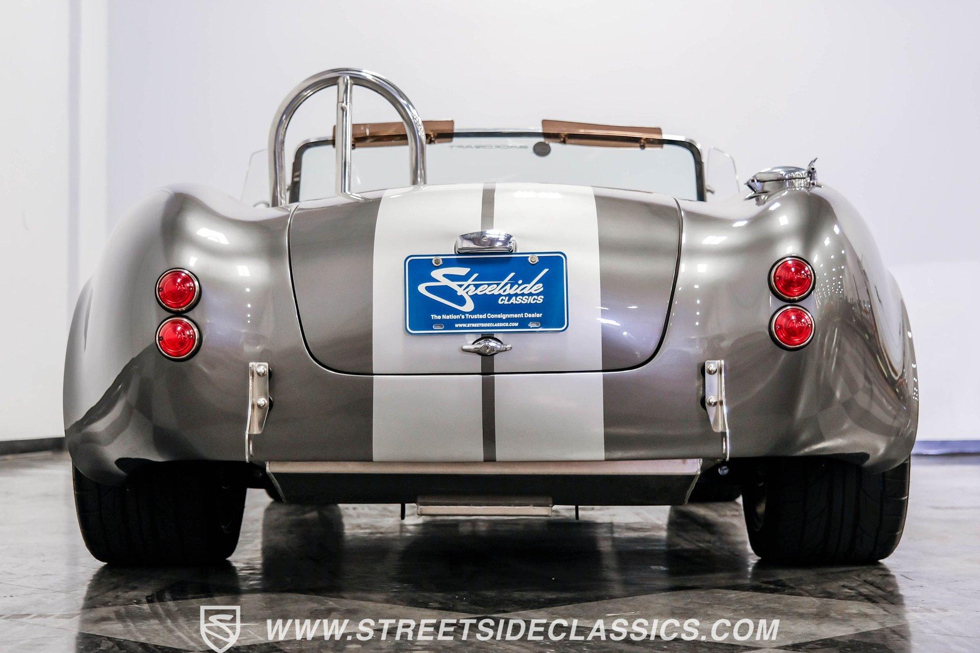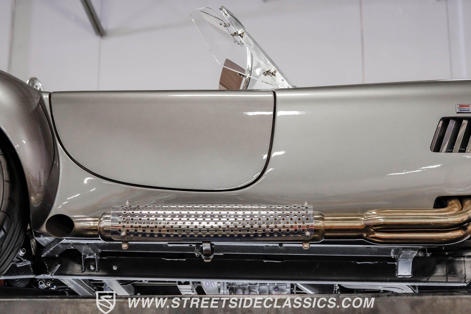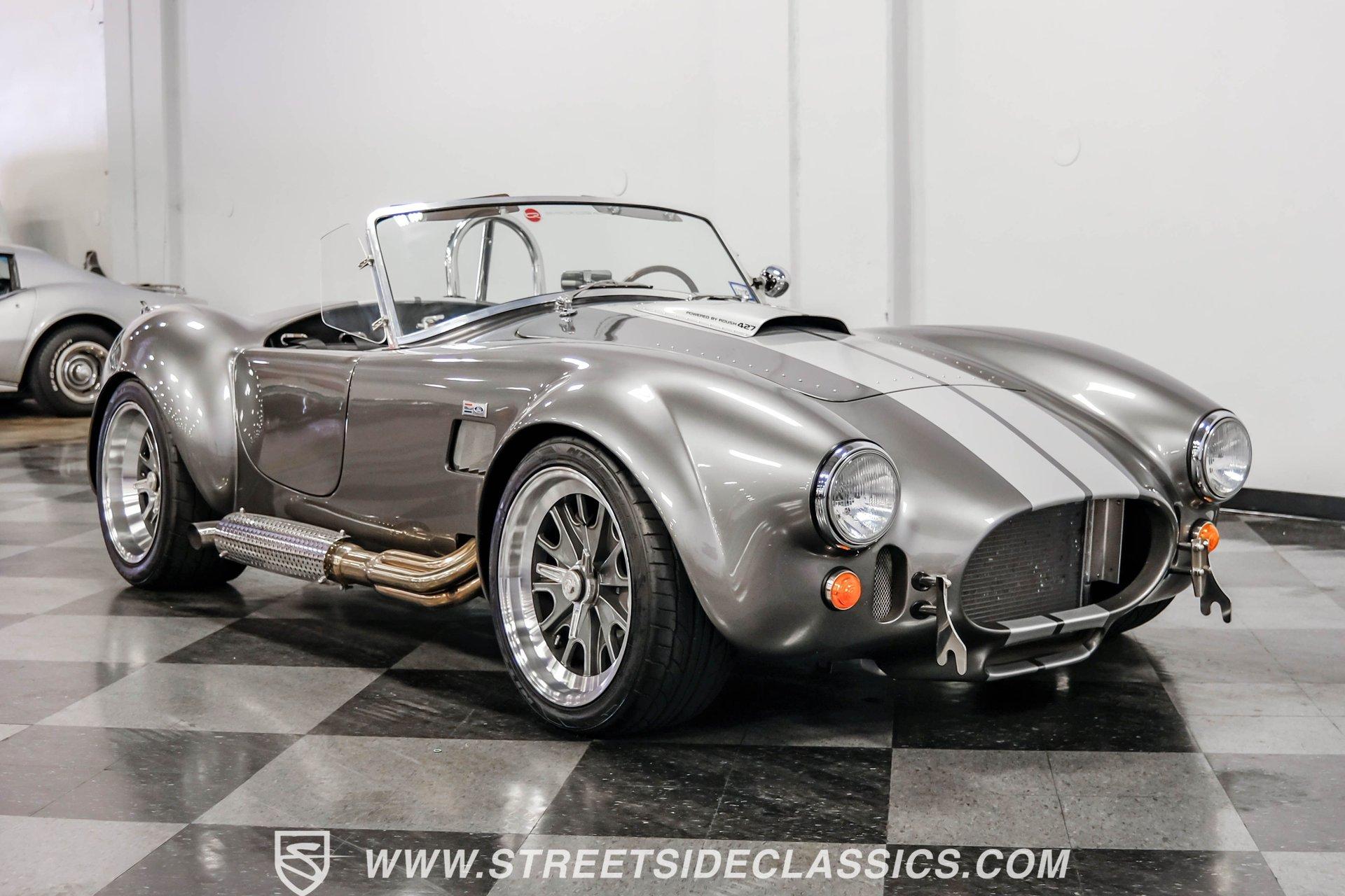 On the Mount Rushmore of historical muscle cars, Carroll Shelby's Cobra is so iconic it might deserve two out of the four available spots. The king of the vaunted 0-100-0 speed test for the better part of three decades, no car has authored more motorized fantasies than the Cobra. Which is why we are proud to present to you this Sterling Grey 1965 Shelby Cobra Backdraft 427, a factory-built tribute that is arguably better (in some respects) than the original. Pop open the relatively petite doors, and you'll first notice that the interior panel consists of a simple pull-strap and a side pocket, and that's it. The no-frills motif continues with a three-spoke steering wheel featuring a nicely contrasted custom wood-rimmed, while at the same time, a seven-pod AutoMeter gauge cluster takes up the majority of the dashboard. A large 8,000 rpm tachometer is centrally located, while the slightly smaller 180 mph speedometer is offset and reads in reverse, true to the original car's setup. Five smaller auxiliary gauges share space with a big red engine starter button begging to be pushed, while Sabelt racing harnesses keep you strapped into the black leather bucket seats. Don't bother looking for a radio, as all the harmony you need will be coming from those massive side pipes bellowing with authority. Under that signature front-hinged hood, we find an incredible Roush-built crate engine 427 R V-8 engine. Outfitted with lightweight aluminum heads and a performance cam, this big block is fed by a single Holley four-barrel carburetor covered by a large air cleaner proudly displaying the Roush name. Long tube headers connect to the aforementioned side pipes to efficiently dispel exhaust gases, enabling this motor to produce an incredible 554 horsepower and 529 pound-feet of torque. That massive power is routed through a Tremec TKO600 five-speed manual transmission, operated in traditional Cobra fashion by a forward-mounted gear shift before heading out to a Ford 8.8-inch rear end housing stout 3.55 gears to provide the perfect balance of off-the-line acceleration and reasonable fuel efficiency on the highway. Roush 427R V8 554 HP & 529 Pound Feet Holley Four Barrel Long Tubes Side Pipes Tremec TKO500 Five Speed 8.8 Inch Rear 3.55 Rear Gears Fully Independent Suspension Coilovers Four Wheel Disc Brakes Knock Off Wheels Nitto Tires Build Book / Owner's Manual Maintenance Records Unlike the original car, this modern 1965 Shelby Cobra Backdraft 427 features a fully independent suspension with coilovers at all four corners. A set of power disc brakes hides behind the 18-inch wheels, which utilize real knock-off center caps and are shod in low-profile Nitto rubber measuring 245/40R-18 up front and wider 295/40R-18 in the rear. While the original Shebly Cobras are skyrocketing in price well beyond most people's disposable cash income level, this Backdraft 427 offers up everything that made the original car special. It combines it with the benefits of modern technology to make it an even more well-rounded performer than could be had sixty years ago. Don't wait, call today! *Please note this car is being sold with a clear Texas title and is titled as a 2020 Roadster w/ the Remarks: Replica 1965 Roadster