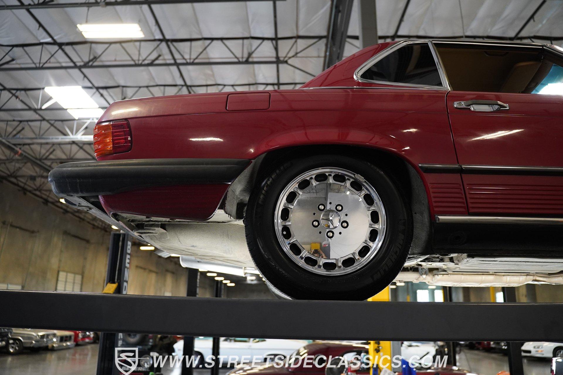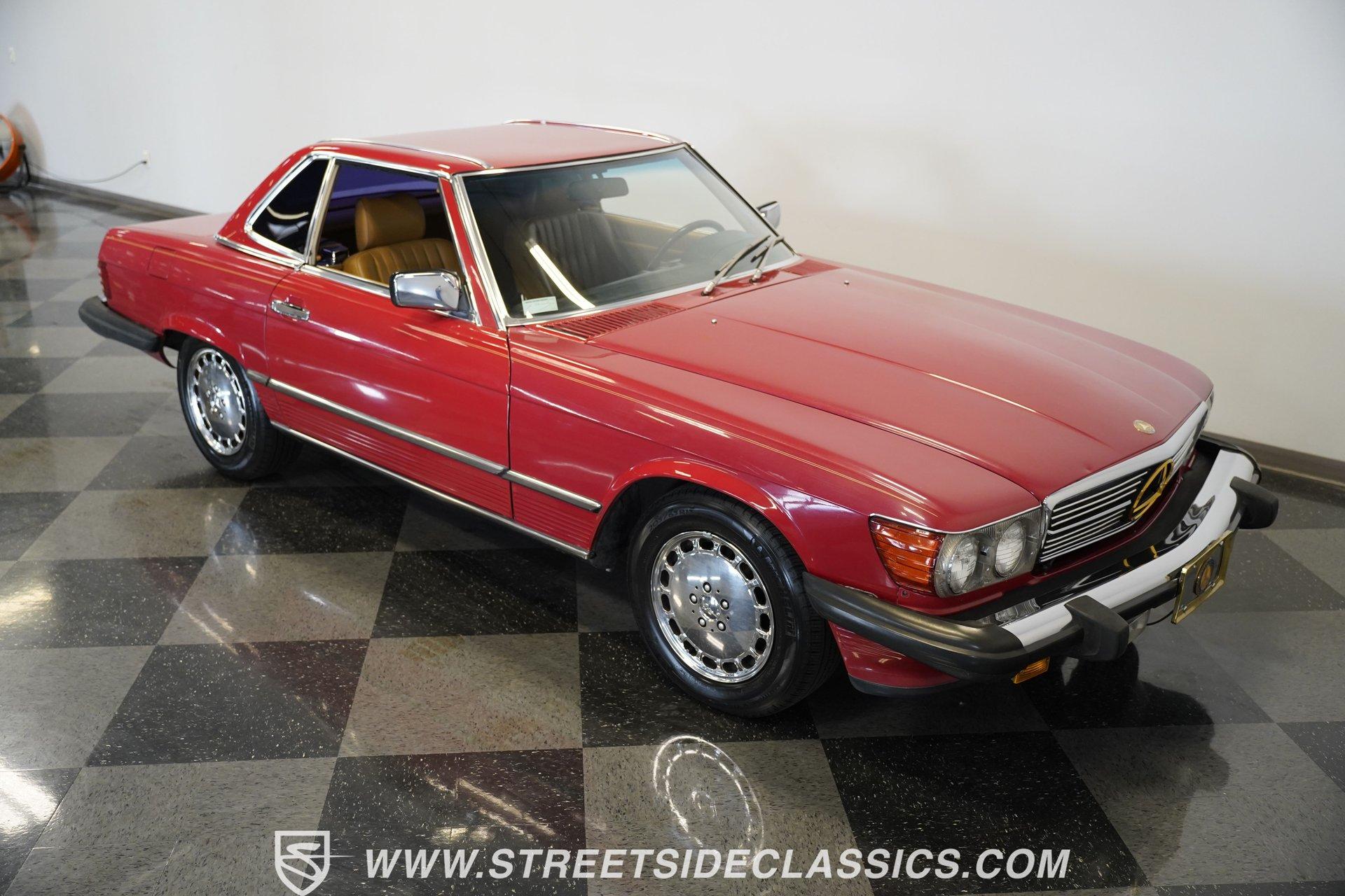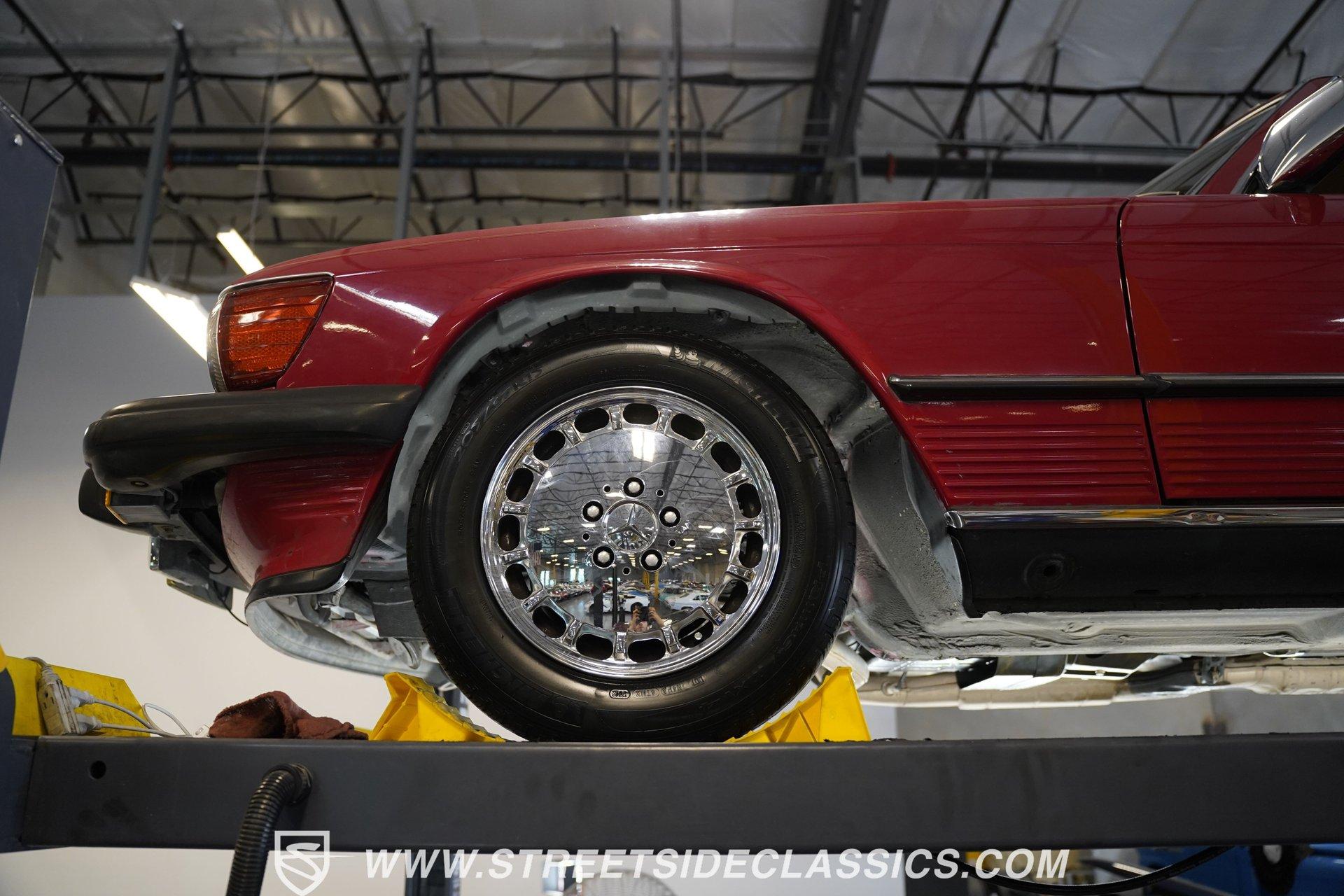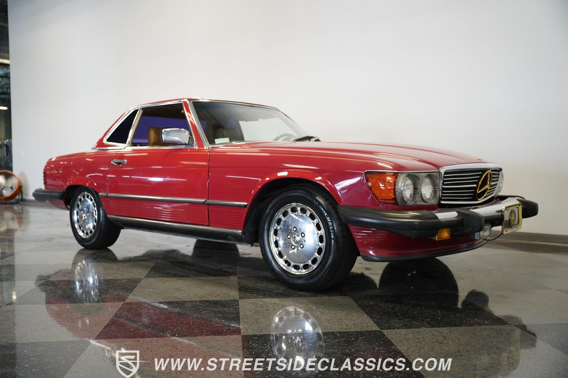 This 1989 Mercedes-Benz 560SL is a styling icon. When Mercedes redesigned its famed SL in 1971, there was a lot of equity behind it – after all, when the incomparable 300SL Coupe and Roadster were built fewer than 20 years before, they set the world on fire. The next-generation 230/250/280SL in 1963 brought Mercedes' sports car down to Earth, replacing both the incredible 300SL and four-cylinder 190SL. For the next SL, Mercedes started with the chassis of the mid-size "W114/115" model and added the motors from the large "W116" S-Class. The result was a luxurious V8 Convertible that ended up being the longest passenger car series ever produced by Mercedes-Benz to date. Despite its age, the final iteration, the 560SL, remained a prized automotive status symbol and an iconic part of the brand's lineup. This 1989 Mercedes-Benz 560SL exudes classic German engineering in its handsome Signal Red exterior. The bold lines and iconic styling define this roadster's presence. Its factory 15-inch alloy wheels wrapped in 205/60R15 Michelin tires provide a solid foundation. The canvas soft top and Signal Red removable hardtop offer versatile driving options. Gold pinstripes add a subtle accent to the timeless design. Luxurious Tan leather upholstery covers the bucket seats creating an inviting cabin atmosphere. The center console features wood accents, adding warmth to the interior. The black dash houses clear gauges, while the upgraded Pioneer AM/FM/CD radio with Bluetooth provides cruising music. Power windows and a well-appointed interior enhance the driving experience. Mercedes' potent 5.6L V8 engine powers this 560SL, working in tandem with a 3-speed automatic transmission. The engine compartment maintains an original appearance. Fuel injection, power steering, and four-wheel disc brakes deliver confident performance. This well-maintained classic Mercedes is ready for many more years of enjoyment. HIGHLIGHTS: 5.6L V8 Engine 3-Speed Automatic Transmission Fuel Injection Power Steering 4-Wheel Disc Brakes Signal Red Paint 15-Inch Factory Alloy Wheels Canvas Soft Top Removable Hardtop Tan Leather Upholstery Bucket Seats Power Windows Air Conditioning Pioneer AM/FM/CD/Bluetooth Radio Carpeted Trunk This 1989 Mercedes-Benz 560SL combines iconic styling, V8 power, and open-top driving. With its elegant Burgundy paint and iconic styling, this classic Benz offers reliable German engineering and enduring luxury. Call today!