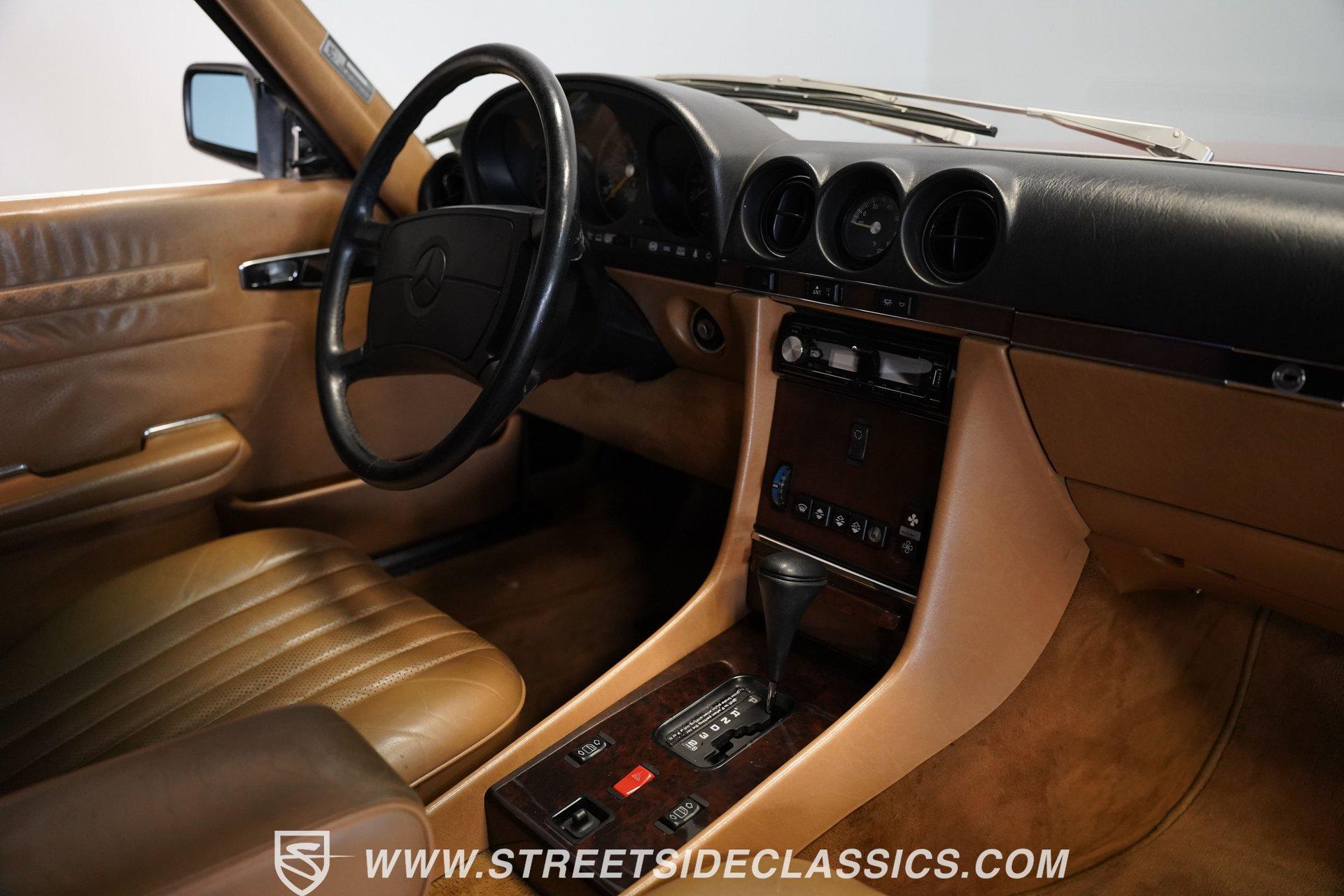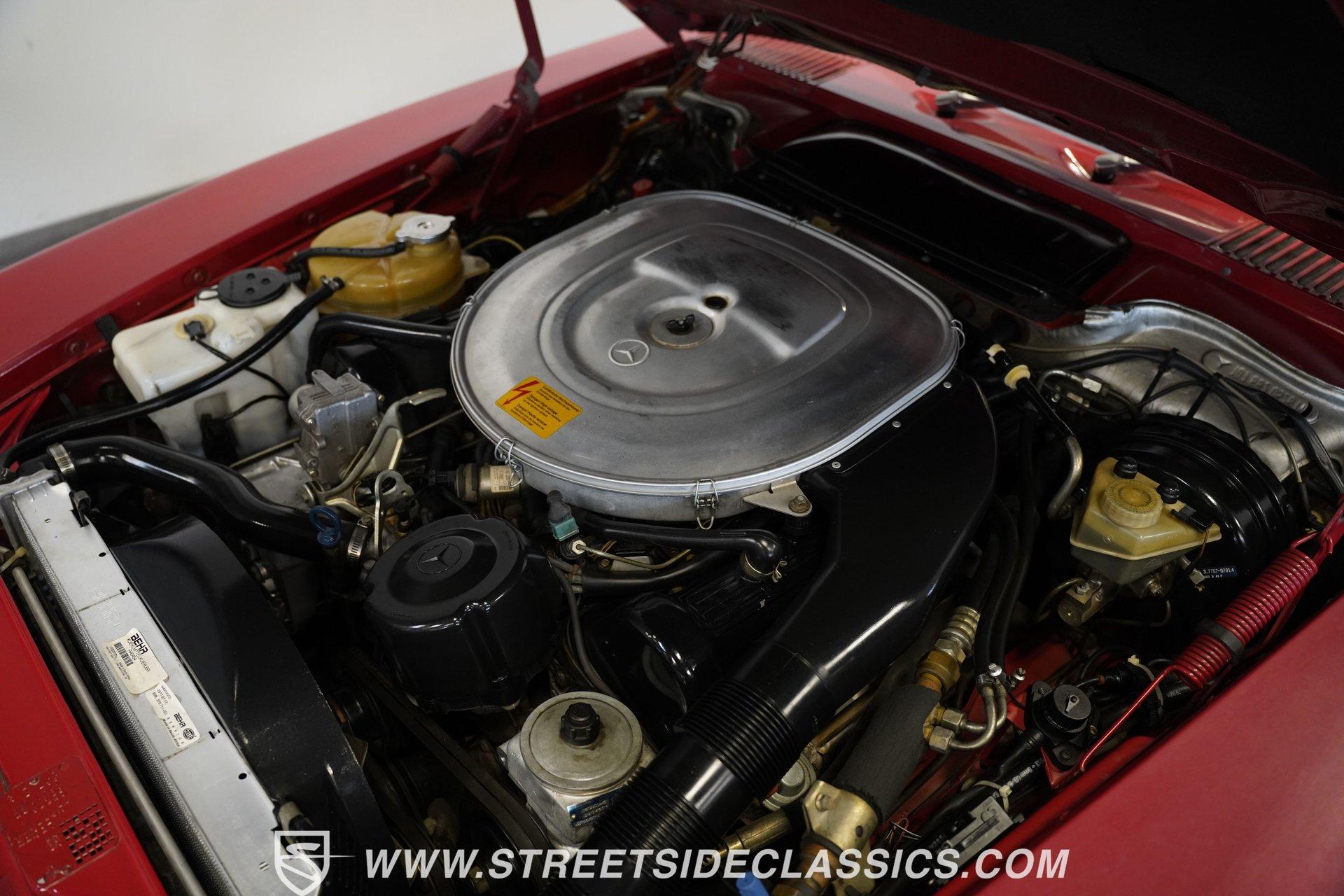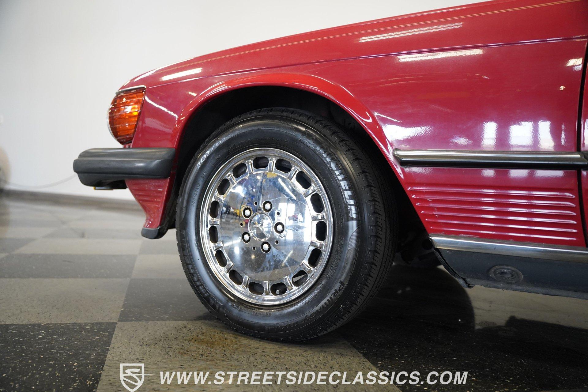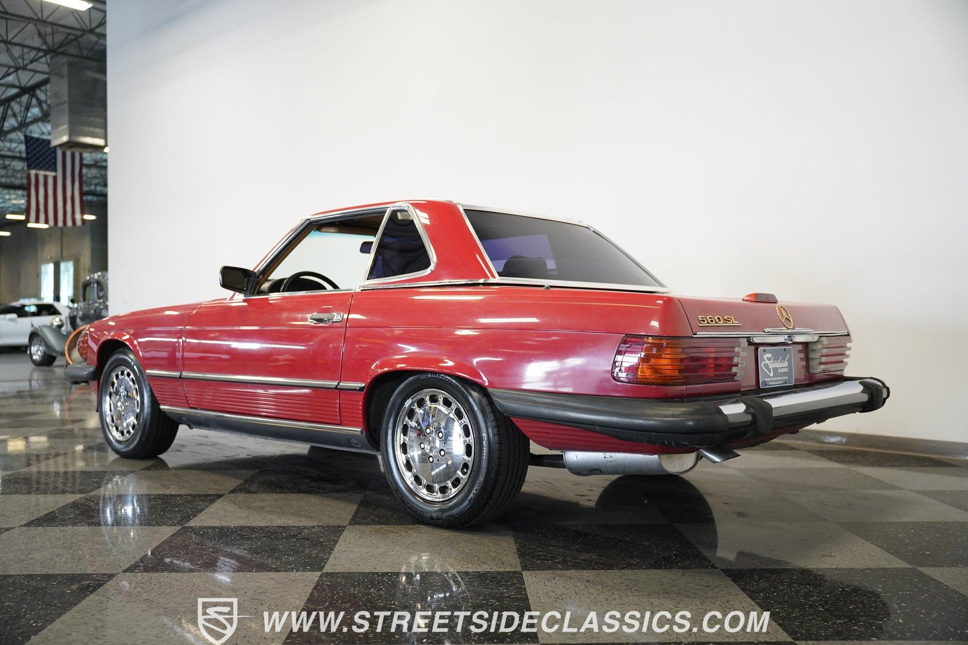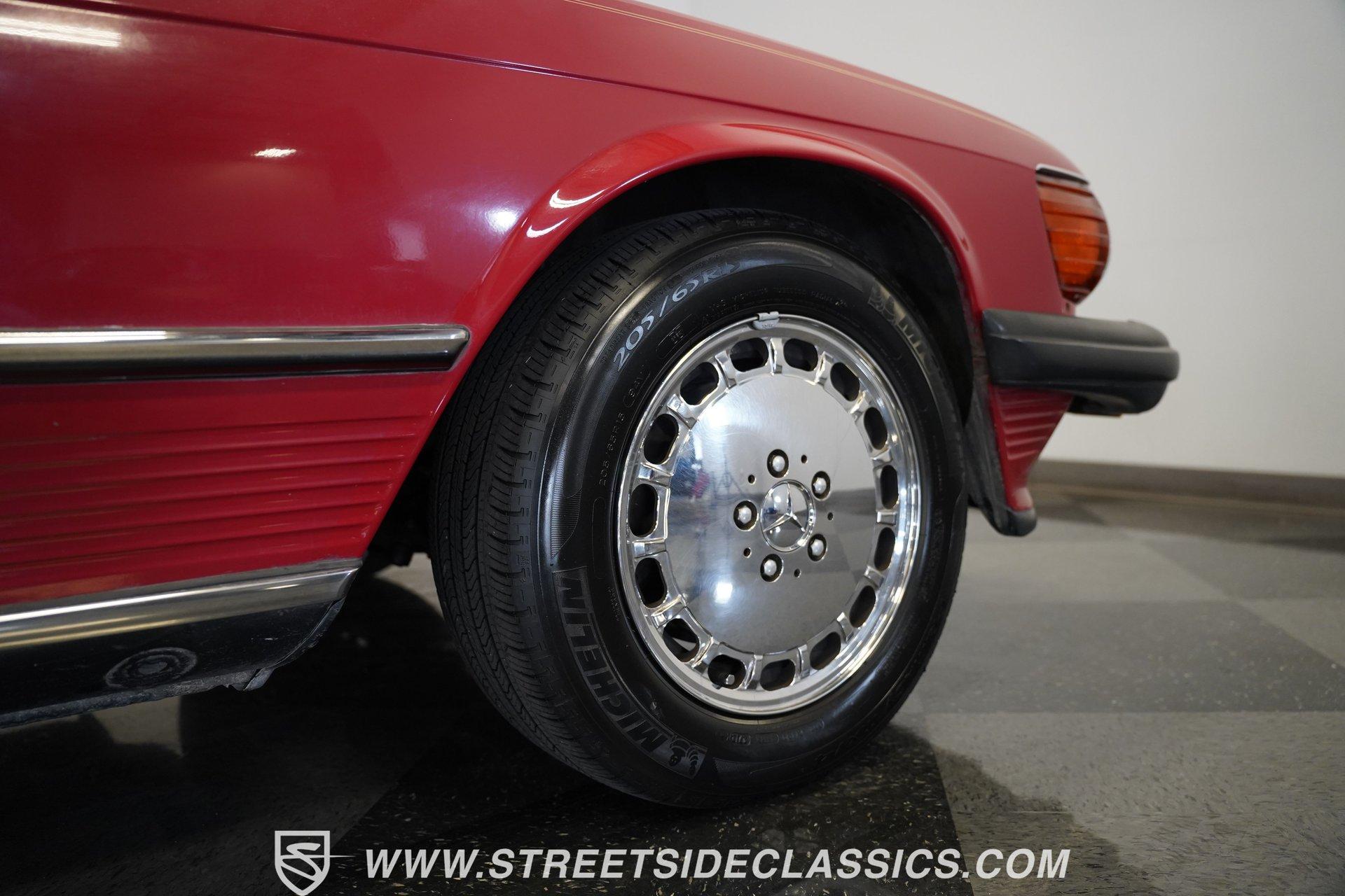 This 1989 Mercedes-Benz 560SL is a styling icon. When Mercedes redesigned its famed SL in 1971, there was a lot of equity behind it – after all, when the incomparable 300SL Coupe and Roadster were built fewer than 20 years before, they set the world on fire. The next-generation 230/250/280SL in 1963 brought Mercedes' sports car down to Earth, replacing both the incredible 300SL and four-cylinder 190SL. For the next SL, Mercedes started with the chassis of the mid-size "W114/115" model and added the motors from the large "W116" S-Class. The result was a luxurious V8 Convertible that ended up being the longest passenger car series ever produced by Mercedes-Benz to date. Despite its age, the final iteration, the 560SL, remained a prized automotive status symbol and an iconic part of the brand's lineup. This 1989 Mercedes-Benz 560SL exudes classic German engineering in its handsome Signal Red exterior. The bold lines and iconic styling define this roadster's presence. Its factory 15-inch alloy wheels wrapped in 205/60R15 Michelin tires provide a solid foundation. The canvas soft top and Signal Red removable hardtop offer versatile driving options. Gold pinstripes add a subtle accent to the timeless design. Luxurious Tan leather upholstery covers the bucket seats creating an inviting cabin atmosphere. The center console features wood accents, adding warmth to the interior. The black dash houses clear gauges, while the upgraded Pioneer AM/FM/CD radio with Bluetooth provides cruising music. Power windows and a well-appointed interior enhance the driving experience. Mercedes' potent 5.6L V8 engine powers this 560SL, working in tandem with a 3-speed automatic transmission. The engine compartment maintains an original appearance. Fuel injection, power steering, and four-wheel disc brakes deliver confident performance. This well-maintained classic Mercedes is ready for many more years of enjoyment. HIGHLIGHTS: 5.6L V8 Engine 3-Speed Automatic Transmission Fuel Injection Power Steering 4-Wheel Disc Brakes Signal Red Paint 15-Inch Factory Alloy Wheels Canvas Soft Top Removable Hardtop Tan Leather Upholstery Bucket Seats Power Windows Air Conditioning Pioneer AM/FM/CD/Bluetooth Radio Carpeted Trunk This 1989 Mercedes-Benz 560SL combines iconic styling, V8 power, and open-top driving. With its elegant Burgundy paint and iconic styling, this classic Benz offers reliable German engineering and enduring luxury. Call today!