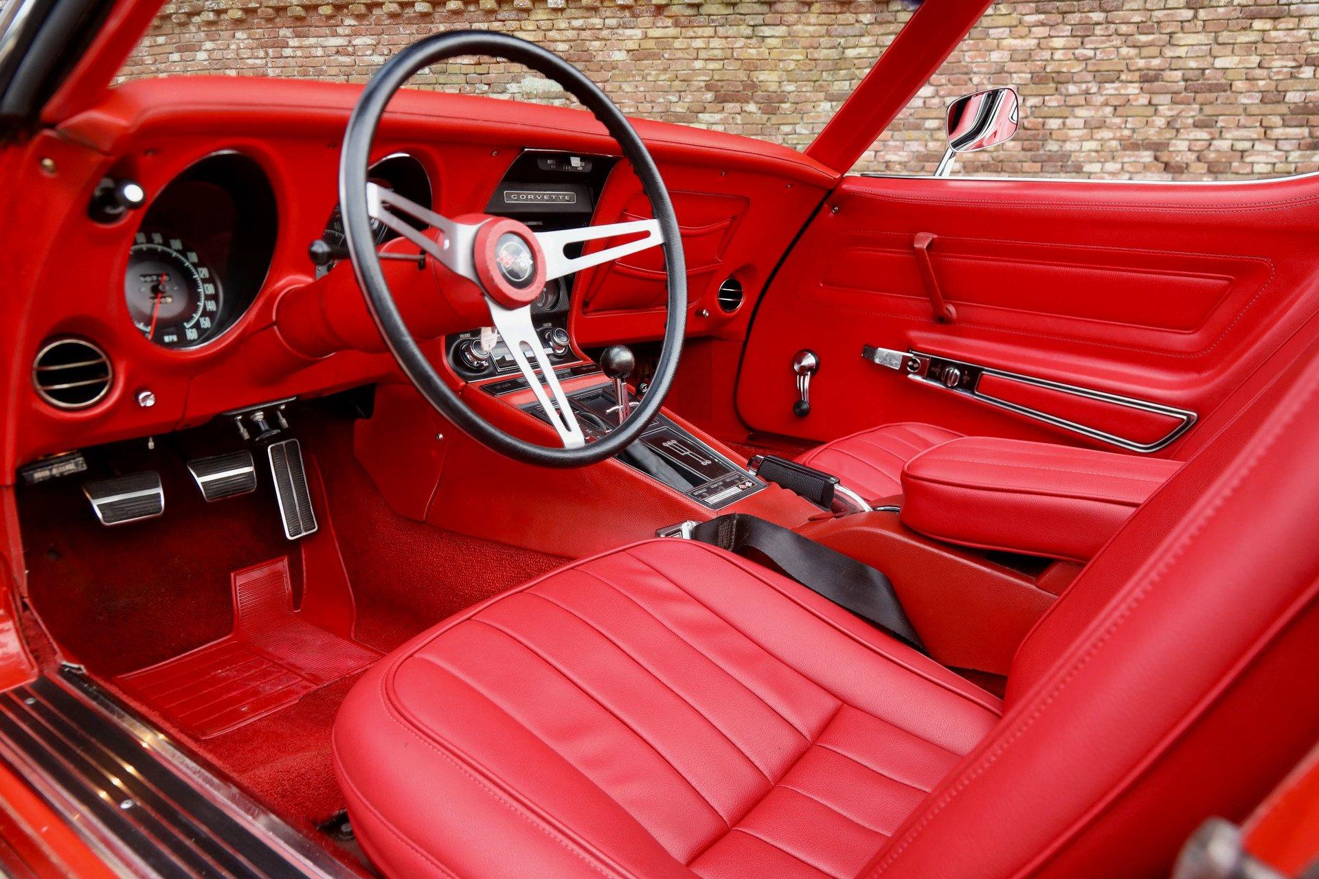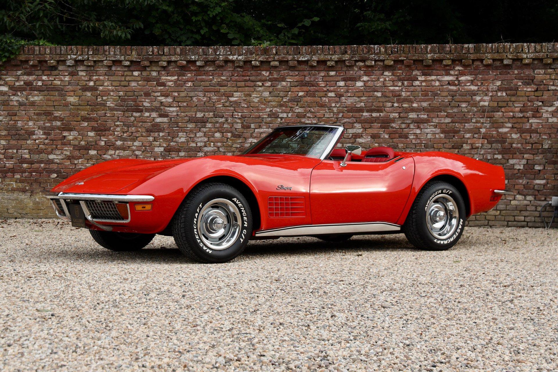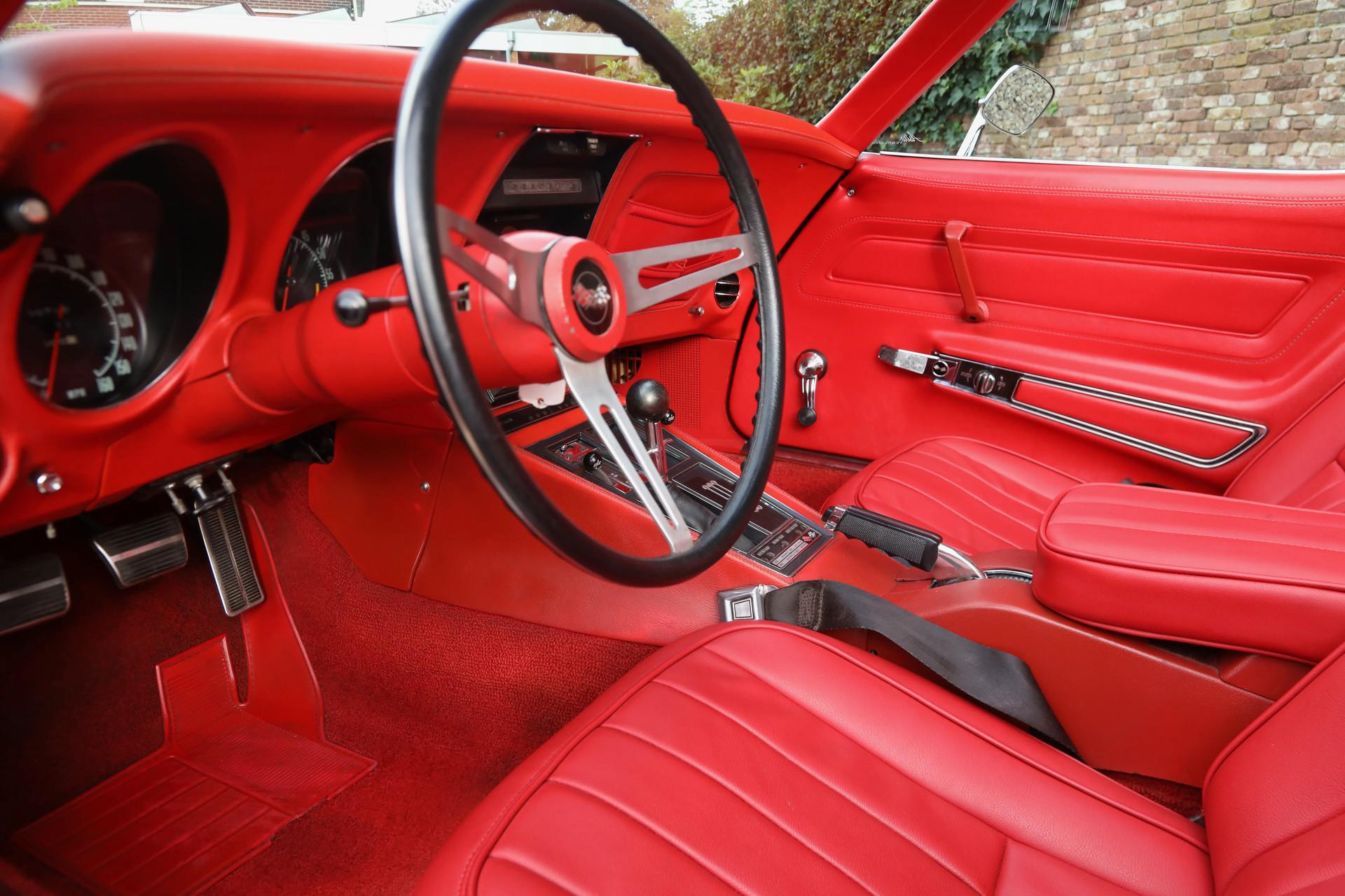 The third-generation Corvette, like this one, was built between 1967 and 1982. The 1970 model year, represented here, introduced several updates. For the first time, the body featured integrated fender flares that not only enhanced the car's muscular stance but also offered practical protection against road debris. At the front, a new eggcrate grille was paired with matching side vents, while the turn signals grew larger and more square in design. At the rear, the round exhaust outlets were replaced by larger rectangular units, giving the Corvette a more powerful and mature appearance. Inside, redesigned seats were offered along with an optional “Deluxe” interior package that included wood accents, deeper carpeting, and leather upholstery. Beneath the surface, Positraction became standard, as did tinted glass and a manual transmission with revised gear ratios.