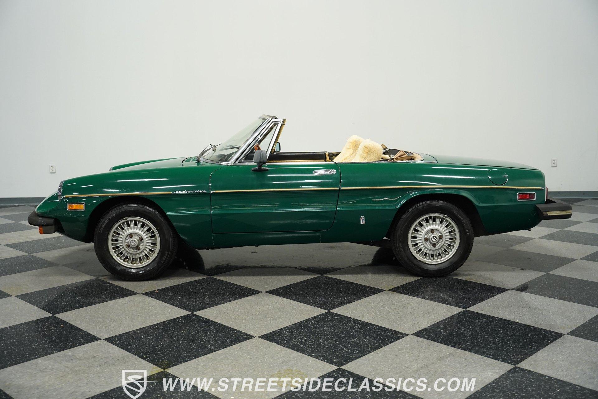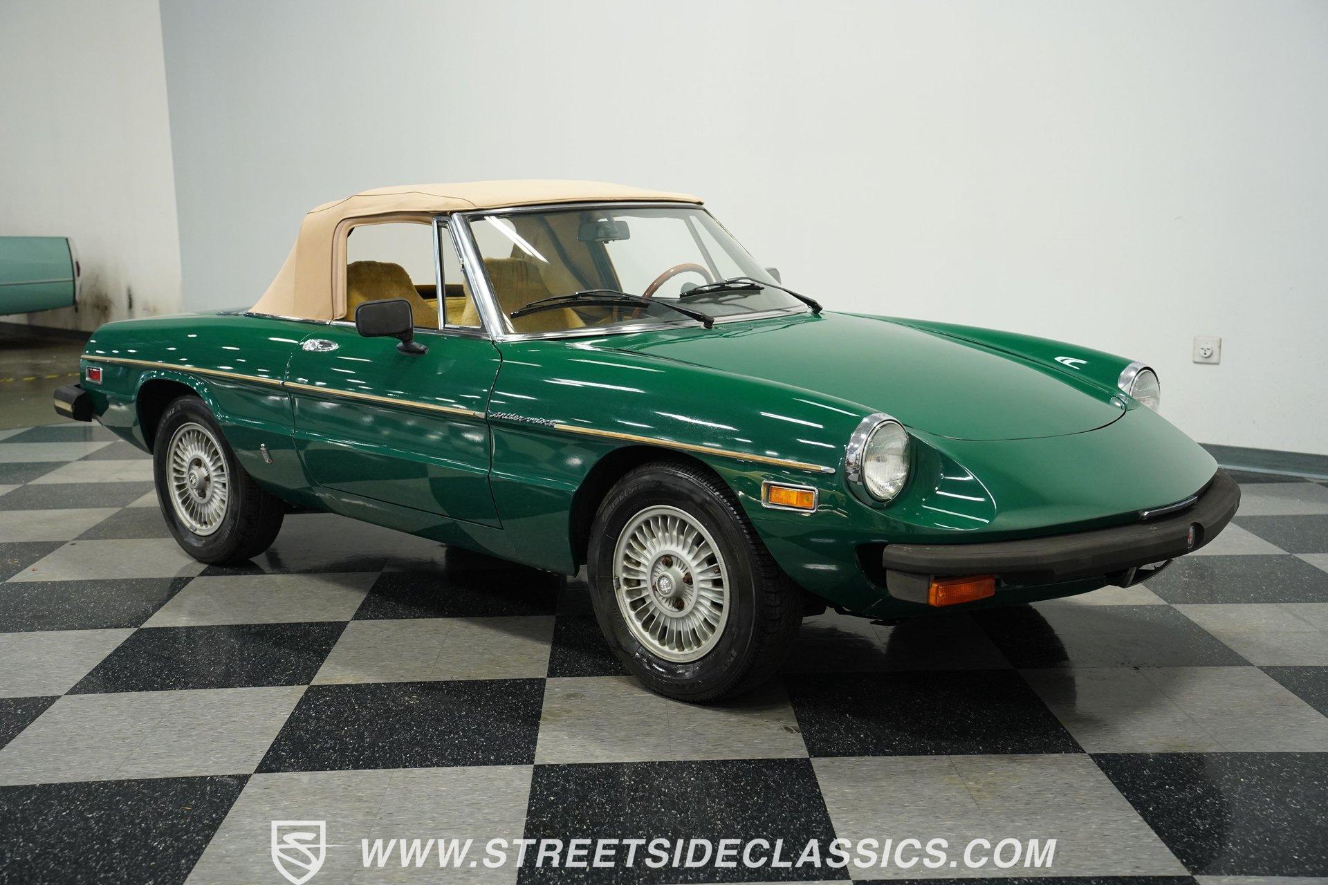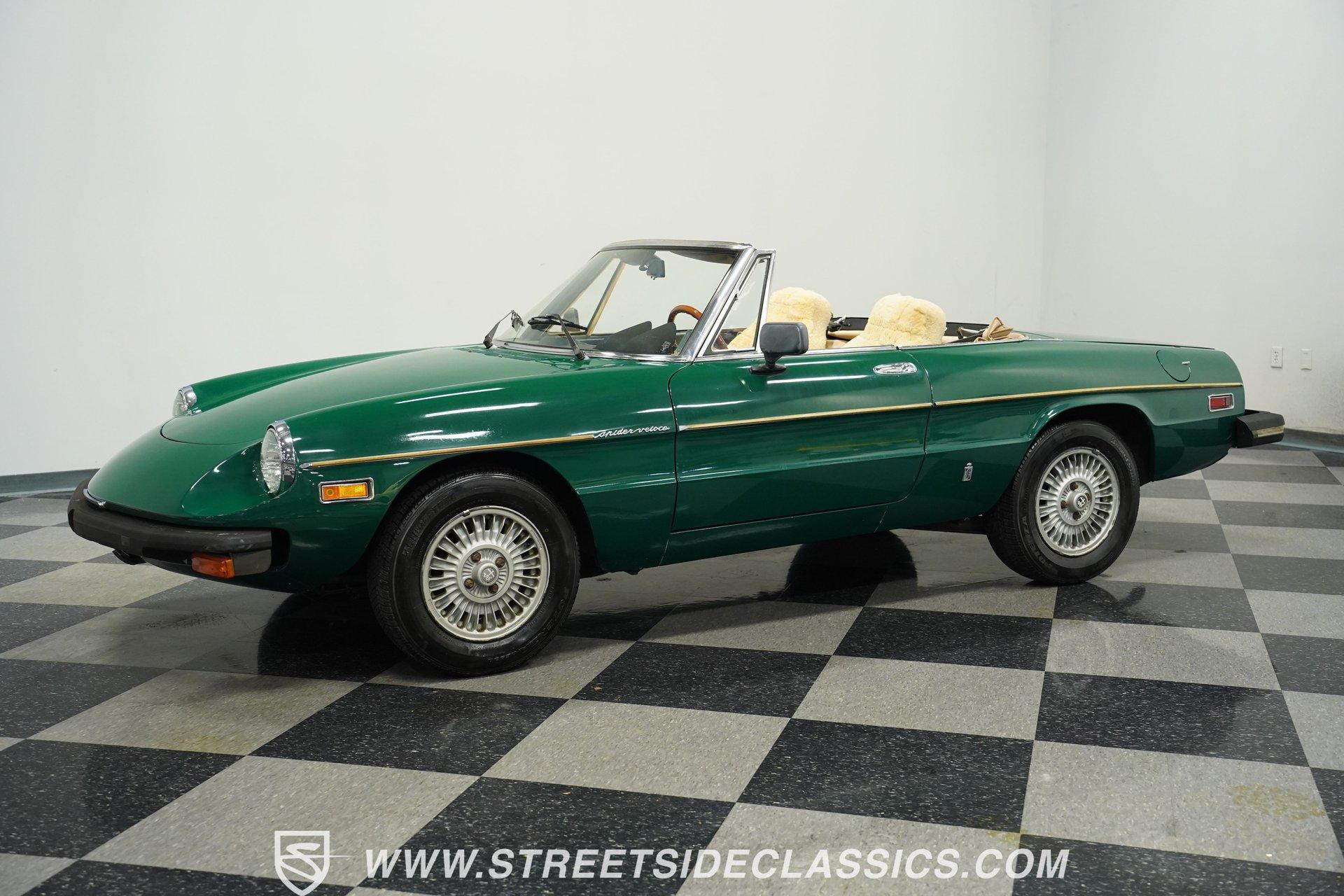 Bought as a demo in Atlanta and driven only on weekends for 47 years, this 1978 Alfa Romeo Spider Veloce in British Green maintains a distinctive Italian profile. The full repaint shows quality workmanship while preserving the car's original character. The tan cloth convertible top provides perfect contrast against the verdant exterior. Rolling on era-correct 14" Cromodora Campanatura alloy wheels with P185/70R14 radial tires, this Spider cuts a classic silhouette on any road. Inside, the tan vinyl interior remains remarkably preserved after four decades. Original bucket seats stay protected under wool seat covers, showing minimal wear throughout. The uncracked dash houses factory instrumentation including the oversized tachometer that dominates the driver's view. An AM/FM cassette player provides entertainment while cruising with the top down. The wood grain steering wheel offers direct connection to the road while the console-mounted shifter falls naturally to hand during gear changes. Mechanically sound, the 2.0L inline 4-cylinder engine provides spirited performance typical of Italian sports cars. The 5-speed manual transmission allows full control over the rev range. Manual steering gives feedback directly from the road surface to the driver's hands. Four-wheel power disc brakes bring everything to a controlled stop when needed. The dual-to-single exhaust system produces the signature sound that's unmistakably Alfa. Fuel injection ensures consistent performance in all driving conditions. HIGHLIGHTS: 2.0L Inline 4 Engine 5-Speed Manual Transmission Fuel Injection Four-Wheel Power Disc Brakes Dual To Single Exhaust British Green Paint (Verde Inglese) 14" Cromodora Alloy Wheels P185/70R14 Radial Tires Tan Cloth Convertible Top Two-Door Convertible Body Style Tan Interior With Bucket Seats In Wool Covers Wood Grain Steering Wheel AM/FM Cassette Player Seatbelts One Owner For 47 Years 37,231 Actual Miles For drivers who appreciate authentic Italian sports cars, this 1978 Alfa Romeo Spider Veloce offers a genuine driving experience that only an Alfa can provide. With just 37,231 actual miles and maintained by a single owner, this Spider comes with the kind of provenance collectors value. The combination of British Green paint and tan interior creates a stunning roadster ready for weekend drives. Call today!