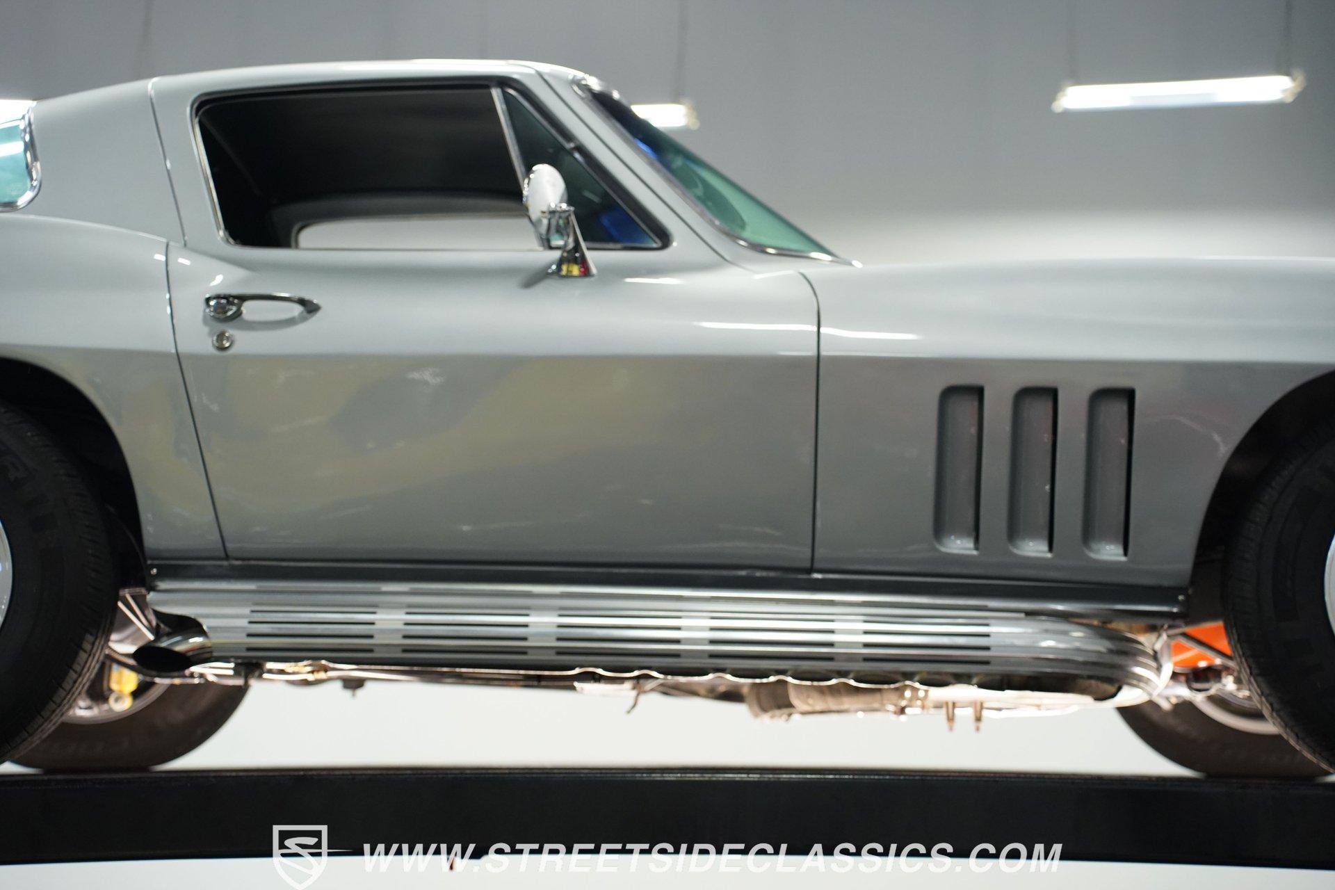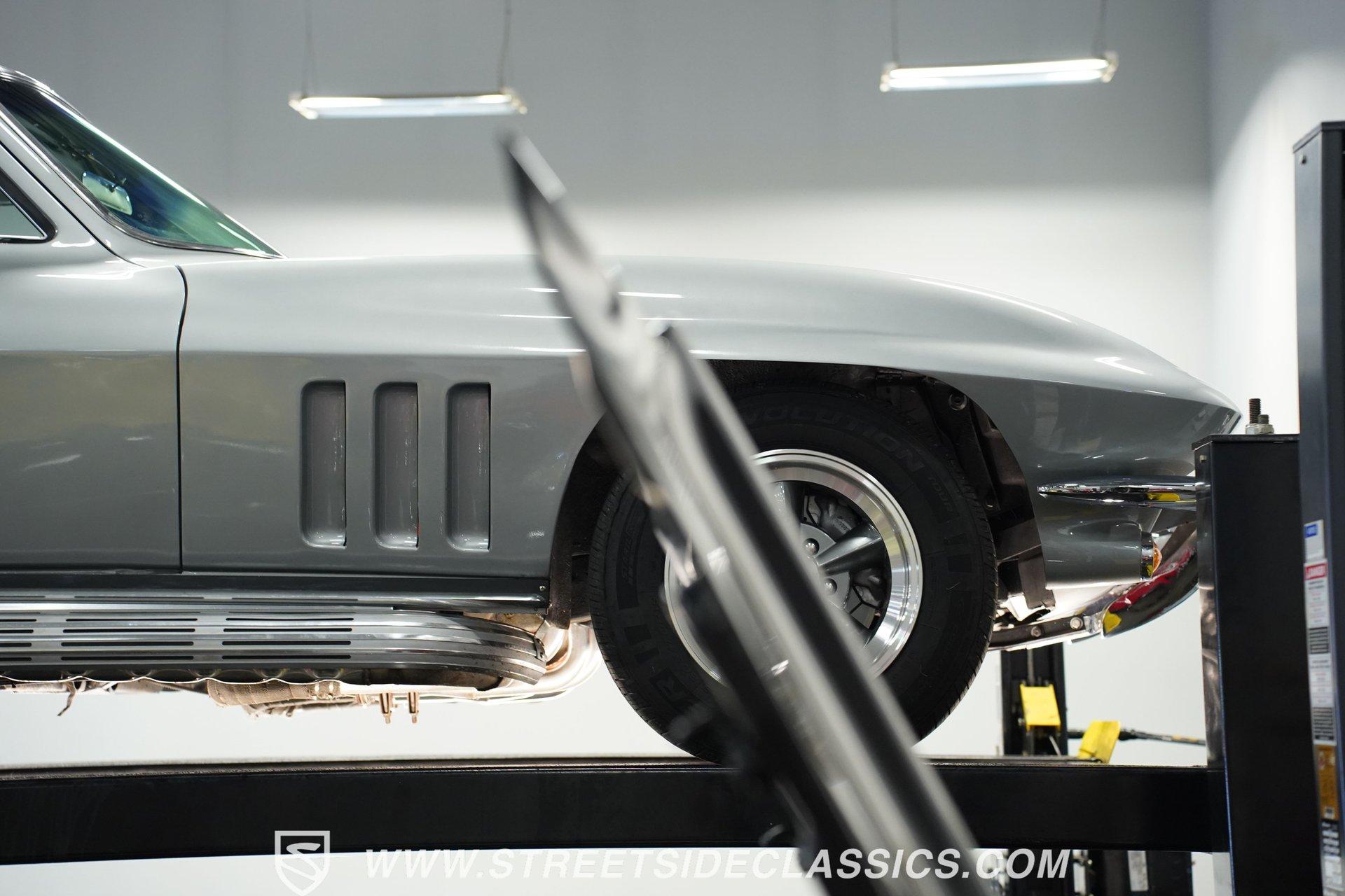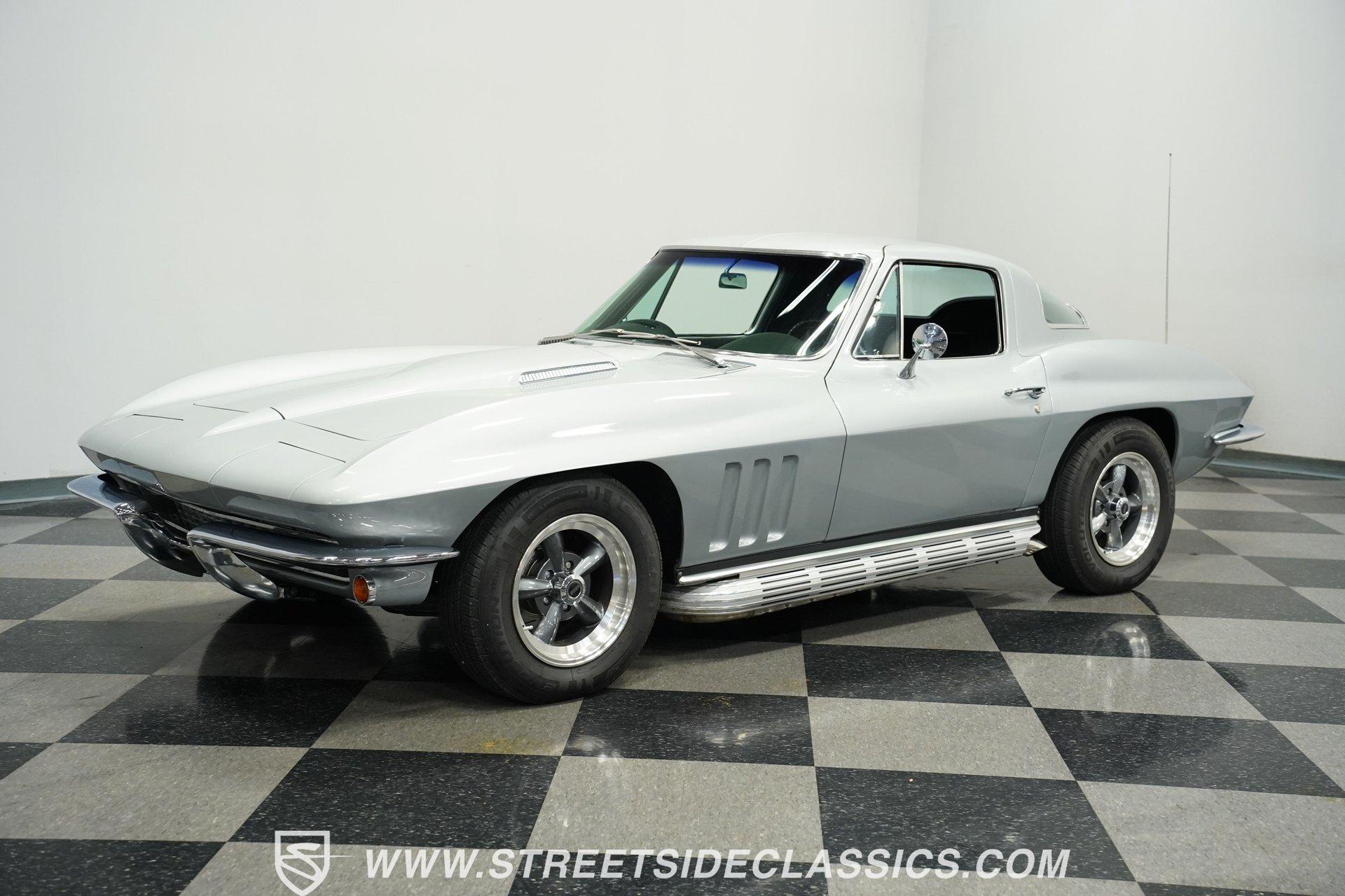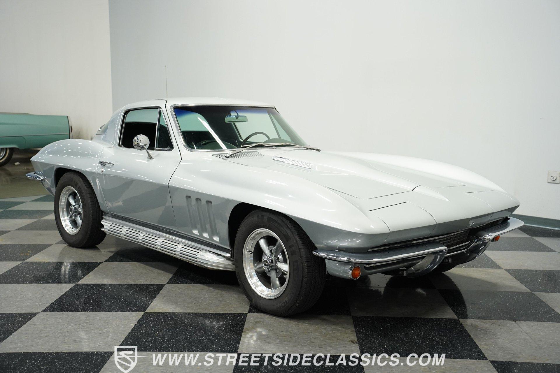 Few cars personify the automotive spirit of the 1960s quite like this 1966 Chevrolet Corvette. Fully repainted in its original Silver Pearl color, which showcases its sleek hardtop coupe body style, this restomodded C2 has just 1,915 miles on its odometer since it was built. While its original hood has been replaced with a more aggressive piece, thankfully, this 'Vette retains its undeniably cool side pipes, which announce its arrival long before it gets there. Inside, we find a fully restored black vinyl interior. A center console separates the dual bucket seats, while a three-spoke, power-assisted, wood-rimmed steering wheel sits just ahead of the C2 six-pod gauge cluster, featuring a 7,000 rpm tachometer and a 150 mph speedometer. A large analog clock sits high atop the center stack, while an upgraded AM/FM head unit takes the place of the original. Thanks to the coupe setup, this 'Vette also sports a sizeable cargo area behind the seats, making road trips equal parts practical and fun. Under that front-hinged hood, we find a clean engine bay that houses a built 383 cubic-inch stroker V-8 engine. Built with an Eagle crankshaft, a big 4.0-inch bore, a performance cam, and Brodix IK 180 aluminum cylinder heads, this powerful small block is fed by a Holley Sniper electronic fuel injection system and an Edelbrock intake manifold. This setup also features a set of shorty headers that send spent gases out through those glorious side pipes. Power is routed through a tried-and-true four-speed manual transmission before heading out to the 3.08-geared Positraction rear end that transfers those ponies to the pavement via a set of five-spoke Jegs wheels shod in 215/70R-15 Cooper rubber. At the same time, a narrower set of 205/70R-15 tires handles steering duties up front. *Frame Off Restoration *1915 Miles Since Built *Full Silver Pearl Repaint *Aftermarket Hood *383 Stroker V8 *Brodix Aluminum Heads *Holley Sniper EFI *Edelbrock Intake *Performance Cam *Eagle Crank *Shorty Headers *Side Pipes *Four Speed Manual *3.08 Posi *Bilstein Shocks *Four Wheel Discs *Jegs Wheels *Build Sheets This 1966 Chevrolet Corvette rides on upgraded Bilstein shocks, while four-wheel disc brakes stand ready to rein in speed whenever called upon, allowing you to simply enjoy the ride. If you've never sat behind the wheel of a classic Corvette with a hot V-8 under the hood and bellowing side pipes rumbling right outside your doors, then this is the car you've been waiting for. But don't wait, call today!