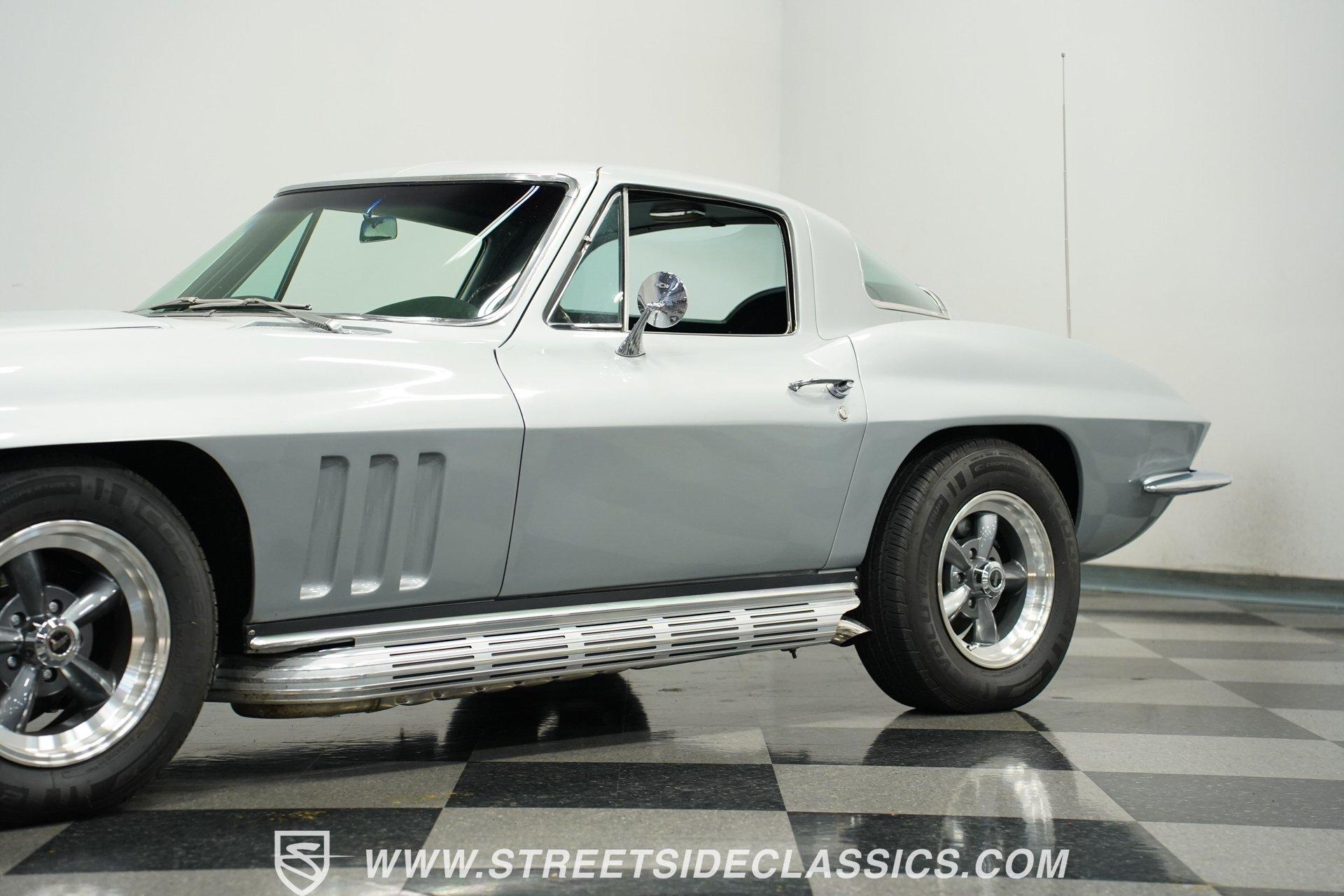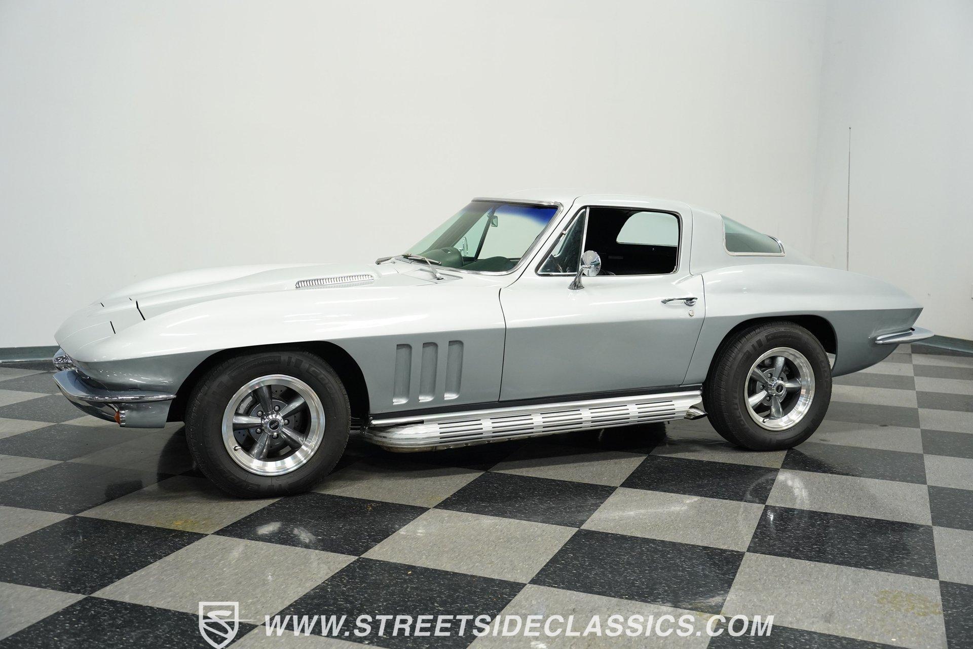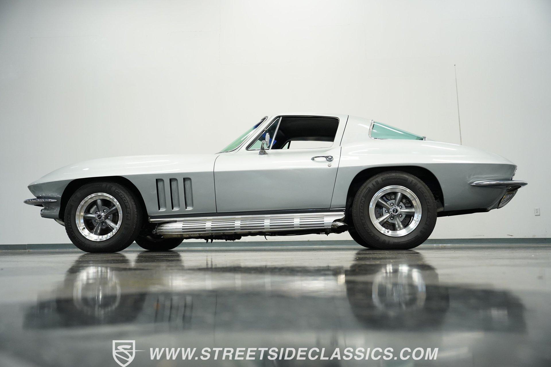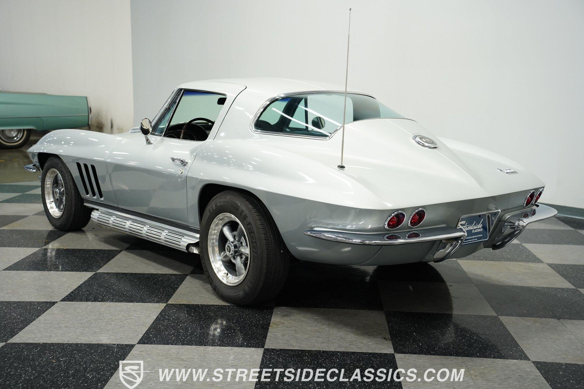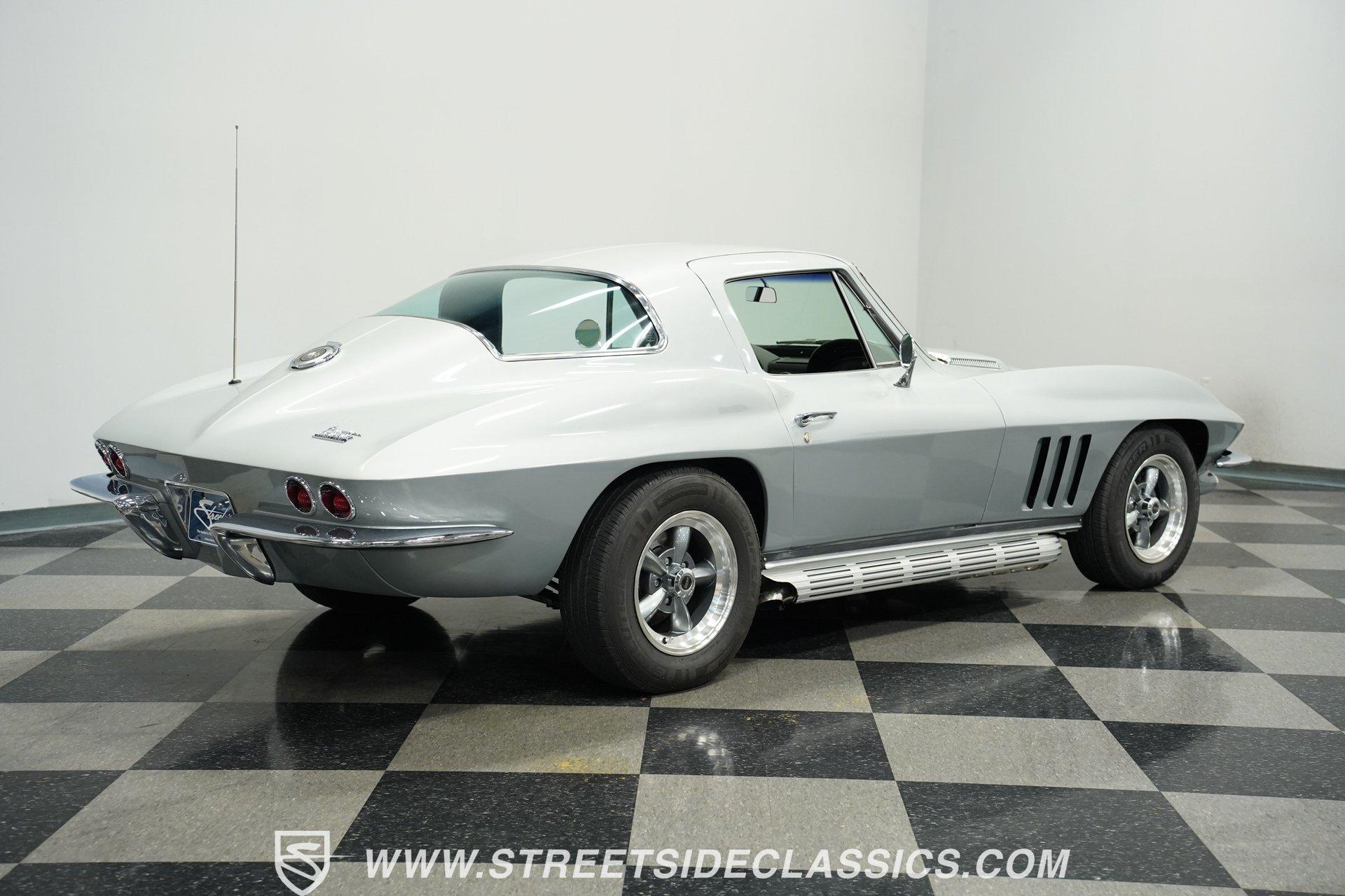 Few cars personify the automotive spirit of the 1960s quite like this 1966 Chevrolet Corvette. Fully repainted in its original Silver Pearl color, which showcases its sleek hardtop coupe body style, this restomodded C2 has just 1,915 miles on its odometer since it was built. While its original hood has been replaced with a more aggressive piece, thankfully, this 'Vette retains its undeniably cool side pipes, which announce its arrival long before it gets there. Inside, we find a fully restored black vinyl interior. A center console separates the dual bucket seats, while a three-spoke, power-assisted, wood-rimmed steering wheel sits just ahead of the C2 six-pod gauge cluster, featuring a 7,000 rpm tachometer and a 150 mph speedometer. A large analog clock sits high atop the center stack, while an upgraded AM/FM head unit takes the place of the original. Thanks to the coupe setup, this 'Vette also sports a sizeable cargo area behind the seats, making road trips equal parts practical and fun. Under that front-hinged hood, we find a clean engine bay that houses a built 383 cubic-inch stroker V-8 engine. Built with an Eagle crankshaft, a big 4.0-inch bore, a performance cam, and Brodix IK 180 aluminum cylinder heads, this powerful small block is fed by a Holley Sniper electronic fuel injection system and an Edelbrock intake manifold. This setup also features a set of shorty headers that send spent gases out through those glorious side pipes. Power is routed through a tried-and-true four-speed manual transmission before heading out to the 3.08-geared Positraction rear end that transfers those ponies to the pavement via a set of five-spoke Jegs wheels shod in 215/70R-15 Cooper rubber. At the same time, a narrower set of 205/70R-15 tires handles steering duties up front. *Frame Off Restoration *1915 Miles Since Built *Full Silver Pearl Repaint *Aftermarket Hood *383 Stroker V8 *Brodix Aluminum Heads *Holley Sniper EFI *Edelbrock Intake *Performance Cam *Eagle Crank *Shorty Headers *Side Pipes *Four Speed Manual *3.08 Posi *Bilstein Shocks *Four Wheel Discs *Jegs Wheels *Build Sheets This 1966 Chevrolet Corvette rides on upgraded Bilstein shocks, while four-wheel disc brakes stand ready to rein in speed whenever called upon, allowing you to simply enjoy the ride. If you've never sat behind the wheel of a classic Corvette with a hot V-8 under the hood and bellowing side pipes rumbling right outside your doors, then this is the car you've been waiting for. But don't wait, call today!