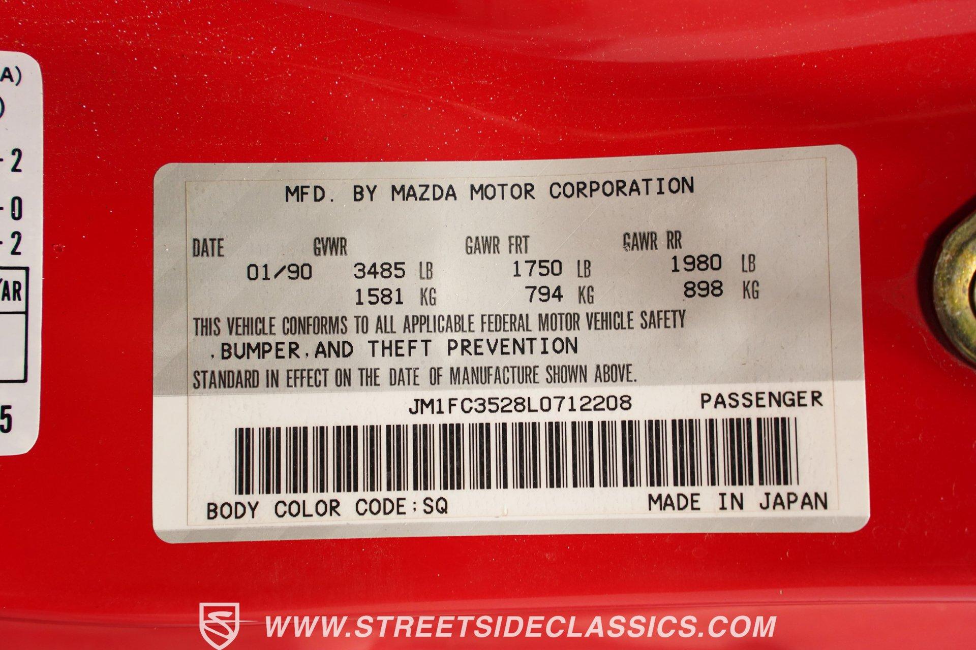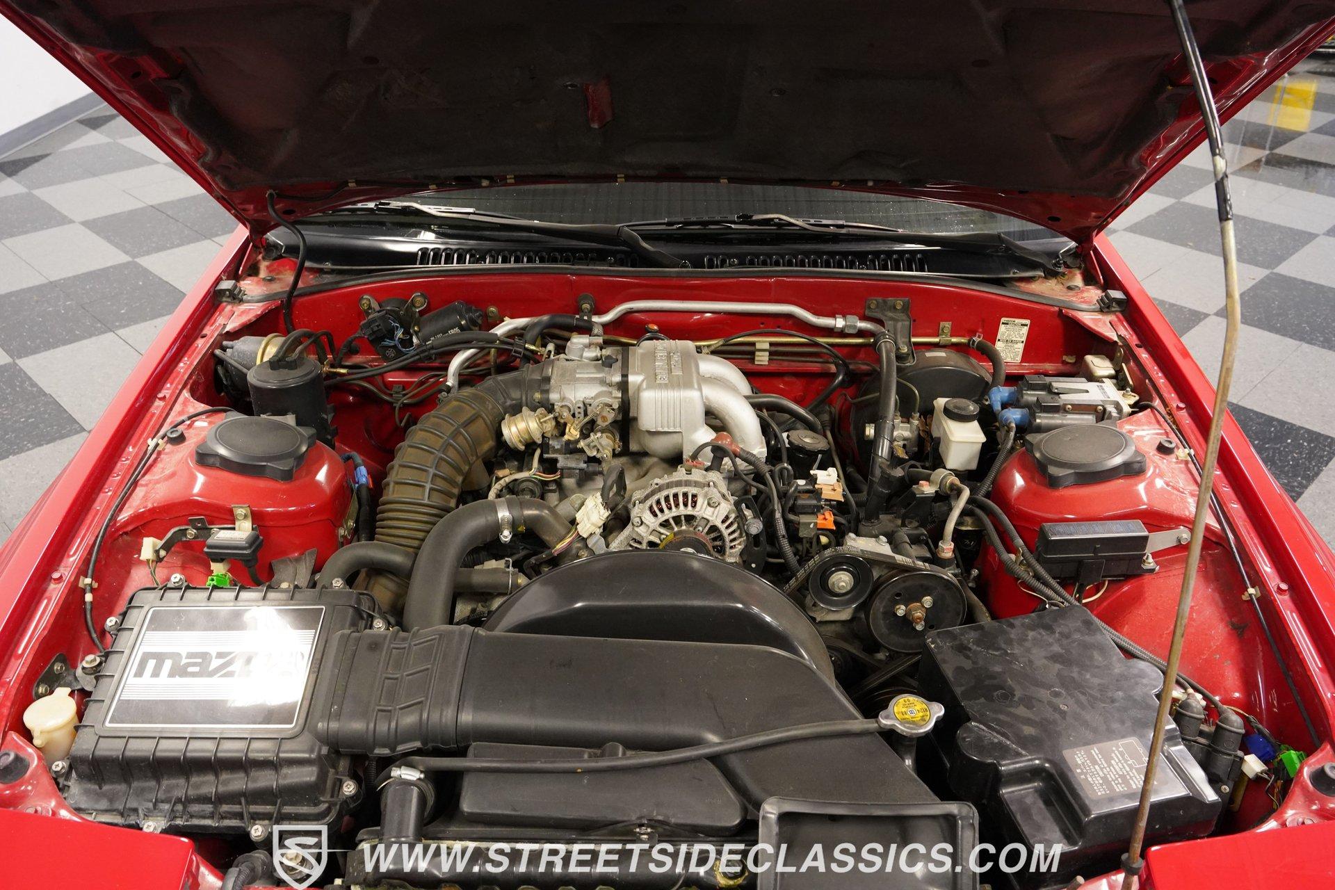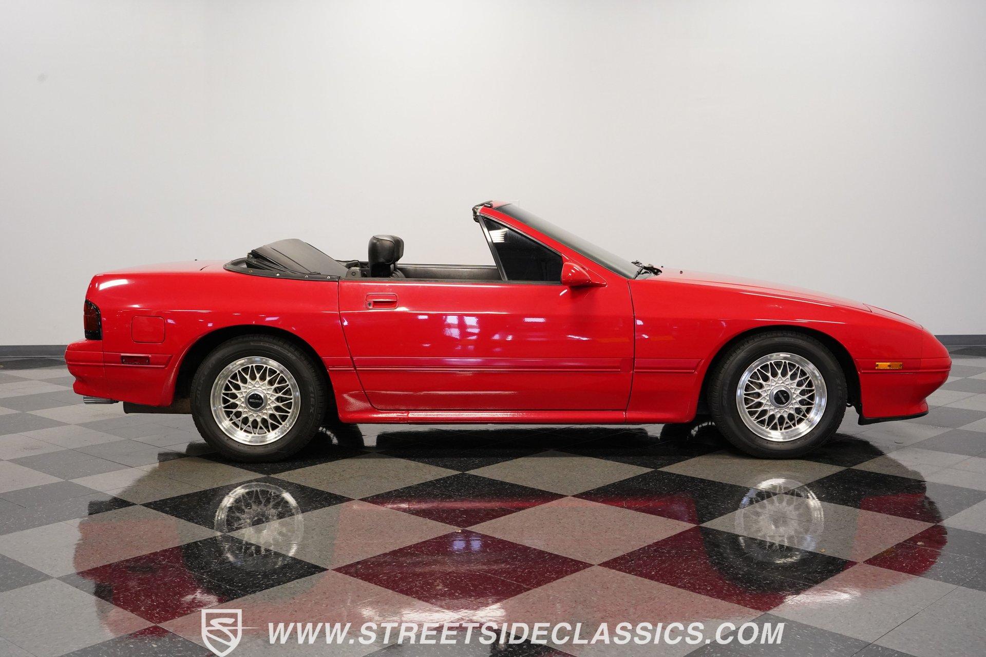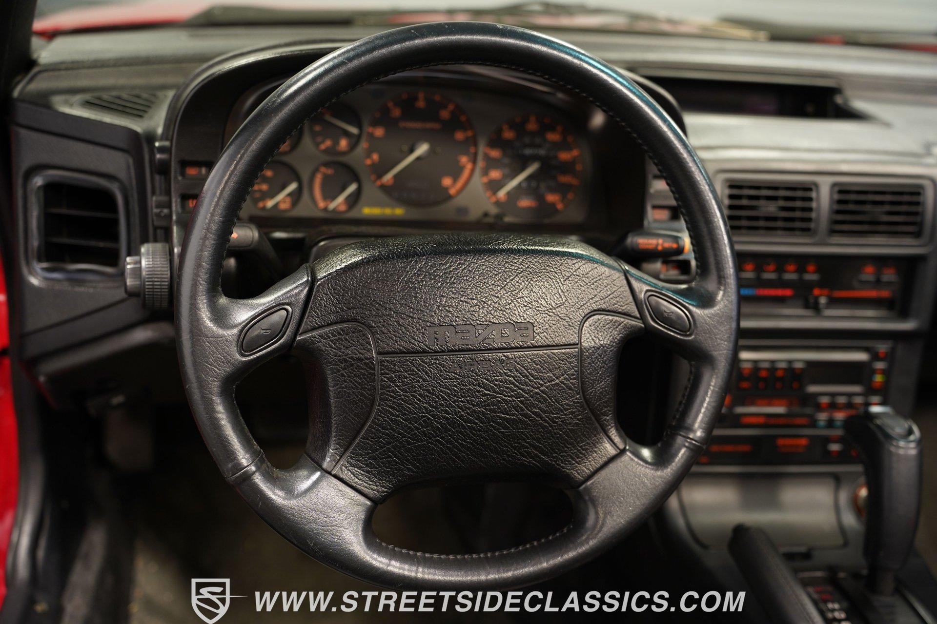 This 1990 Mazda RX-7 Convertible is a two-owner car that attractive and very well-kept. The sleek red exterior, luxury black leather interior, and rotary power are truly irresistible. The name of the factory paint is Blaze Red. It shows all the right signs of being the original finish, and it still lives up to that name with the radiant shine it gives off today. And the gloss lets you see how the sleek shape still looks contemporary. Of course, it also helps when great care is combined with the exceptional build quality of these Mazdas. The 15-inch factory BBS wheels ad to the allure of this rare convertible. A car like this is meant to be open to the world. The black leather interior does a great job of coordinating with The Blaze Red paint. The carpeting, door panels, dash, and bucket seats appear original, and they all have the clean/complete look of proper respect. You'll slip behind the sporty leather-wrapped steering wheel, and your heart will begin beating a bit faster as you watch the red-faced gauges begin to dance. But more than just a pure sports machine, the RX-7 was Mazda's flagship car, and so there are plenty of luxury features. It includes power windows, a driver's airbag, cruise control, and a factory premium Pioneer AM/FM/CD/cassette stereo. Plus, the air conditioning helps keep you cool while looking cool in this classic drop-top. The RX-7's real calling card was the revolutionary two-rotor Wankel engine. The exceptional condition of the motor tells you this was just as well-respected as the rest of the car. The dual-rotor Wankel engine can fit behind the front axle for ideal mid-engine placement. It may be smaller than the V6 and V8 engines you'd expect under the hood of a sports car, but this revolutionary motor makes just as much power. And there's something magical about the high-revving smoothness that's just perfect for those who love the grand tour. While this is an excellently preserved classic, it would be a shame not to take it out on the road. The four-speed automatic transmission with overdrive, fully independent suspension, well-balanced weight distribution, and a four-wheel power disc brake package combine to offer the ideal mixture of performance and comfort. HIGHLIGHTS: 13B Rotary Engine Automatic Transmission Rare Convertible Factory BBS-Style Wheels Leather Bucket Seats Air Conditioning Factory AM/FM/CD and Cassette Stereo Service Records Unmodified, Highly Original Car Power Windows Owner's Manual Packet Blaze Red Paint Power Door Locks Cruise Control 4-Wheel Disc Brakes This 1990 Mazda RX-7 Convertible is a special car. Included with the sale are the owner's manual packet and service records. This preserved classic is a blast to drive down your favorite twisting piece of pavement - with the wind in your hair and the sun overhead. At this price, this total package classic won't be with us long. Call today!