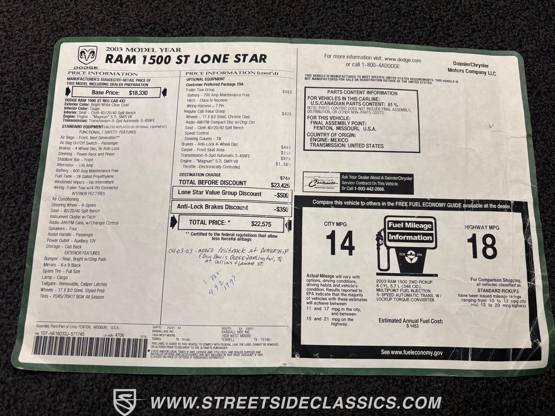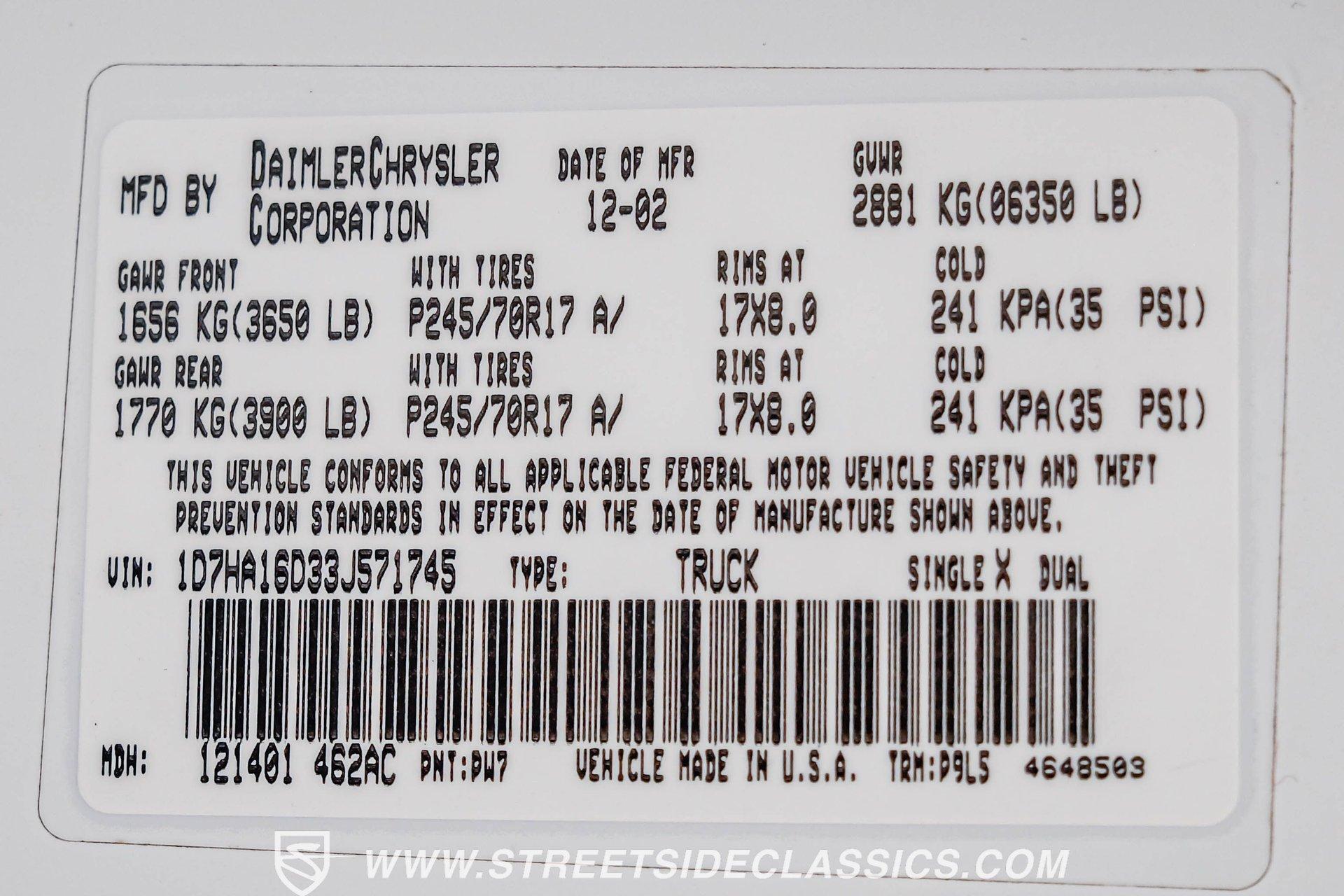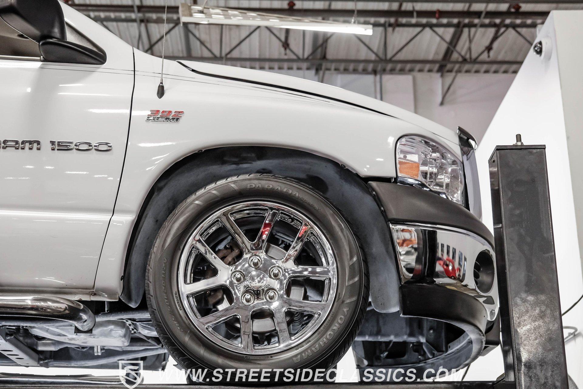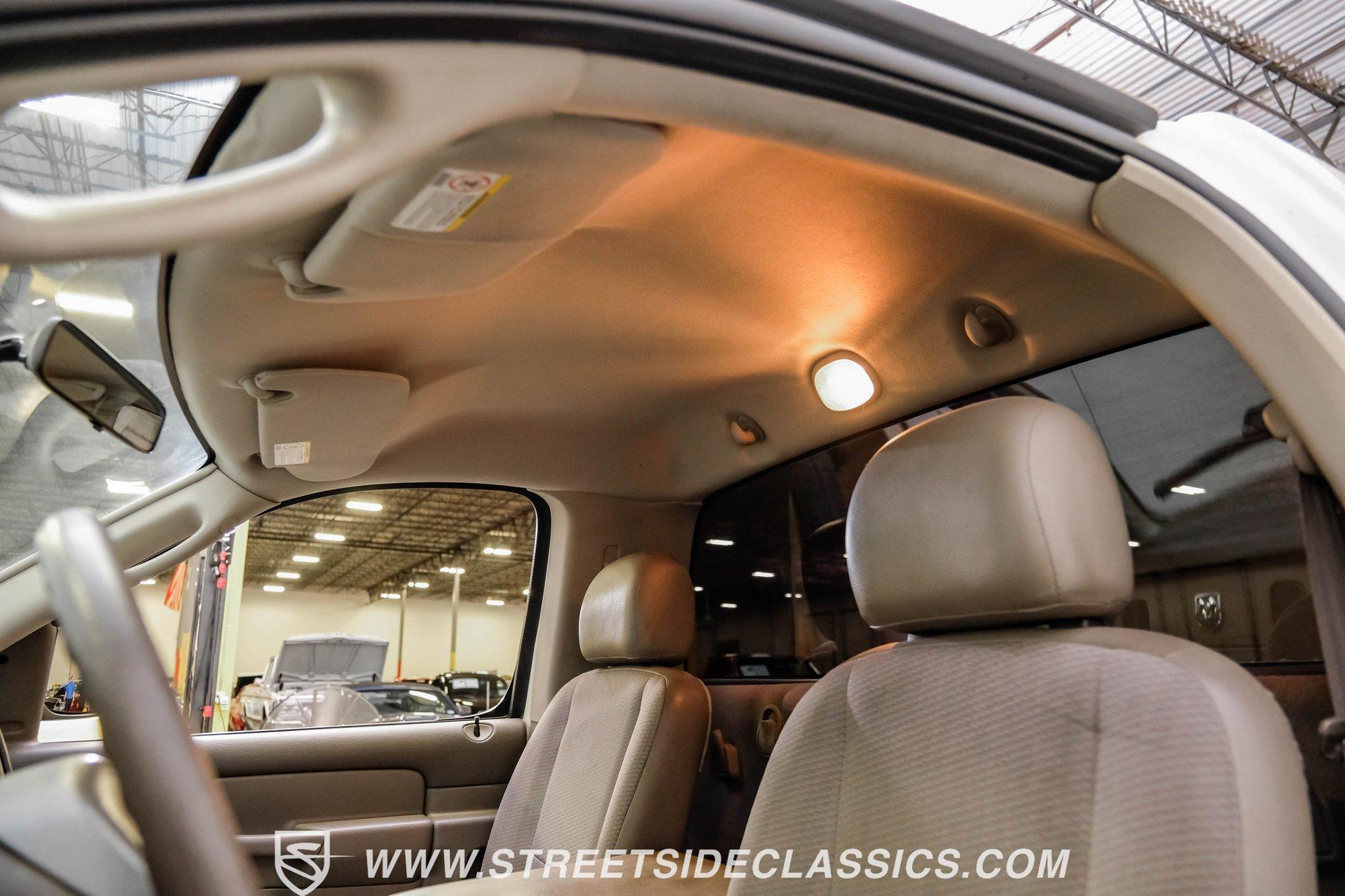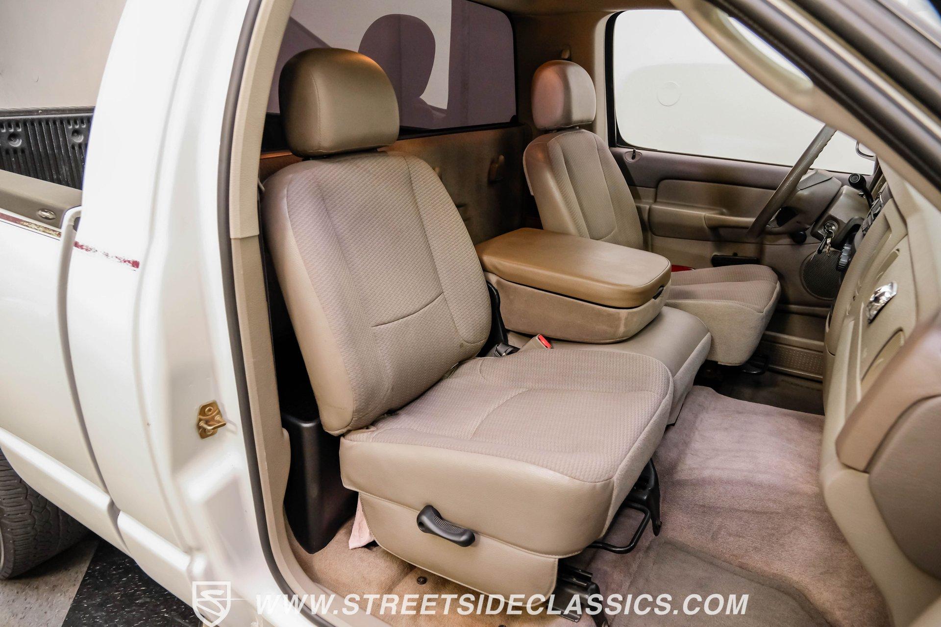 Unleashed from the factory limitations, this 2003 Dodge Ram 1500 ST flexes muscle with its hardcore HEMI conversion. Finished in Bright White, this truck rocks a custom fiberglass ram air hood that's fully functional. The 20-inch SRT wheels are wrapped in meaty 285/50R20 Yokohama rubber. Upgrades continue with projector halo headlights that give the front end a modern, aggressive look. The short bed comes protected with a durable liner, ready for work or play. The taupe cloth interior maintains a clean, stock appearance that belies the monster under the hood. Bucket seats with folding armrests keep you planted when the accelerator hits the floor. Factory comforts include functioning air conditioning, cruise control for highway cruising, and a tilt wheel for the perfect driving position. The original AM/FM/CD stereo handles the tunes, while a trailer brake controller adds towing capability. Behind the driver's seat sits the transmission controller, a subtle hint to those in the know that this isn't your average Ram. Brute force comes courtesy of a 392 cubic inch HEMI V8 with less than 5,000 miles on the build. Air rushes through an 87mm throttle body and ram air induction system, straight into the hungry V8. A stout 4L80E four-speed automatic transmission handles the power delivery, sending it to a Chrysler 9.25-inch rear axle with 3.92 Yukon Sure Grip differential. Long tube headers connect to a custom dual exhaust with high-flow mufflers and catalytic converters. Four-wheel power disc brakes bring everything to a halt when needed, while power steering keeps control at your fingertips. HIGHLIGHTS: 392 HEMI V8 Engine (Less Than 5,000 Miles Since Installation) 4L80E 4-Speed Automatic Transmission 87mm Throttle Body With Ram Air Induction Long Tube Headers Dual Exhaust With High Flow Mufflers Chrysler 9.25" Rear Axle With 3.92 Yukon Sure Grip Four-Wheel Power Disc Brakes Functional Ram Air Fiberglass Hood 20" SRT Wheels In 285/50R20 Yokohama Tires Projector Halo Headlights Bed Liner Short Bed Taupe Interior With Bucket Seats And Folding Armrest Air Conditioning Cruise Control Tilt Wheel Power Steering AM/FM Radio With CD Player Trailer Brake Controller Diablo Tuner Included Custom Alarm System With Proximity Sensor Original Window Sticker Service Records Purchased new and upgraded over time by a single owner, this Ram truck delivers serious street cred with its HEMI conversion. From stoplight launches to highway pulls, the 392 cubic inch V8 provides the punch every truck guy craves, all in a usable, daily-drivable package. Call today!