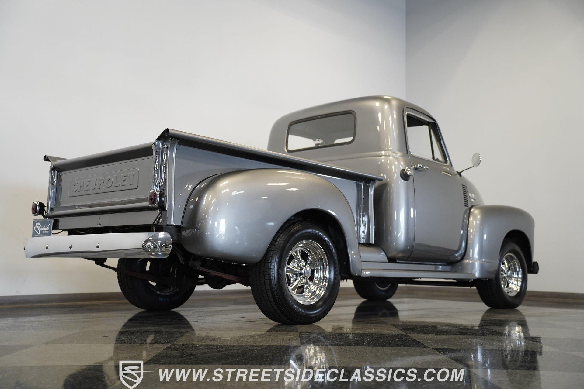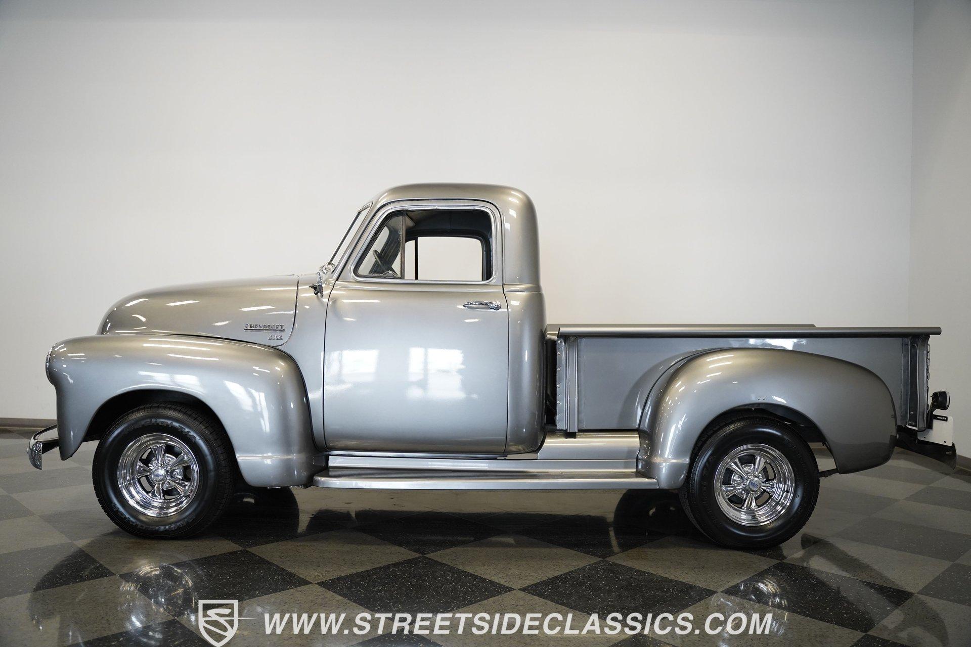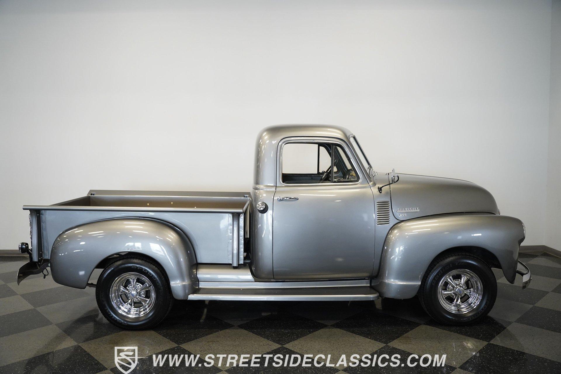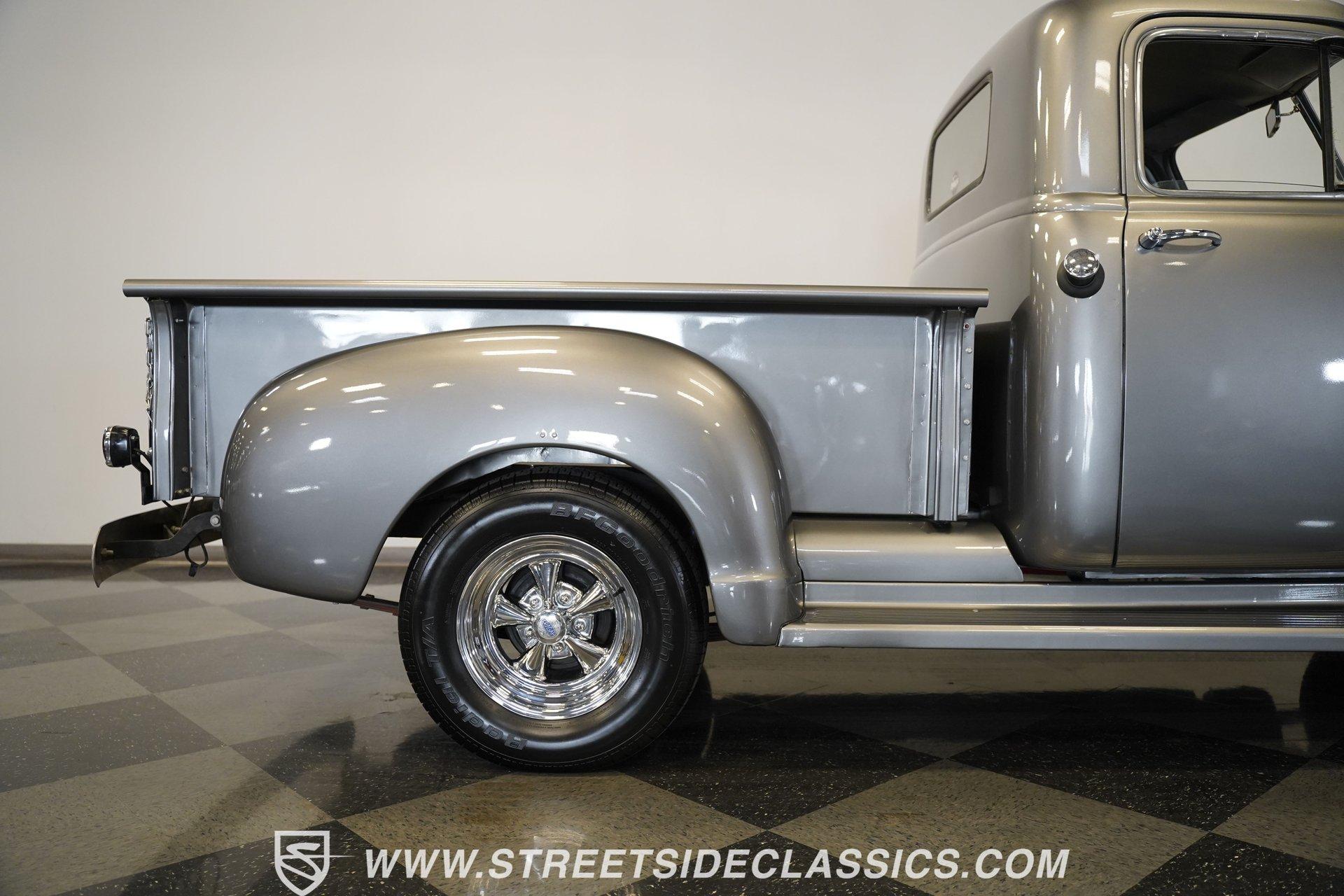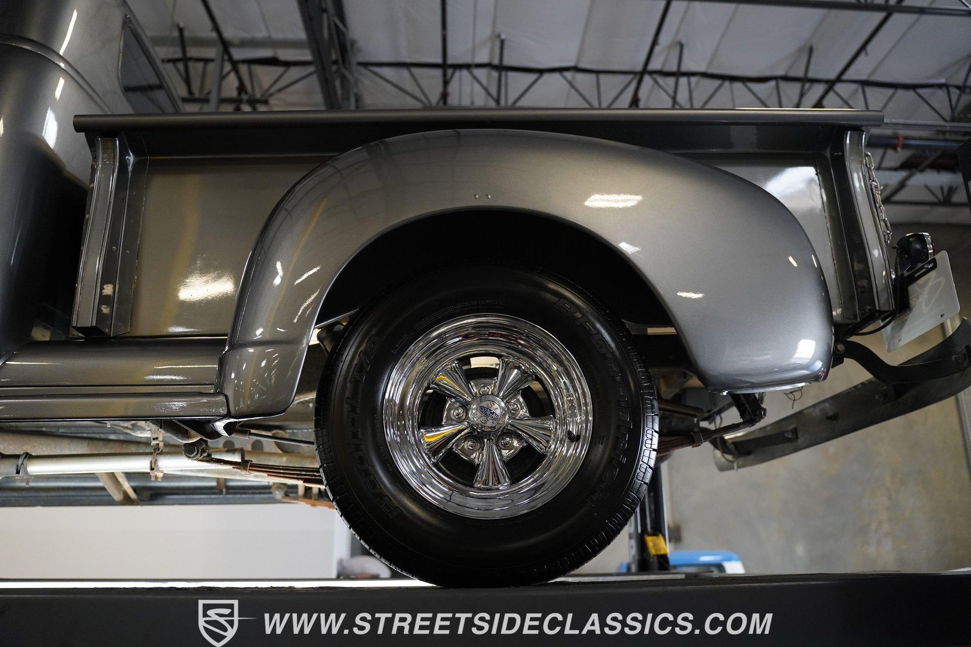 Silver metallic flake shines on this 1950 Chevrolet 3100 pickup truck, a true street cruiser with show quality details. Chrome accents grab your attention from every angle - from the bold Chevrolet emblem on the front grille to the substantial chrome bumpers front and rear. The custom woodgrain bed with polished chrome trim adds a custom touch that truck guys appreciate. Those 15" Chrome Cragar SS wheels wrapped in 235/70R15 BFG Radial TA tires look right at home under the fenders of this classic hauler. Gray vinyl wraps the bench seat inside this 1950 Chevrolet 3100, matched by gray door panels for a clean, coordinated interior. The dash houses the factory instrument cluster giving you all the vital info at a glance. The three-on-the-tree shifter juts from the column, controlling the 3-speed manual transmission with old-school cool. Original AM radio and simple controls for hazards, headlights, and brake release maintain the truck's authentic vibe. Vinyl flooring keeps things simple and sturdy - perfect for a truck built to cruise and show. A 235 cubic inch inline-six engine powers this 1950 Chevrolet 3100 pickup truck. The clean engine bay shows attention to detail with the black firewall providing contrast. The 3-speed manual transmission connects to an upgraded 80's-90's S10 10-bolt rear end for improved durability. Dual remote oil filters and an alternator upgrade add modern reliability for weekend cruising. Front disc brakes improve stopping power, while the I-beam front suspension with leaf springs and solid axle rear maintain the truck's authentic feel. A single exhaust with glasspack style muffler adds a subtle rumble when you hit the gas. HIGHLIGHTS: 235 I6 Engine 3-Speed Manual Transmission Front Disc Brakes I-Beam With Leaf Springs Front Suspension Solid Axle With Leaf Springs Rear Suspension 10-Bolt Rear End (80's-90's S10) Dual Remote Oil Filters Alternator Upgrade Single Exhaust With Glasspack Muffler Silver Metallic Flake Paint 15" Chrome Cragar SS Wheels 235/70R15 BFG Radial TA Tires Chrome Front And Rear Bumpers Woodgrain Bed With Chrome Accents Chrome "3100" Emblem Gray Interior With Bench Seat Column-Mounted Shifter Original Instrument Cluster AM Radio Vinyl Flooring Custom trucks like this 1950 Chevrolet 3100 offer the best of both worlds, classic looks with upgraded performance. The inline-six engine, disc brakes, and upgraded rear end let you drive and enjoy this truck while the silver metallic paint, chrome accents, and custom details make it a standout at any car show. Call today!
