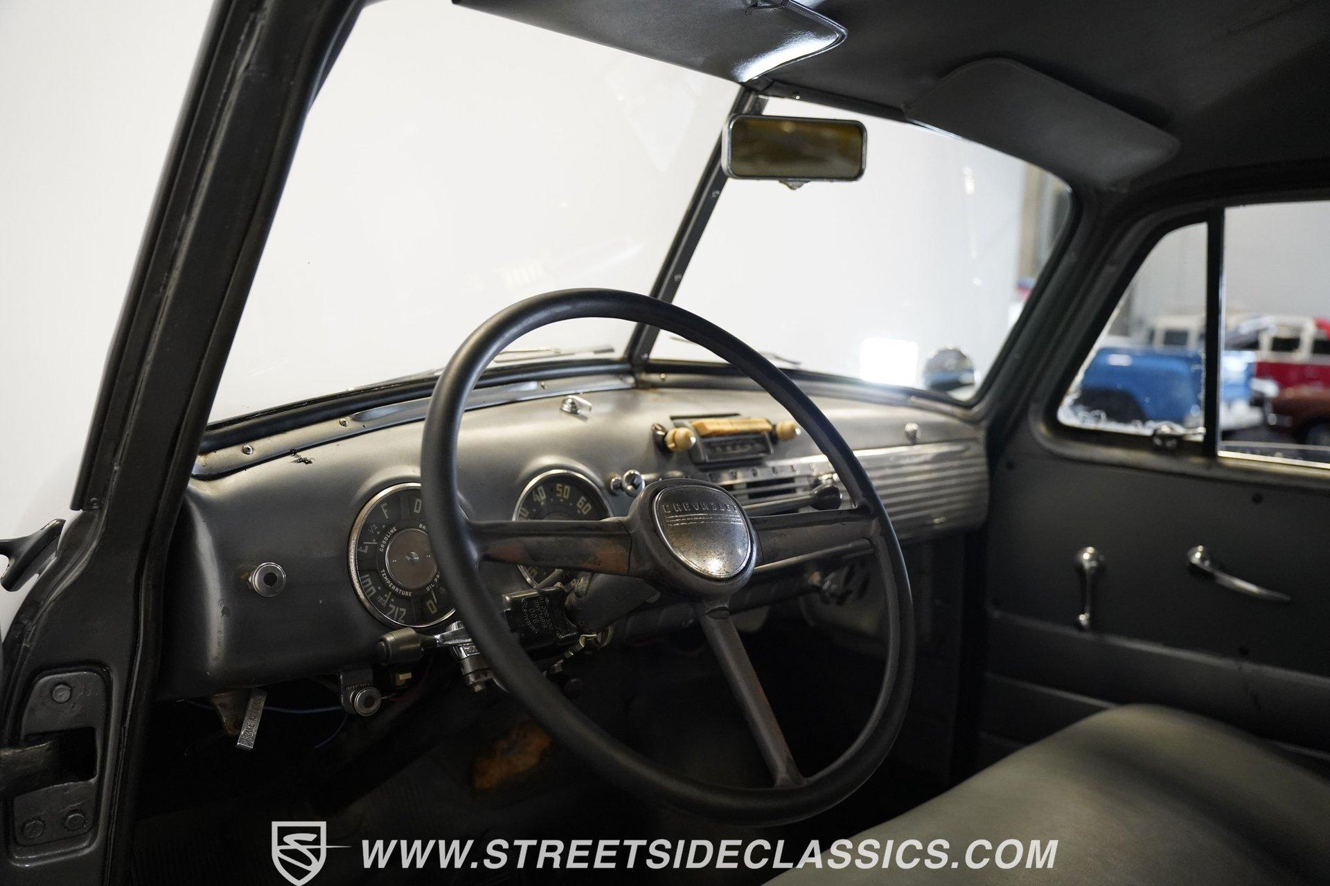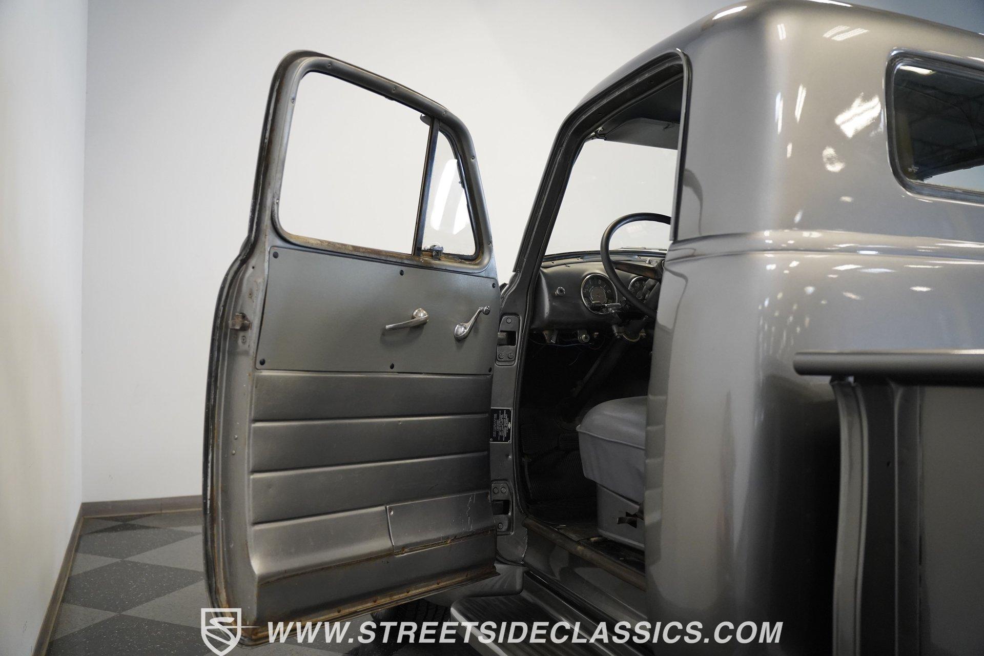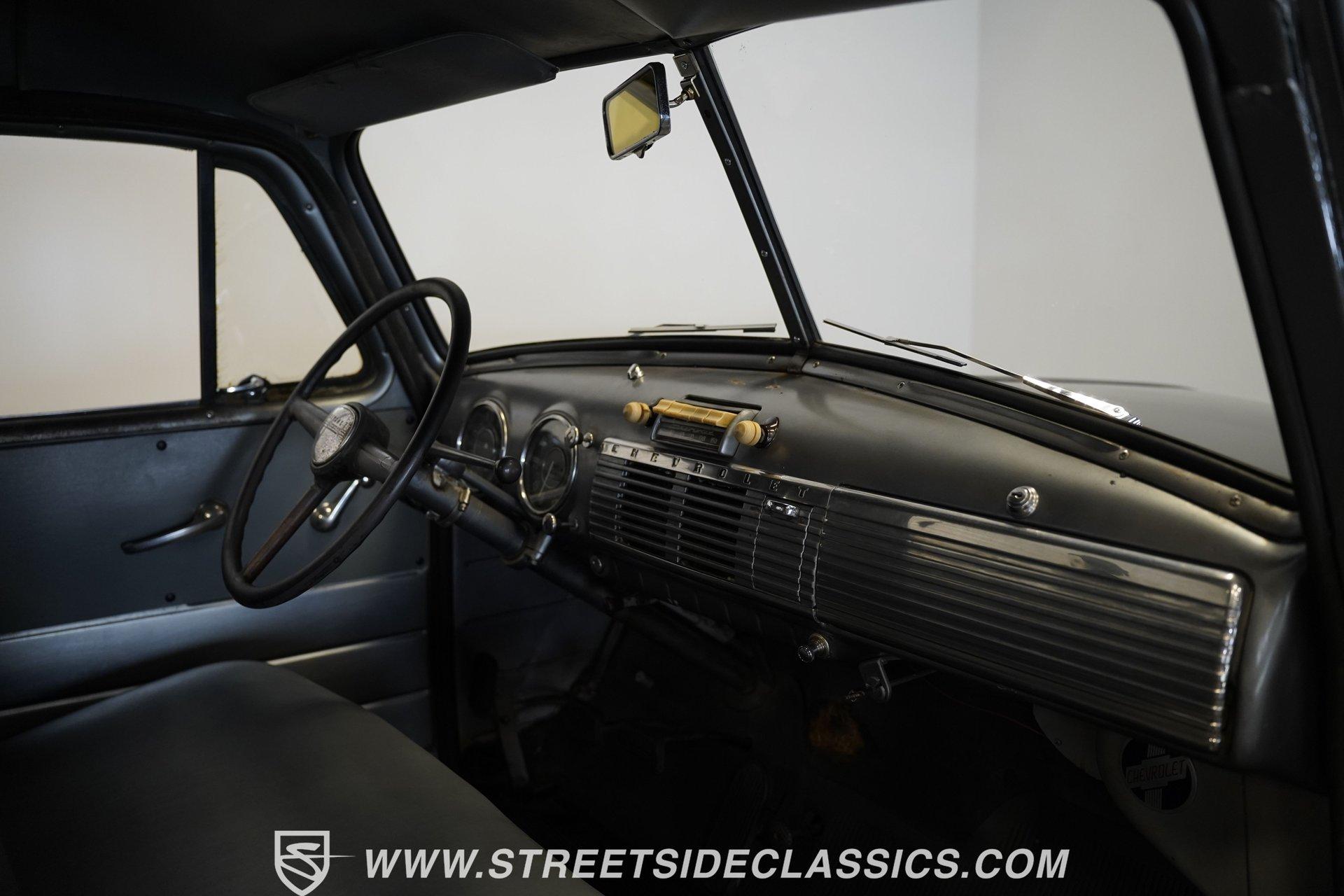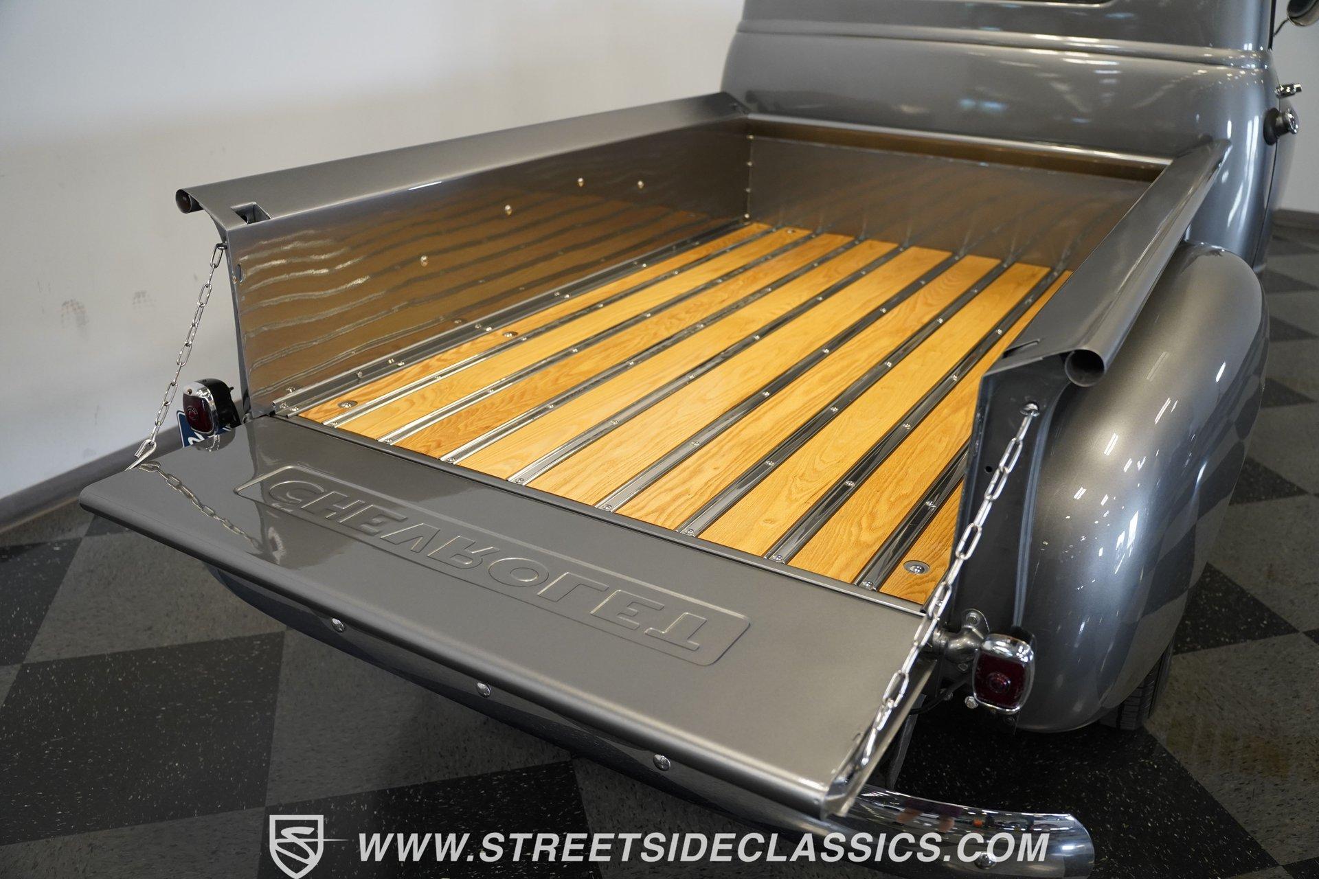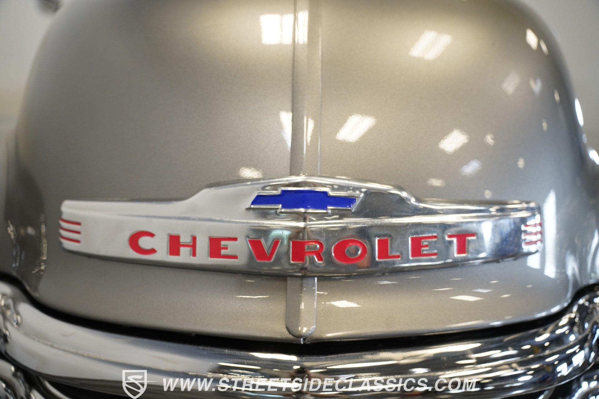 Silver metallic flake shines on this 1950 Chevrolet 3100 pickup truck, a true street cruiser with show quality details. Chrome accents grab your attention from every angle - from the bold Chevrolet emblem on the front grille to the substantial chrome bumpers front and rear. The custom woodgrain bed with polished chrome trim adds a custom touch that truck guys appreciate. Those 15" Chrome Cragar SS wheels wrapped in 235/70R15 BFG Radial TA tires look right at home under the fenders of this classic hauler. Gray vinyl wraps the bench seat inside this 1950 Chevrolet 3100, matched by gray door panels for a clean, coordinated interior. The dash houses the factory instrument cluster giving you all the vital info at a glance. The three-on-the-tree shifter juts from the column, controlling the 3-speed manual transmission with old-school cool. Original AM radio and simple controls for hazards, headlights, and brake release maintain the truck's authentic vibe. Vinyl flooring keeps things simple and sturdy - perfect for a truck built to cruise and show. A 235 cubic inch inline-six engine powers this 1950 Chevrolet 3100 pickup truck. The clean engine bay shows attention to detail with the black firewall providing contrast. The 3-speed manual transmission connects to an upgraded 80's-90's S10 10-bolt rear end for improved durability. Dual remote oil filters and an alternator upgrade add modern reliability for weekend cruising. Front disc brakes improve stopping power, while the I-beam front suspension with leaf springs and solid axle rear maintain the truck's authentic feel. A single exhaust with glasspack style muffler adds a subtle rumble when you hit the gas. HIGHLIGHTS: 235 I6 Engine 3-Speed Manual Transmission Front Disc Brakes I-Beam With Leaf Springs Front Suspension Solid Axle With Leaf Springs Rear Suspension 10-Bolt Rear End (80's-90's S10) Dual Remote Oil Filters Alternator Upgrade Single Exhaust With Glasspack Muffler Silver Metallic Flake Paint 15" Chrome Cragar SS Wheels 235/70R15 BFG Radial TA Tires Chrome Front And Rear Bumpers Woodgrain Bed With Chrome Accents Chrome "3100" Emblem Gray Interior With Bench Seat Column-Mounted Shifter Original Instrument Cluster AM Radio Vinyl Flooring Custom trucks like this 1950 Chevrolet 3100 offer the best of both worlds, classic looks with upgraded performance. The inline-six engine, disc brakes, and upgraded rear end let you drive and enjoy this truck while the silver metallic paint, chrome accents, and custom details make it a standout at any car show. Call today!