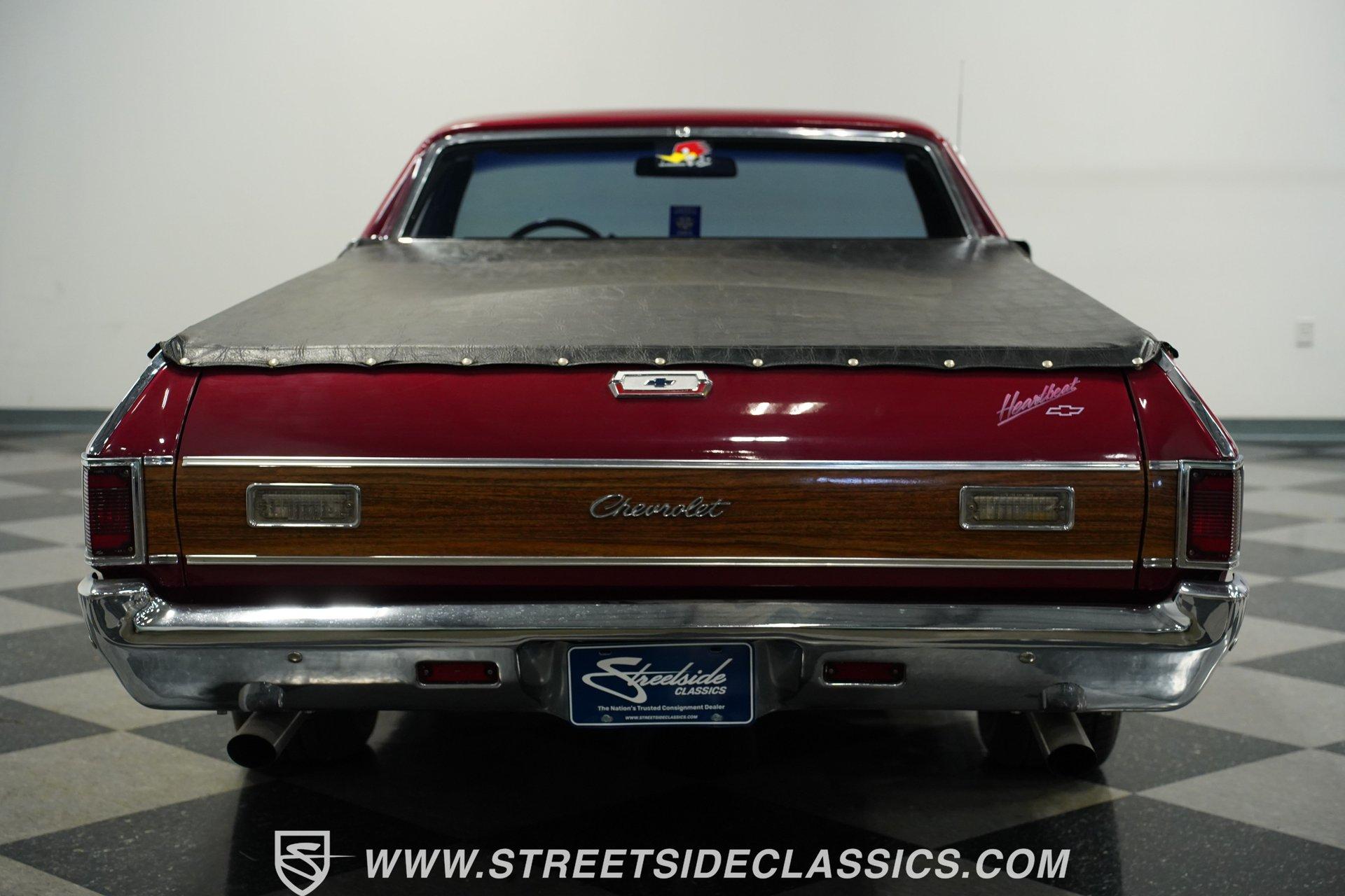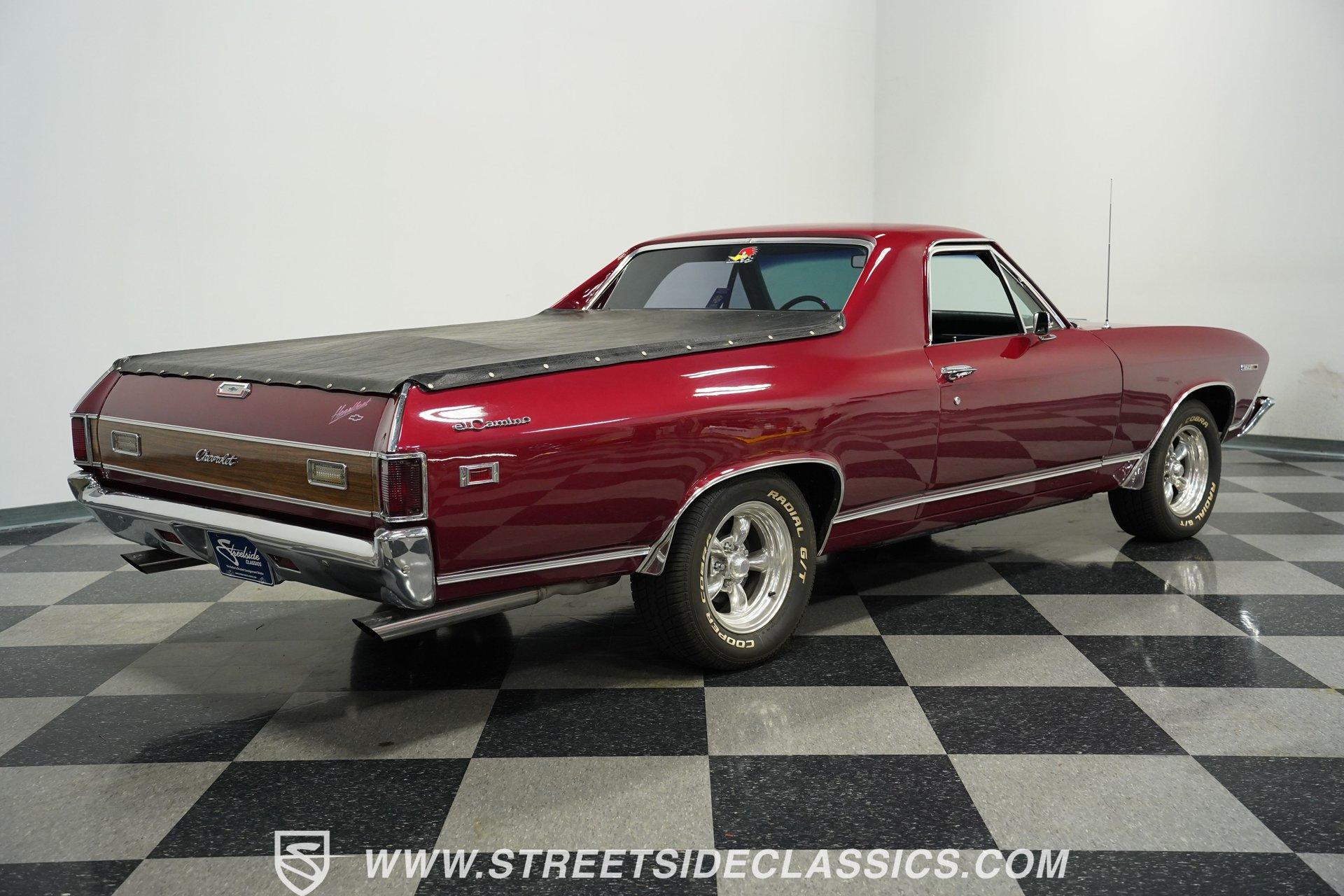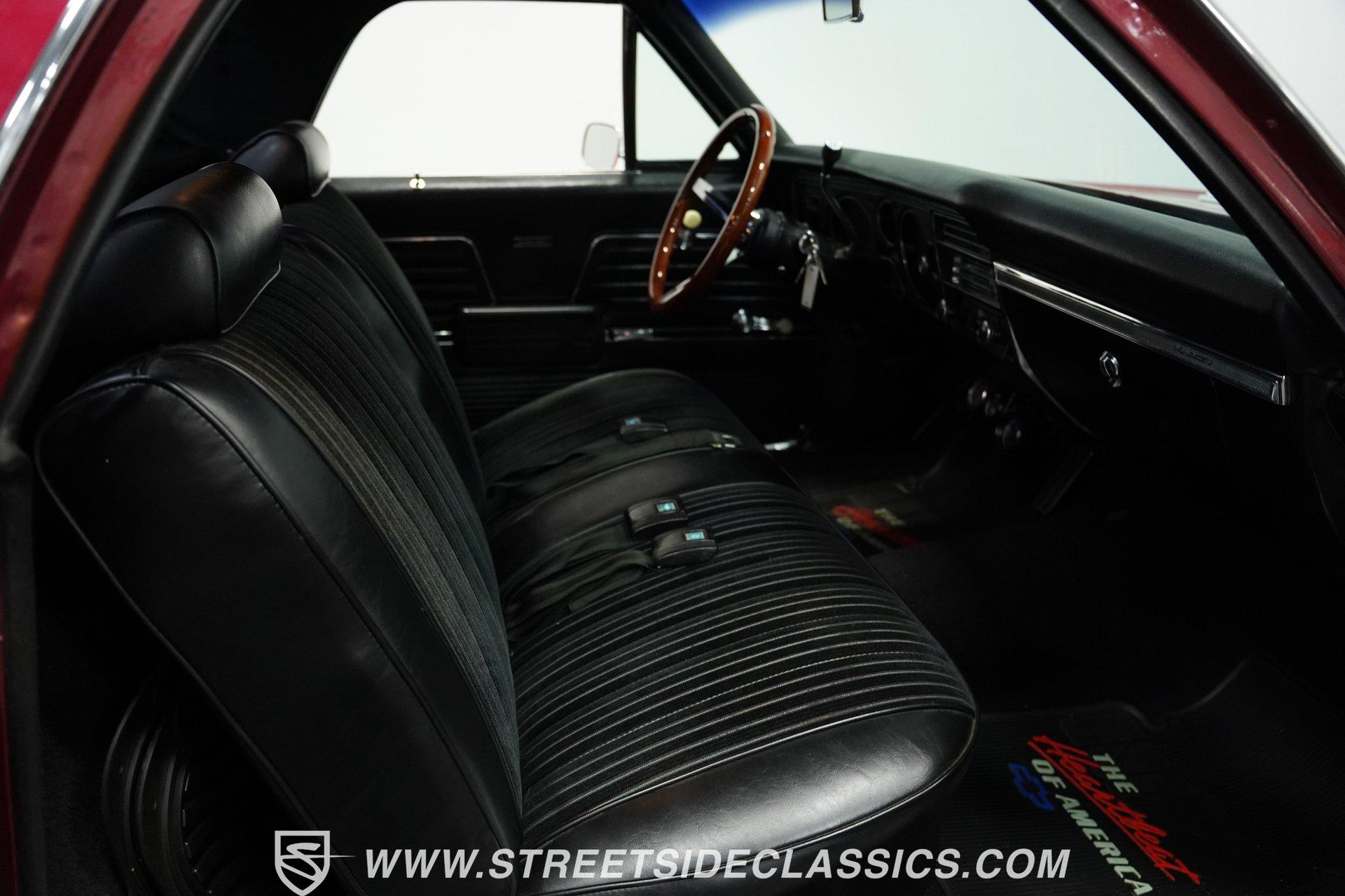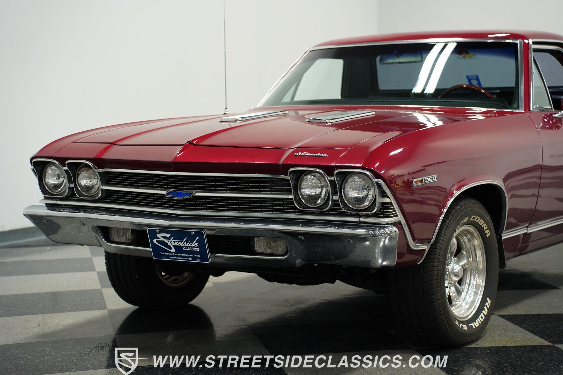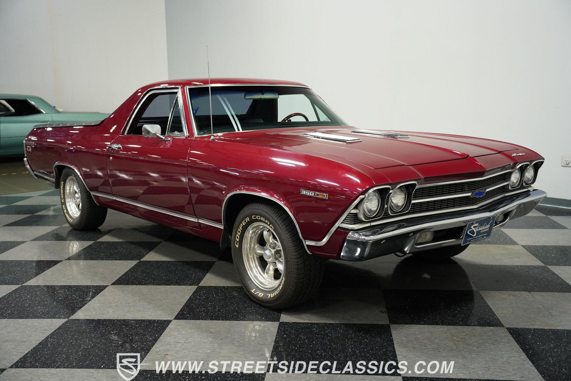 Burgundy paint lays across the panels of this 1969 Chevrolet El Camino, giving it a strong, clean look that fits the streets just right. The stance is set by 15" American Racing Torq Thrust wheels wrapped in P245/60R15 tires, balancing size and proportion for a confident posture. A snap-down soft bed cover stretches neatly across the back, completing the exterior with a sharp and functional touch. Together, these details make this vehicle carry itself with an unmistakable presence. Inside, the cabin is finished in black with a cloth bench seat at the center. Coated fabric trim adds continuity, while the column shifter keeps things true to its era. The wood steering wheel adds both style and grip, breaking up the darker surfaces with natural contrast. Beneath the dash sit auxiliary gauges, giving extra readouts without overcomplicating the layout. An AM/FM cassette stereo supplies the entertainment, rounding out a cabin that mixes factory-correct details with subtle upgrades. Underneath it all, a 350 cubic inch V8 forms the backbone, paired to a 2-speed Powerglide automatic transmission. The Weiand intake and Edelbrock 4-barrel carburetor feed the setup, while long tube headers push through a FlowMaster dual exhaust, giving the vehicle the right kind of rumble. A 10-bolt rear axle supports the power, and both power steering and power brakes are included. Suspension is A-arm coils and shocks up front, with a coil spring rear and aftermarket trailing arms for added strength and stability. HIGHLIGHTS 350 V8 Engine Edelbrock 4-Barrel Carburetor Weiand Intake 2-Speed Powerglide Automatic Transmission Long Tube Headers FlowMaster Dual Exhaust 10-Bolt Rear End Power Steering Power Brakes A-Arm Front Suspension With Coil Springs And Shocks Rear Coil Suspension With Shocks And Aftermarket Trailing Arms Burgundy Full Repaint 15" American Racing Torq Thrust Wheels P245/60R15 Tires Snap-Down Soft Bed Cover Black Interior With Bench Seat (Trim Code 755) Cloth Upholstery Column Shifter Wood Steering Wheel AM/FM Cassette Stereo Auxiliary Gauges Under Dash This 1969 Chevrolet El Camino has classic looks with a tough drivetrain and the right touches inside and out. With the stance, sound, and presence already dialed in, it's the kind of vehicle built to be enjoyed immediately. Call today!
