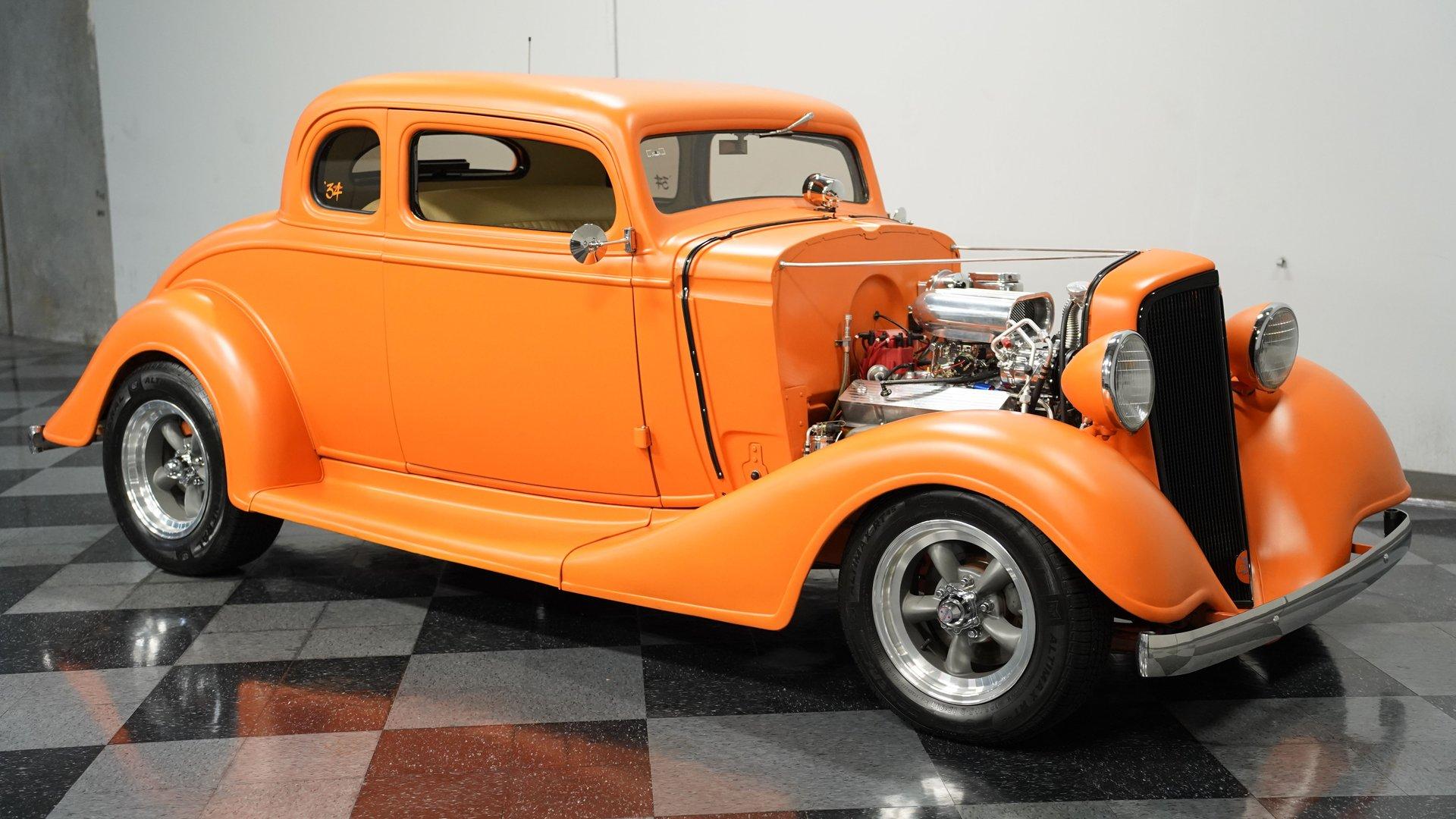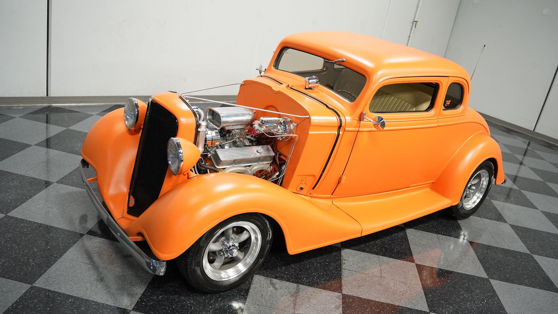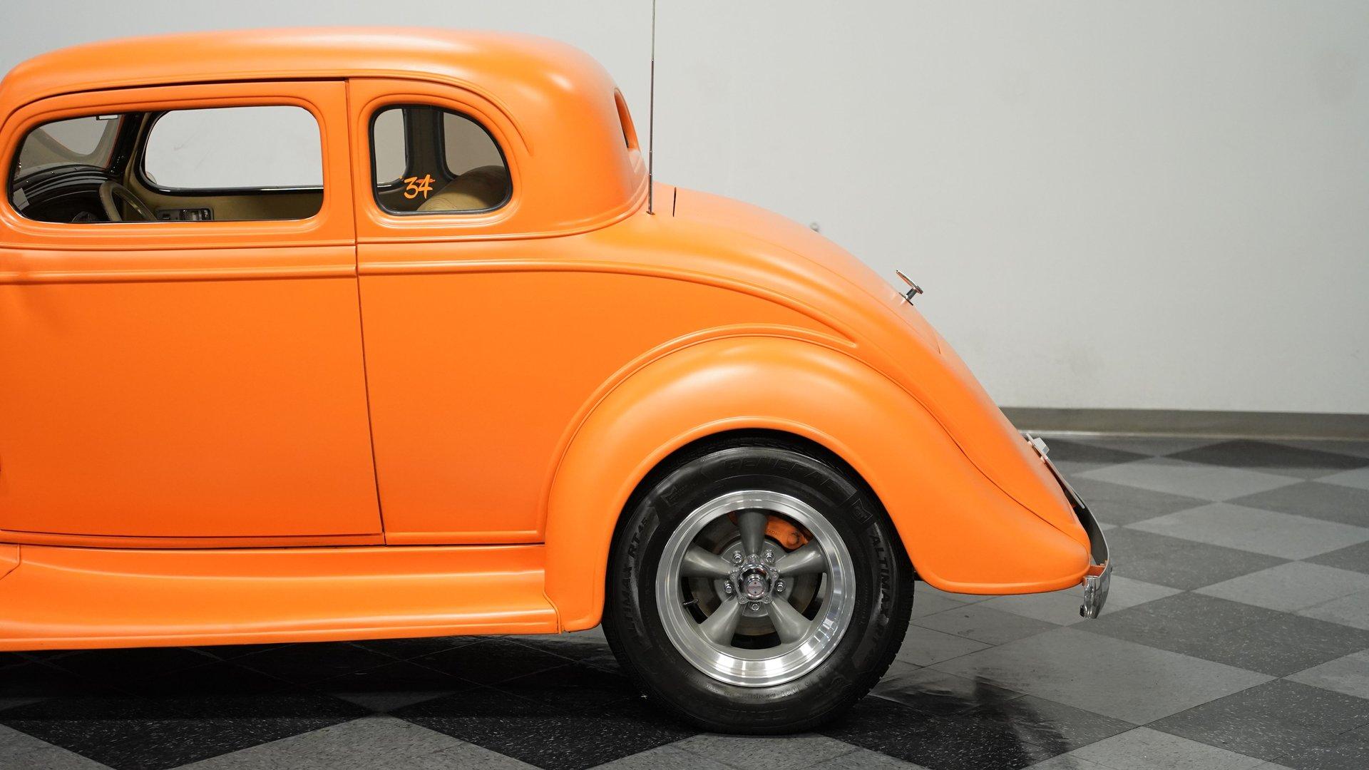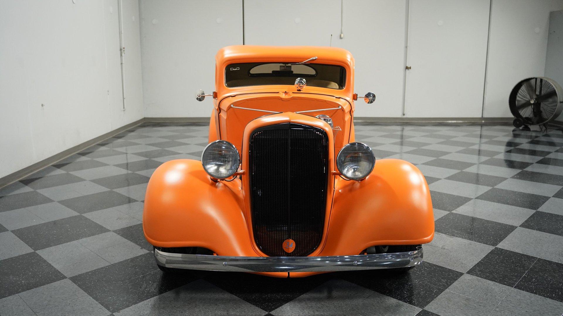 Crafted from genuine steel throughout, from body to fenders and running boards, this 1934 Chevrolet 5 Window Coupe sports a distinct matte orange finish. The clean, streamlined profile benefits from shaved door handles and frenched antenna and tail lights for a smooth, uncluttered appearance. Contrasting American Racing wheels - 15" up front and 16" in back - complete the stance, wrapped in 195/65R15 front and 235/65R15 rear rubber. A cowl-mounted tachometer adds a functional touch to the classic profile. Inside the cabin, cream-colored rolled and pleated Naugahyde creates a contrast against the orange exterior. The dashboard features clear gauges framed by billet aluminum surrounds, matching the door pulls and glove box accents. A chrome steering column connects to a color-coordinated steering wheel, while a Genie floor-mounted shifter puts control at your disposal. The AM/FM cassette player provides entertainment while you cruise in comfort. Both the headliner above and trunk below received matching upholstery treatment. A 350 cubic inch V8 (casting #3970010) powers this classic Chevy, fed by an Edelbrock AVS 650 carburetor with electric choke. The engine bay shines with billet valve covers and polished accessories. A Griffin aluminum radiator with electric cooling fan keeps temperatures in check. The TH350 3-speed automatic transmission sends power to the C3 Corvette rear end with 3.73 gears. Ram-style manifolds with electric cutouts allow for sound adjustment, while four-wheel power disc brakes complete the package. HIGHLIGHTS: 350 V8 Engine TH350 3-Speed Automatic Transmission Edelbrock AVS 650 Carburetor With Electric Choke Griffin Aluminum Radiator With Electric Cooling Fan Electric Cutouts HEI Distributor With 8mm Wires Four-Wheel Power Disc Brakes C3 Corvette Rear End With 3.73 Gears Ram-Style Manifolds Matte Orange PaintWith Gyeone Ceramic Coating All Steel Body, Fenders, And Running Boards Shaved Door Handles Frenched Antenna And Tail Lights 15" Front, 16" Rear American Racing Wheels 195/65R15 Front, 235/65R15 Rear Tires Cowl-Mounted Tachometer Chrome Bumpers Cream Rolled And Pleated Naugahyde Interior Bench Seat Billet Aluminum Gauge Surrounds, Door Pulls, And Glove Box Chrome Steering Column Genie Floor-Mounted Shifter Matching Steering Wheel AM/FM Cassette Player Power Windows Air Conditioning Flaming River Variable Power Steering Tilt Wheel Backup Camera In Trunk This 1934 Chevrolet 5 Window Coupe with all-steel construction, timeless hot rod styling, and proven small block power into one cohesive package. It's a build that's ready for show or street, and it's got the details to back it up. Call today!