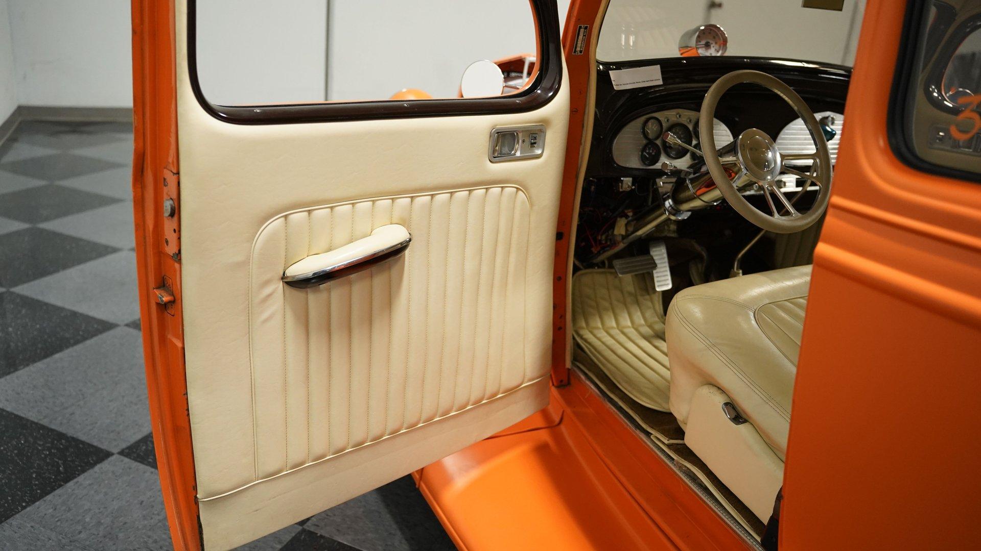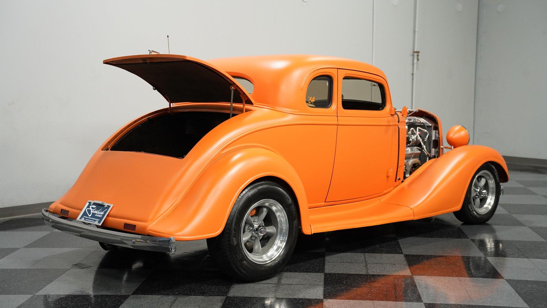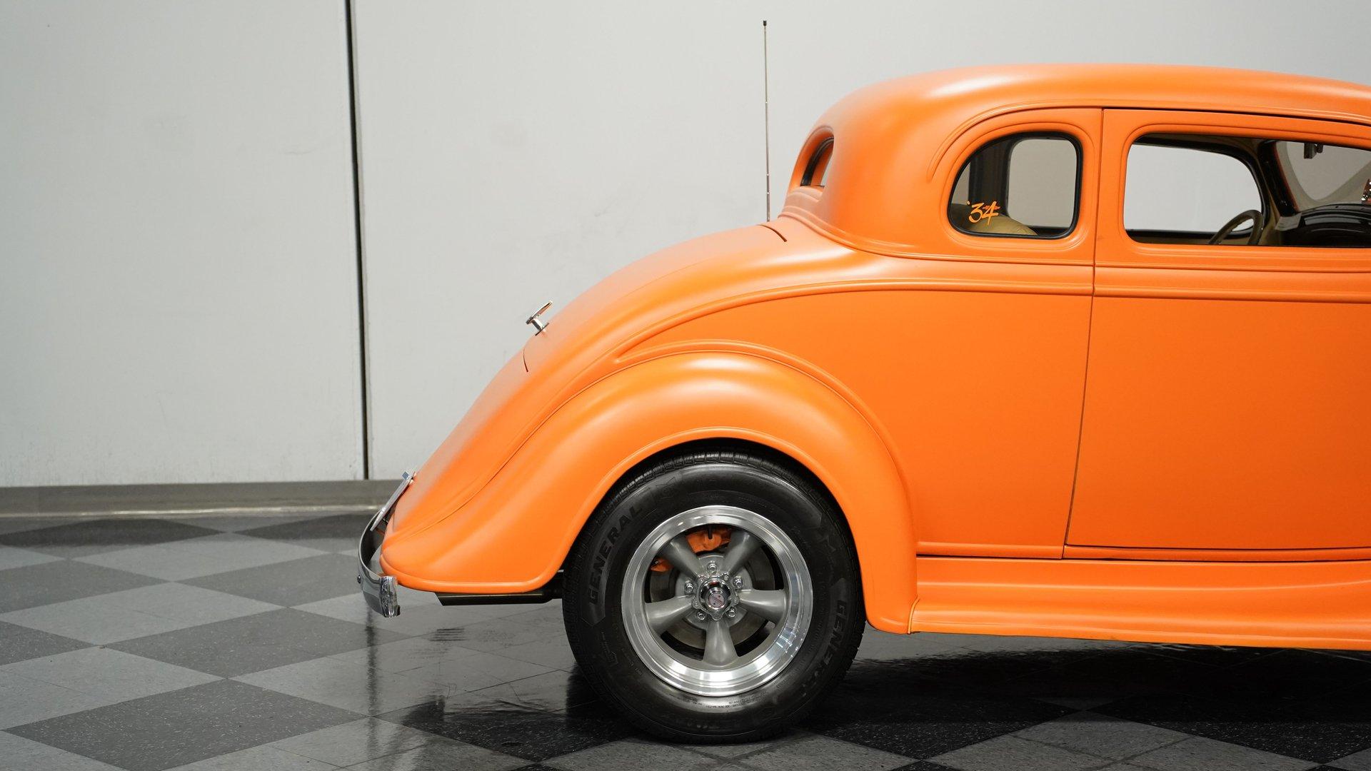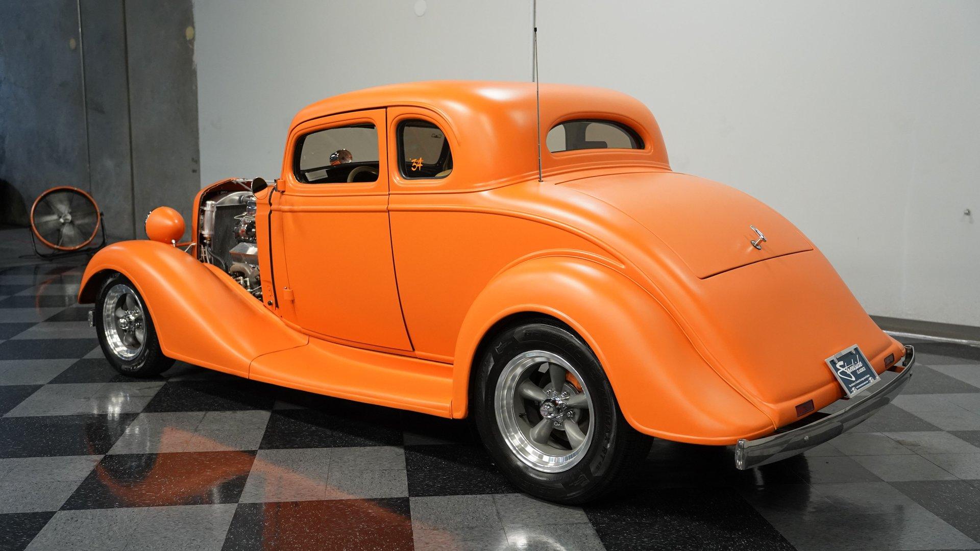 Crafted from genuine steel throughout, from body to fenders and running boards, this 1934 Chevrolet 5 Window Coupe sports a distinct matte orange finish. The clean, streamlined profile benefits from shaved door handles and frenched antenna and tail lights for a smooth, uncluttered appearance. Contrasting American Racing wheels - 15" up front and 16" in back - complete the stance, wrapped in 195/65R15 front and 235/65R15 rear rubber. A cowl-mounted tachometer adds a functional touch to the classic profile. Inside the cabin, cream-colored rolled and pleated Naugahyde creates a contrast against the orange exterior. The dashboard features clear gauges framed by billet aluminum surrounds, matching the door pulls and glove box accents. A chrome steering column connects to a color-coordinated steering wheel, while a Genie floor-mounted shifter puts control at your disposal. The AM/FM cassette player provides entertainment while you cruise in comfort. Both the headliner above and trunk below received matching upholstery treatment. A 350 cubic inch V8 (casting #3970010) powers this classic Chevy, fed by an Edelbrock AVS 650 carburetor with electric choke. The engine bay shines with billet valve covers and polished accessories. A Griffin aluminum radiator with electric cooling fan keeps temperatures in check. The TH350 3-speed automatic transmission sends power to the C3 Corvette rear end with 3.73 gears. Ram-style manifolds with electric cutouts allow for sound adjustment, while four-wheel power disc brakes complete the package. HIGHLIGHTS: 350 V8 Engine TH350 3-Speed Automatic Transmission Edelbrock AVS 650 Carburetor With Electric Choke Griffin Aluminum Radiator With Electric Cooling Fan Electric Cutouts HEI Distributor With 8mm Wires Four-Wheel Power Disc Brakes C3 Corvette Rear End With 3.73 Gears Ram-Style Manifolds Matte Orange PaintWith Gyeone Ceramic Coating All Steel Body, Fenders, And Running Boards Shaved Door Handles Frenched Antenna And Tail Lights 15" Front, 16" Rear American Racing Wheels 195/65R15 Front, 235/65R15 Rear Tires Cowl-Mounted Tachometer Chrome Bumpers Cream Rolled And Pleated Naugahyde Interior Bench Seat Billet Aluminum Gauge Surrounds, Door Pulls, And Glove Box Chrome Steering Column Genie Floor-Mounted Shifter Matching Steering Wheel AM/FM Cassette Player Power Windows Air Conditioning Flaming River Variable Power Steering Tilt Wheel Backup Camera In Trunk This 1934 Chevrolet 5 Window Coupe with all-steel construction, timeless hot rod styling, and proven small block power into one cohesive package. It's a build that's ready for show or street, and it's got the details to back it up. Call today!