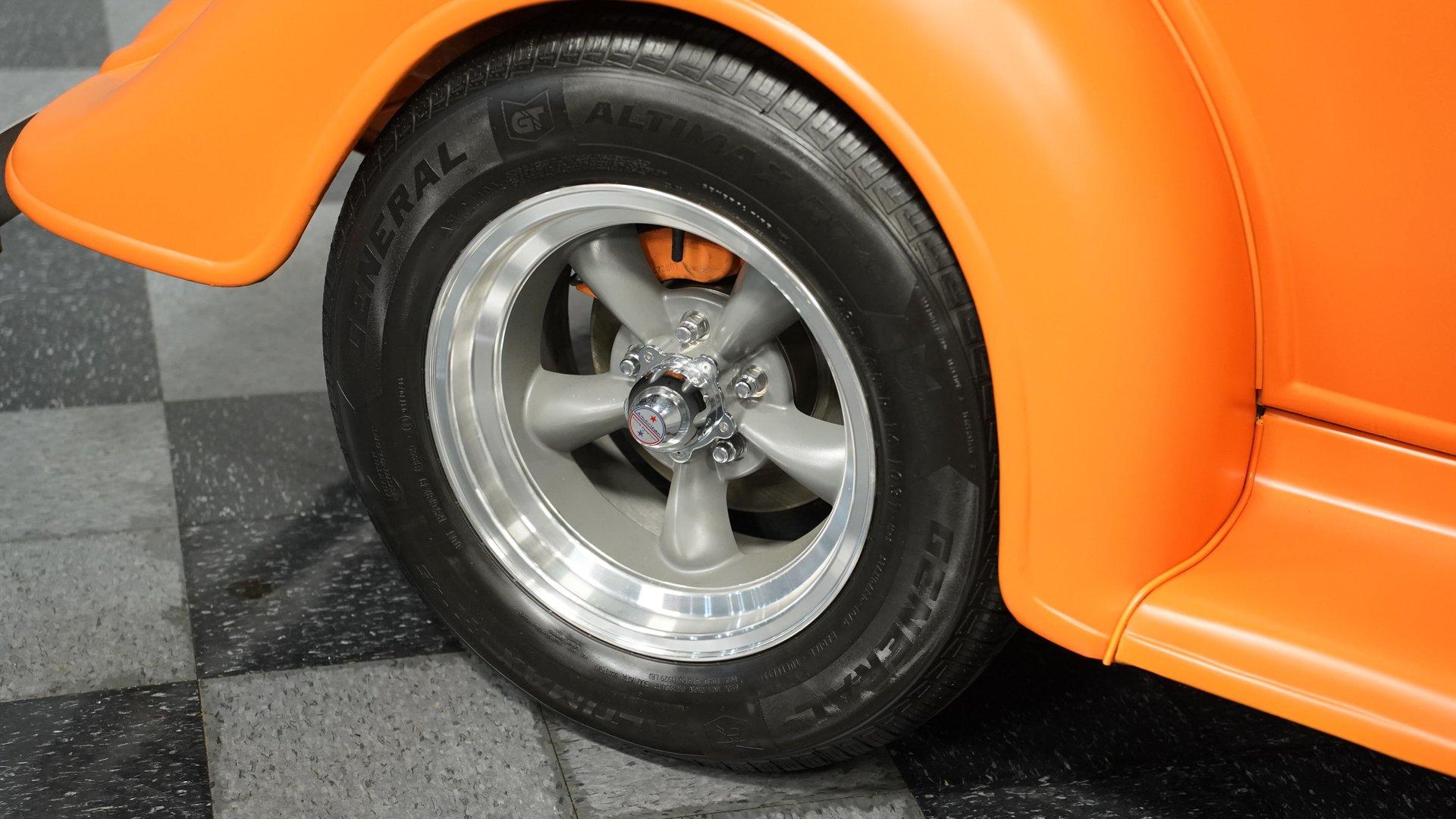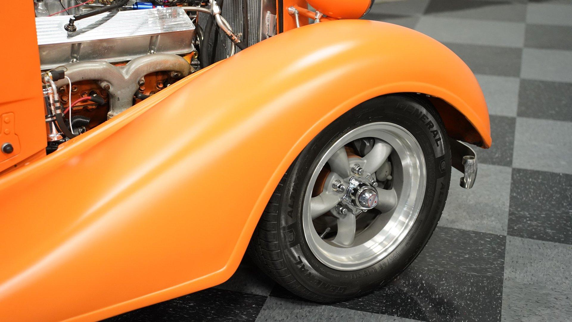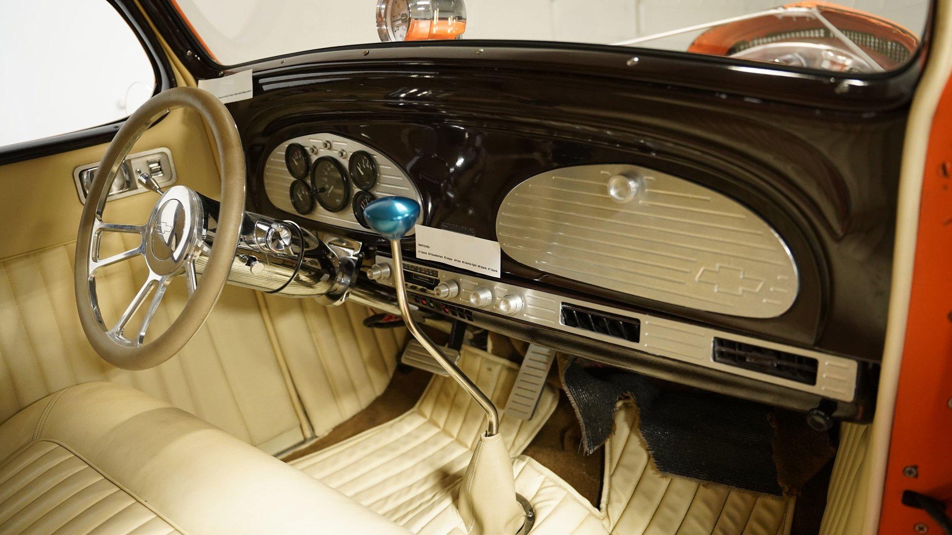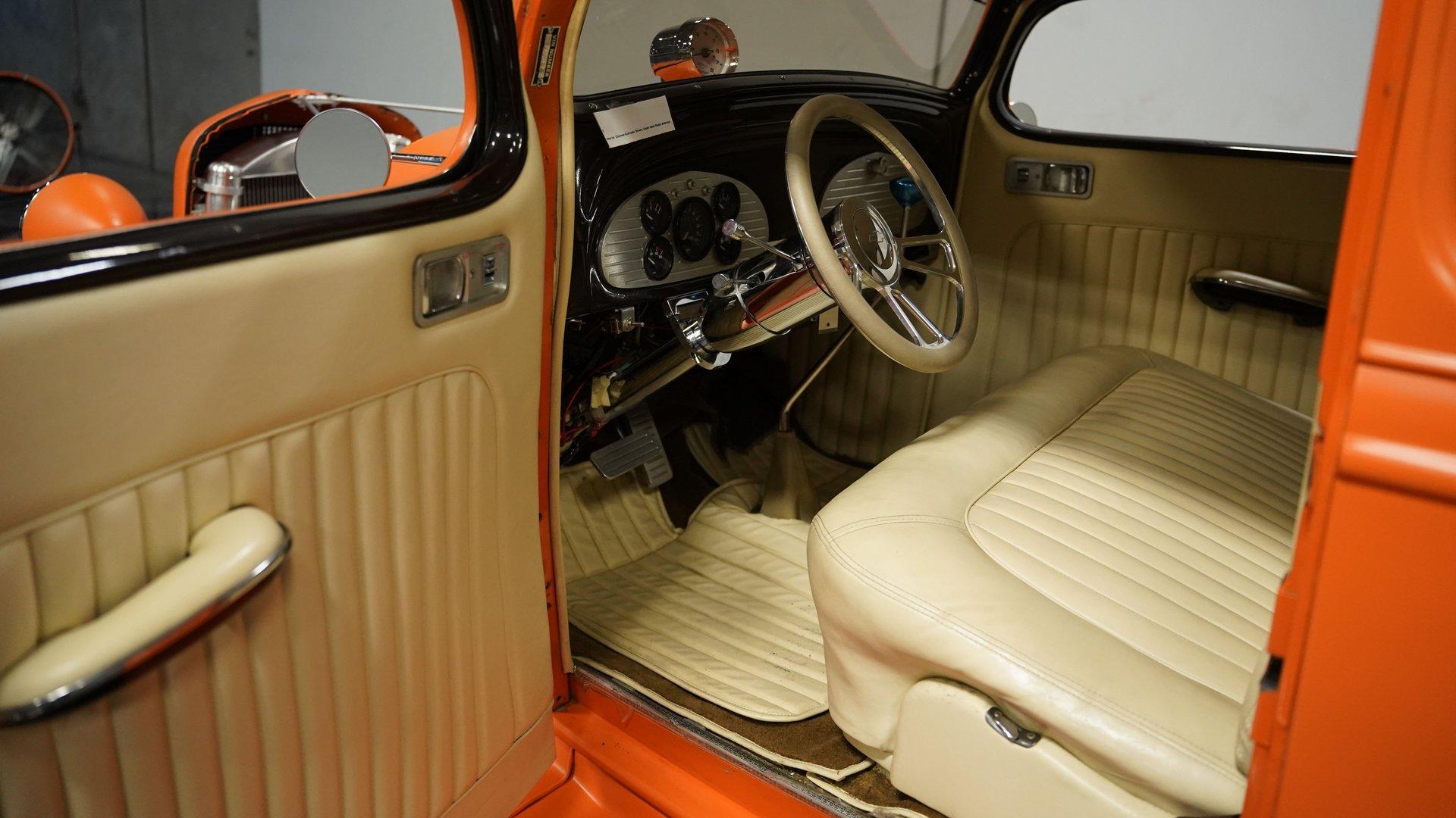Crafted from genuine steel throughout, from body to fenders and running boards, this 1934 Chevrolet 5 Window Coupe sports a distinct matte orange finish. The clean, streamlined profile benefits from shaved door handles and frenched antenna and tail lights for a smooth, uncluttered appearance. Contrasting American Racing wheels - 15" up front and 16" in back - complete the stance, wrapped in 195/65R15 front and 235/65R15 rear rubber. A cowl-mounted tachometer adds a functional touch to the classic profile. Inside the cabin, cream-colored rolled and pleated Naugahyde creates a contrast against the orange exterior. The dashboard features clear gauges framed by billet aluminum surrounds, matching the door pulls and glove box accents. A chrome steering column connects to a color-coordinated steering wheel, while a Genie floor-mounted shifter puts control at your disposal. The AM/FM cassette player provides entertainment while you cruise in comfort. Both the headliner above and trunk below received matching upholstery treatment. A 350 cubic inch V8 (casting #3970010) powers this classic Chevy, fed by an Edelbrock AVS 650 carburetor with electric choke. The engine bay shines with billet valve covers and polished accessories. A Griffin aluminum radiator with electric cooling fan keeps temperatures in check. The TH350 3-speed automatic transmission sends power to the C3 Corvette rear end with 3.73 gears. Ram-style manifolds with electric cutouts allow for sound adjustment, while four-wheel power disc brakes complete the package. HIGHLIGHTS: 350 V8 Engine TH350 3-Speed Automatic Transmission Edelbrock AVS 650 Carburetor With Electric Choke Griffin Aluminum Radiator With Electric Cooling Fan Electric Cutouts HEI Distributor With 8mm Wires Four-Wheel Power Disc Brakes C3 Corvette Rear End With 3.73 Gears Ram-Style Manifolds Matte Orange PaintWith Gyeone Ceramic Coating All Steel Body, Fenders, And Running Boards Shaved Door Handles Frenched Antenna And Tail Lights 15" Front, 16" Rear American Racing Wheels 195/65R15 Front, 235/65R15 Rear Tires Cowl-Mounted Tachometer Chrome Bumpers Cream Rolled And Pleated Naugahyde Interior Bench Seat Billet Aluminum Gauge Surrounds, Door Pulls, And Glove Box Chrome Steering Column Genie Floor-Mounted Shifter Matching Steering Wheel AM/FM Cassette Player Power Windows Air Conditioning Flaming River Variable Power Steering Tilt Wheel Backup Camera In Trunk This 1934 Chevrolet 5 Window Coupe with all-steel construction, timeless hot rod styling, and proven small block power into one cohesive package. It's a build that's ready for show or street, and it's got the details to back it up. Call today!