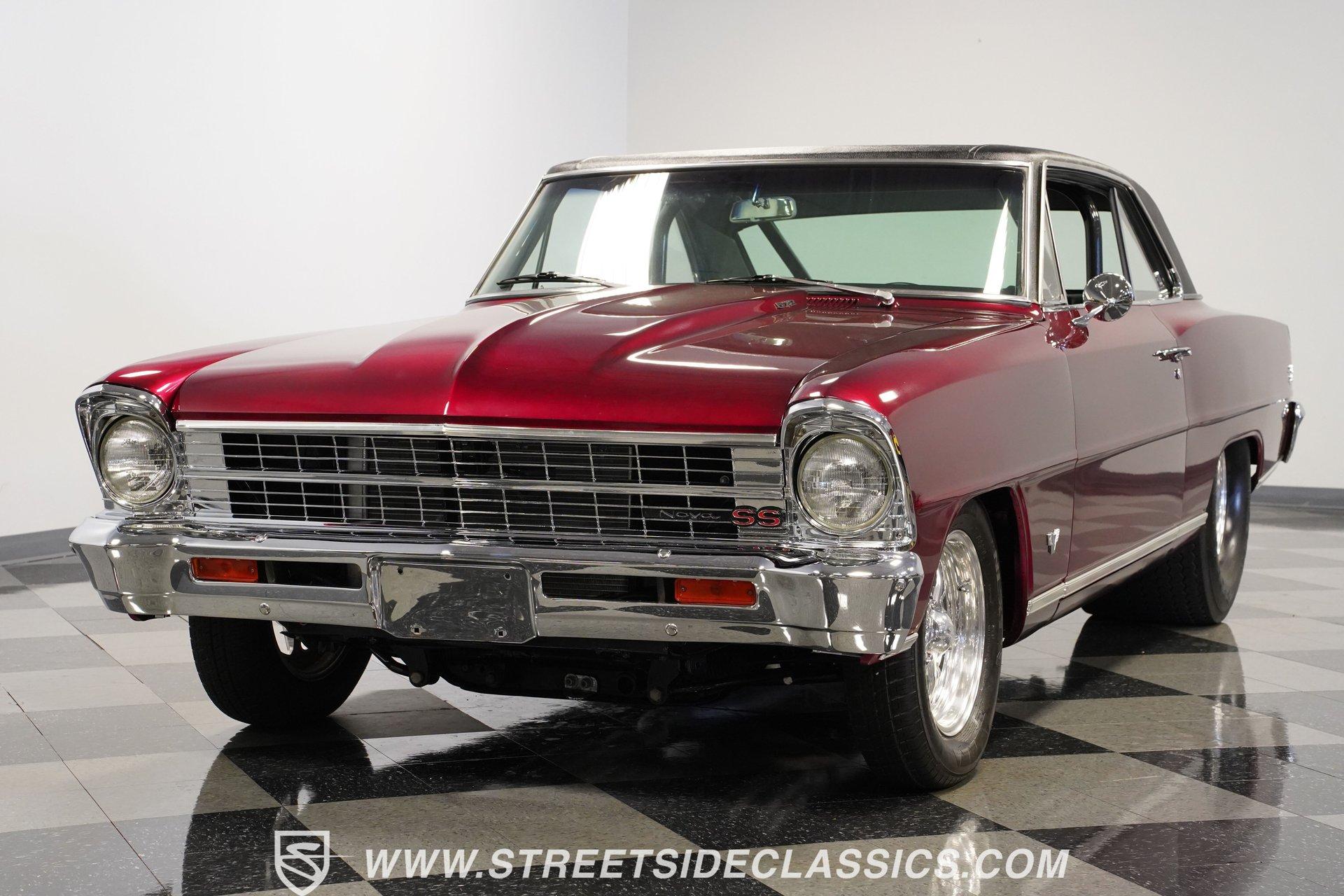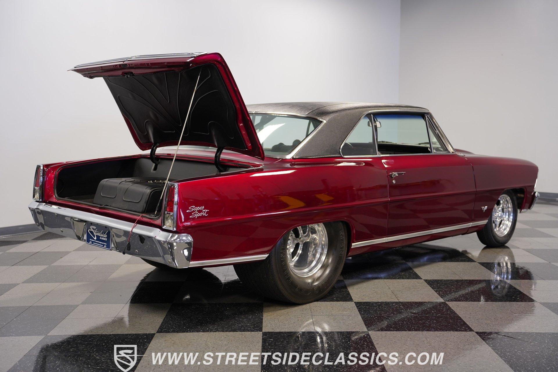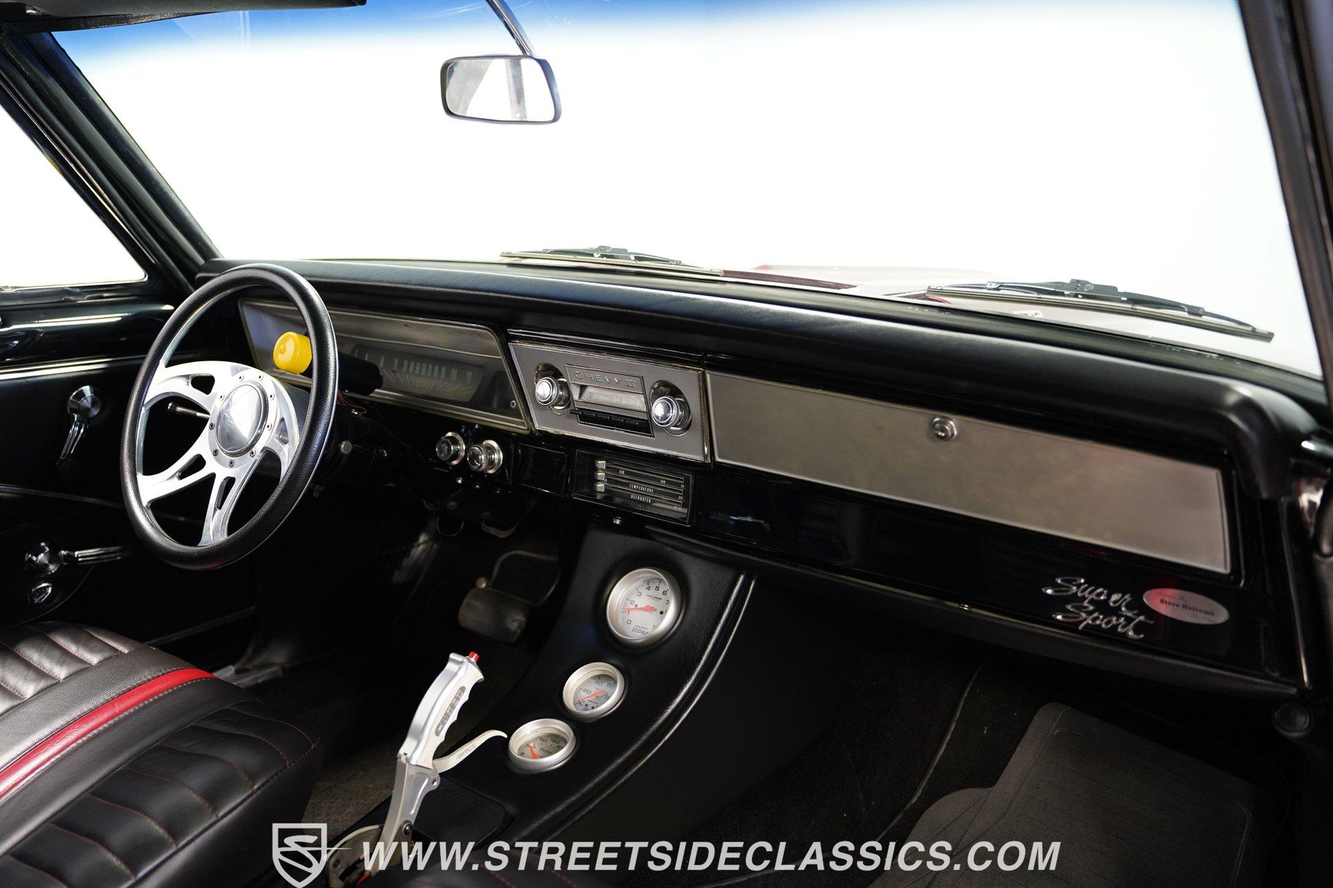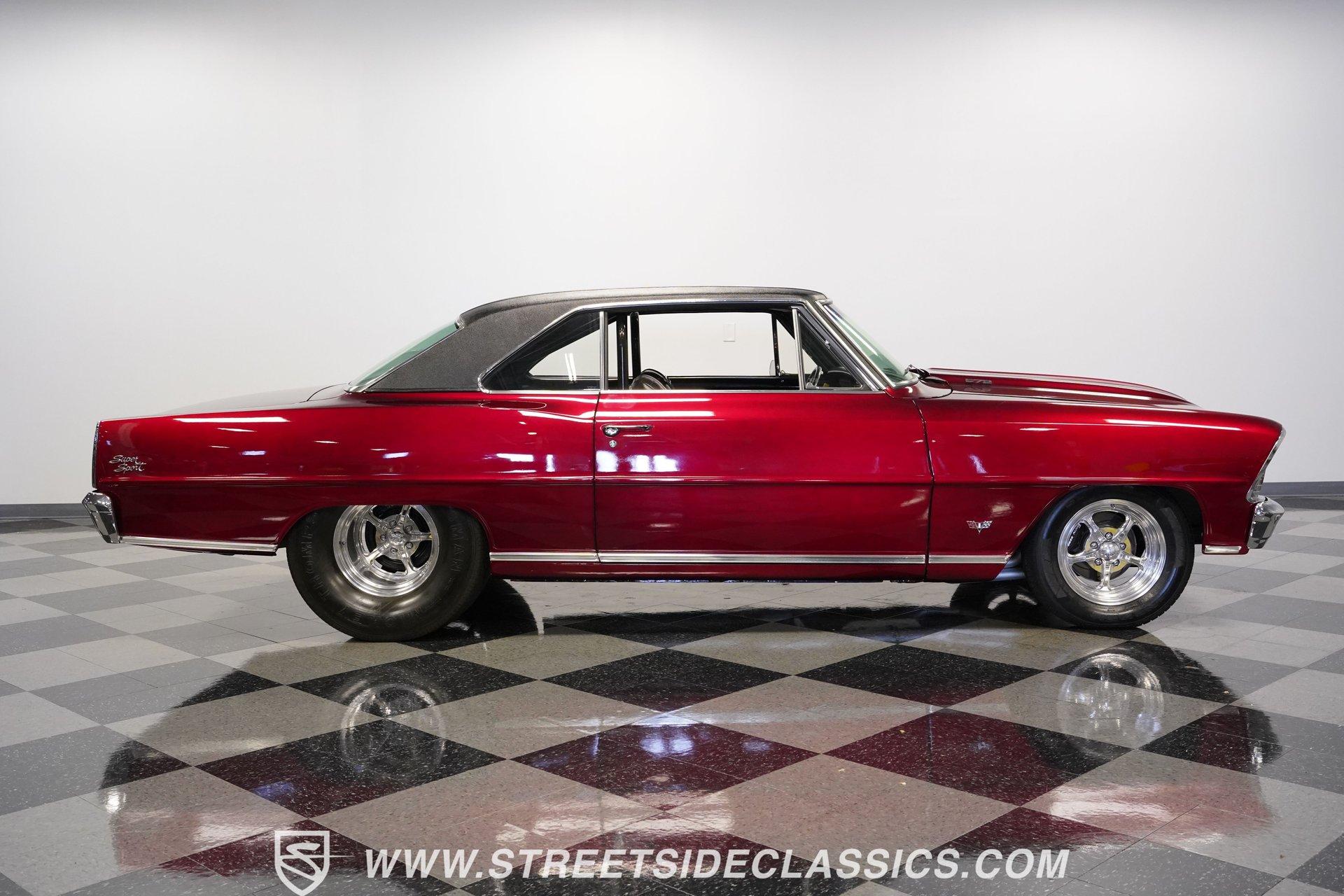A chrome-dipped grille sits proudly out front of this 1967 Chevrolet Nova Chevy II Pro Street, setting off the Brandywine Candy paint that drapes across its panels with intensity. The cowl hood gives it a hard-edged presence, flanked by SS badging that signals its attitude. A black vinyl roof adds contrast to the body, while the Billet Specialties wheels, staggered with narrow 165/80R15 fronts and mammoth 33x19.5-15LT rears, anchor down the tubbed stance. This car looks every bit ready for business. Inside, the black and red theme runs deep. Leather bucket seats with a full-length console set the tone, while Autometer gauges line up across the dash to keep tabs on the power. A Hurst ratchet shifter takes center stage, wrapped in gloss finishes that carry across the doors and dashboard. A roll bar stretches through the cabin with added bracing, racing harnesses in place. Door panels, carpets, and headliner are cleanly fitted, giving the interior a straight-to-the-point feel. Muscle is supplied by a 540 cubic-inch V8 equipped with a Quickfuel 850 carburetor, Edelbrock intake, aluminum heads, and long tube headers. Backing it is a TH400 three-speed automatic with a fresh converter feeding a narrowed Ford 9-inch rear end set with 4.10 gears. A Mustang II front suspension pairs with QA1 coilovers and ladder bars in the rear, tied together with subframe connectors. SSBC front disc brakes with a Wilwood master cylinder, dual electric fans on a large aluminum radiator, and FlowMaster dual exhaust round out a mechanical setup that was built to put power to pavement. HIGHLIGHTS 540 V8 Engine (662HP/685TQ Dyno Sheet) Quickfuel 850 4-Barrel Carburetor Edelbrock Aluminum Intake Aluminum Heads Long Tube Headers TH400 3-Speed Automatic Transmission Ford 9-Inch Rear End With 4.10 Gears Mustang II Front Suspension QA1 Coilovers With Ladder Bars Subframe Connectors SSBC Front Disc Brakes Wilwood Master Cylinder Aluminum Radiator With Dual Electric Fans Dual Exhaust With FlowMaster Mufflers Brandywine Candy Paint With Black Vinyl Top Billet Specialties Wheels With 165/80R15 Front Tires And 33x19.5-15LT Rear Tires Chrome Front Grille SS Badging Cowl Hood Black And Red Interior With Leather Bucket Seats Racing Harnesses Carpet, Headliner, And Door Panels In Black Custom Console With Autometer Gauges Hurst Ratchet Shifter Gloss Painted Dash And Door Tops Roll Bar With Additional Bracing Original Gauge Cluster AM Radio Dyno Sheet This1967 Chevrolet Nova Chevy II Pro Street packs the right look and the right equipment, with a serious drivetrain, tough suspension, and a bold Brandywine finish. It's ready-made ground-pounding Pro Street machine with attitude and presence. Call today!