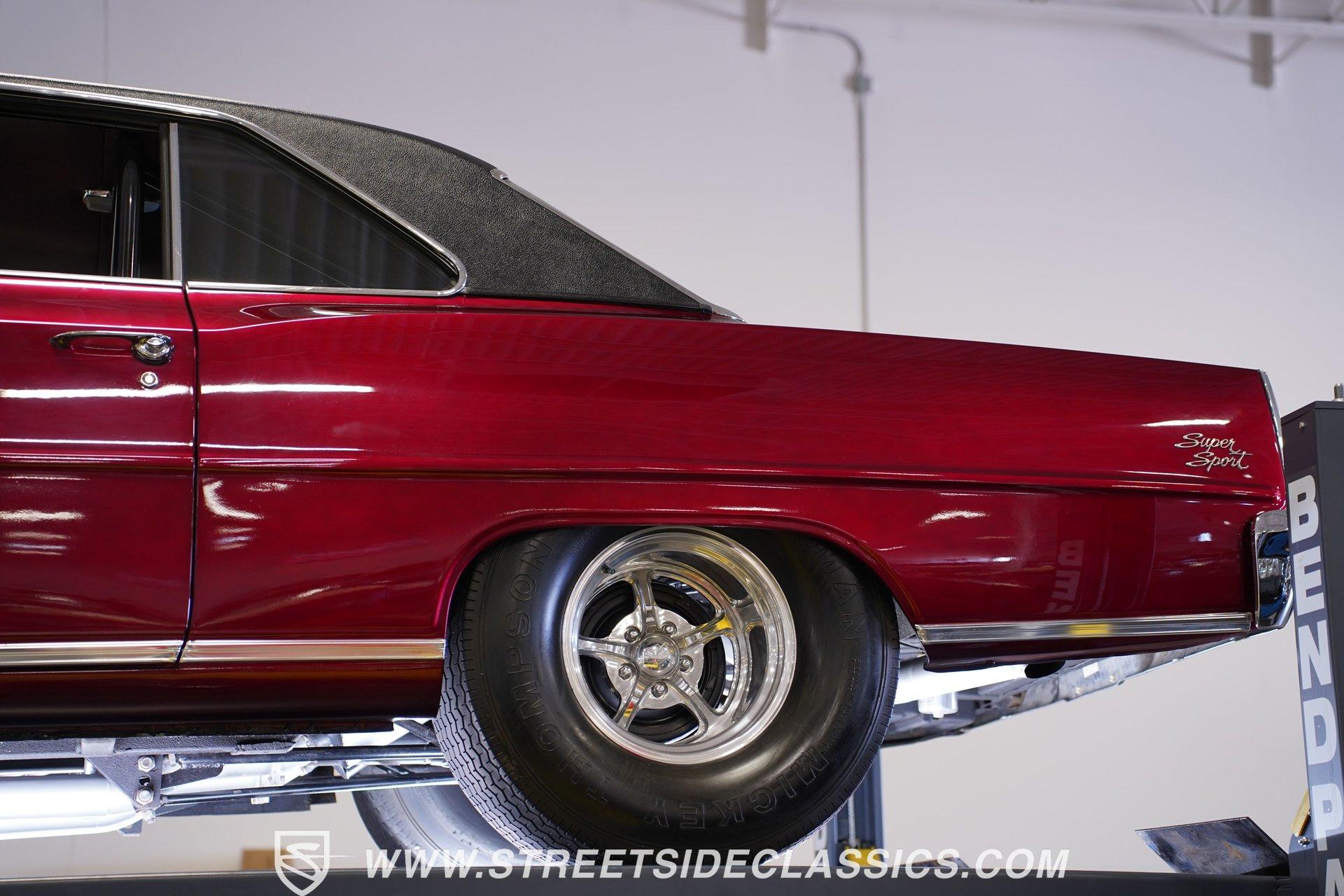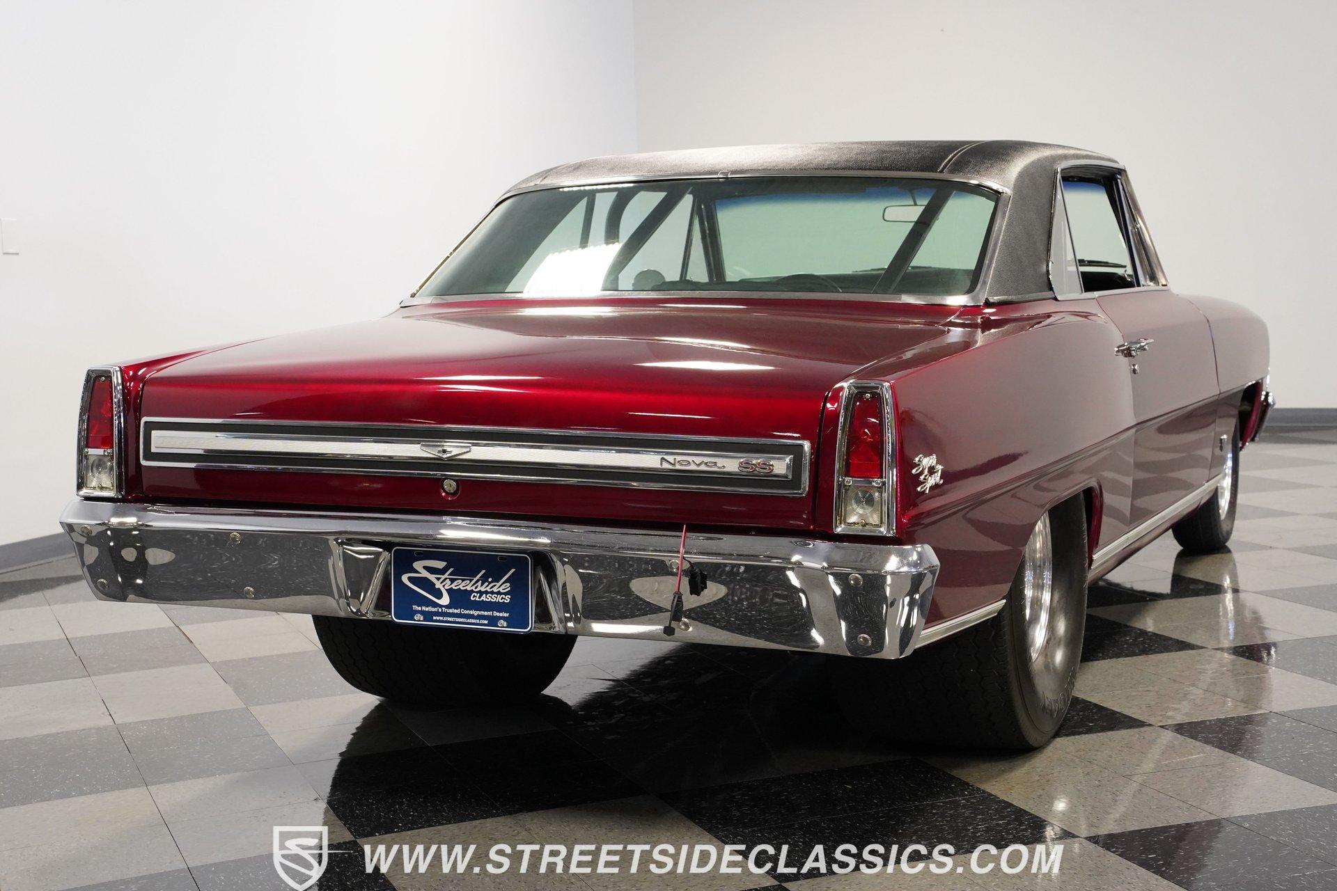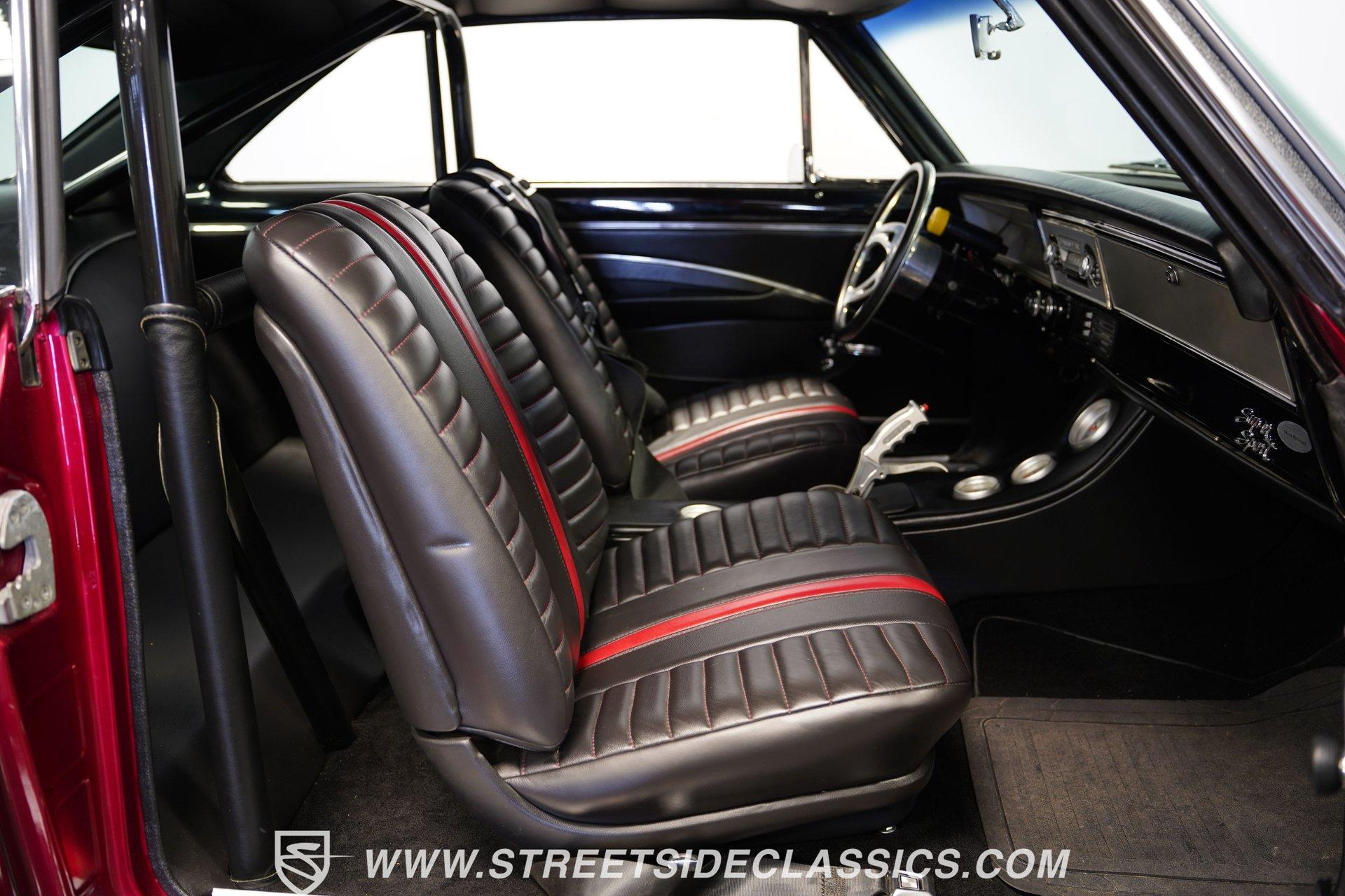 A chrome-dipped grille sits proudly out front of this 1967 Chevrolet Nova Chevy II Pro Street, setting off the Brandywine Candy paint that drapes across its panels with intensity. The cowl hood gives it a hard-edged presence, flanked by SS badging that signals its attitude. A black vinyl roof adds contrast to the body, while the Billet Specialties wheels, staggered with narrow 165/80R15 fronts and mammoth 33x19.5-15LT rears, anchor down the tubbed stance. This car looks every bit ready for business. Inside, the black and red theme runs deep. Leather bucket seats with a full-length console set the tone, while Autometer gauges line up across the dash to keep tabs on the power. A Hurst ratchet shifter takes center stage, wrapped in gloss finishes that carry across the doors and dashboard. A roll bar stretches through the cabin with added bracing, racing harnesses in place. Door panels, carpets, and headliner are cleanly fitted, giving the interior a straight-to-the-point feel. Muscle is supplied by a 540 cubic-inch V8 equipped with a Quickfuel 850 carburetor, Edelbrock intake, aluminum heads, and long tube headers. Backing it is a TH400 three-speed automatic with a fresh converter feeding a narrowed Ford 9-inch rear end set with 4.10 gears. A Mustang II front suspension pairs with QA1 coilovers and ladder bars in the rear, tied together with subframe connectors. SSBC front disc brakes with a Wilwood master cylinder, dual electric fans on a large aluminum radiator, and FlowMaster dual exhaust round out a mechanical setup that was built to put power to pavement. HIGHLIGHTS 540 V8 Engine (662HP/685TQ Dyno Sheet) Quickfuel 850 4-Barrel Carburetor Edelbrock Aluminum Intake Aluminum Heads Long Tube Headers TH400 3-Speed Automatic Transmission Ford 9-Inch Rear End With 4.10 Gears Mustang II Front Suspension QA1 Coilovers With Ladder Bars Subframe Connectors SSBC Front Disc Brakes Wilwood Master Cylinder Aluminum Radiator With Dual Electric Fans Dual Exhaust With FlowMaster Mufflers Brandywine Candy Paint With Black Vinyl Top Billet Specialties Wheels With 165/80R15 Front Tires And 33x19.5-15LT Rear Tires Chrome Front Grille SS Badging Cowl Hood Black And Red Interior With Leather Bucket Seats Racing Harnesses Carpet, Headliner, And Door Panels In Black Custom Console With Autometer Gauges Hurst Ratchet Shifter Gloss Painted Dash And Door Tops Roll Bar With Additional Bracing Original Gauge Cluster AM Radio Dyno Sheet This1967 Chevrolet Nova Chevy II Pro Street packs the right look and the right equipment, with a serious drivetrain, tough suspension, and a bold Brandywine finish. It's ready-made ground-pounding Pro Street machine with attitude and presence. Call today!