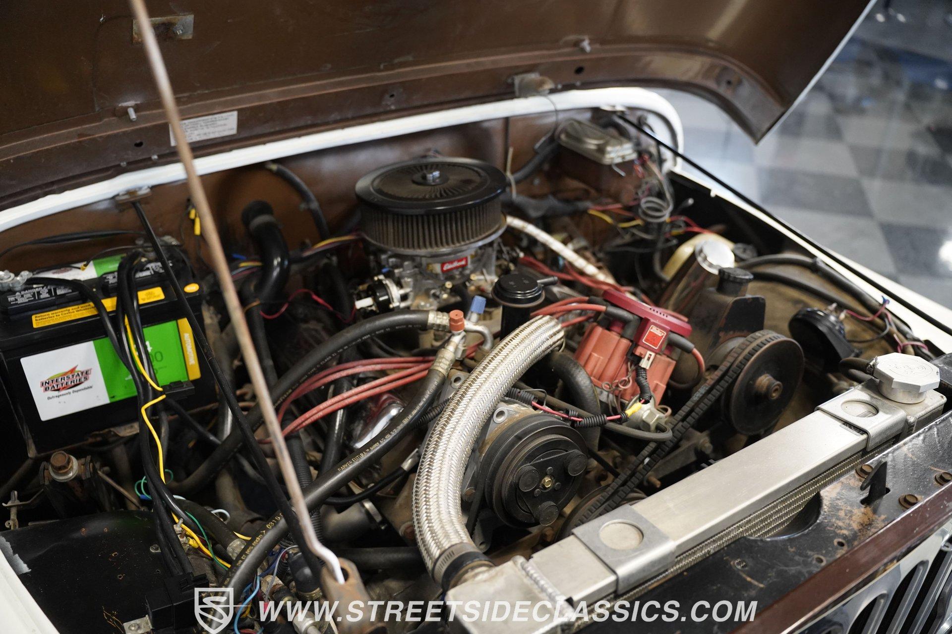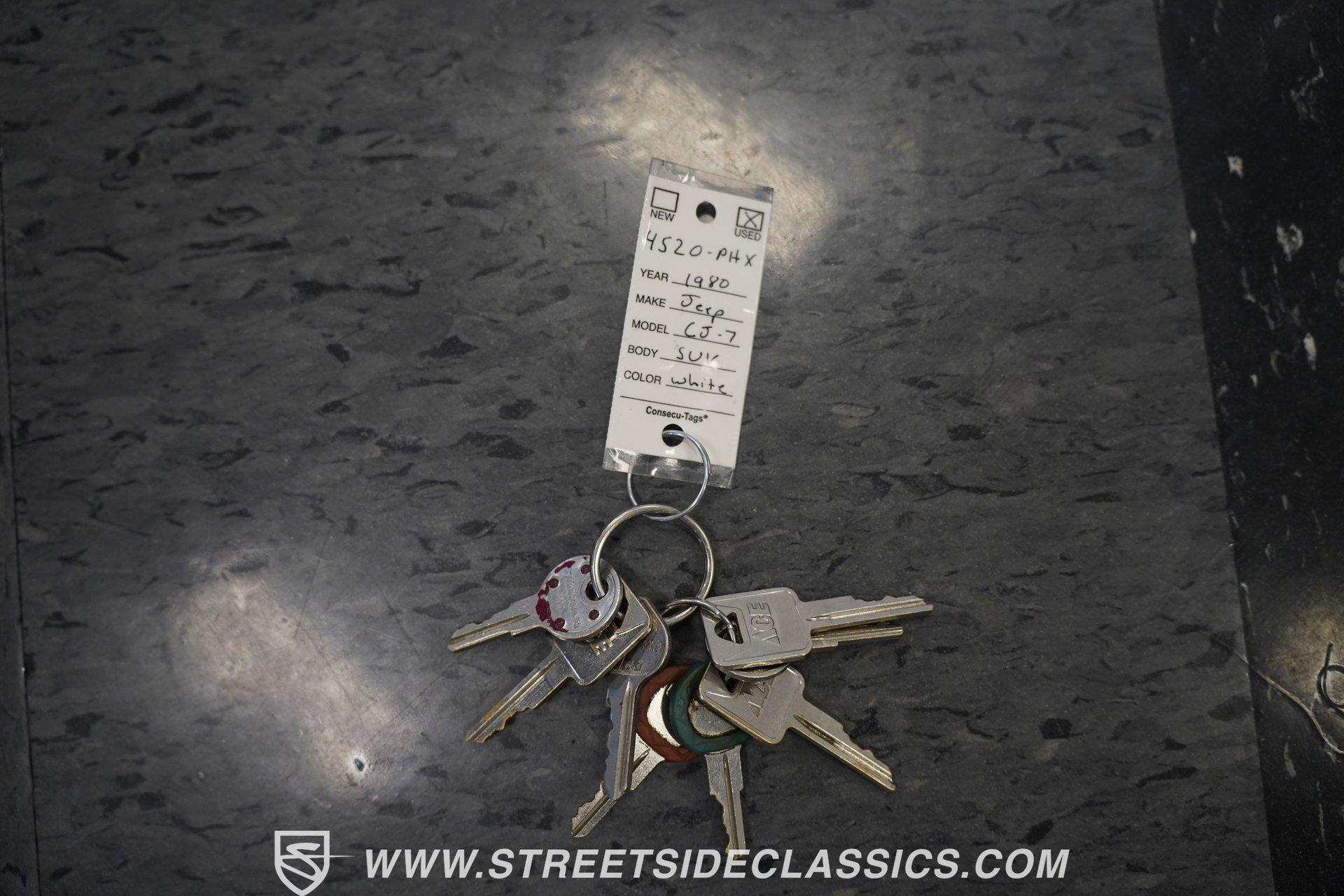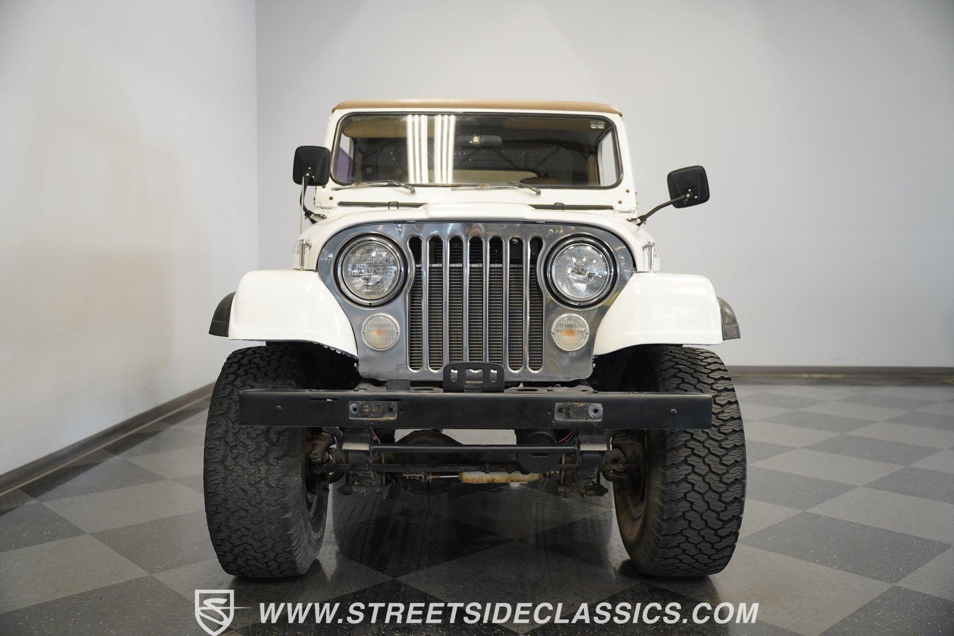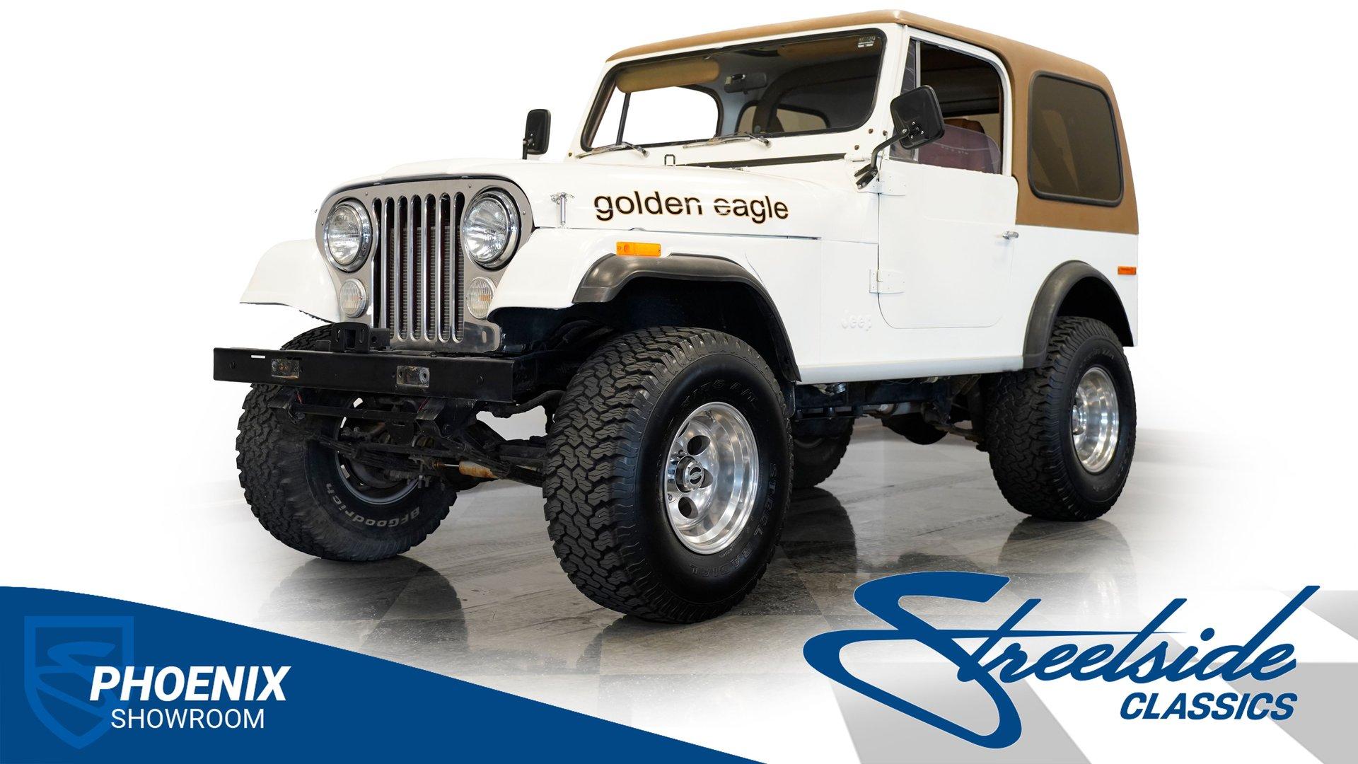 Rolling on massive 33x12.50LT15 all-terrain tires, this 1980 Jeep CJ7 Golden Eagle features white exterior paint accented by distinctive gold eagle graphics. The exterior includes 15" chrome Mickey Thompson-style wheels and metal bumpers at both ends, plus LED tail lights for visibility after dark. Halogen headlights illuminate the path ahead while a brown removable hardtop allows for quick conversion. The chrome grille adds a finishing touch to the front end while providing the unmistakable Jeep face that off-road fans appreciate. Tan vinyl covers the bucket seats inside this rugged machine, complemented by metal door panels with brown inserts throughout the cabin. The floor shifter allows for gear selection while the tilt wheel accommodates drivers of different sizes. Music comes via the AM/FM CD player during long drives on or off the pavement. The center console includes cup holders for added convenience during extended trips. The matching carpet adds a clean look to the floor area, working with the other tan interior components for a cohesive appearance. A 304 CI V8 engine sends output through a 3-speed automatic transmission and four-wheel drive system for moving across varied terrain types. The Dana 30 front axle works in conjunction with the AMC Model 20 rear axle for directing power where needed. Solid axles with leaf springs support each corner of this off-roader. Power steering reduces driver effort while front disc brakes handle stopping duties. The dual exhaust setup with Flowmaster mufflers and shorty manifolds gives this V8-powered trail machine its exhaust note, announcing its arrival on the trail. HIGHLIGHTS: 304 CI V8 Engine 3 Speed Automatic Transmission Four Wheel Drive Front Disc Brakes Dana 30 Front Axle AMC Model 20 Rear Axle Dual Exhaust With Flowmaster Mufflers Shorty Manifolds White Paint With Gold Eagle Graphics Brown Removable Hard Top 15" Chrome Mickey Thompson-Style Wheels 33x12.50LT15 All-Terrain Tires Front And Rear Metal Bumpers LED Tail Lights Halogen Headlights Chrome Grille Tan Interior With Bucket Seats Metal Door Panels With Brown Inserts Tilt Steering Wheel Power Steering Floor Shifter Center Console With Cup Holders AM/FM CD Player Matching Carpet Seatbelts A V8-powered off-road machine from the 1980s, this Jeep CJ7 Golden Eagle offers both style and capability in a classic package. From mud to rocks to sand and snow, this four-wheel drive vehicle takes you beyond where the pavement ends while looking good along the way. Call today!