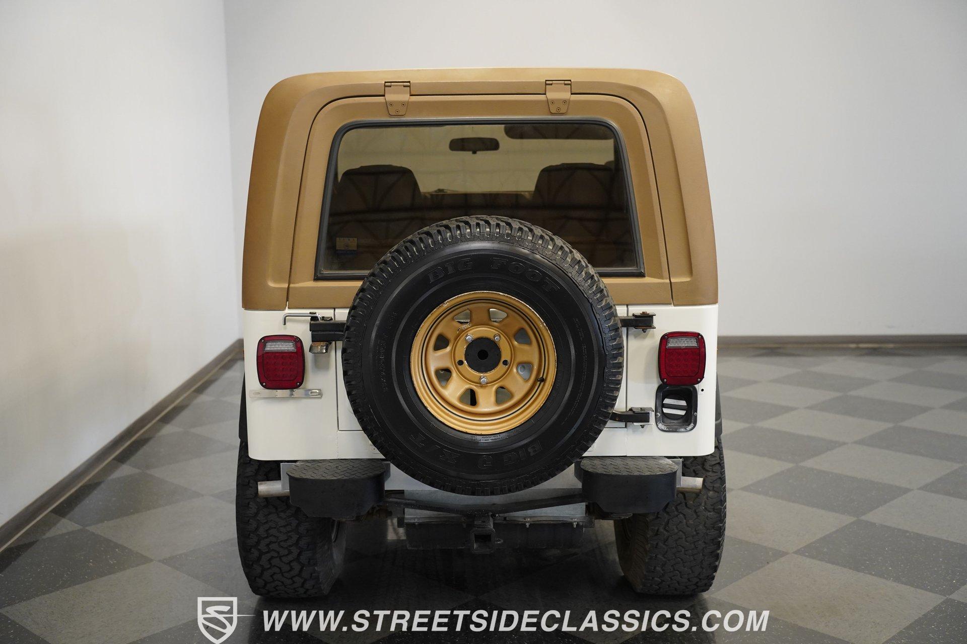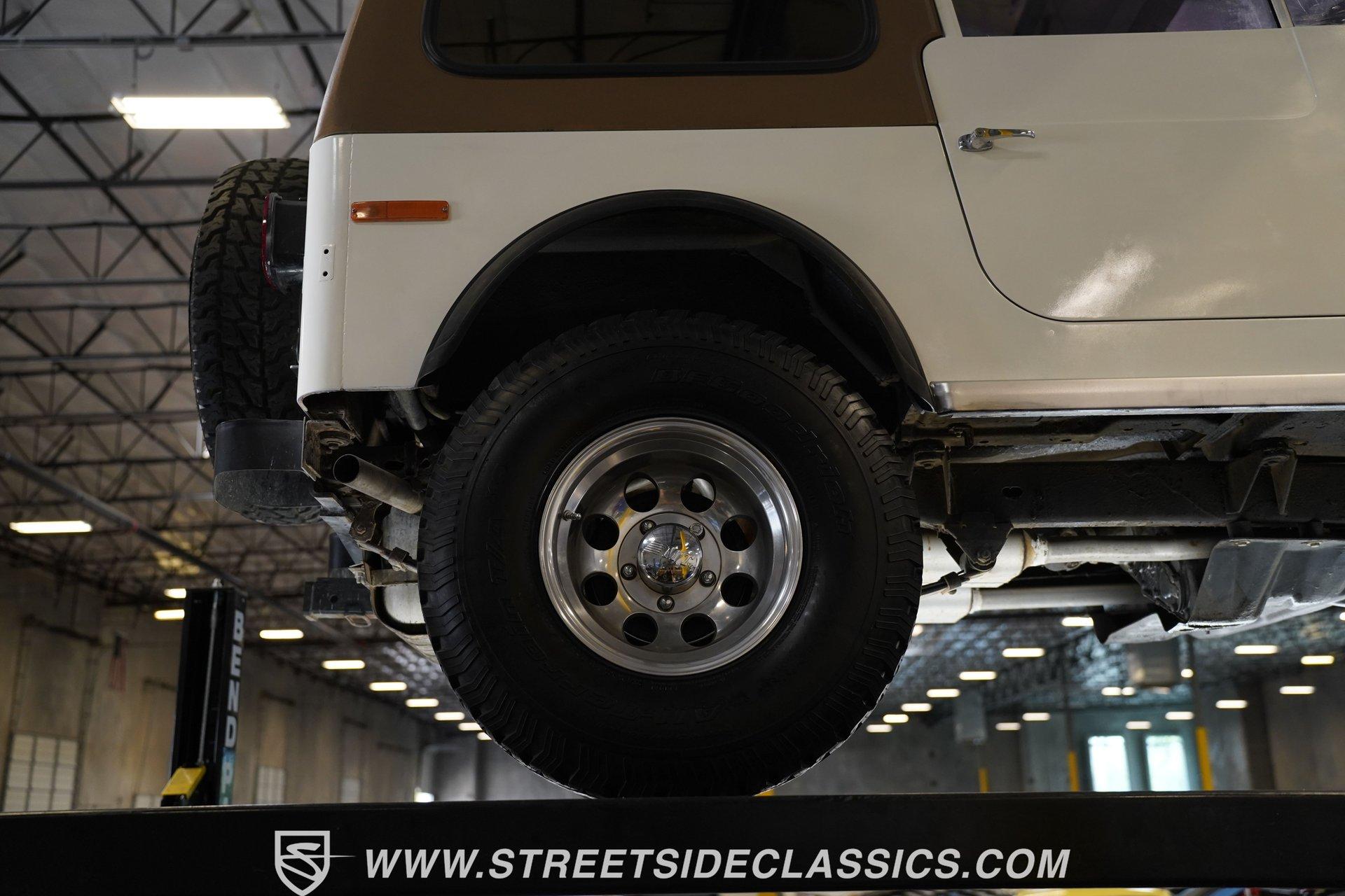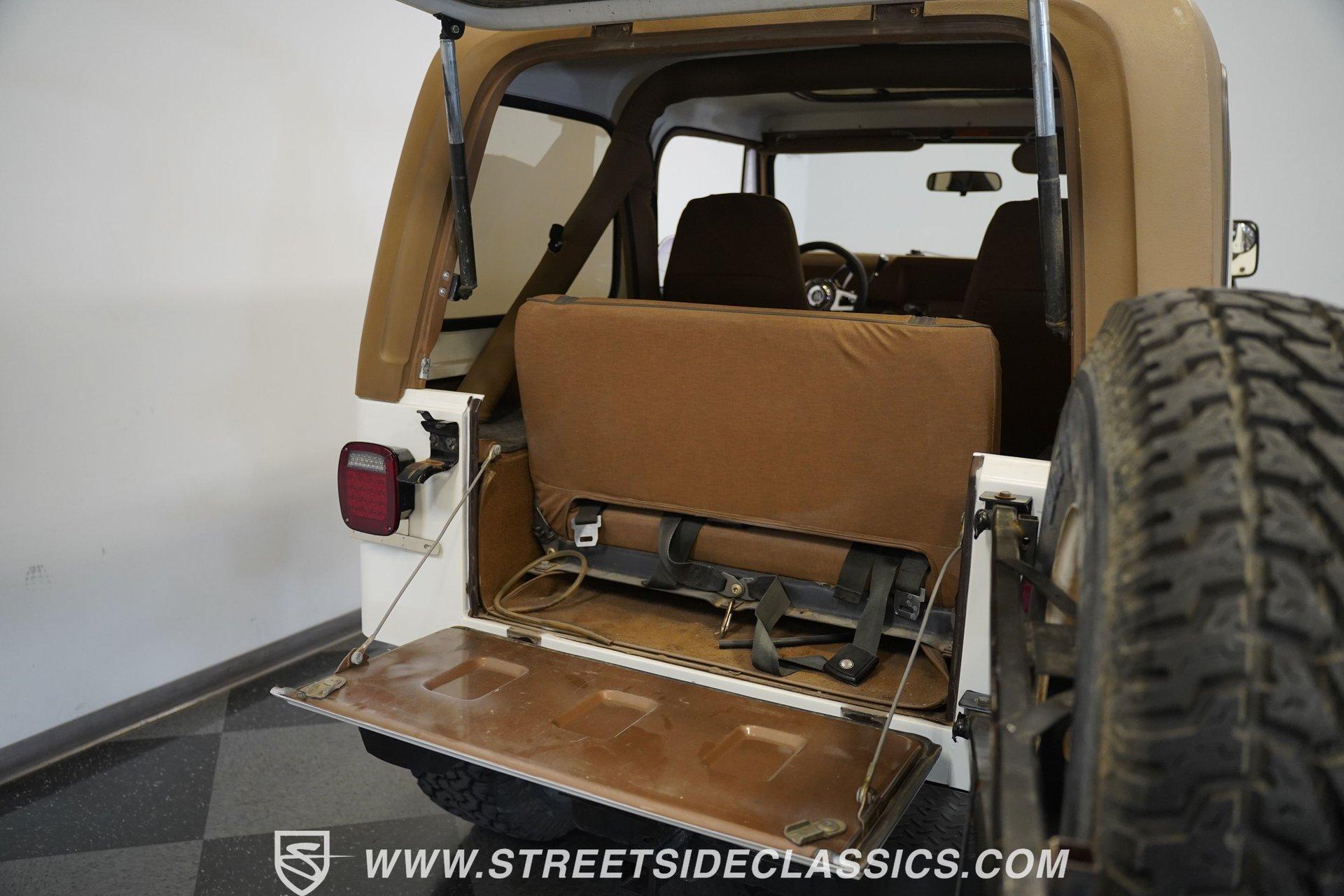 Rolling on massive 33x12.50LT15 all-terrain tires, this 1980 Jeep CJ7 Golden Eagle features white exterior paint accented by distinctive gold eagle graphics. The exterior includes 15" chrome Mickey Thompson-style wheels and metal bumpers at both ends, plus LED tail lights for visibility after dark. Halogen headlights illuminate the path ahead while a brown removable hardtop allows for quick conversion. The chrome grille adds a finishing touch to the front end while providing the unmistakable Jeep face that off-road fans appreciate. Tan vinyl covers the bucket seats inside this rugged machine, complemented by metal door panels with brown inserts throughout the cabin. The floor shifter allows for gear selection while the tilt wheel accommodates drivers of different sizes. Music comes via the AM/FM CD player during long drives on or off the pavement. The center console includes cup holders for added convenience during extended trips. The matching carpet adds a clean look to the floor area, working with the other tan interior components for a cohesive appearance. A 304 CI V8 engine sends output through a 3-speed automatic transmission and four-wheel drive system for moving across varied terrain types. The Dana 30 front axle works in conjunction with the AMC Model 20 rear axle for directing power where needed. Solid axles with leaf springs support each corner of this off-roader. Power steering reduces driver effort while front disc brakes handle stopping duties. The dual exhaust setup with Flowmaster mufflers and shorty manifolds gives this V8-powered trail machine its exhaust note, announcing its arrival on the trail. HIGHLIGHTS: 304 CI V8 Engine 3 Speed Automatic Transmission Four Wheel Drive Front Disc Brakes Dana 30 Front Axle AMC Model 20 Rear Axle Dual Exhaust With Flowmaster Mufflers Shorty Manifolds White Paint With Gold Eagle Graphics Brown Removable Hard Top 15" Chrome Mickey Thompson-Style Wheels 33x12.50LT15 All-Terrain Tires Front And Rear Metal Bumpers LED Tail Lights Halogen Headlights Chrome Grille Tan Interior With Bucket Seats Metal Door Panels With Brown Inserts Tilt Steering Wheel Power Steering Floor Shifter Center Console With Cup Holders AM/FM CD Player Matching Carpet Seatbelts A V8-powered off-road machine from the 1980s, this Jeep CJ7 Golden Eagle offers both style and capability in a classic package. From mud to rocks to sand and snow, this four-wheel drive vehicle takes you beyond where the pavement ends while looking good along the way. Call today!