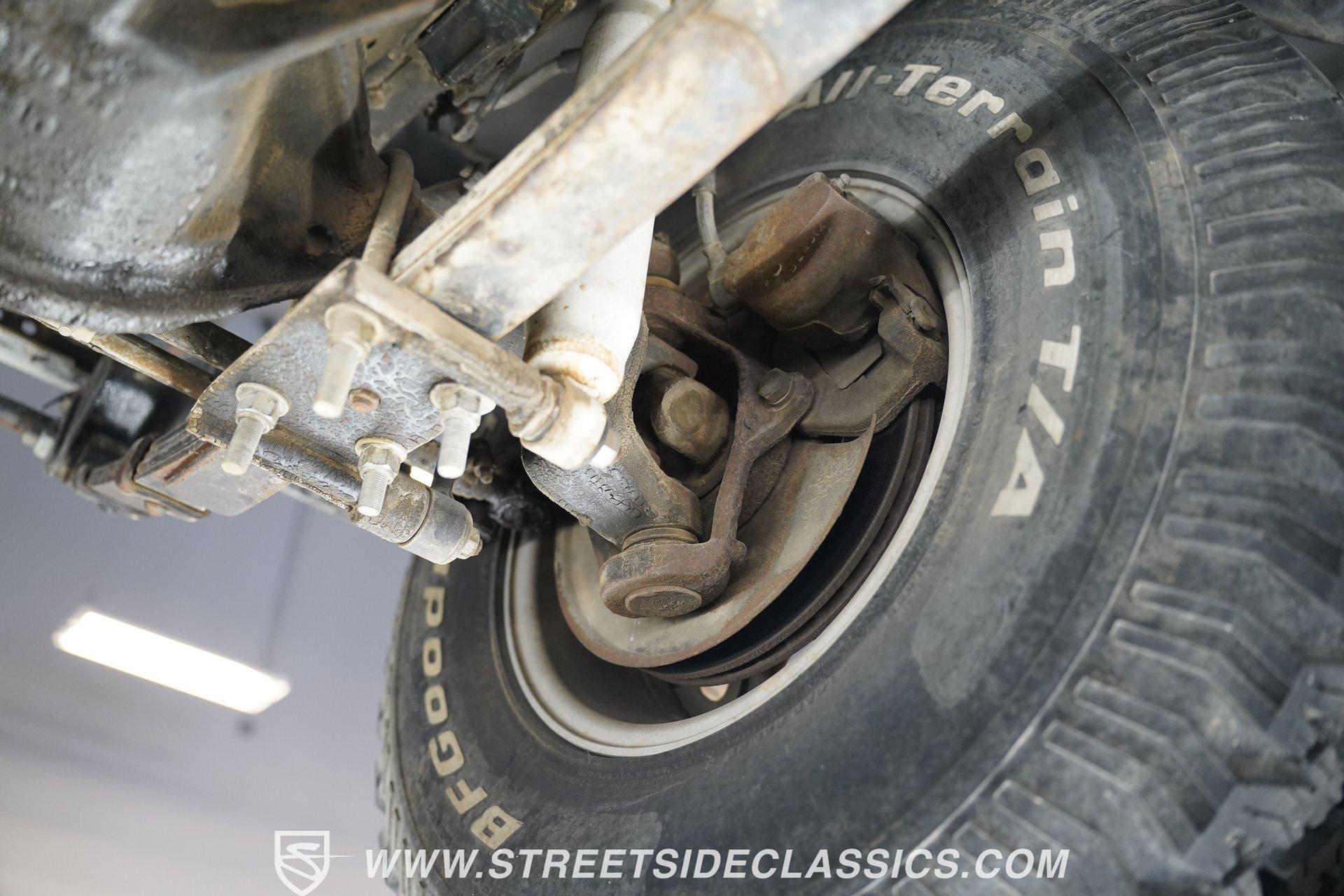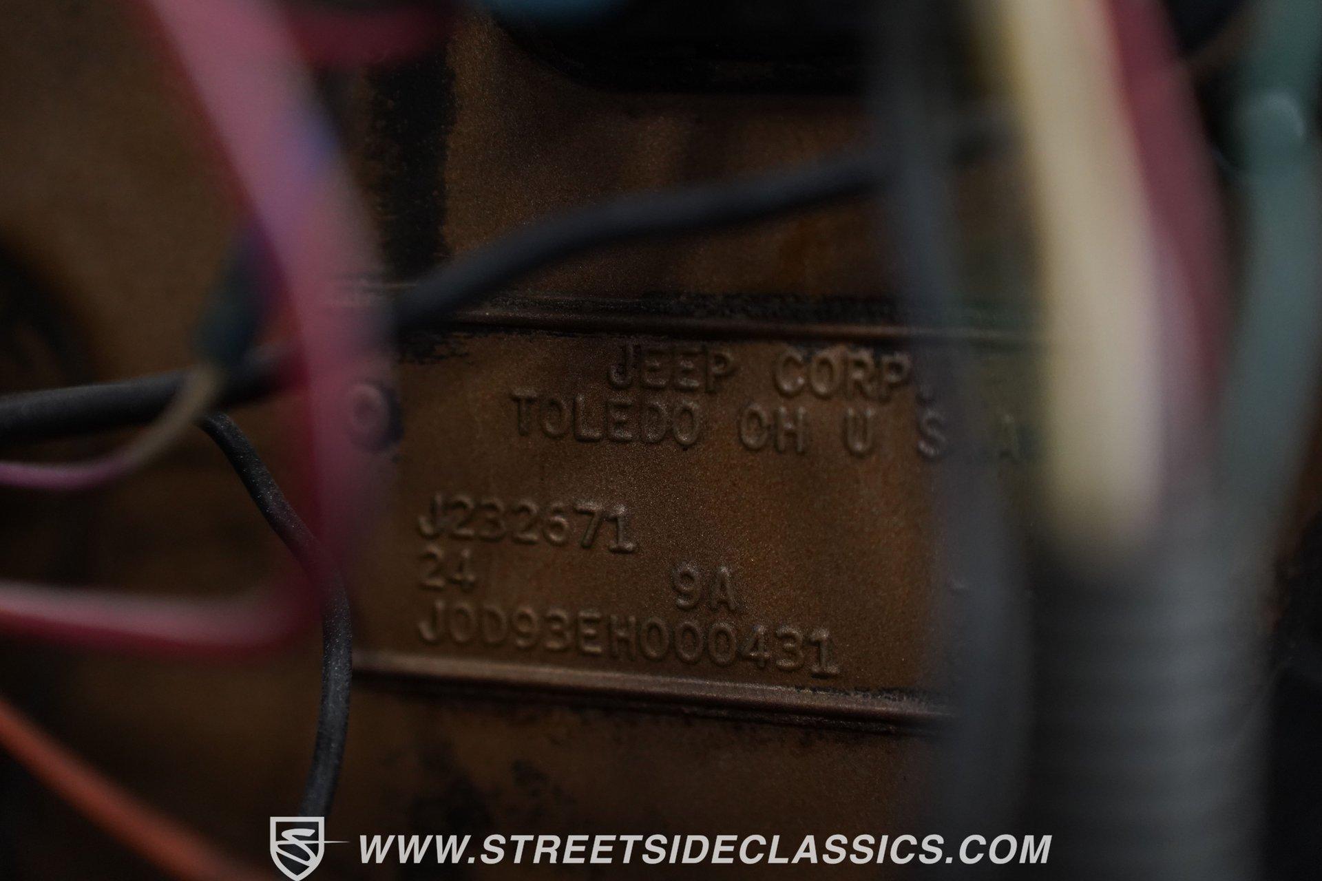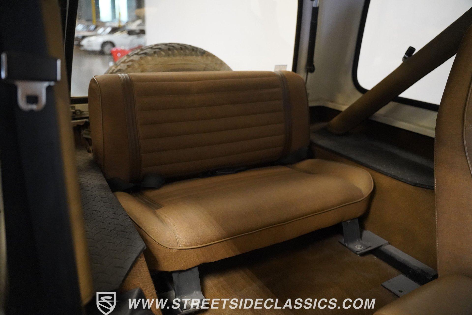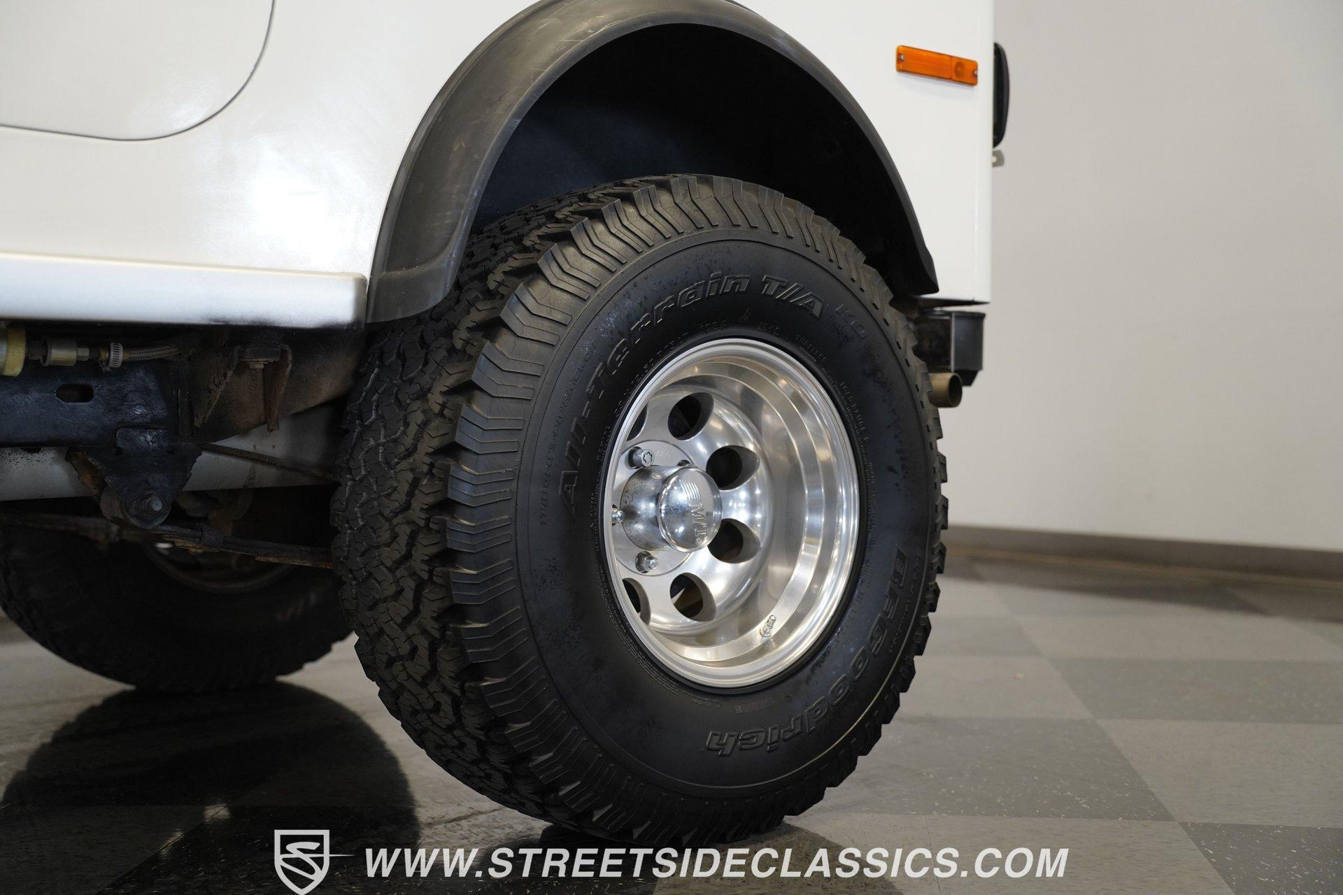 Rolling on massive 33x12.50LT15 all-terrain tires, this 1980 Jeep CJ7 Golden Eagle features white exterior paint accented by distinctive gold eagle graphics. The exterior includes 15" chrome Mickey Thompson-style wheels and metal bumpers at both ends, plus LED tail lights for visibility after dark. Halogen headlights illuminate the path ahead while a brown removable hardtop allows for quick conversion. The chrome grille adds a finishing touch to the front end while providing the unmistakable Jeep face that off-road fans appreciate. Tan vinyl covers the bucket seats inside this rugged machine, complemented by metal door panels with brown inserts throughout the cabin. The floor shifter allows for gear selection while the tilt wheel accommodates drivers of different sizes. Music comes via the AM/FM CD player during long drives on or off the pavement. The center console includes cup holders for added convenience during extended trips. The matching carpet adds a clean look to the floor area, working with the other tan interior components for a cohesive appearance. A 304 CI V8 engine sends output through a 3-speed automatic transmission and four-wheel drive system for moving across varied terrain types. The Dana 30 front axle works in conjunction with the AMC Model 20 rear axle for directing power where needed. Solid axles with leaf springs support each corner of this off-roader. Power steering reduces driver effort while front disc brakes handle stopping duties. The dual exhaust setup with Flowmaster mufflers and shorty manifolds gives this V8-powered trail machine its exhaust note, announcing its arrival on the trail. HIGHLIGHTS: 304 CI V8 Engine 3 Speed Automatic Transmission Four Wheel Drive Front Disc Brakes Dana 30 Front Axle AMC Model 20 Rear Axle Dual Exhaust With Flowmaster Mufflers Shorty Manifolds White Paint With Gold Eagle Graphics Brown Removable Hard Top 15" Chrome Mickey Thompson-Style Wheels 33x12.50LT15 All-Terrain Tires Front And Rear Metal Bumpers LED Tail Lights Halogen Headlights Chrome Grille Tan Interior With Bucket Seats Metal Door Panels With Brown Inserts Tilt Steering Wheel Power Steering Floor Shifter Center Console With Cup Holders AM/FM CD Player Matching Carpet Seatbelts A V8-powered off-road machine from the 1980s, this Jeep CJ7 Golden Eagle offers both style and capability in a classic package. From mud to rocks to sand and snow, this four-wheel drive vehicle takes you beyond where the pavement ends while looking good along the way. Call today!