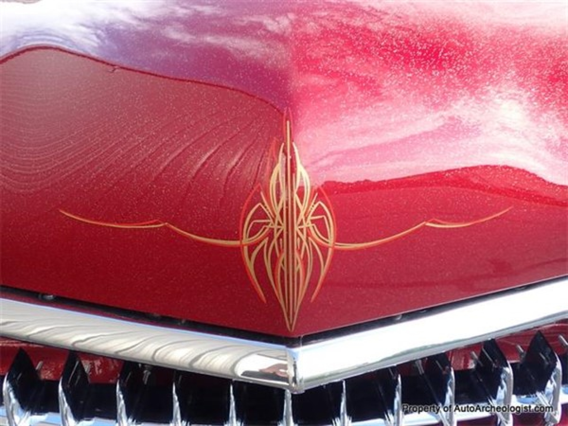 Frenched headlights and tail lights. The headlights are halogen, the tail lights from a 49 Ford. Corvette grill inset, shaved door handles, hood and trunk, and frenched rear antenna, 1957 Dodge Royal Lancer hubcaps, Jaguar rack and pinion, Chevy 350, Powerglide auto trans, leather button tuck and tuck and roll upholstery, vinyl headliner, electronic trunk release, blue dots, electric wipers, rolled wheel wells, turnpike cruiser skirts, tilt wheel (also from a Chevy), dash pinstriping, dummy spotlights and lake pipes, one piece side windows, Lokar floor shifter, fully upholstered trunk and of course, the gold flake paint that has more gold in it than a western mining town.