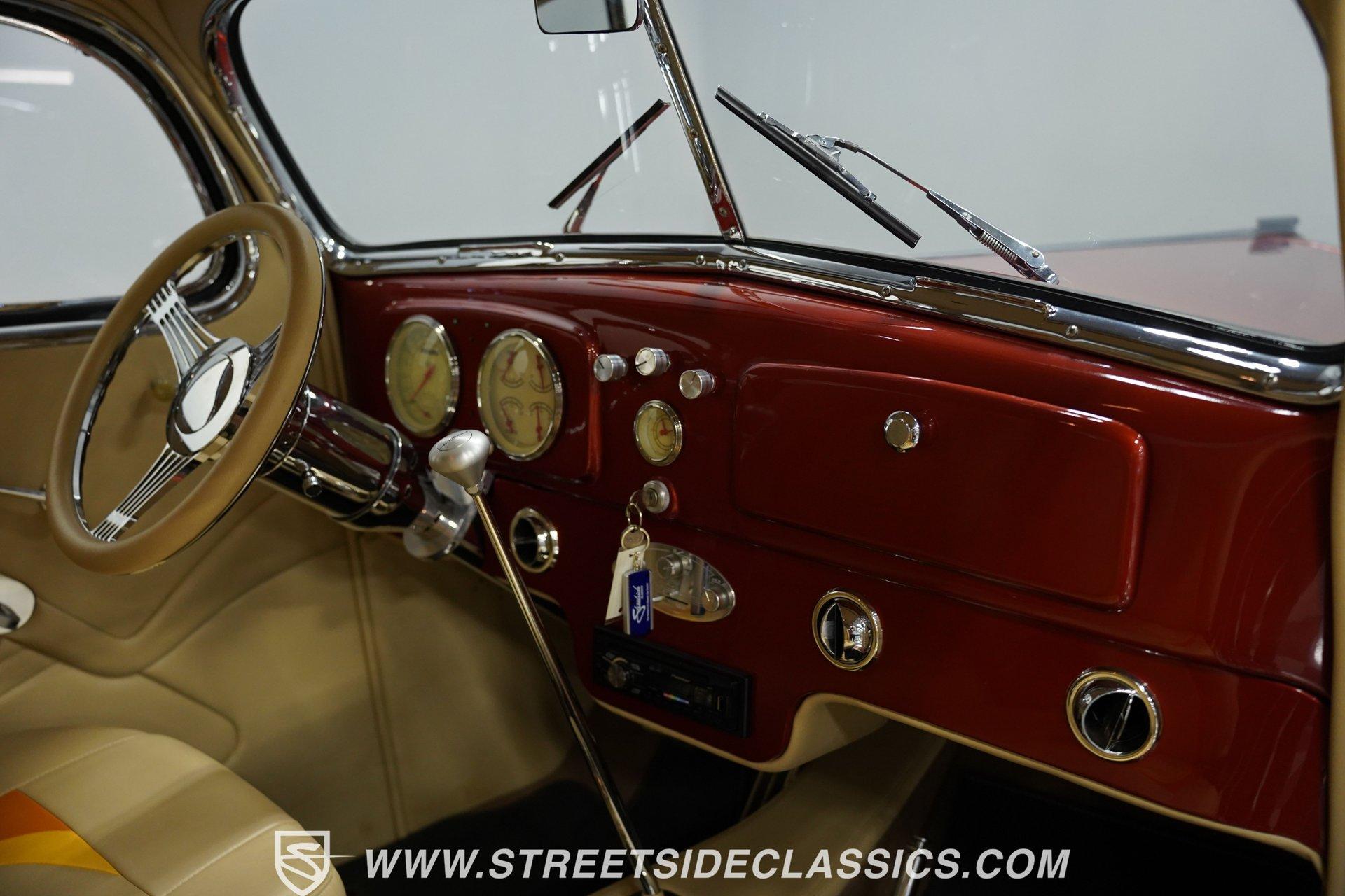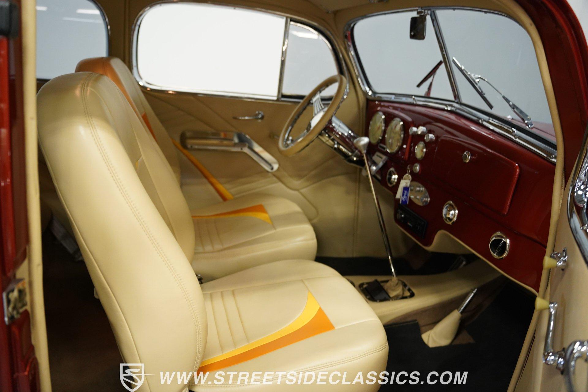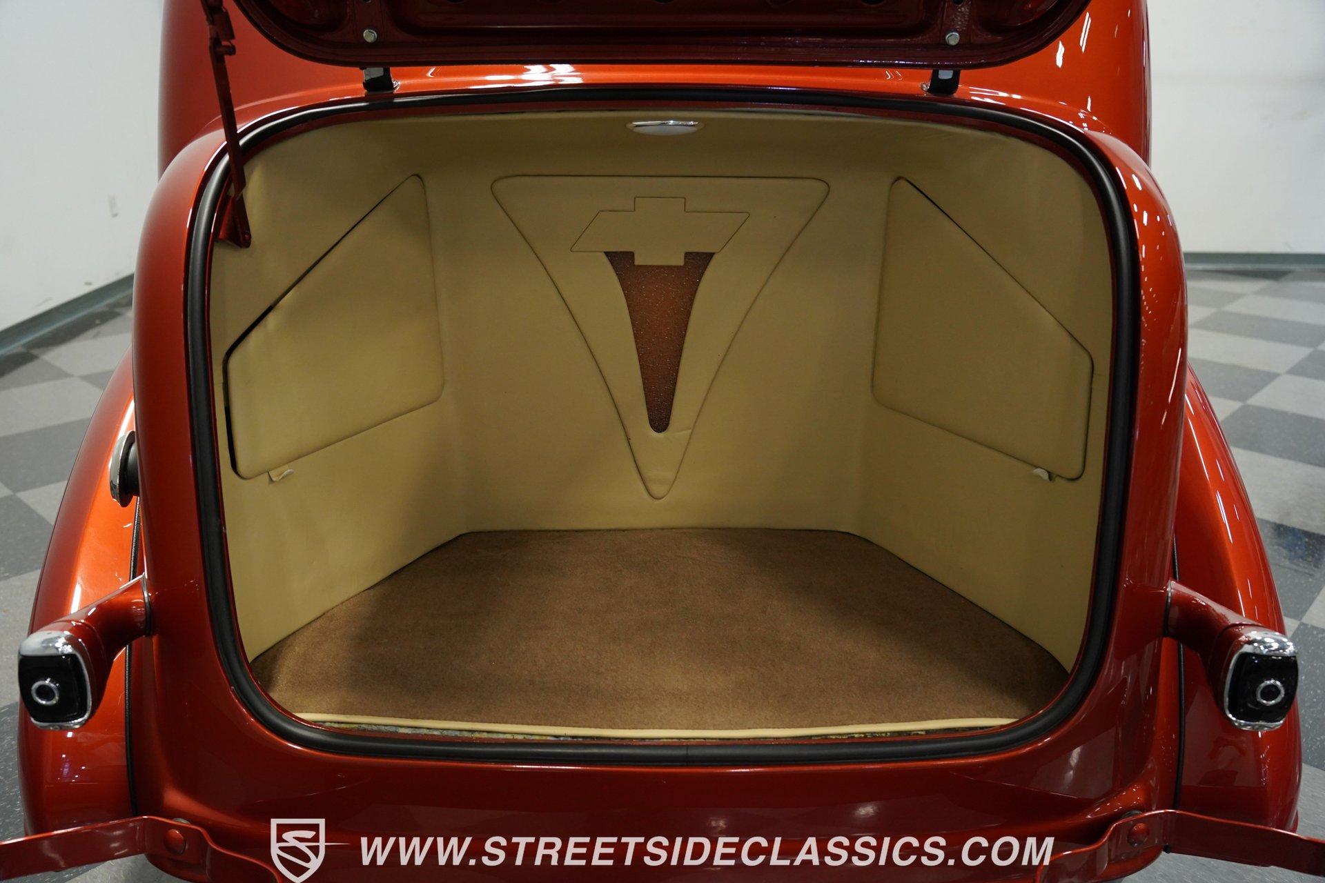 If you like older-looking classics, you'll feel right at home driving this 1936 Chevrolet Sedan Street Rod. The bright orange paint paired with the tan interior gives it a sophisticated look. Polished aluminum wheels, chrome bumpers, and a chrome front grille break up the orange nicely. There's nothing overly fancy about this Chevy-except it perfectly capitalizes on the phrase "less is more." The stance, the body lines, and the fiberglass wheel wells say it all without going overboard. It's simply a beautifully designed work of art. The interior looks great as well. Beige seats and door panels with elegant orange/yellow accents add a creative touch. Chrome details throughout the interior highlight the orange dashboard that matches the exterior paint. Aftermarket gauges look sharp, are easy to read, and tie in with the color scheme. The steering wheel blends seamlessly with the rest of the interior, while the tilt steering column and long shifter lever make driving and shifting a breeze. A Pioneer AM/FM/Aux radio with Bluetooth lets you enjoy your favorite music, and the Vintage Air Cluster gives you full control over heat, defrost, and A/C. And out back, the trunk features a clean, well-organized setup for all your cargo needs. Under the hood sits a 350 cubic-inch V8 crate motor paired with a 700R4 4-speed automatic transmission. This respected transmission runs back to a Chevy solid rear axle with 3.73 gears. Up front, a Mustang II clip with tubular A-arms and Fatman coilovers handles suspension duties, while the rear uses leaf springs, shocks, and a sway bar. The Chevy rolls on 15-inch American Racing wheels wrapped in P215/70R15 tires up front and P235/70R15 tires in the rear. Power disc brakes at all four corners ensure reliable stopping power. For that unmistakable V8 sound, the 350 breathes through shorty headers, dual exhaust, and aftermarket mufflers. Highlights: 350 Cubic-Inch Crate Motor Holley Carbaruter Edelbrock Intake 700R4 4-Speed Automatic Transmission Chevy Solid Rear Axle With 3.73 Gears Front Mustang II Clip With Tubular A-arms And Fatman Coilovers Rear Leaf Springs, Shocks, And A Sway Bar 15-inch American Racing Wheels Front And Rear Power Disc Brakes Front P215/70R15 Tires And Rear P235/70R15 Tires Shorty Headers With Dual Exhaust, And Aftermarket Mufflers Pioneer AM/FM/Aux Radio With Bluetooth Vintage Air Cluster For Heat/Defrost/A/C Vintage Steering Wheel With Tilt Long Custom Floor Shifter Vintage Aftermarket Gauges When you picture yourself cruising in a classic, imagine being behind the wheel of this 1936 Chevrolet Sedan Street Rod. You'll grab attention everywhere you go while showing the world what a true classic street rod is all about. Call Today.