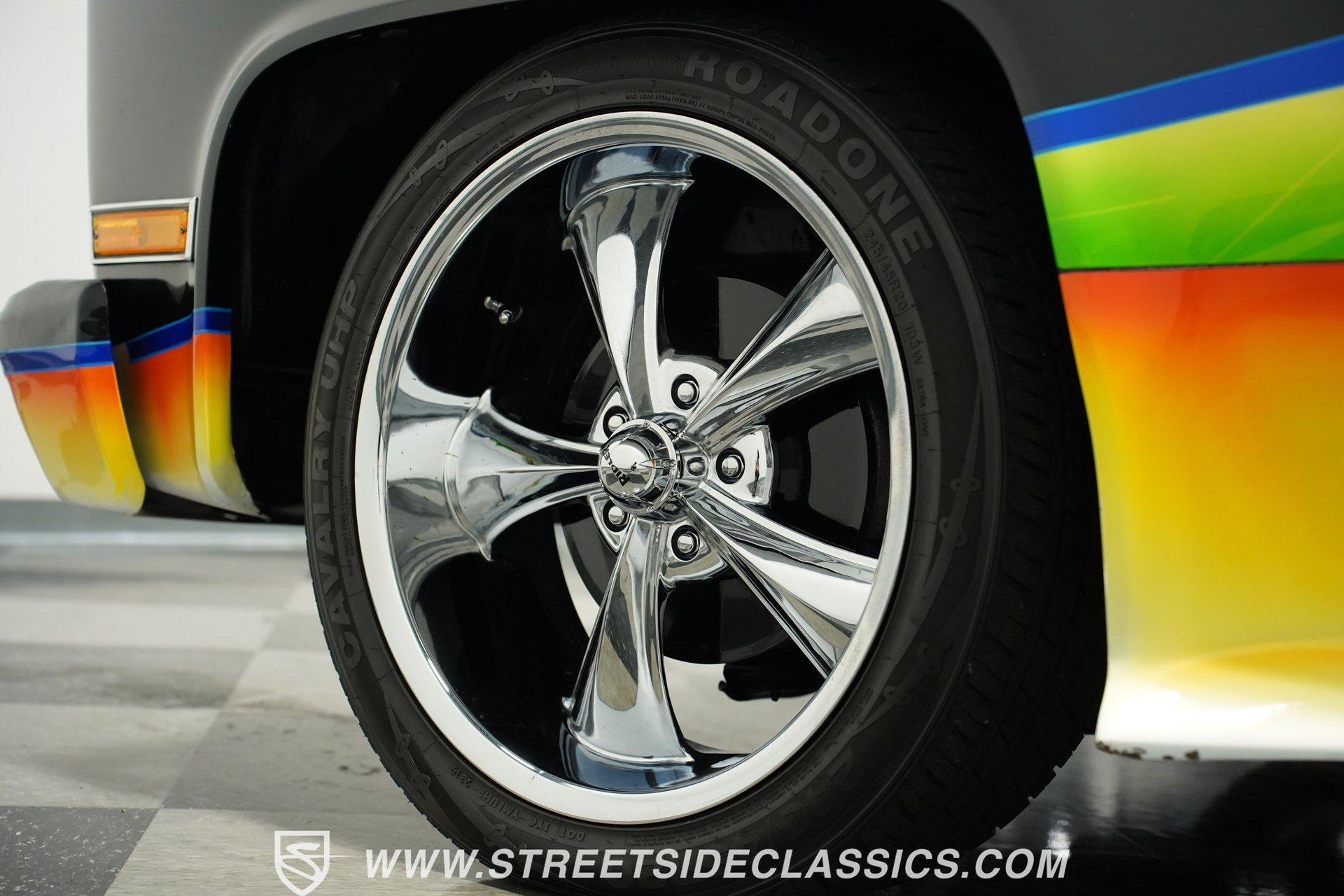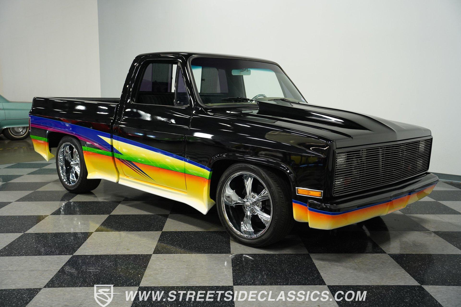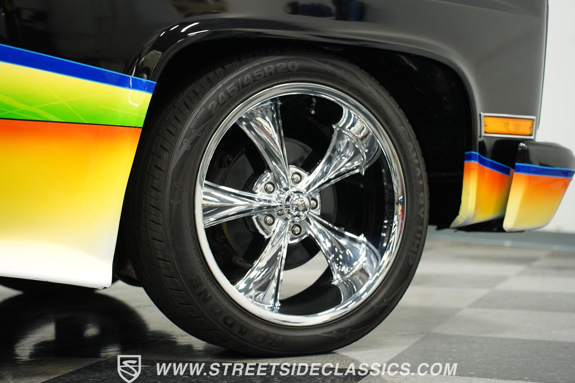 There is something about a fully customized pickup truck that sets it apart, even from other car show attendees. Perhaps it is the dichotomy of a work-oriented vehicle that is now wholly dedicated to leisure and flash. Or maybe it's the imposing stance trucks present that makes us turn our heads a little quicker. Whatever it is, one look at this 1984 Chevrolet C10 Silverado Show Truck, and it's hard to take your eyes off of it. Fully repainted in black with custom-painted graphics stretched out over its cowl hood, billet-style full grille, color-matched front bumper, and full shaved trim including badges, side mirrors, and Silverado side trim. Inside, we find a full custom black cloth interior. A cozy bench seat provides an ample view of the padded dashboard and custom metal trim. A Billet Specialties padded steering wheel sits just ahead of a six-pod gauge cluster featuring a big 85 mph speedometer, and a matching-in-size fuel gauge, while a quartet of auxiliary gauges sits off the left side of the steering column. A Pioneer AM/FM/Cassette player handles the soundtrack, while brushed aluminum is used for the column-shifter, turn signal, and pedal assembly. Out back, a full bedliner covers the entirety of the expansive cargo area. Under that aggressive hood, we find a clean engine bay that is a beautiful mix of black paint, aluminum, and chrome. A single four-barrel Rochester Quadrajet carburetor powers a 305 cubic-inch V-8 engine, while a set of shorty headers expels spent gases through a true dual exhaust, culminating in a pair of chrome exhaust tips. That power is routed through a 700R4 four-speed automatic transmission before heading out to the chrome-plated ten-bolt rear end, which transfers those ponies to the pavement via a set of massive 20-inch Ridler polished wheels shod in 275/45R-20 Calvary rubber. At the same time, a narrower set of 245/45R-20 Calvary tires is employed to handle power-assisted steering duties. *Custom Painted Graphics *Cowl Hood *Billet Style Grille *Color Matched Front Bumper *Full Shaved Trim *Remote Door Openers *305 CID V8 *Rochester Quadrajet *Shorty Headers *Dual Exhaust *Ten Bolt Rear *20 Inch Ridler Wheels *Calvary Tires *Front Power Disc Brakes *Power Steering *Custom Interior *Billet Specialties Wheel *Brushed Aluminum Trim *Pioneer Head Unit *AC *Owner's Manual This 1984 Chevrolet C10 Silverado Show Truck rides on a suspension consisting of A-arms, coils, and shocks up front, while leaf springs and air shocks are utilized in the rear. Power brakes featuring a pair of front discs are ready to scrub off speed at a moment's notice. If you've never sat behind the wheel of a true head-turning show truck, this is the pickup you've been waiting for. Don't wait, call today!