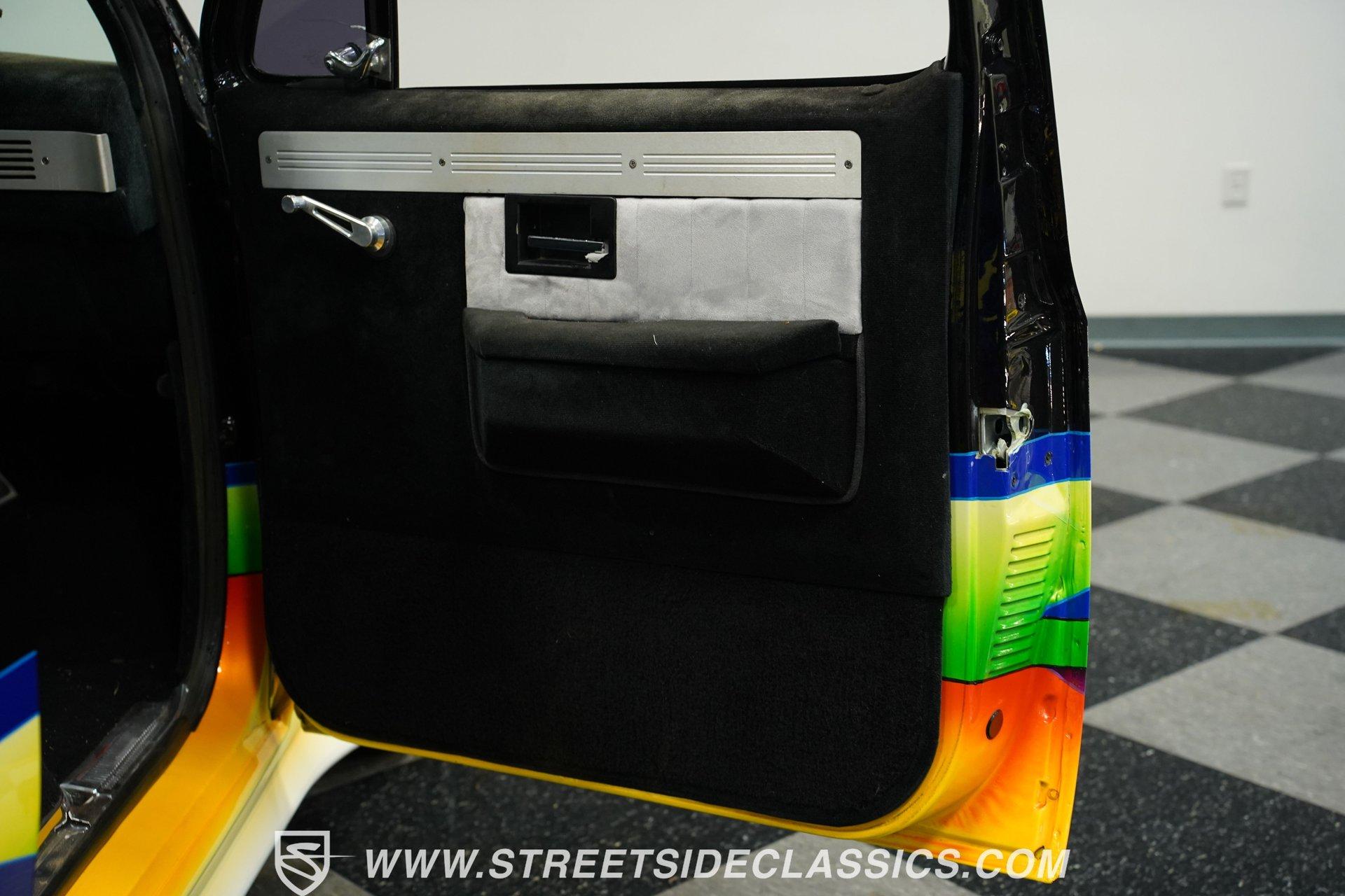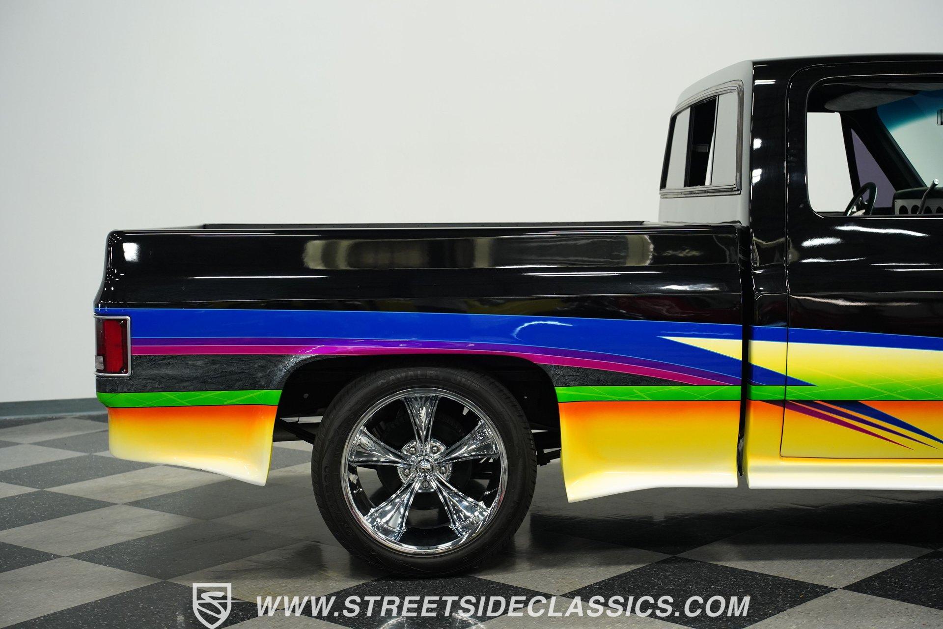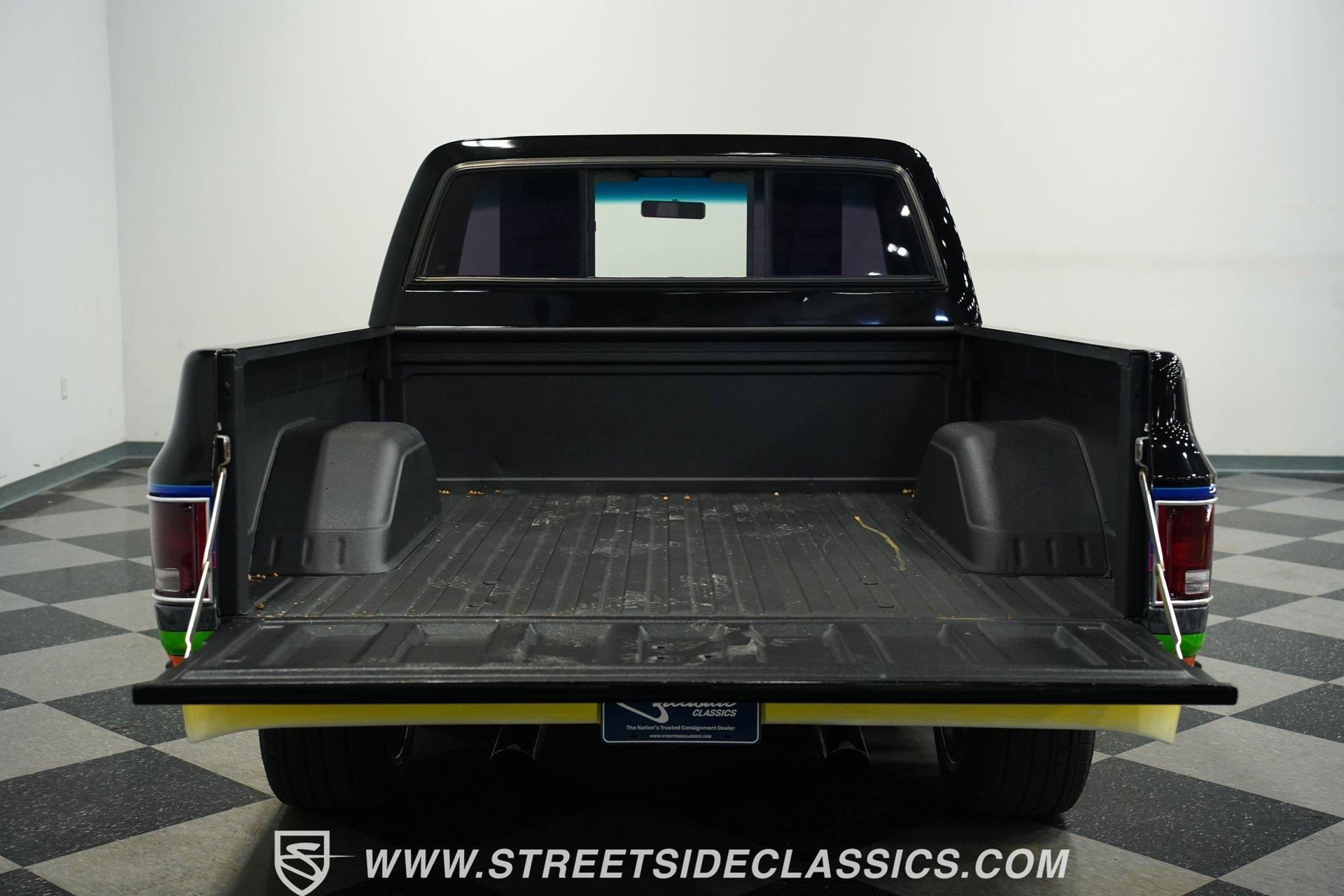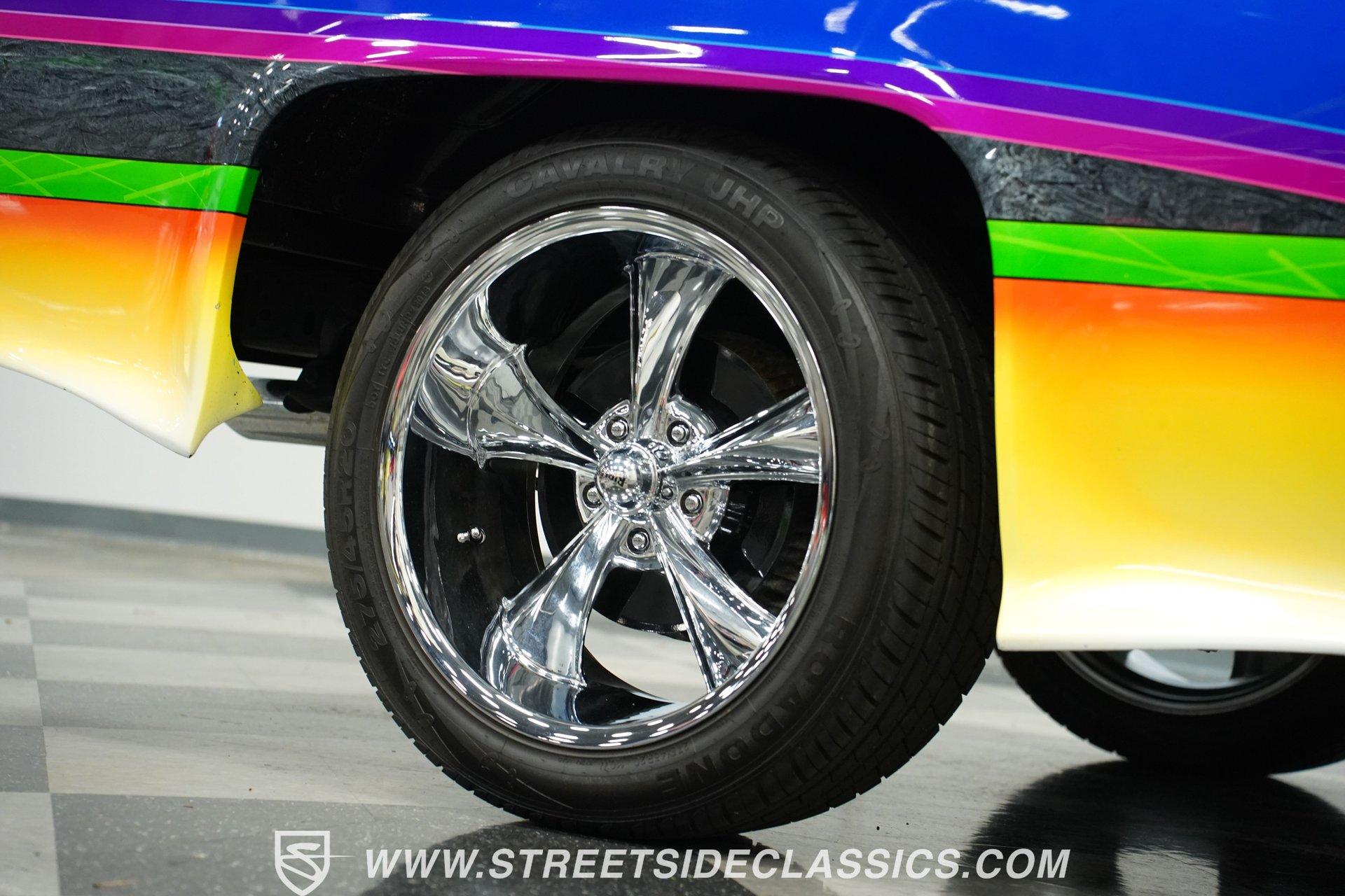 There is something about a fully customized pickup truck that sets it apart, even from other car show attendees. Perhaps it is the dichotomy of a work-oriented vehicle that is now wholly dedicated to leisure and flash. Or maybe it's the imposing stance trucks present that makes us turn our heads a little quicker. Whatever it is, one look at this 1984 Chevrolet C10 Silverado Show Truck, and it's hard to take your eyes off of it. Fully repainted in black with custom-painted graphics stretched out over its cowl hood, billet-style full grille, color-matched front bumper, and full shaved trim including badges, side mirrors, and Silverado side trim. Inside, we find a full custom black cloth interior. A cozy bench seat provides an ample view of the padded dashboard and custom metal trim. A Billet Specialties padded steering wheel sits just ahead of a six-pod gauge cluster featuring a big 85 mph speedometer, and a matching-in-size fuel gauge, while a quartet of auxiliary gauges sits off the left side of the steering column. A Pioneer AM/FM/Cassette player handles the soundtrack, while brushed aluminum is used for the column-shifter, turn signal, and pedal assembly. Out back, a full bedliner covers the entirety of the expansive cargo area. Under that aggressive hood, we find a clean engine bay that is a beautiful mix of black paint, aluminum, and chrome. A single four-barrel Rochester Quadrajet carburetor powers a 305 cubic-inch V-8 engine, while a set of shorty headers expels spent gases through a true dual exhaust, culminating in a pair of chrome exhaust tips. That power is routed through a 700R4 four-speed automatic transmission before heading out to the chrome-plated ten-bolt rear end, which transfers those ponies to the pavement via a set of massive 20-inch Ridler polished wheels shod in 275/45R-20 Calvary rubber. At the same time, a narrower set of 245/45R-20 Calvary tires is employed to handle power-assisted steering duties. *Custom Painted Graphics *Cowl Hood *Billet Style Grille *Color Matched Front Bumper *Full Shaved Trim *Remote Door Openers *305 CID V8 *Rochester Quadrajet *Shorty Headers *Dual Exhaust *Ten Bolt Rear *20 Inch Ridler Wheels *Calvary Tires *Front Power Disc Brakes *Power Steering *Custom Interior *Billet Specialties Wheel *Brushed Aluminum Trim *Pioneer Head Unit *AC *Owner's Manual This 1984 Chevrolet C10 Silverado Show Truck rides on a suspension consisting of A-arms, coils, and shocks up front, while leaf springs and air shocks are utilized in the rear. Power brakes featuring a pair of front discs are ready to scrub off speed at a moment's notice. If you've never sat behind the wheel of a true head-turning show truck, this is the pickup you've been waiting for. Don't wait, call today!