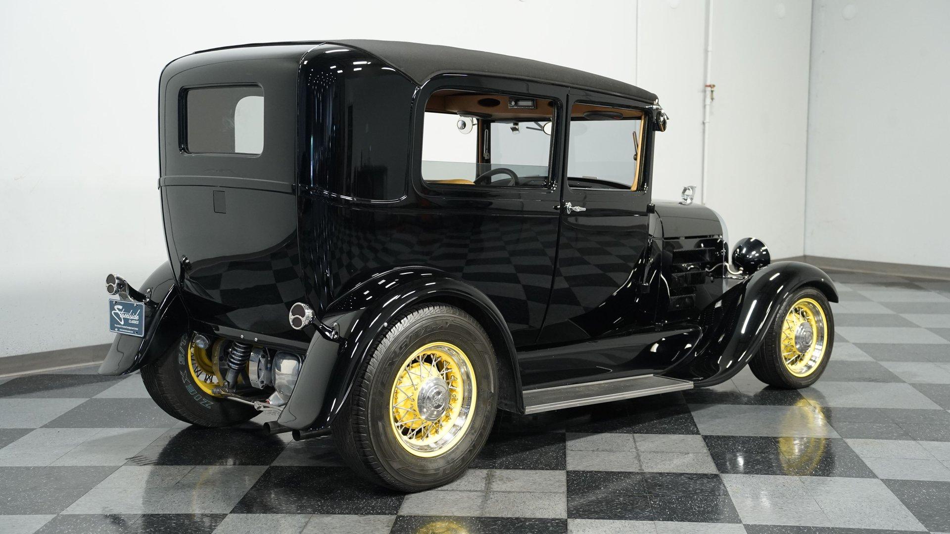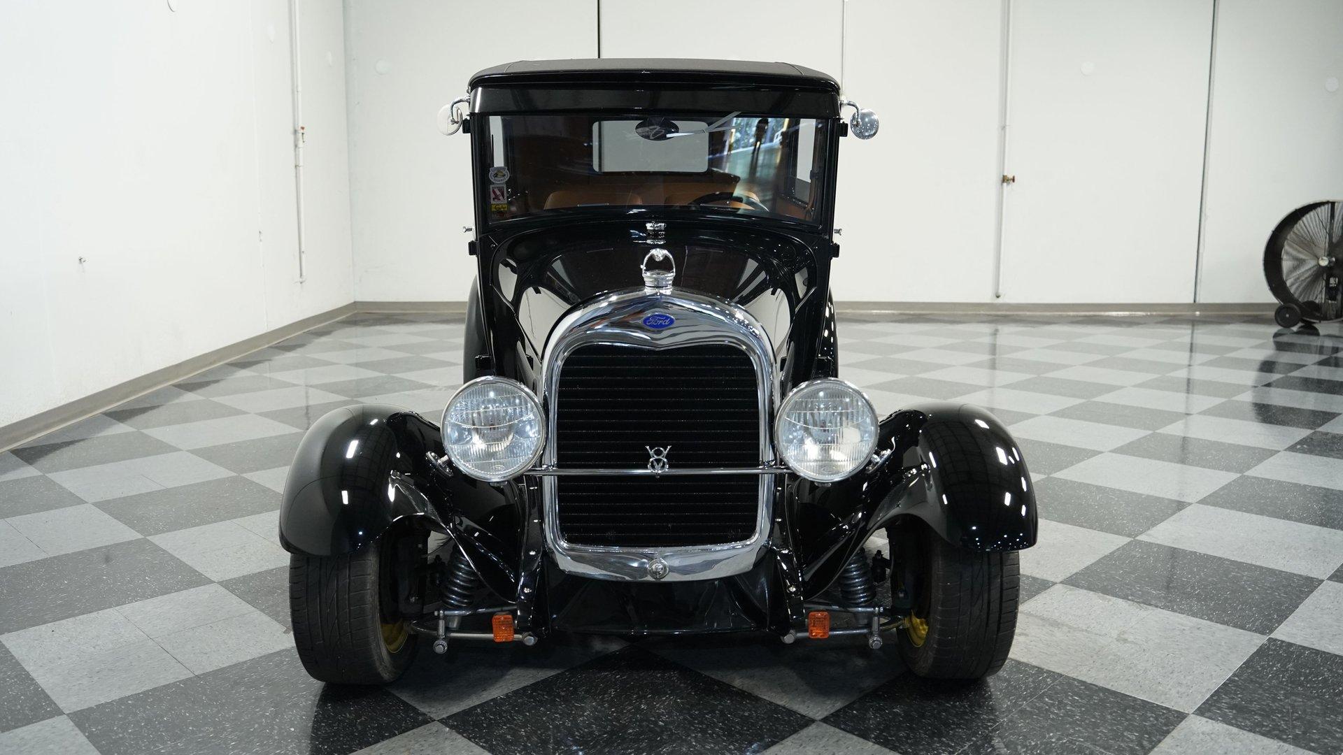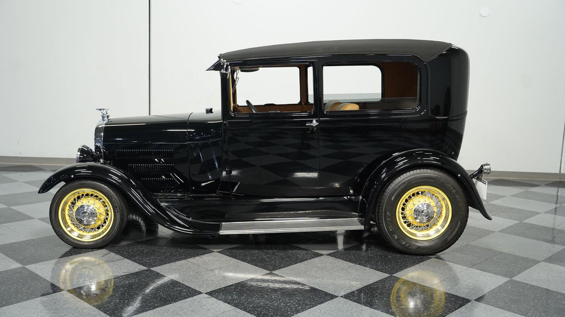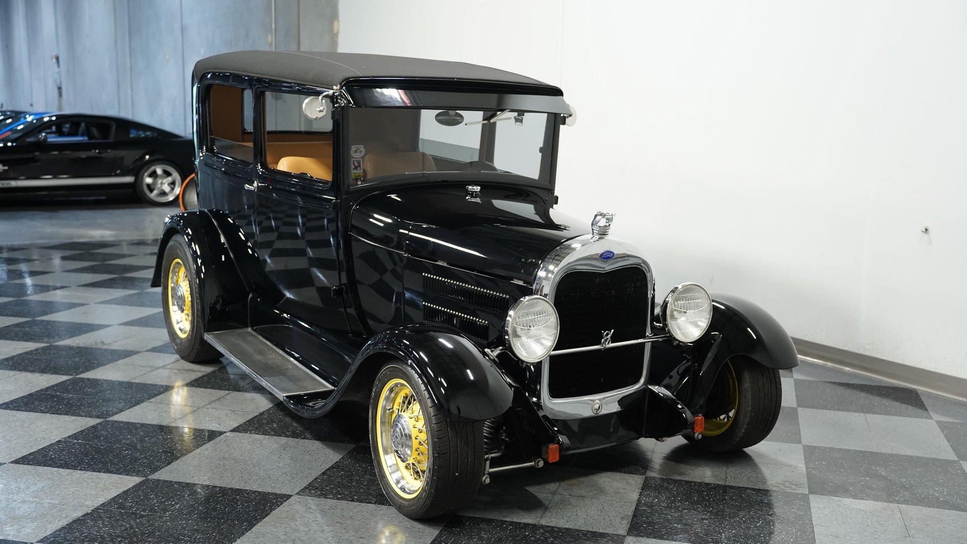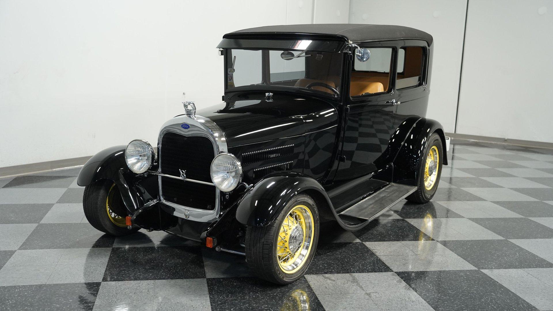 Historically speaking, not many positive things are said about the year 1929, for obvious reasons, perhaps. But, this 1929 Ford Model A Tudor Sedan Street Rod is here to prove it is the exception to that rule. Its steel body has been fully repainted in a subtle, glossy black, while its silver and gold wire wheels, polished rear end, and dual chrome exhaust pipes poking out from beneath the backside of the cabin hint that there is a bit more to this car beneath its understated veneer. Inside, we find a custom walnut leather interior, featuring a pair of plush bucket seats in the front and a two-person bench in the back. A padded, banjo-style steering wheel comes with a V-8 emblem center cap, which sits in front of a three-pod Classic Instruments gauge cluster. A 7,000 rpm tachometer is flanked by a 120 mph speedometer and a quartet of auxiliary gauges, all housed within a larger display that matches the other two in size for uniformity. A tilt steering column, power windows, defrost, air conditioning, and an AM/FM/CD player add plenty of modern conveniences to allow this old-school hot rod to drive comfortably anywhere it goes. Prop up that throwback hood and you're treated to a clean engine bay that looks rather tight thanks to the BluePrint 350 cubic-inch crate V-8 engine stuffed between the fenders. Powered by an MSD Atomic electronic fuel injection system, this new small block sends spent gases out through a full stainless steel dual exhaust system capped off by a pair of MagnaFlow mufflers. Power is routed through a late-model 4L60E four-speed automatic transmission before the chrome-plated rear end sends those ponies to the pavement via a pair of 16-inch wire wheels shod in big 245/70R-16 Falken rubber. At the same time, a narrower set of 195/50R-15 tires handles steering duties, giving this car its classic staggered look. *Steel Body *Full Black Repaint *BluePrint Crate 350 V8 *MSD Atomic EFI *Full Stainless Steel Exhuast *MagnaFlow Mufflers *Full TCI Chassis *Tubular A Arms *Jaguar IRS Rear *Coilovers *Power Brakes *Four Wheel Discs *Custom Interior *Walnut Leather *Tilt Wheel *Air Conditioning *Classic Instruments Gauges *Power Windows *Heat *Defrost *CD Player This 1929 Ford Model A Tudor Sedan Street Rod sits on a full TCI suspension that utilizes a tubular A-arm setup in front, a Jaguar independent rear out back, and coilovers at all four corners, giving this hot rod a ride that couldn't have even been dreamt of a century ago. Adding to that are a set of four-wheel power disc brakes, covering every aspect of what is needed for a truly comfortable and carefree drive. So, while the stock market may have plummeted in 1929, this Model A is a blue-chip hot rod, sure to be a great investment, and ready to pay you back with dividends of fun. But don't wait, call today!