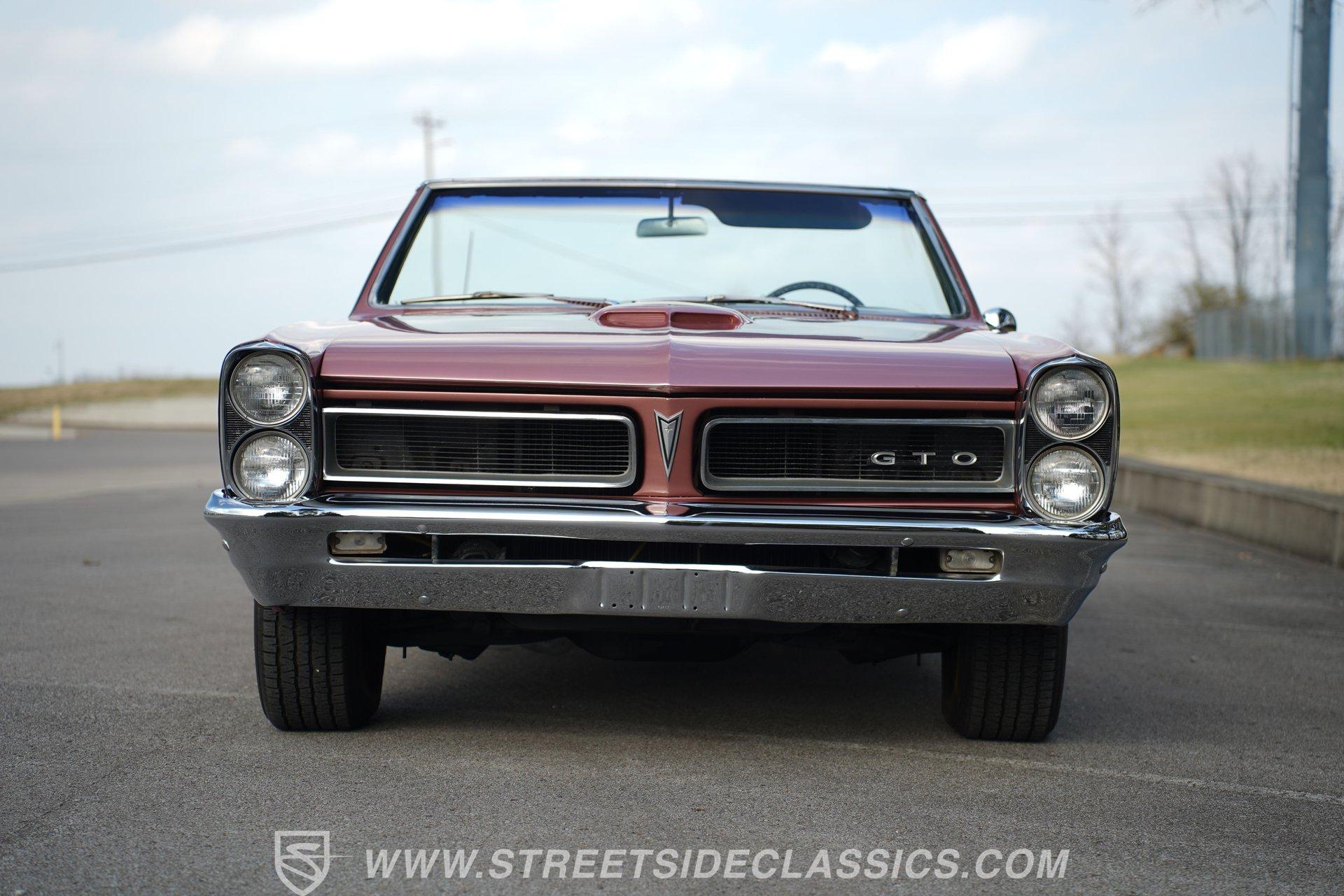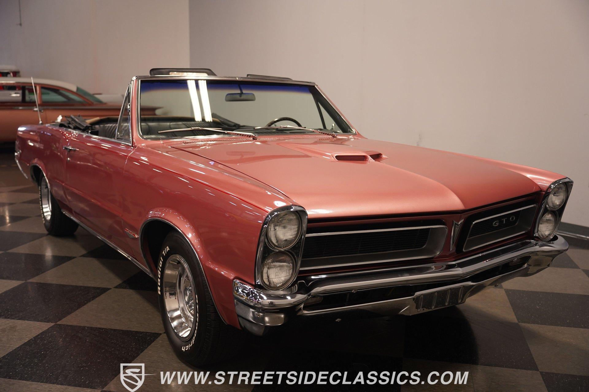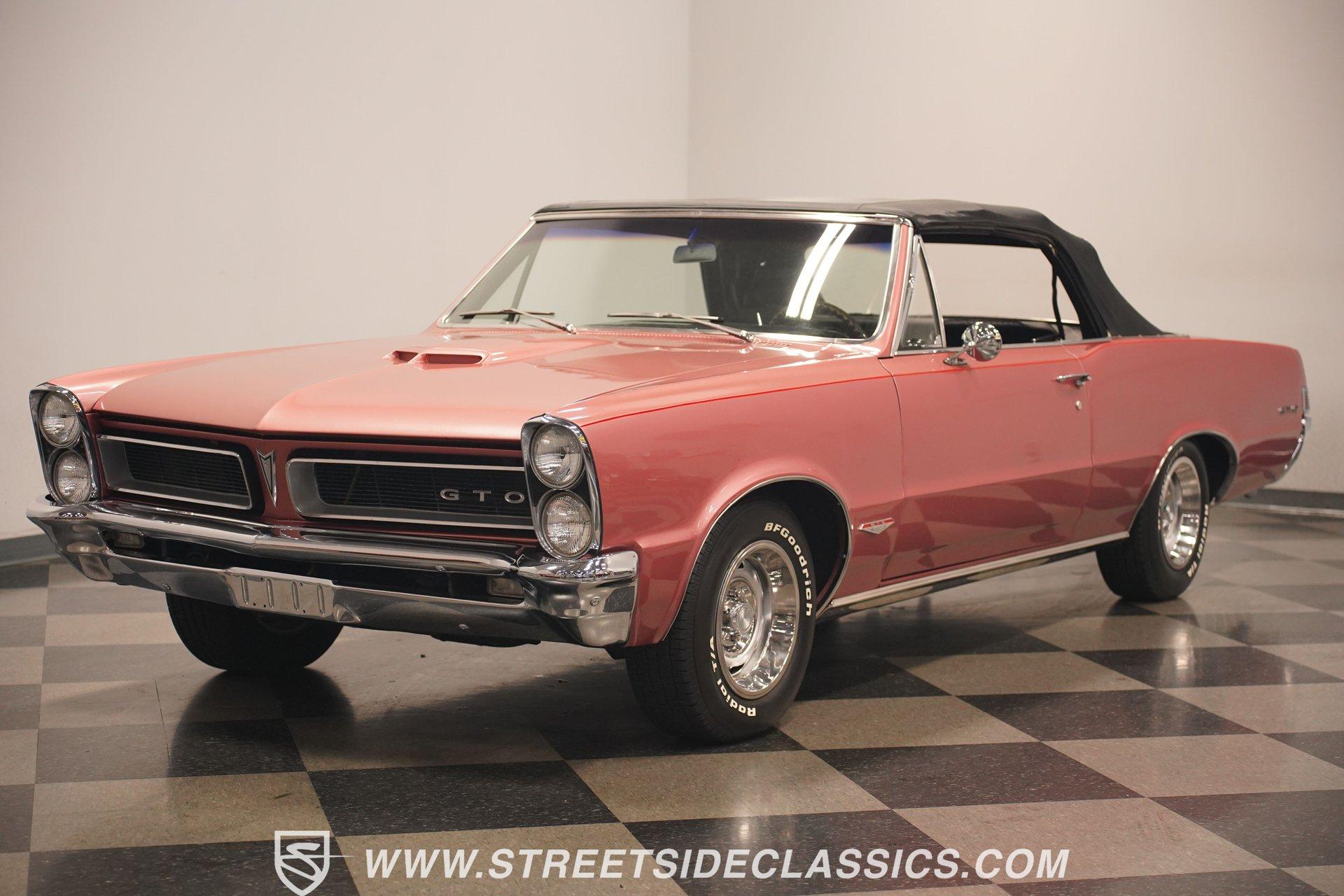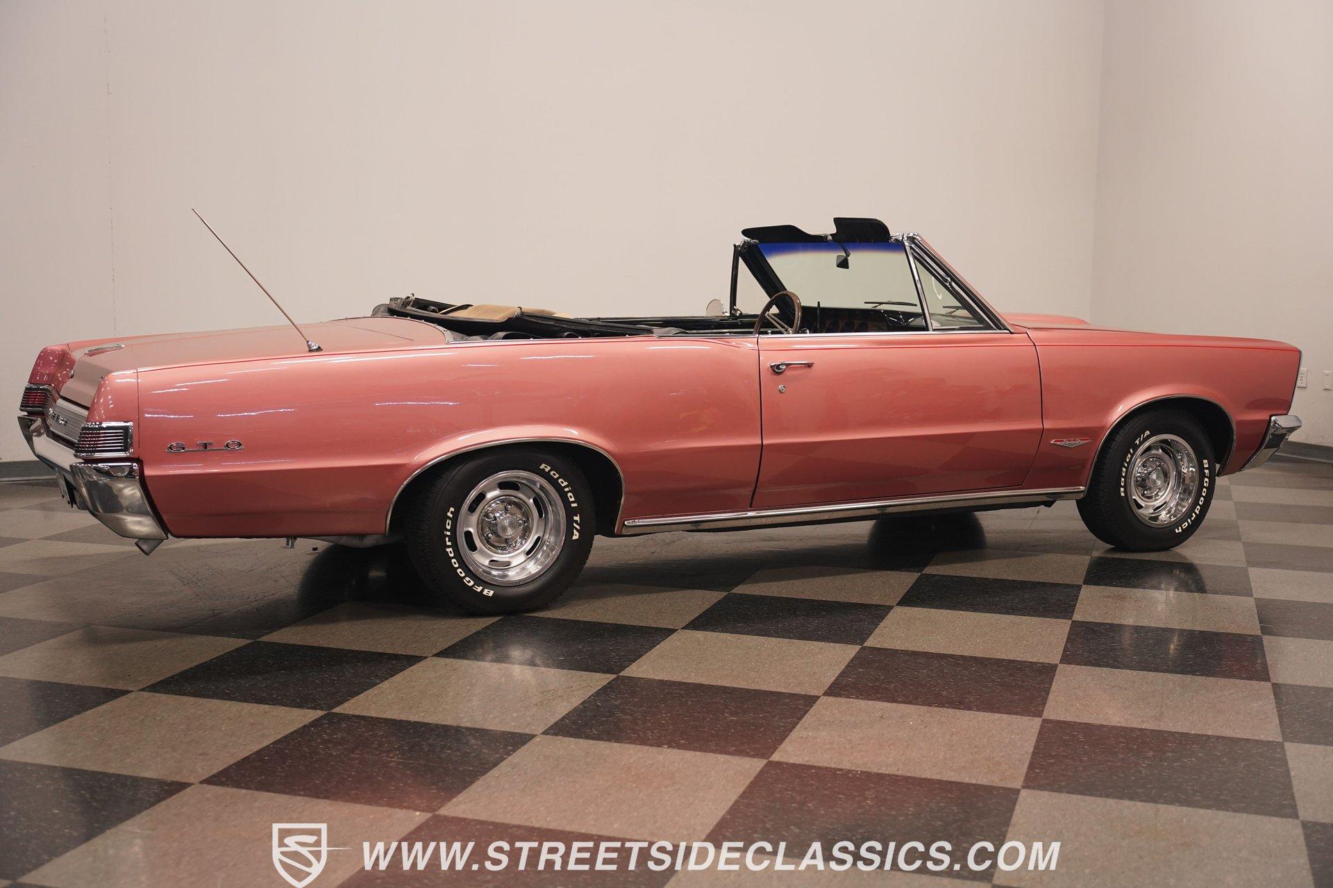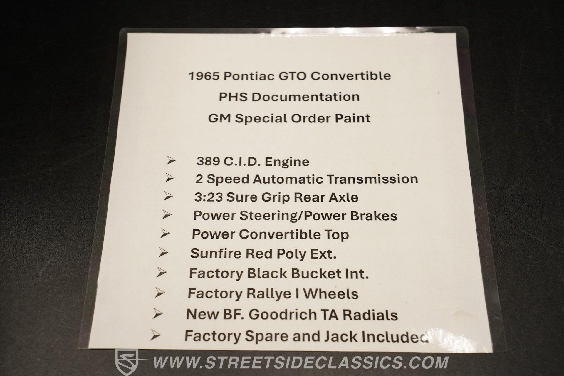 This 1965 Pontiac GTO Convertible makes its presence known with a bold Sunfire Red exterior. The muscular body lines stretch from the distinctive split grille to the powerful rear fenders. A black vinyl top provides a sharp contrast against the vibrant paint. The GTO rolls on 14-inch wheels fitted with P215/70R14 BFGoodrich tires, embodying classic muscle car style. The interior features black vinyl bucket seats, inviting drivers into a performance-oriented cockpit. A billet steering wheel offers enhanced grip and control. The upgraded AM/FM radio delivers tunes for your drive. The column-mounted shifter and well-laid-out instrument panel maintain the GTO's original look while providing modern functionality. A 389 cubic inch V8 engine powers this GTO, mated to a 2-speed Super Turbine 300 automatic transmission. An Edelbrock AVS2 1806 600 CFM 4-barrel carburetor boosts the V8's performance. The dual exhaust system with aftermarket mufflers produces a deep, aggressive tone. Power steering and power drum brakes provide confident control, while the 3.23 rear axle ratio balances acceleration and highway cruising. HIGHLIGHTS: 389 V8 engine 2-speed Super Turbine 300 automatic transmission Edelbrock AVS2 1806 600 CFM 4-barrel carburetor Dual exhaust with aftermarket mufflers Power steering Power brakes 3.23 rear axle ratio Coil spring suspension Sunfire Red paint Black vinyl convertible top 14-inch wheels P215/70R14 BFGoodrich tires Black vinyl bucket seats Billet steering wheel Upgraded AM/FM radio Column-mounted shifter PHS documentation This 1965 Pontiac GTO Convertible combines iconic muscle car design with potent V8 power. Its Sunfire Red paint and growling 389 engine create an unforgettable driving experience. Call today!