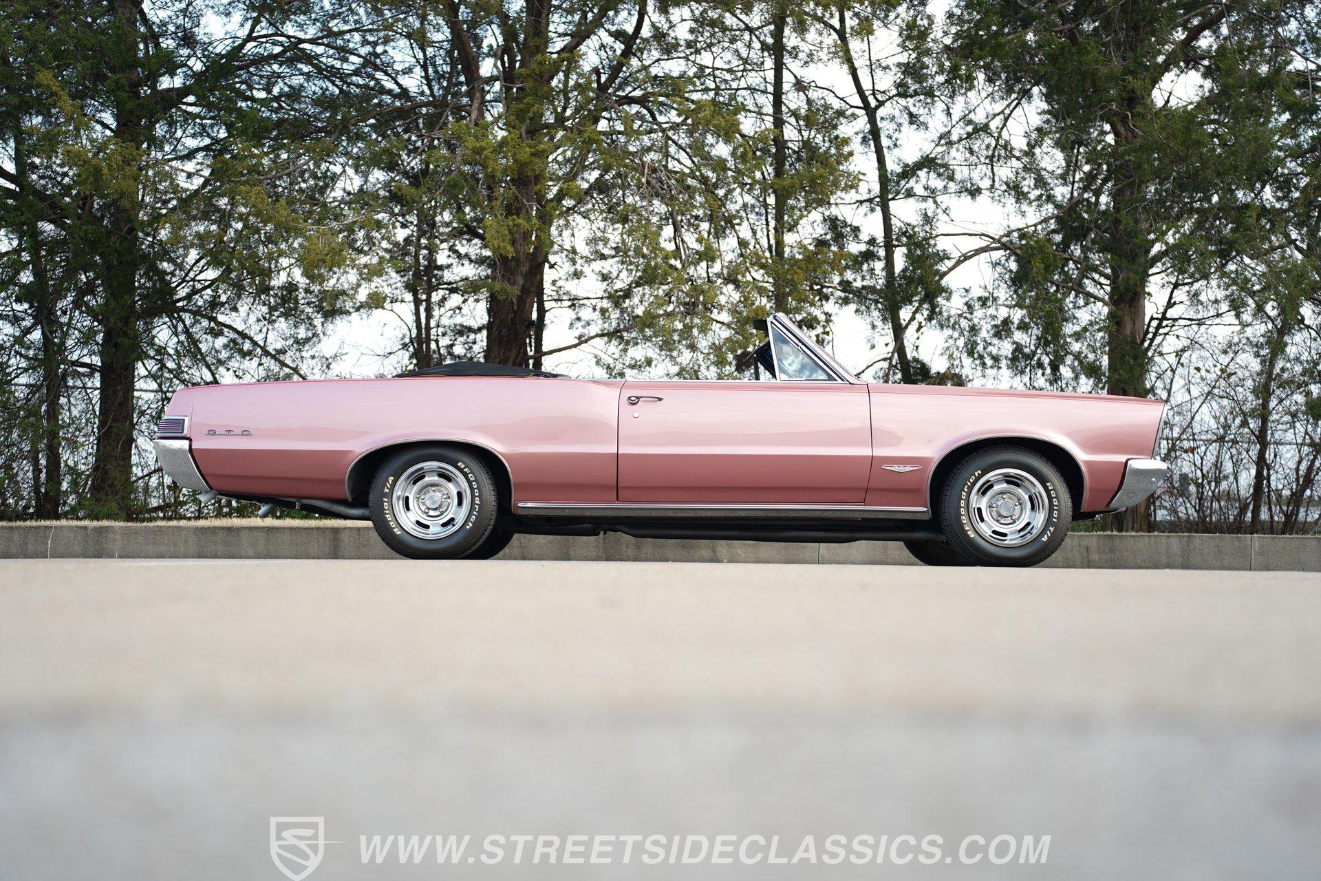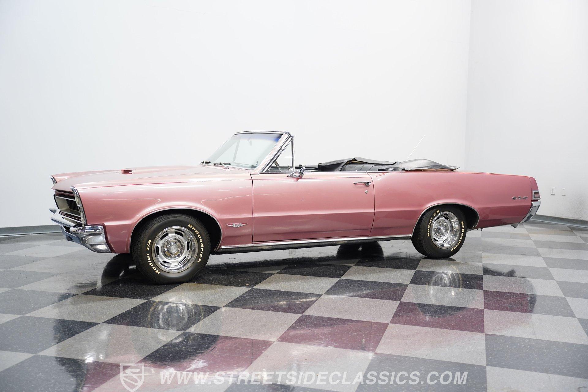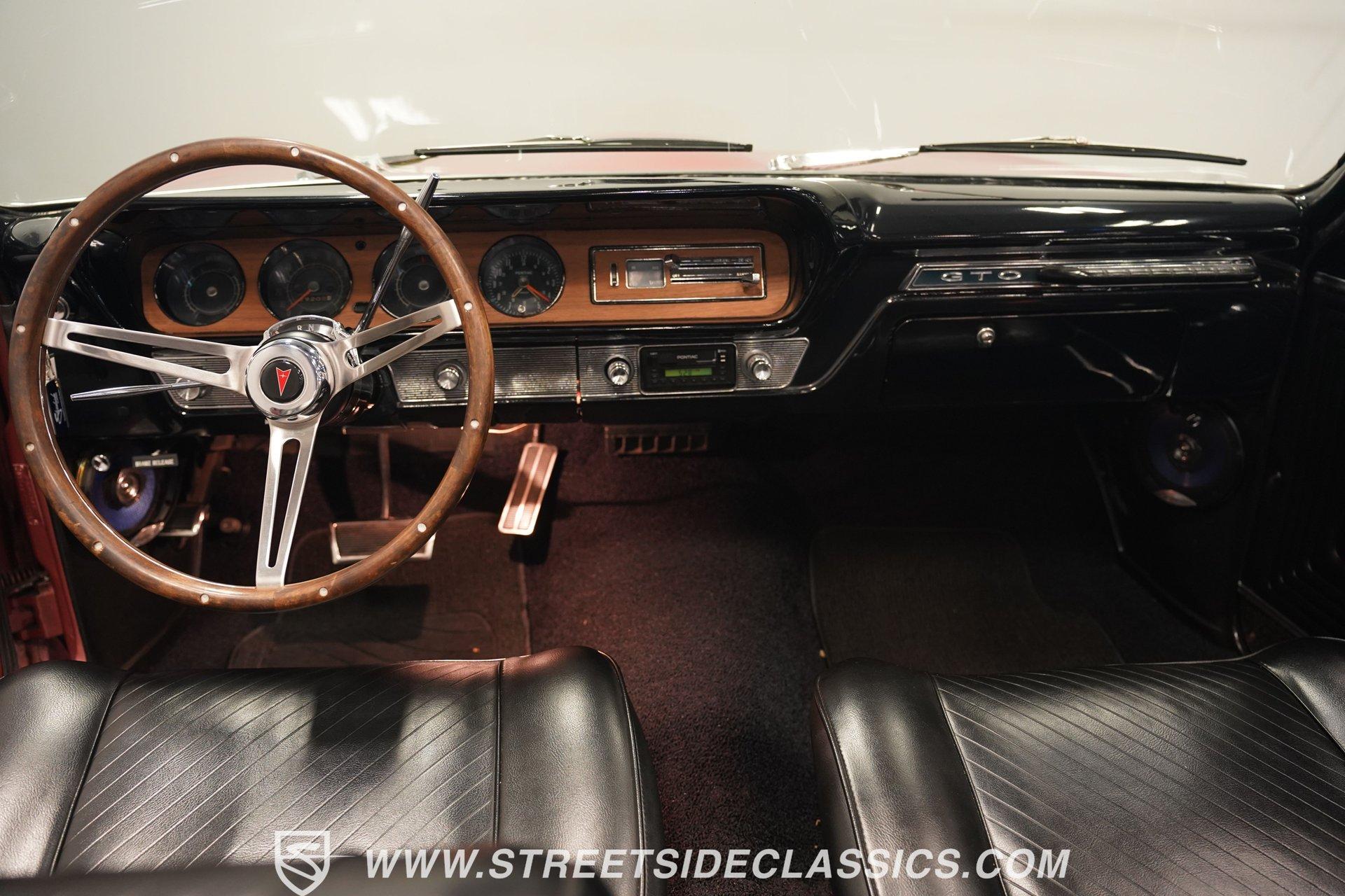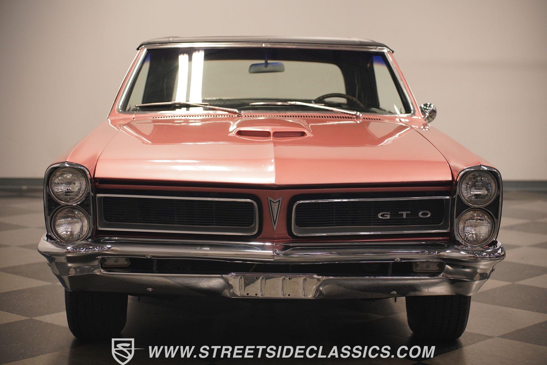 This 1965 Pontiac GTO Convertible makes its presence known with a bold Sunfire Red exterior. The muscular body lines stretch from the distinctive split grille to the powerful rear fenders. A black vinyl top provides a sharp contrast against the vibrant paint. The GTO rolls on 14-inch wheels fitted with P215/70R14 BFGoodrich tires, embodying classic muscle car style. The interior features black vinyl bucket seats, inviting drivers into a performance-oriented cockpit. A billet steering wheel offers enhanced grip and control. The upgraded AM/FM radio delivers tunes for your drive. The column-mounted shifter and well-laid-out instrument panel maintain the GTO's original look while providing modern functionality. A 389 cubic inch V8 engine powers this GTO, mated to a 2-speed Super Turbine 300 automatic transmission. An Edelbrock AVS2 1806 600 CFM 4-barrel carburetor boosts the V8's performance. The dual exhaust system with aftermarket mufflers produces a deep, aggressive tone. Power steering and power drum brakes provide confident control, while the 3.23 rear axle ratio balances acceleration and highway cruising. HIGHLIGHTS: 389 V8 engine 2-speed Super Turbine 300 automatic transmission Edelbrock AVS2 1806 600 CFM 4-barrel carburetor Dual exhaust with aftermarket mufflers Power steering Power brakes 3.23 rear axle ratio Coil spring suspension Sunfire Red paint Black vinyl convertible top 14-inch wheels P215/70R14 BFGoodrich tires Black vinyl bucket seats Billet steering wheel Upgraded AM/FM radio Column-mounted shifter PHS documentation This 1965 Pontiac GTO Convertible combines iconic muscle car design with potent V8 power. Its Sunfire Red paint and growling 389 engine create an unforgettable driving experience. Call today!