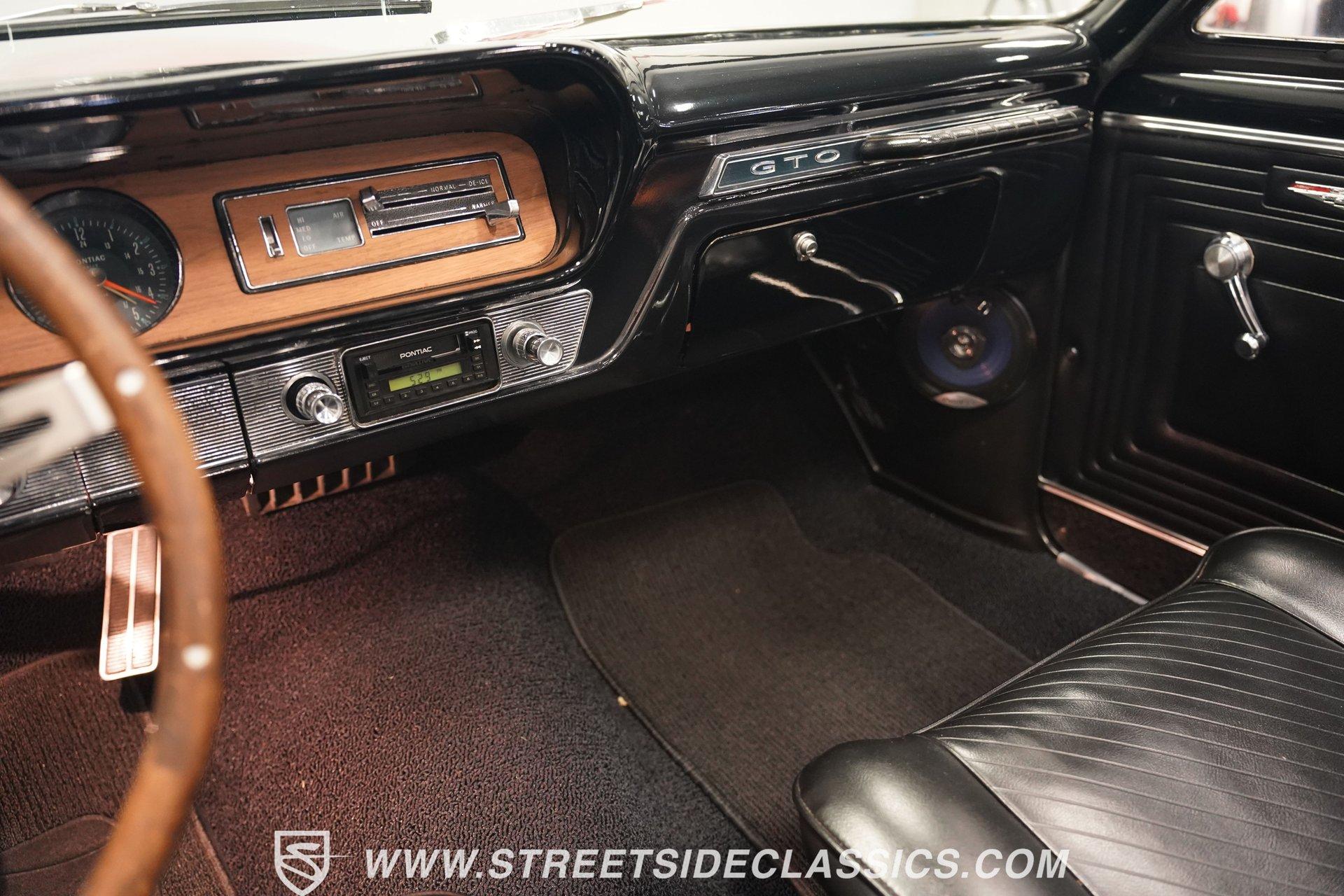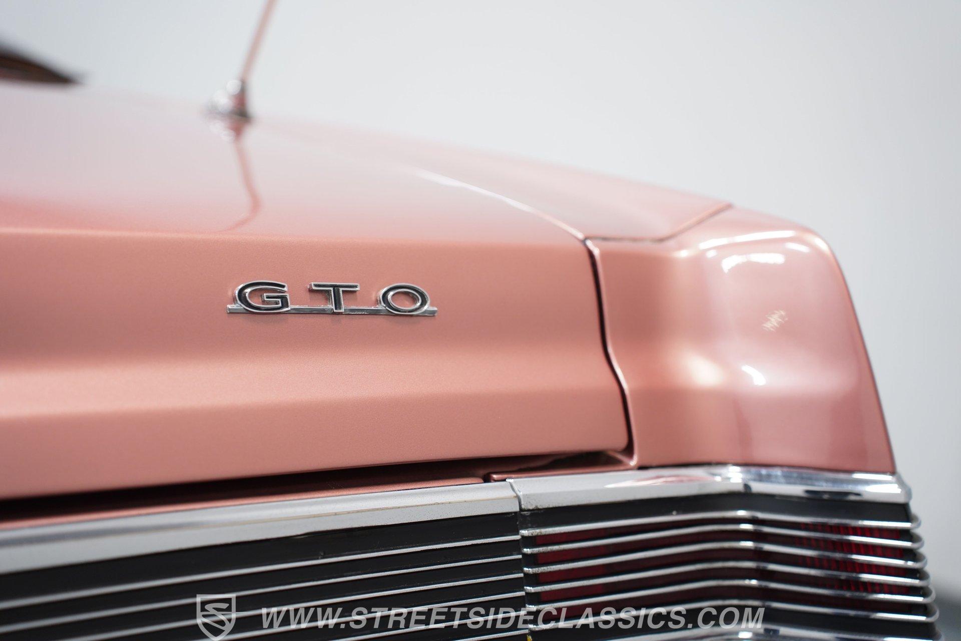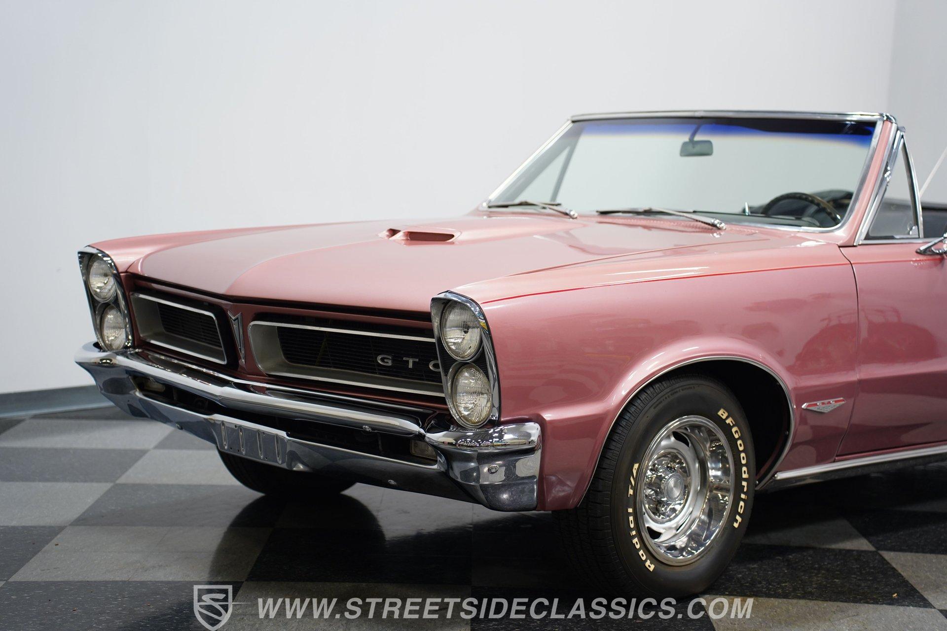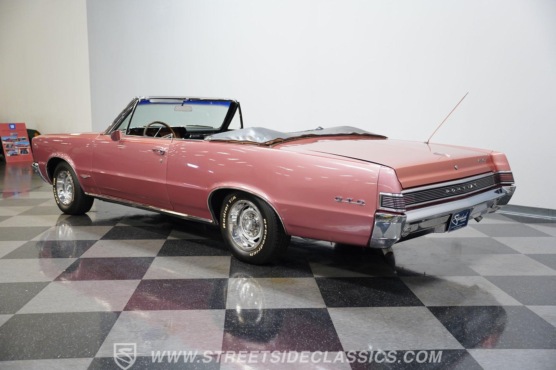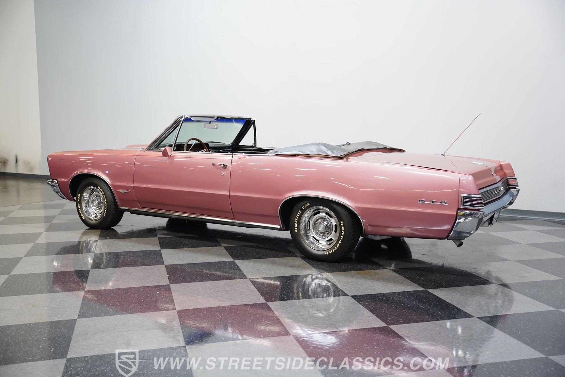 This 1965 Pontiac GTO Convertible makes its presence known with a bold Sunfire Red exterior. The muscular body lines stretch from the distinctive split grille to the powerful rear fenders. A black vinyl top provides a sharp contrast against the vibrant paint. The GTO rolls on 14-inch wheels fitted with P215/70R14 BFGoodrich tires, embodying classic muscle car style. The interior features black vinyl bucket seats, inviting drivers into a performance-oriented cockpit. A billet steering wheel offers enhanced grip and control. The upgraded AM/FM radio delivers tunes for your drive. The column-mounted shifter and well-laid-out instrument panel maintain the GTO's original look while providing modern functionality. A 389 cubic inch V8 engine powers this GTO, mated to a 2-speed Super Turbine 300 automatic transmission. An Edelbrock AVS2 1806 600 CFM 4-barrel carburetor boosts the V8's performance. The dual exhaust system with aftermarket mufflers produces a deep, aggressive tone. Power steering and power drum brakes provide confident control, while the 3.23 rear axle ratio balances acceleration and highway cruising. HIGHLIGHTS: 389 V8 engine 2-speed Super Turbine 300 automatic transmission Edelbrock AVS2 1806 600 CFM 4-barrel carburetor Dual exhaust with aftermarket mufflers Power steering Power brakes 3.23 rear axle ratio Coil spring suspension Sunfire Red paint Black vinyl convertible top 14-inch wheels P215/70R14 BFGoodrich tires Black vinyl bucket seats Billet steering wheel Upgraded AM/FM radio Column-mounted shifter PHS documentation This 1965 Pontiac GTO Convertible combines iconic muscle car design with potent V8 power. Its Sunfire Red paint and growling 389 engine create an unforgettable driving experience. Call today!