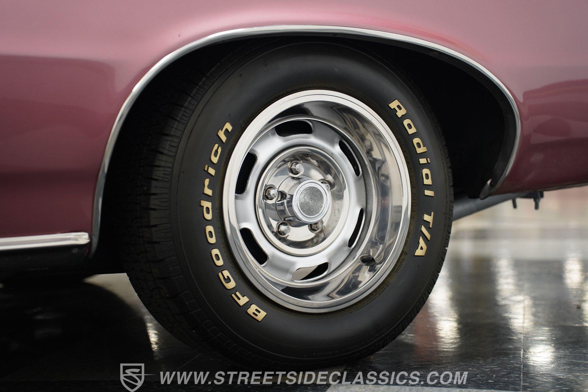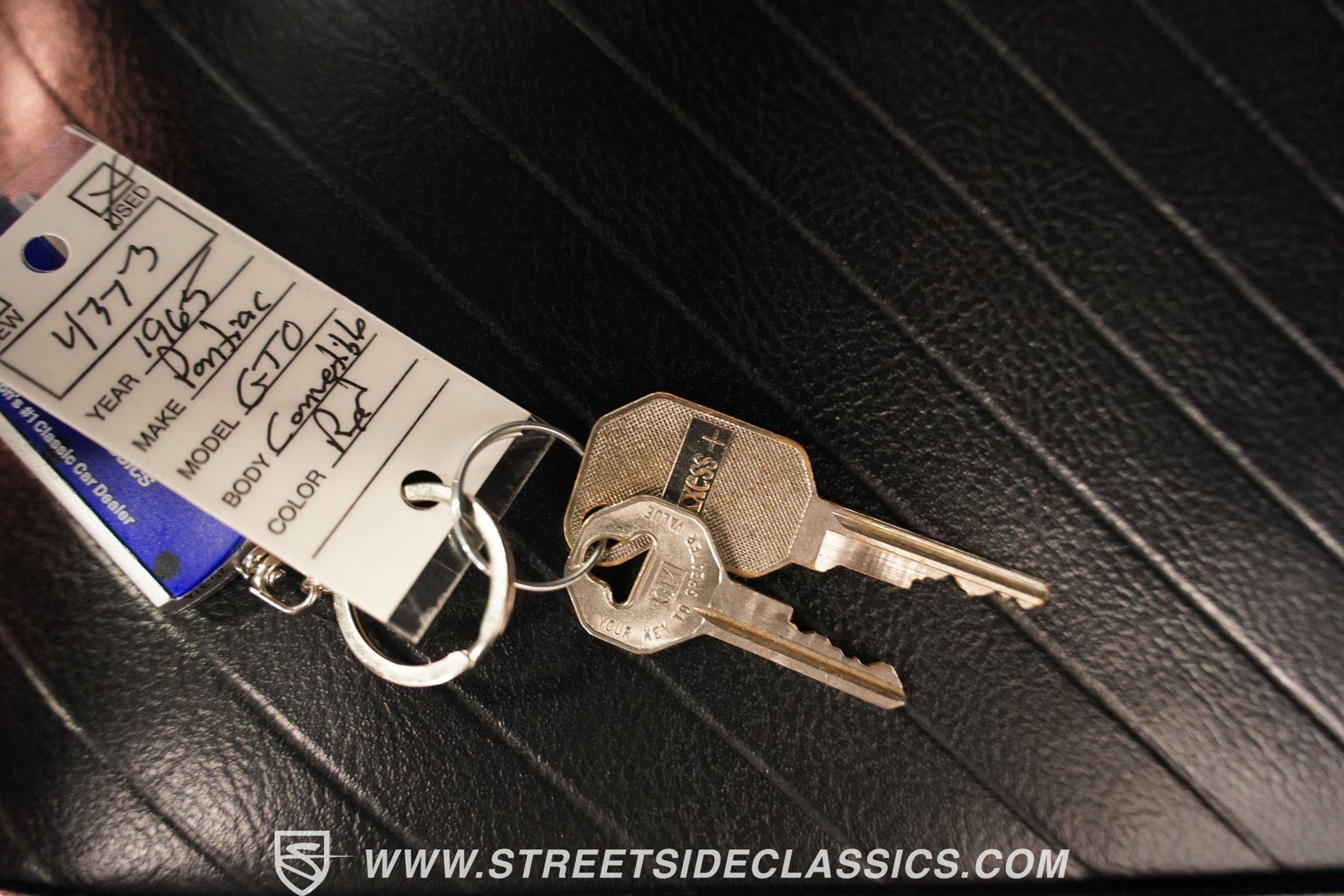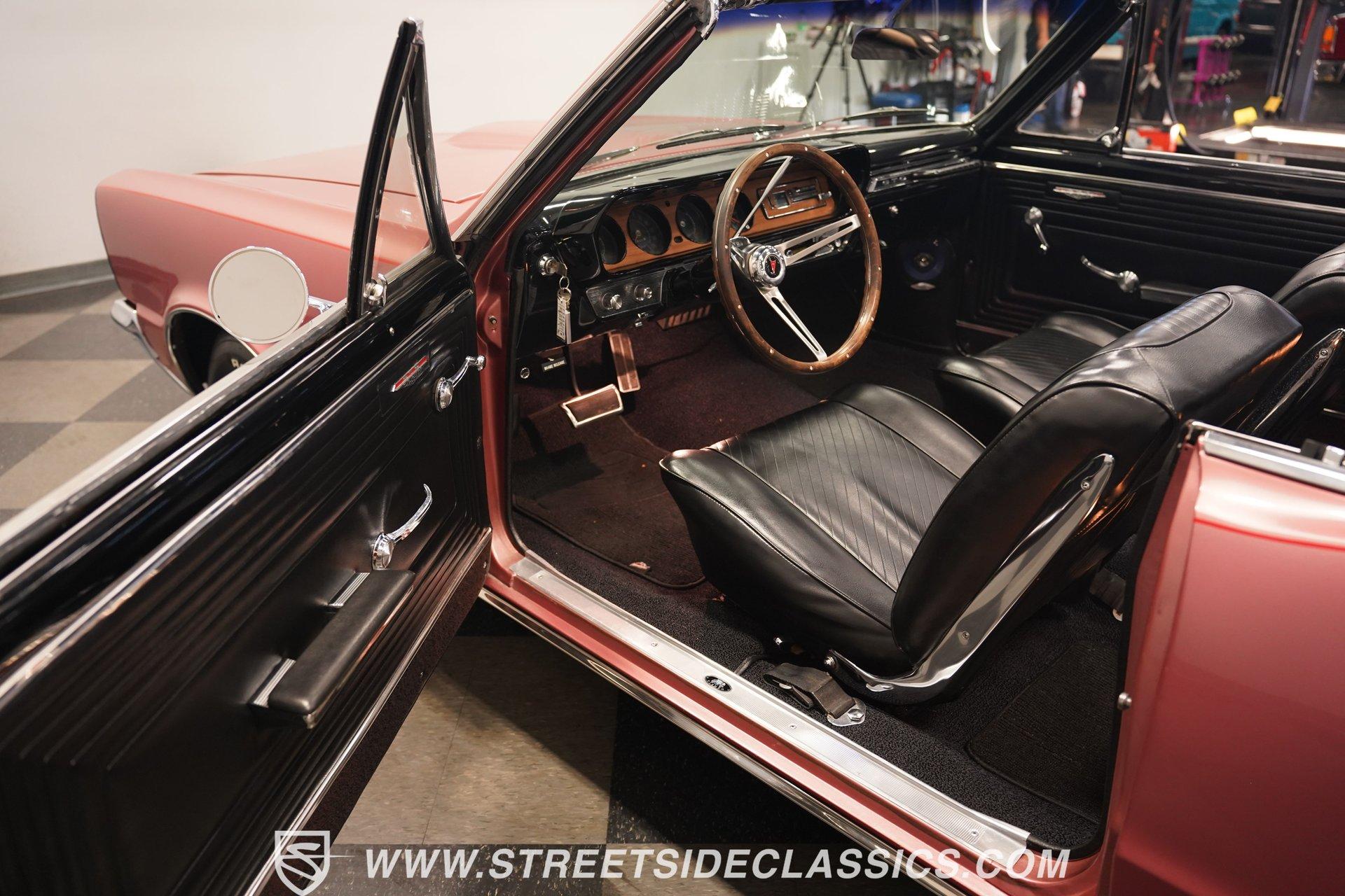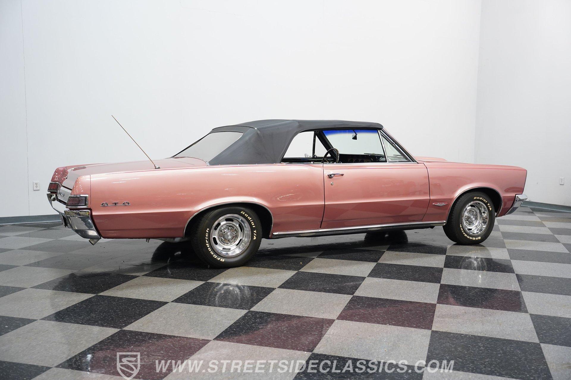 This 1965 Pontiac GTO Convertible makes its presence known with a bold Sunfire Red exterior. The muscular body lines stretch from the distinctive split grille to the powerful rear fenders. A black vinyl top provides a sharp contrast against the vibrant paint. The GTO rolls on 14-inch wheels fitted with P215/70R14 BFGoodrich tires, embodying classic muscle car style. The interior features black vinyl bucket seats, inviting drivers into a performance-oriented cockpit. A billet steering wheel offers enhanced grip and control. The upgraded AM/FM radio delivers tunes for your drive. The column-mounted shifter and well-laid-out instrument panel maintain the GTO's original look while providing modern functionality. A 389 cubic inch V8 engine powers this GTO, mated to a 2-speed Super Turbine 300 automatic transmission. An Edelbrock AVS2 1806 600 CFM 4-barrel carburetor boosts the V8's performance. The dual exhaust system with aftermarket mufflers produces a deep, aggressive tone. Power steering and power drum brakes provide confident control, while the 3.23 rear axle ratio balances acceleration and highway cruising. HIGHLIGHTS: 389 V8 engine 2-speed Super Turbine 300 automatic transmission Edelbrock AVS2 1806 600 CFM 4-barrel carburetor Dual exhaust with aftermarket mufflers Power steering Power brakes 3.23 rear axle ratio Coil spring suspension Sunfire Red paint Black vinyl convertible top 14-inch wheels P215/70R14 BFGoodrich tires Black vinyl bucket seats Billet steering wheel Upgraded AM/FM radio Column-mounted shifter PHS documentation This 1965 Pontiac GTO Convertible combines iconic muscle car design with potent V8 power. Its Sunfire Red paint and growling 389 engine create an unforgettable driving experience. Call today!