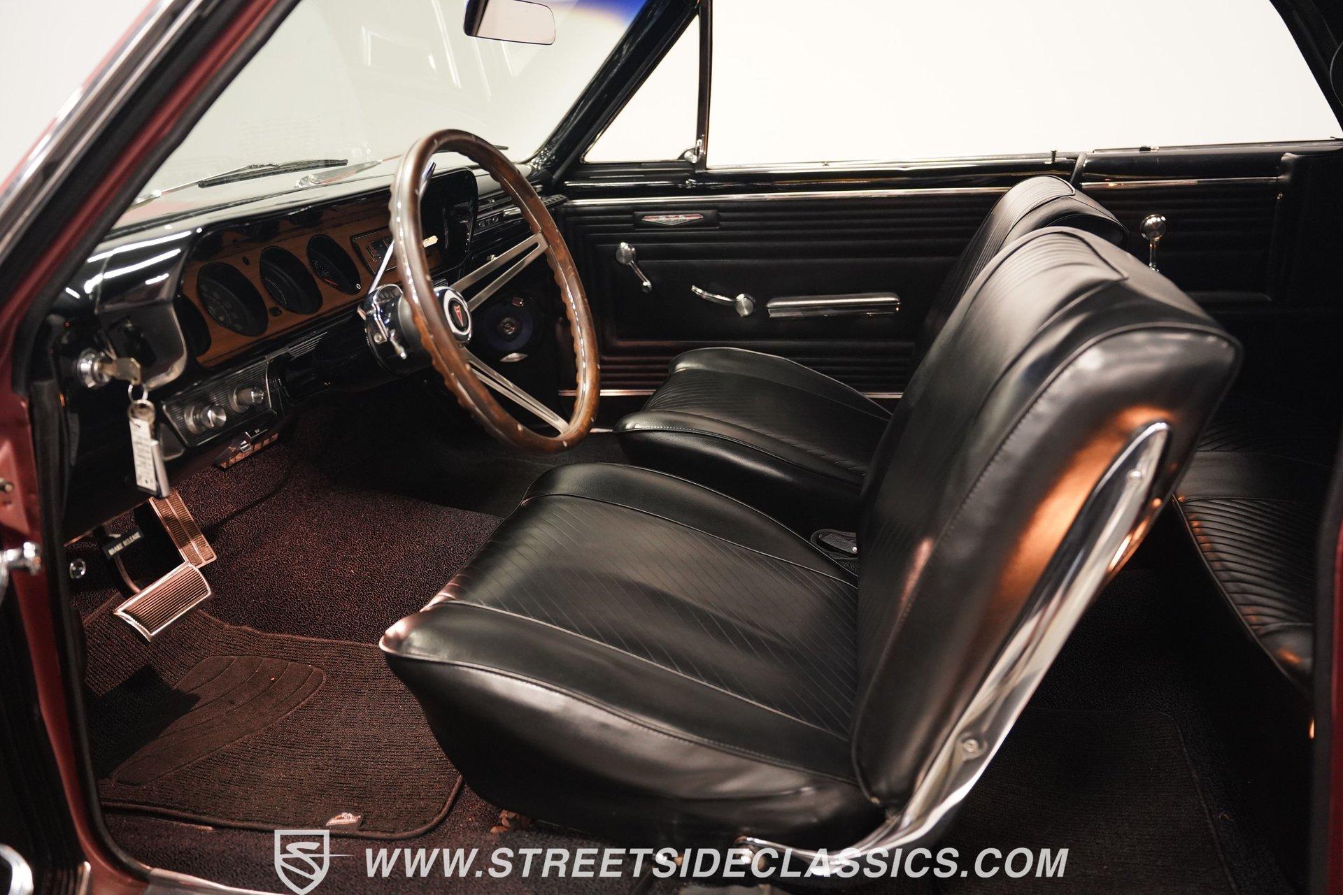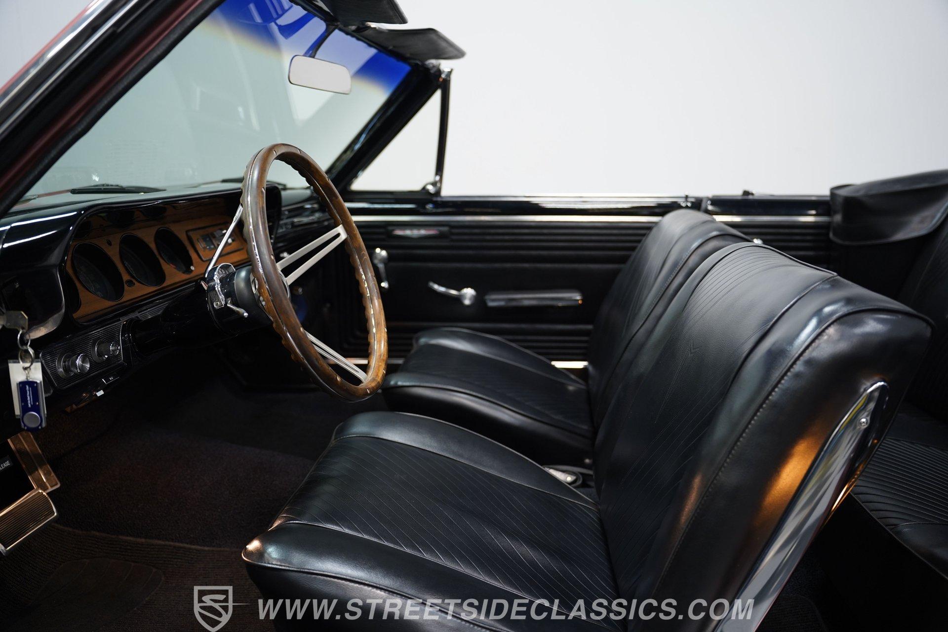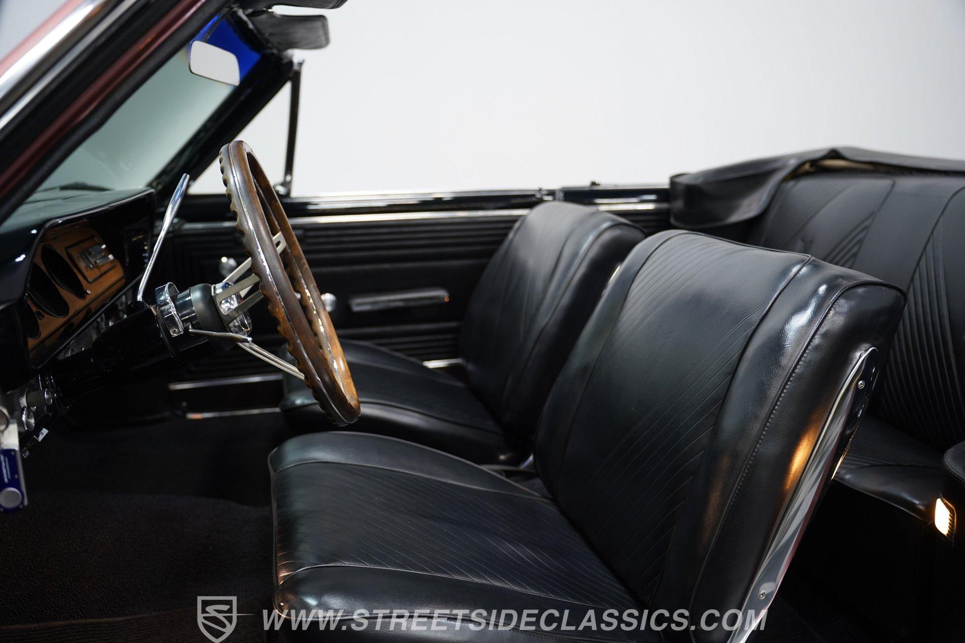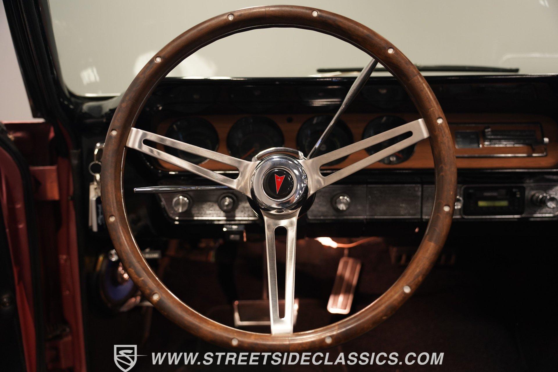 This 1965 Pontiac GTO Convertible makes its presence known with a bold Sunfire Red exterior. The muscular body lines stretch from the distinctive split grille to the powerful rear fenders. A black vinyl top provides a sharp contrast against the vibrant paint. The GTO rolls on 14-inch wheels fitted with P215/70R14 BFGoodrich tires, embodying classic muscle car style. The interior features black vinyl bucket seats, inviting drivers into a performance-oriented cockpit. A billet steering wheel offers enhanced grip and control. The upgraded AM/FM radio delivers tunes for your drive. The column-mounted shifter and well-laid-out instrument panel maintain the GTO's original look while providing modern functionality. A 389 cubic inch V8 engine powers this GTO, mated to a 2-speed Super Turbine 300 automatic transmission. An Edelbrock AVS2 1806 600 CFM 4-barrel carburetor boosts the V8's performance. The dual exhaust system with aftermarket mufflers produces a deep, aggressive tone. Power steering and power drum brakes provide confident control, while the 3.23 rear axle ratio balances acceleration and highway cruising. HIGHLIGHTS: 389 V8 engine 2-speed Super Turbine 300 automatic transmission Edelbrock AVS2 1806 600 CFM 4-barrel carburetor Dual exhaust with aftermarket mufflers Power steering Power brakes 3.23 rear axle ratio Coil spring suspension Sunfire Red paint Black vinyl convertible top 14-inch wheels P215/70R14 BFGoodrich tires Black vinyl bucket seats Billet steering wheel Upgraded AM/FM radio Column-mounted shifter PHS documentation This 1965 Pontiac GTO Convertible combines iconic muscle car design with potent V8 power. Its Sunfire Red paint and growling 389 engine create an unforgettable driving experience. Call today!