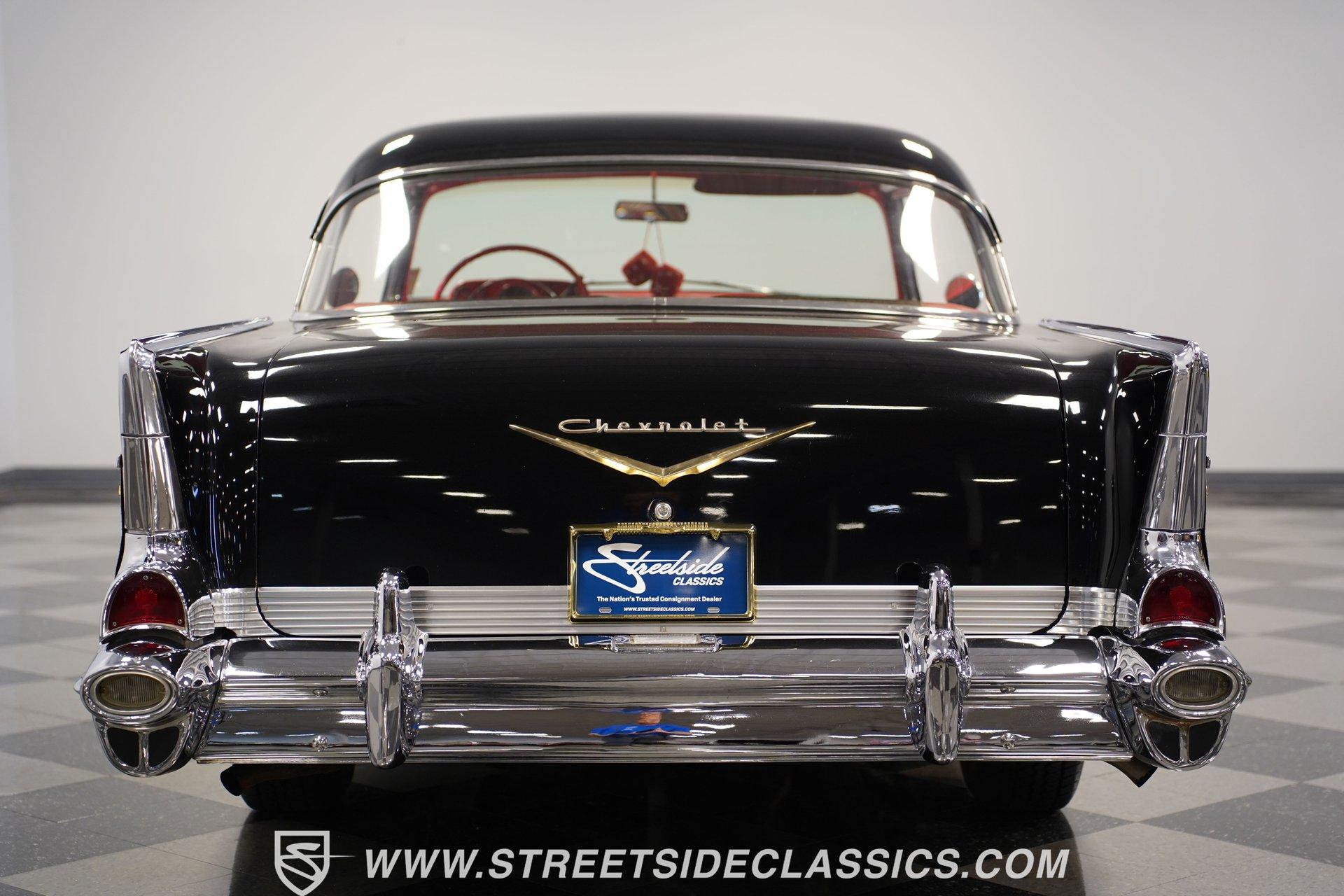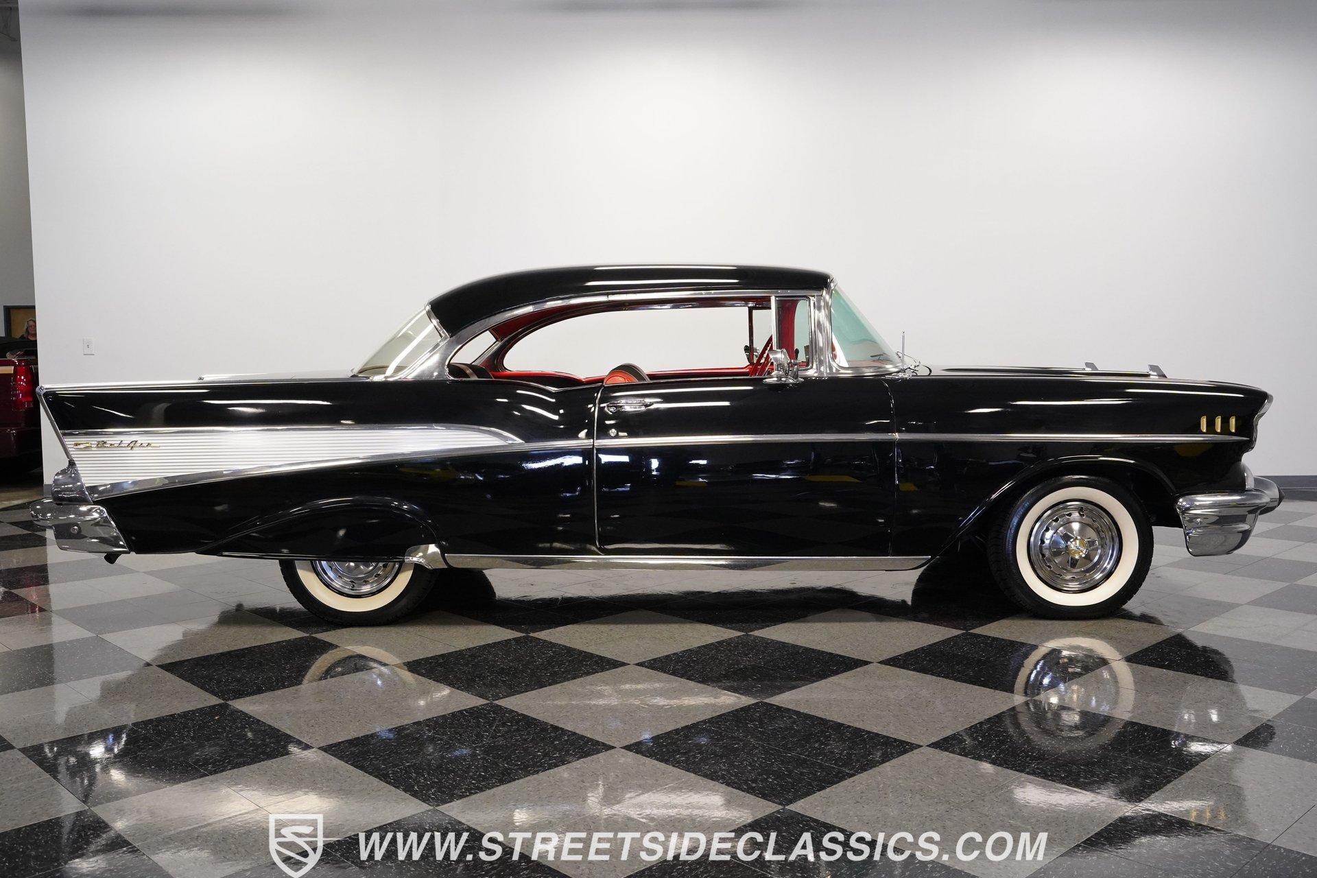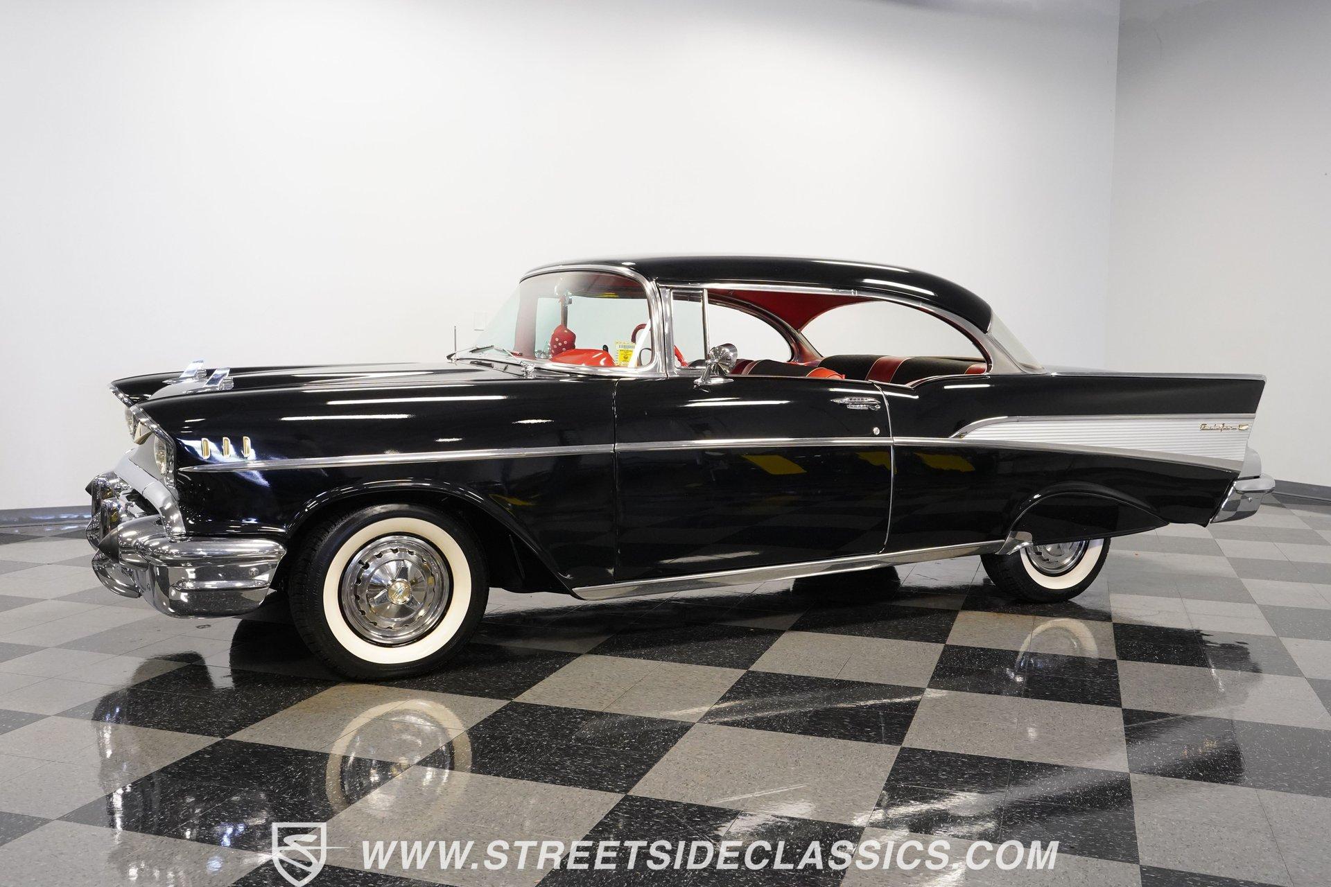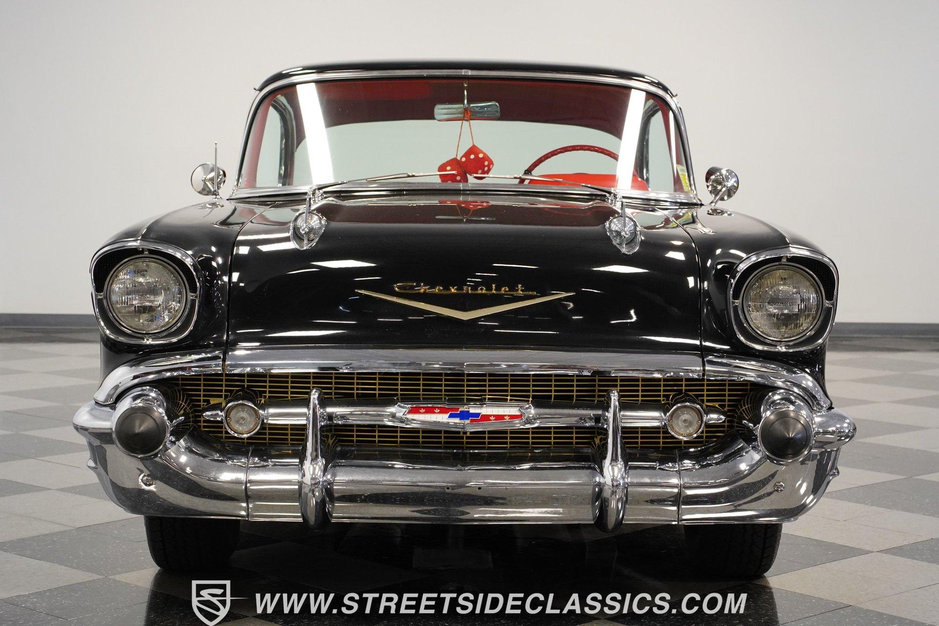 This 1957 Chevrolet Bel Air is among the most recognizable American automobiles of all time, an icon of its age. In the final year of the model's third generation, it offered an intoxicating blend of style, performance and features with its freshly designed front end and tastefully executed tailfins. This Bel Air has the distinction of being previously owned by Joe Gibbs of the racing team and Football coach fame. Finished in deep Onyx Black, this 1957 Chevrolet Bel Air looks sharp and is loaded with factory options. The glass-like paint job throws back light like a mirror, making the chrome bumpers, grille, and trim pop against the dark background. Gold Chevrolet, Bel Air, and "V" badges tell you this is no ordinary '57. The stance is perfect, sitting on 14" steel wheels wrapped in Silvertown radial white wall 205/75R14 tires and topped with factory Chevrolet deluxe spinner wheel covers. Exterior accessories include fender skirts, front and rear bumper guards, both left and right-side mirrors and ribbed trunk lid molding. The black and red interior hits you with its bold factory-correct style the moment you open the door. Two-tone vinyl and cloth cover the bench seats and look great. Desirable options include factory air conditioning, power windows, power seat and Wonderbar radio. The trunk compartment is equally impressive with its factory mat, spare, and jack all properly placed and presented. Under the hood is a smooth-running 283 cubic inch V8 engine. Orange paint covers the block and valve covers just as Chevrolet intended back in '57. The clean engine bay appears largely stock in appearance, however there is an upgraded Edelbrock 4-barrel carburetor. This V8 pushes power through an upgraded 700R4 4-speed automatic transmission, that combined with factory power steering and power brakes, makes this iconic Bel Air a pleasure to drive. The dual exhaust gives this Bel Air the perfect rumble when cruising down Main Street. HIGHLIGHTS: 283 V8 Engine 4-Speed Automatic Transmission Factory Air Conditioning Dual Exhaust System Power Steering Onyx Black Paint Chrome Bumpers, Grille, Emblems and Trim Gold Chevy, Bel Air and "V" Emblems 14" Steel Wheels with Chevrolet Spinner Hubcaps Silvertown White Wall Radial Tires Black and Red Interior with Bench Seats Power Brakes Wonderbar Radio Power Windows Edelbrock Carburetor Power Seat Factory Trunk Mat with Spare Tire and Jack Fender Skirts A genuine 1957 Chevrolet Bel Air sits at the top of most collector wish lists for good reason. This clean and well-optioned example gives you the chance to own one of Chevrolet's most legendary machines. Call today!