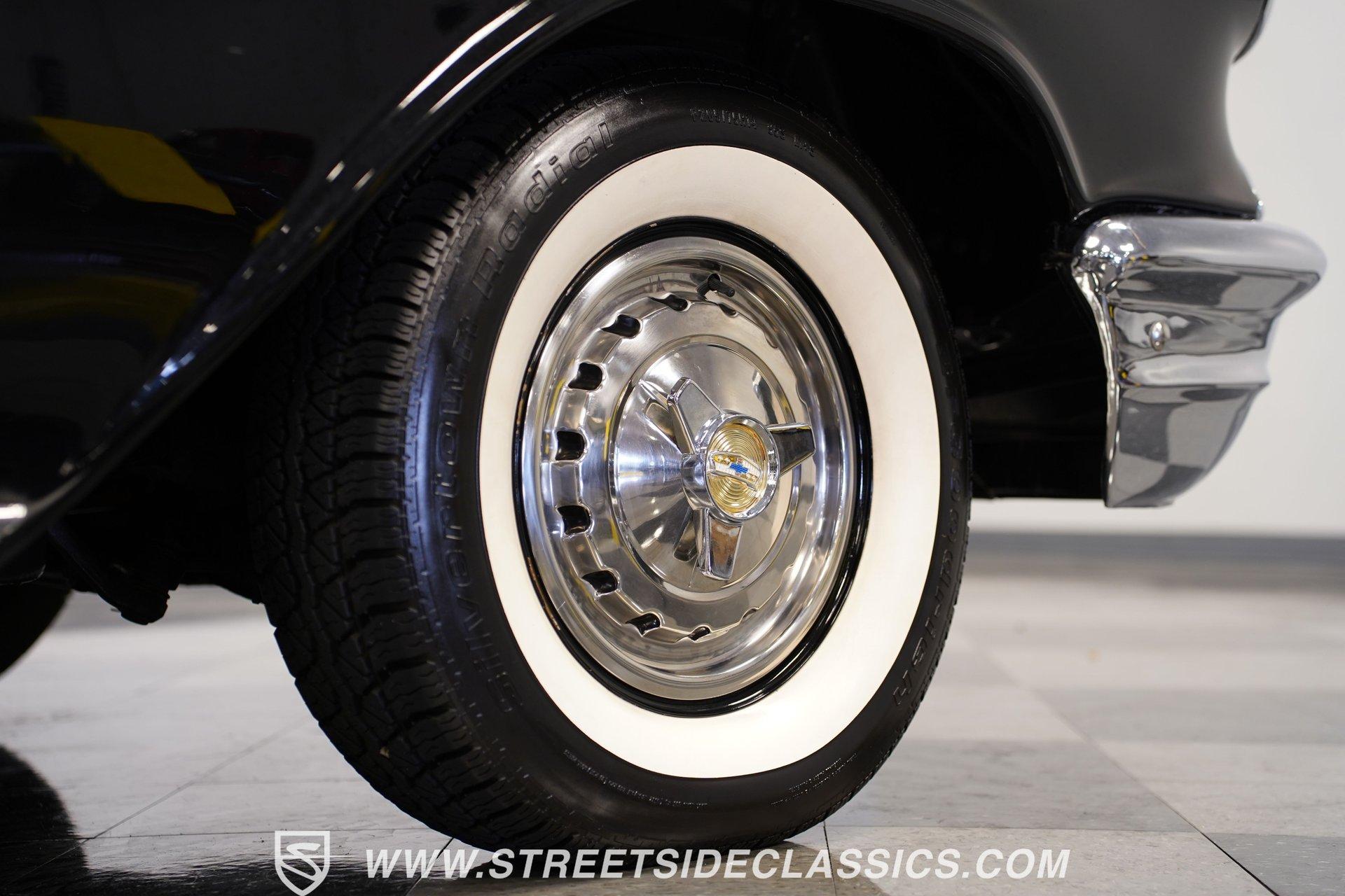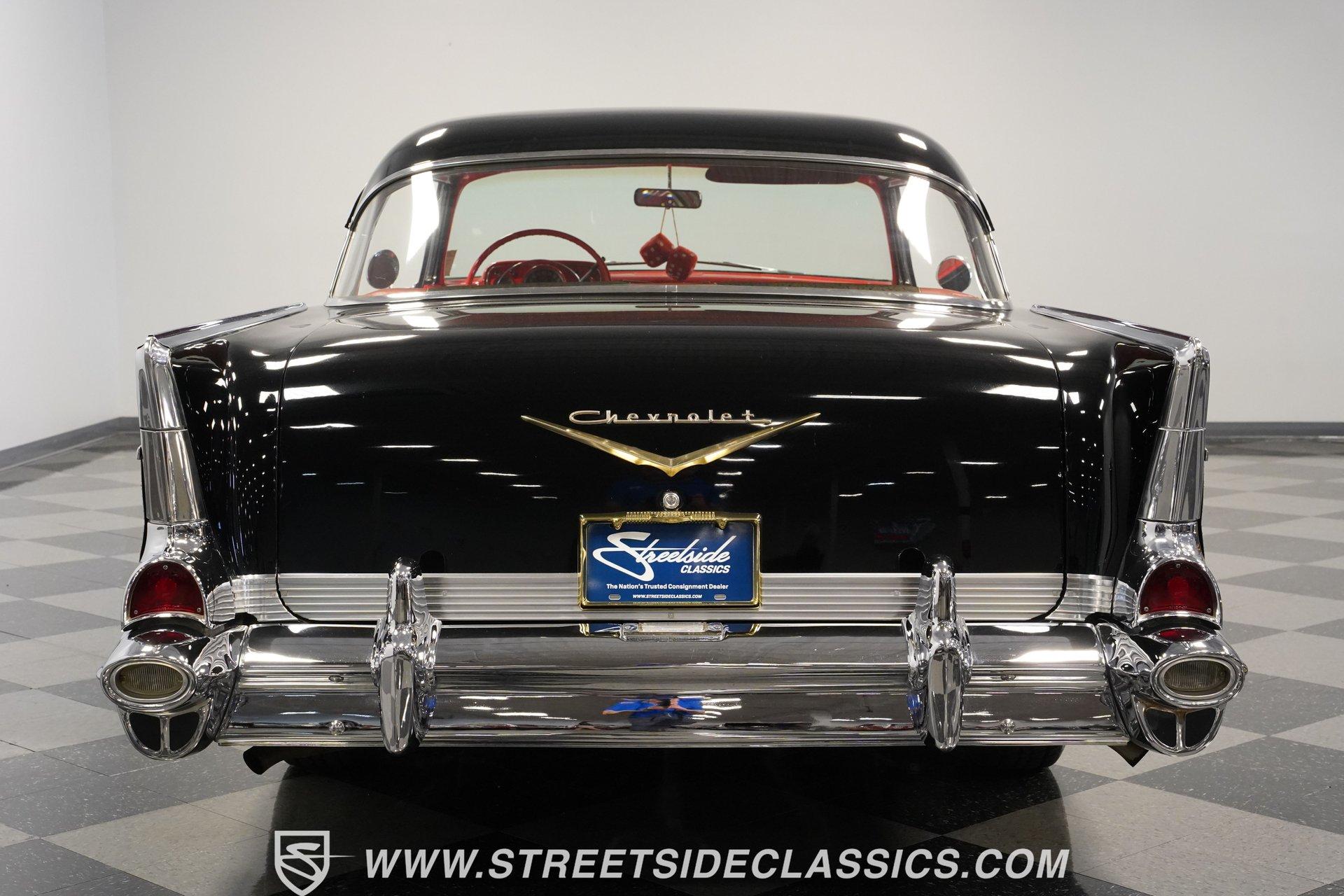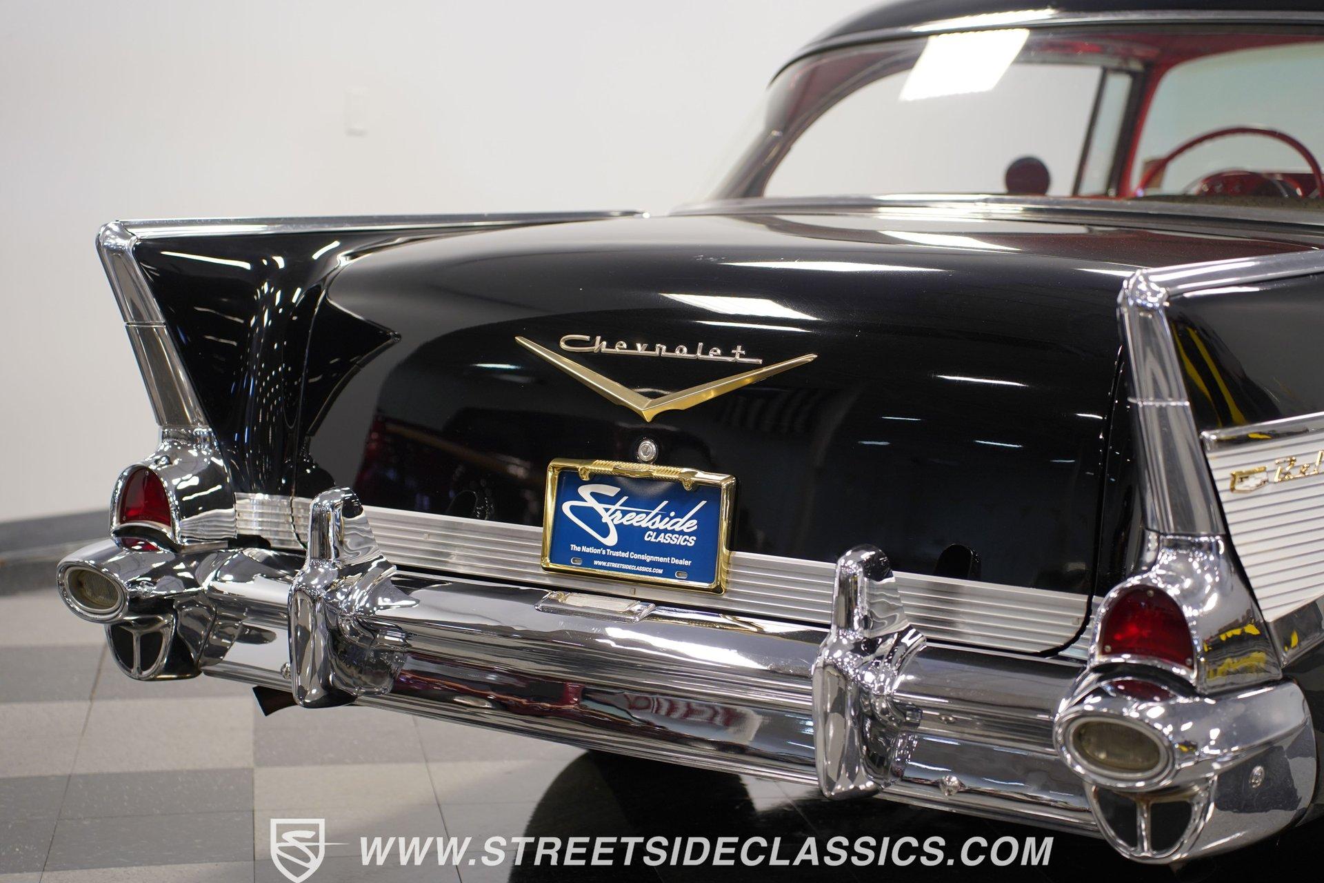 This 1957 Chevrolet Bel Air is among the most recognizable American automobiles of all time, an icon of its age. In the final year of the model's third generation, it offered an intoxicating blend of style, performance and features with its freshly designed front end and tastefully executed tailfins. This Bel Air has the distinction of being previously owned by Joe Gibbs of the racing team and Football coach fame. Finished in deep Onyx Black, this 1957 Chevrolet Bel Air looks sharp and is loaded with factory options. The glass-like paint job throws back light like a mirror, making the chrome bumpers, grille, and trim pop against the dark background. Gold Chevrolet, Bel Air, and "V" badges tell you this is no ordinary '57. The stance is perfect, sitting on 14" steel wheels wrapped in Silvertown radial white wall 205/75R14 tires and topped with factory Chevrolet deluxe spinner wheel covers. Exterior accessories include fender skirts, front and rear bumper guards, both left and right-side mirrors and ribbed trunk lid molding. The black and red interior hits you with its bold factory-correct style the moment you open the door. Two-tone vinyl and cloth cover the bench seats and look great. Desirable options include factory air conditioning, power windows, power seat and Wonderbar radio. The trunk compartment is equally impressive with its factory mat, spare, and jack all properly placed and presented. Under the hood is a smooth-running 283 cubic inch V8 engine. Orange paint covers the block and valve covers just as Chevrolet intended back in '57. The clean engine bay appears largely stock in appearance, however there is an upgraded Edelbrock 4-barrel carburetor. This V8 pushes power through an upgraded 700R4 4-speed automatic transmission, that combined with factory power steering and power brakes, makes this iconic Bel Air a pleasure to drive. The dual exhaust gives this Bel Air the perfect rumble when cruising down Main Street. HIGHLIGHTS: 283 V8 Engine 4-Speed Automatic Transmission Factory Air Conditioning Dual Exhaust System Power Steering Onyx Black Paint Chrome Bumpers, Grille, Emblems and Trim Gold Chevy, Bel Air and "V" Emblems 14" Steel Wheels with Chevrolet Spinner Hubcaps Silvertown White Wall Radial Tires Black and Red Interior with Bench Seats Power Brakes Wonderbar Radio Power Windows Edelbrock Carburetor Power Seat Factory Trunk Mat with Spare Tire and Jack Fender Skirts A genuine 1957 Chevrolet Bel Air sits at the top of most collector wish lists for good reason. This clean and well-optioned example gives you the chance to own one of Chevrolet's most legendary machines. Call today!