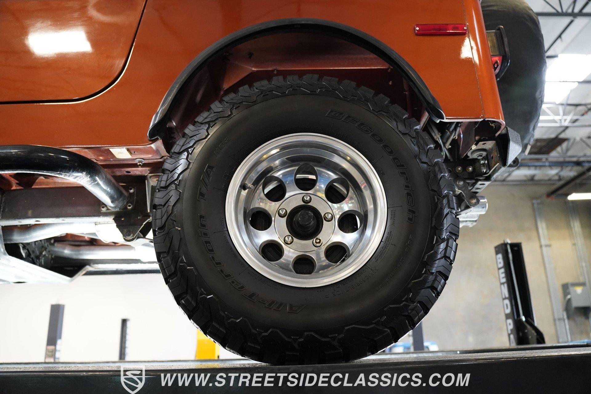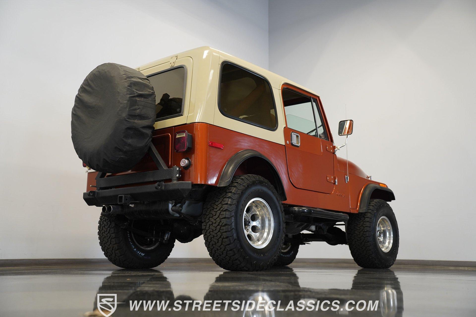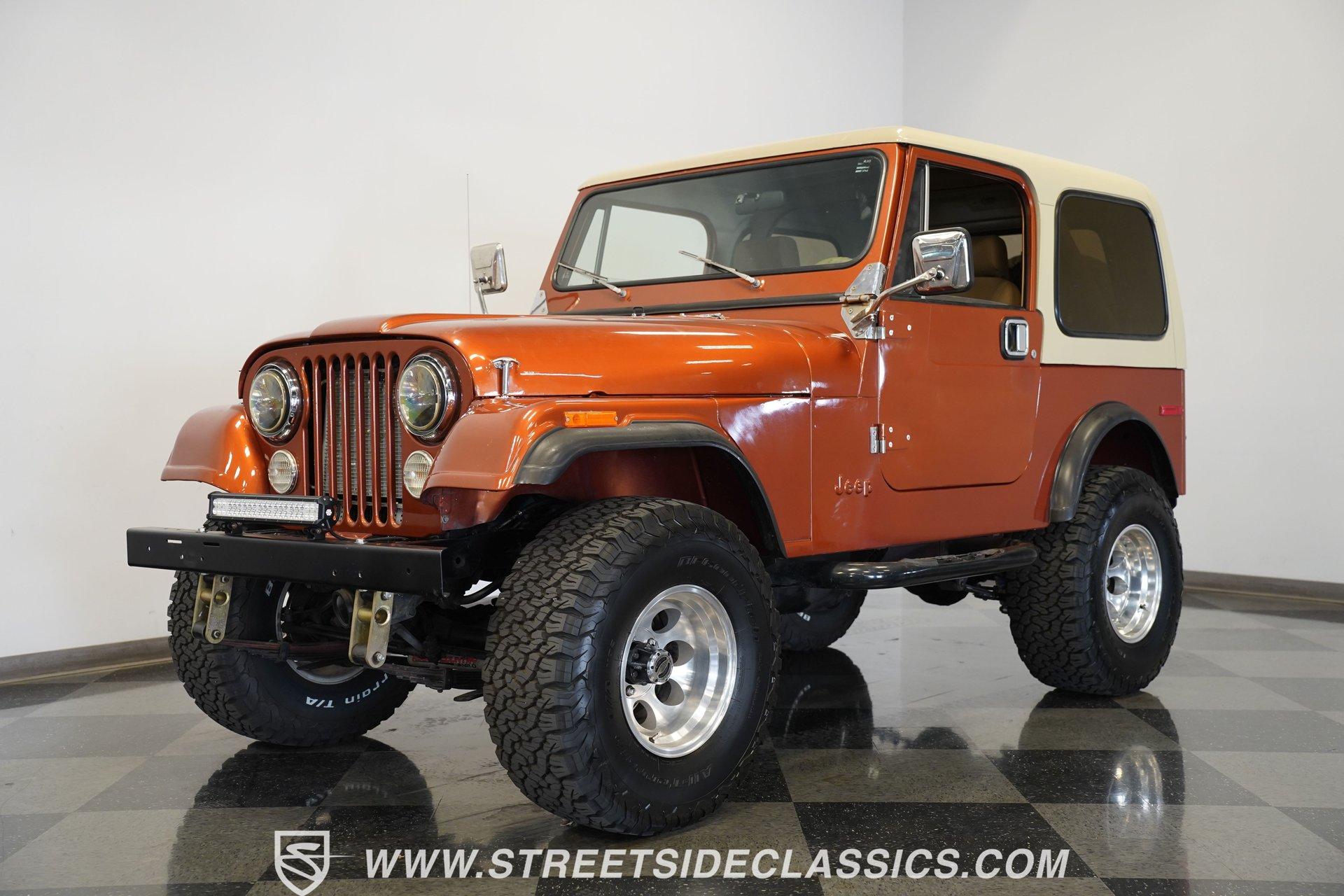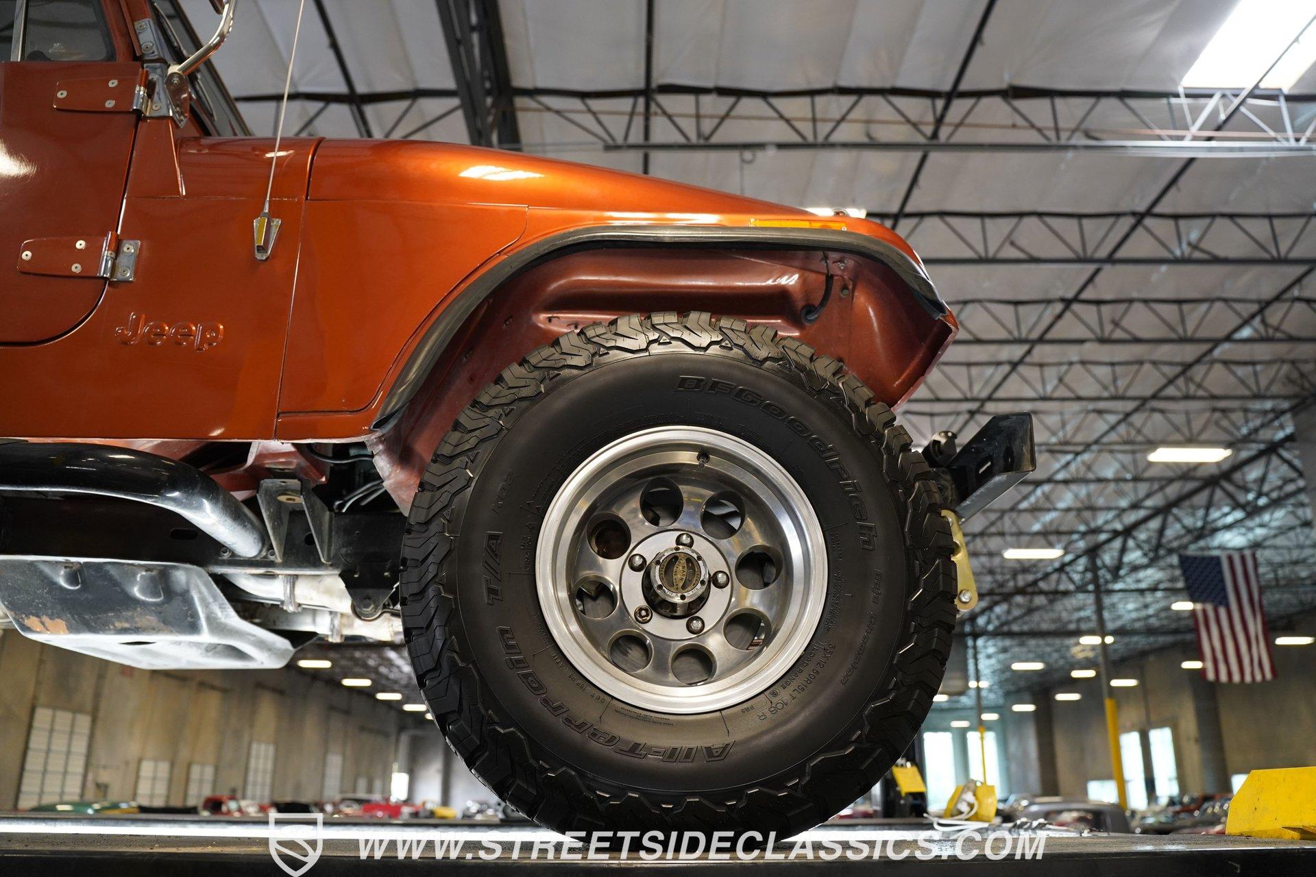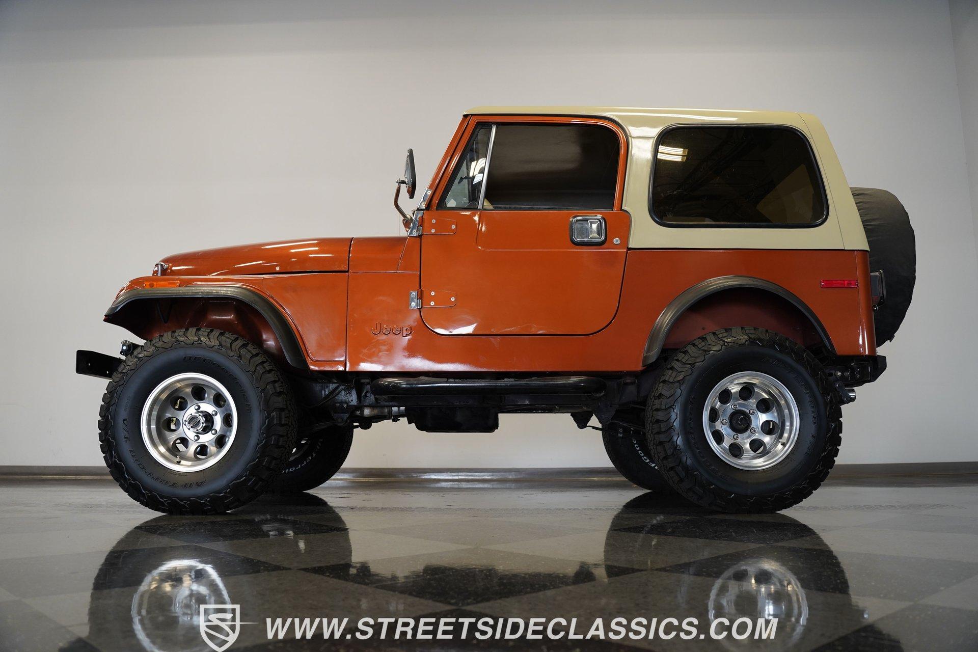Here is a beautiful, rugged 1976 Jeep CJ7 4x4. It's perfect for back trails, hills, rock climbing, shallow streams, and whatever other adventures you might find yourself up to. With a Shackle lift, huge tires, a powerful engine/drivetrain, and a Smittybilt rear bumper with a hitch, there won't be much that can stop you on your conquest. The LED headlights and LED light bar on the front bumper allow you to see better in the darkness and make you more visible to people and animals in the dark. And of course, if you're just into cruising and enjoying the fresh air, you might as well look great while you do it. The body is painted a rugged Orange with a Tan removable hard-top. The Dark Grey wheel well extensions and black side steps make this Jeep look good and fun to drive anywhere. The interior looks well-kept, with tan front and rear Bestop cloth seats. The same Orange from the exterior carries over to the dashboard and door panels. The non-orange portions of the door panels are tan, clean, and visually appealing. Above the passenger seating is a painted roll bar for occupant safety and style. The dashboard appears mostly original, featuring the speedometer, other gauges, and stock knobs and dials in the correct locations. There is no carpet, but the easy-to-clean textured floor pan keeps things practical. The Retrosound head unit with AM/FM/Aux and dual Memphis speakers provides modern audio. All shifting needs are handled by a floor shifter, with the 4x4 drive engagement shifter conveniently located next to it. Under the hood, you'll find a 304 cubic-inch V8 with an Edelbrock 4-Barrel paired with a Performer RPM intake. This is connected to a 3-speed manual Borg-Warner T150 with a Dana model 18 transfer case. Both front and rear suspensions use leaf springs, connecting to a solid front Dana 30 axle and a solid rear AMC model 20 axle. Beefy 15-inch aftermarket wheels are wrapped in even beefier BFG all-terrain 33X12.5R15 LT tires, DOT dated 2011. Long tube headers, dual exhaust, and Xcelerator mufflers deliver the perfect tuned sound from this beast. Highlights: 304 Cubic-Inch V8 Edelbrock 4-Barrel Paired With A Performer RPM Intake 3-speed Manual Borg-Warren T150 With A Dana Model 18 Transfer Case Solid Front Dana 30 Axle Solid Rear AMC Model 20 Axle Leaf Springs Front And Back 15-Inch Rims BFG Front And Rear 33x12.5R15 LT Tires DOT Dated 2001 Long Tube Headers, Dual Exhaust, And Xcelerator Mufflers Tan Removable Hard-Top Painted Tan Roll Bar Tan Front And Rear Bestop Cloth Seats Aftermarket Steering Wheel With Tan Cover On The Rim Retrosound Head Unit With AM/FM/Aux And Dual Memphis Speakers Correct Size Spare Tire With Cover Are you ready to take on the roads with this 1976 Jeep CJ7 4x4 monster? If so, you need to act fast, because this road warrior won't last long. Call Today.