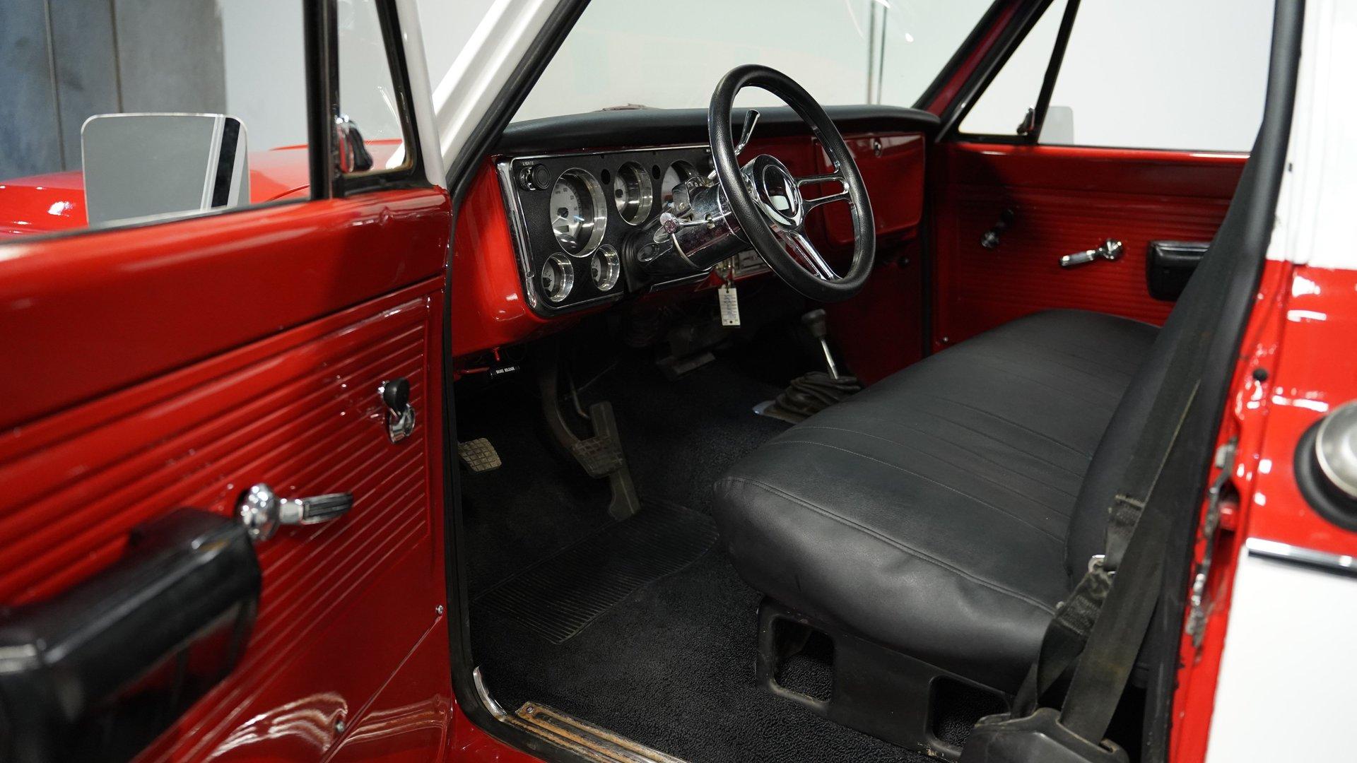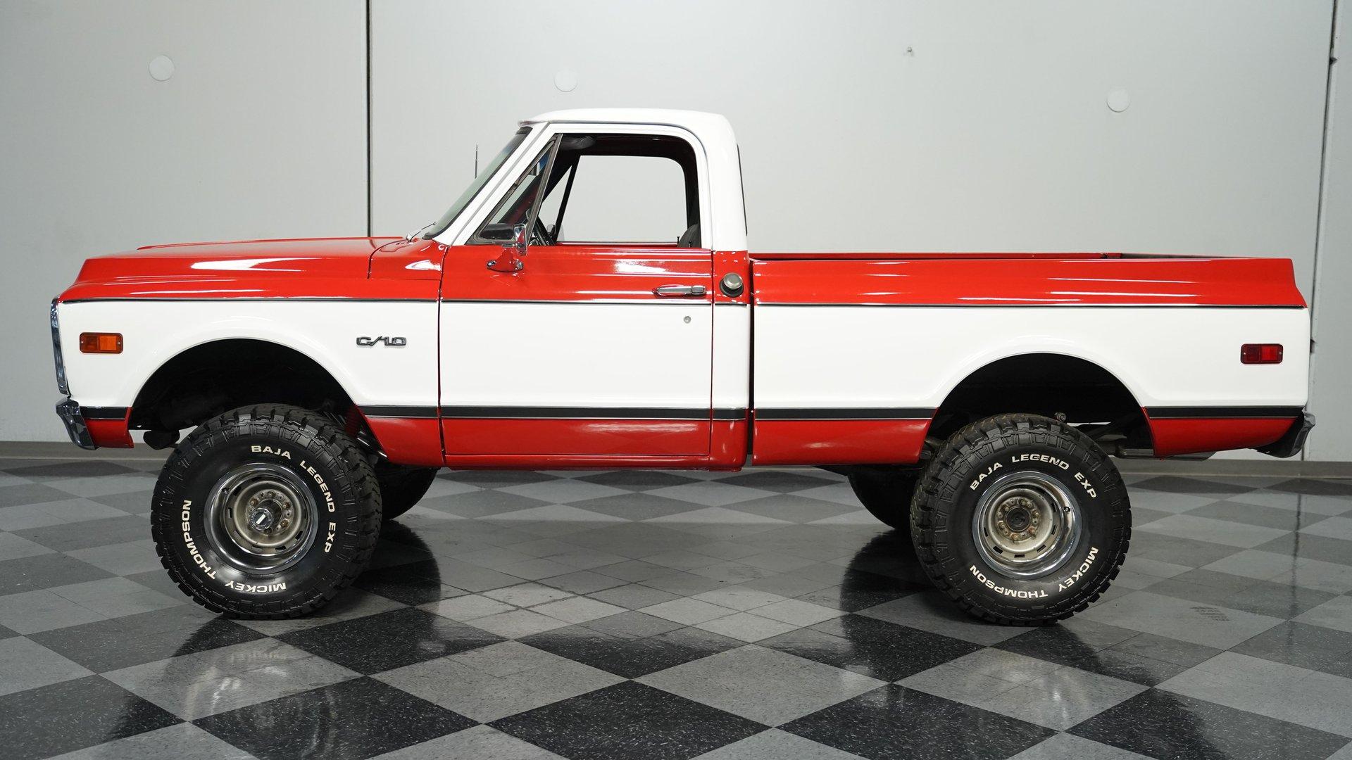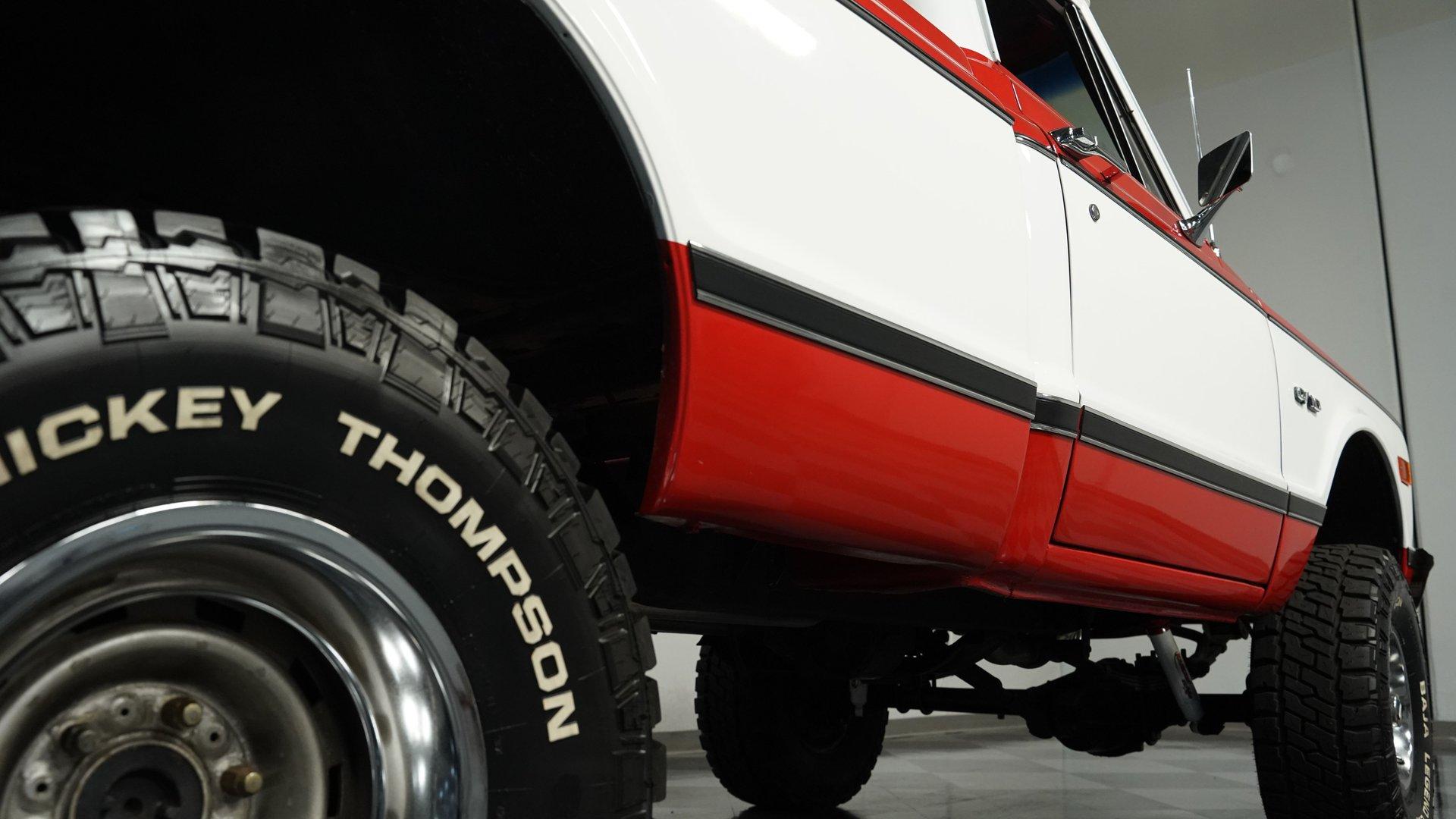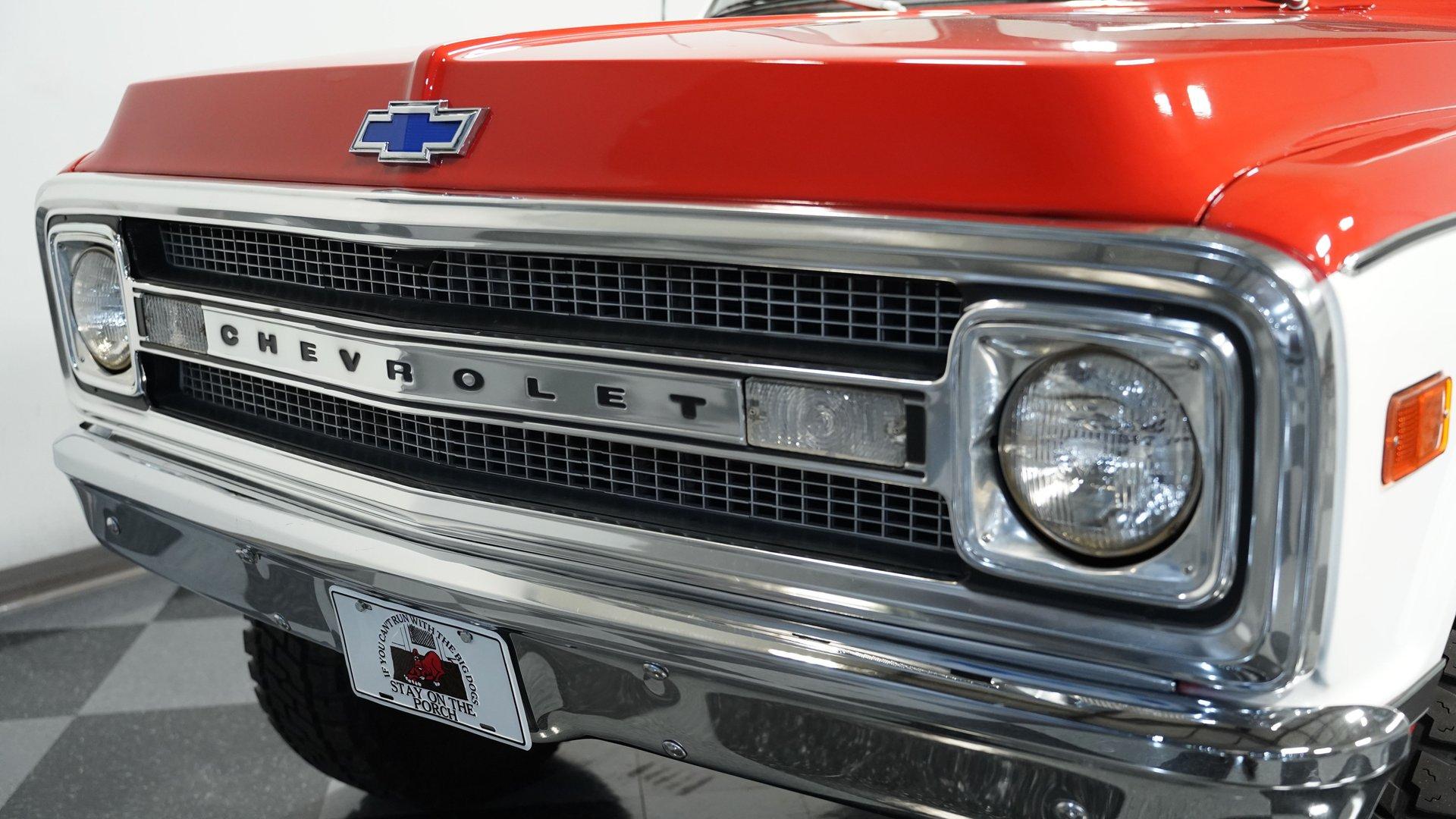 Although this is a C10 body structure, this truck sits on a K10 4x4 chassis, giving you all the towing, off-road, and hard work capabilities you'd expect from a K10. This is a very original, good-looking truck with the famous Hugger Orange and white color scheme that is highly sought-after in the classic truck world. The tires and wheels give it a mean, aggressive stance, but they're not just for show, they're built to tackle all types of terrain Mother Nature throws at you. With an all-steel body and chrome bumpers front and back, this truck could last you a lifetime. The interior is just as tough and stylish as the exterior. Black vinyl bench seats, padded dashboard, clean carpeting, and a black gauge cluster, offsets the painted orange sheet metal that matches the exterior orange, creating a very pleasing visual style. The custom-polished title steering wheel, steering column, and column shifter gives this truck a retro feel, especially when combined with the freshly installed Dakota digital gauges. There's a 4x4 transfer shifter lever located on the floor and a truck bedliner out back to protect the paint when you put your truck to work. The engine bay is extremely clean, featuring a painted Chevy Orange 350 cubic-inch engine with orange lettering on the valve covers and air cleaner. A double-barrel Edelbrock carburetor sits atop an Edelbrock intake. A TH350 3-speed automatic transmission connects to a 10-bolt rear axle. Leaf springs and newer Rancho shocks on all four corners improve the ride, along with 15-inch rally wheels and 33x12.50R15LT tires. Front power disc brakes and rear power drums provide reliable stopping power. For exhaust duties, long-tube headers run through dual exhaust with aftermarket mufflers and shiny tailpipes that extend past the bumper for extra style. Headlights *350 Cubic-Inch V8 *TH350 Transmission *Chevy K10 4x4 Chassis *Newer Rancho Shocks *Power Front Disc Brakes *Mickey Thompson Baja Legend EXP Tires *Dakota Digital Gauges *Heat And Defrost *Bed Linner *Title Steering Wheel With Column Shifter And 4x4 Engagement Shifter On The Floor If you want a truck that looks awesome, runs great, and is tough as nails, this 1970 Chevrolet K10 4x4 is exactly what you need. It's perfect for cruising, hauling, trailing, light off-roading, and more. Call today!