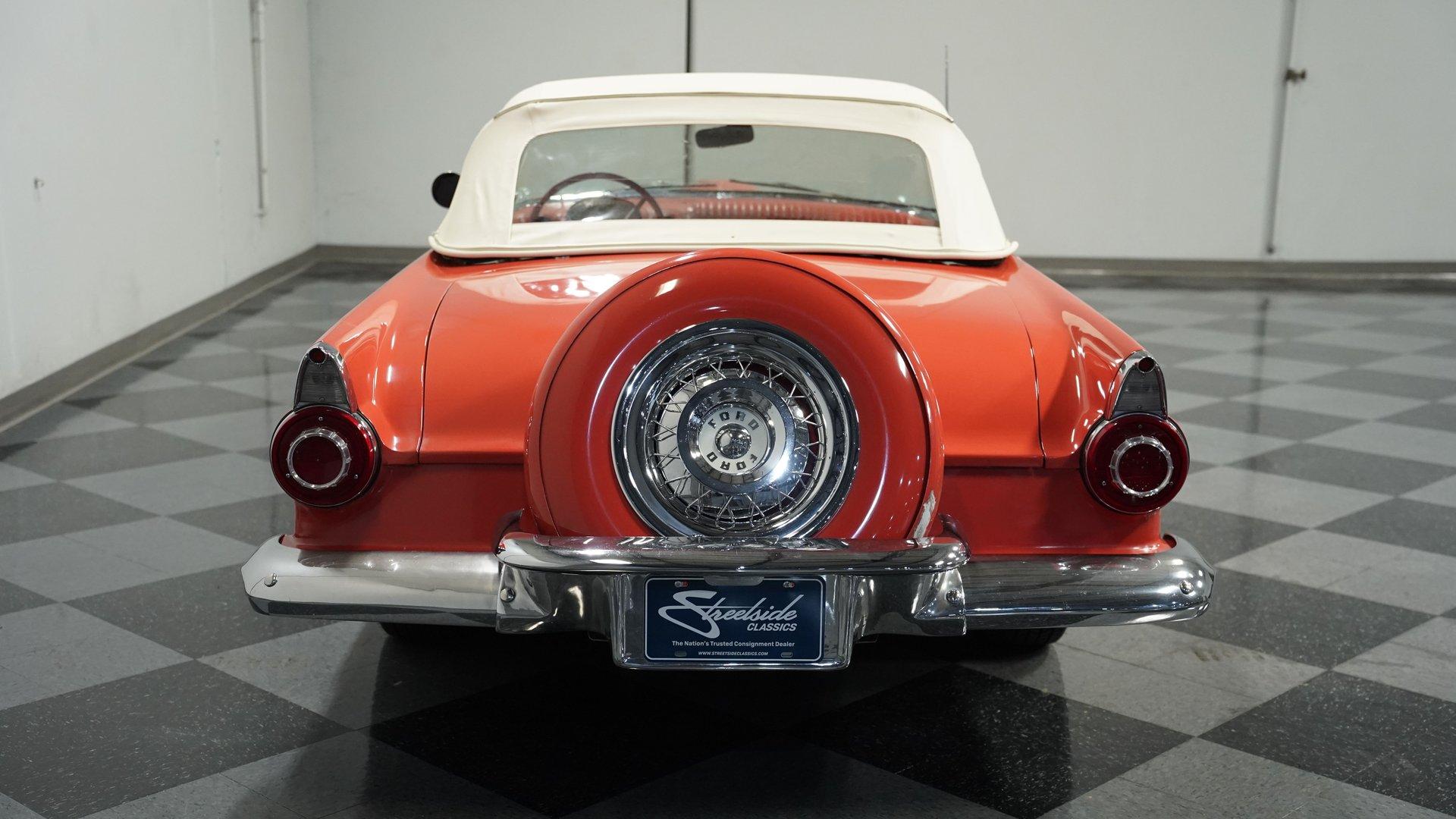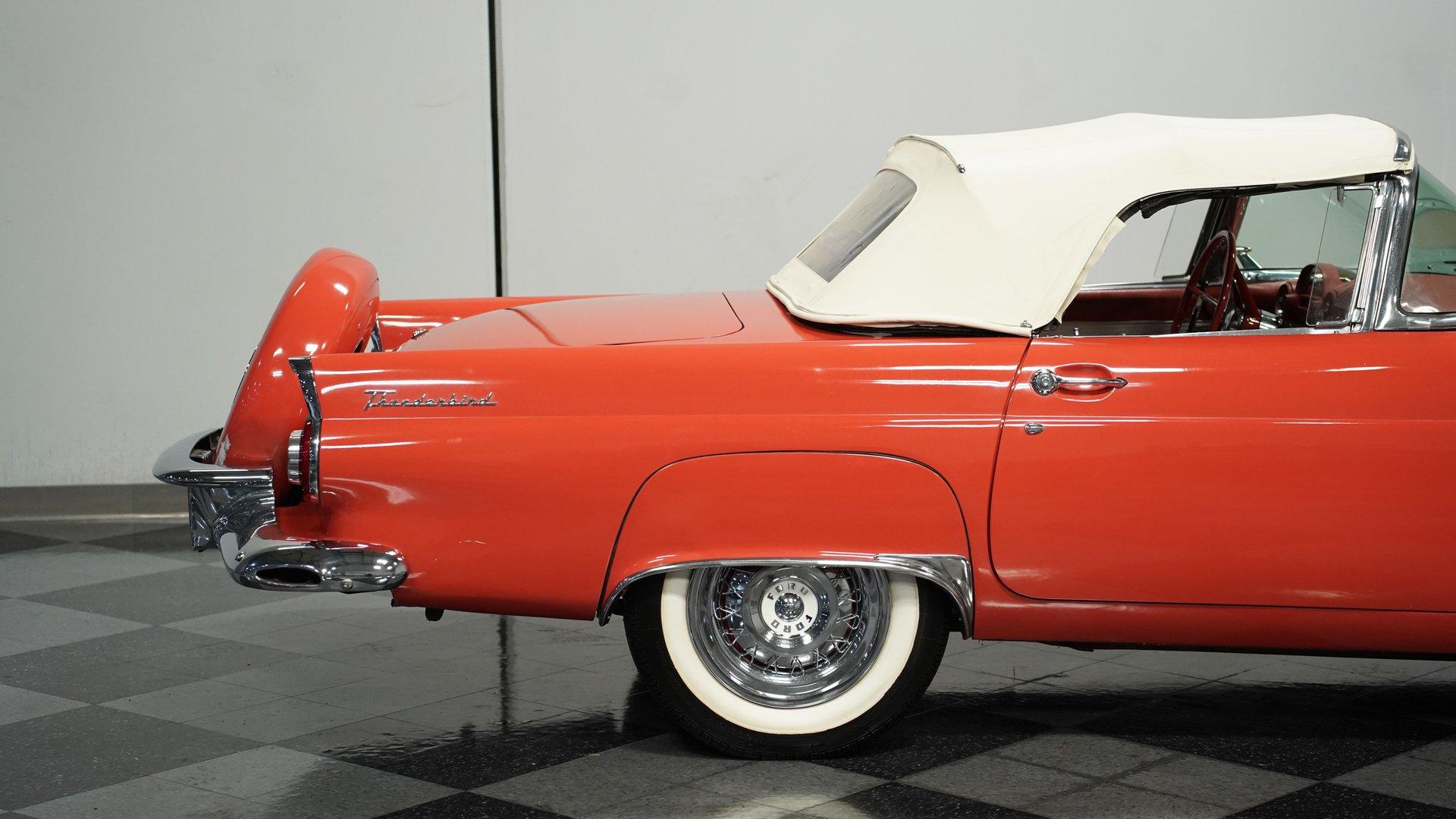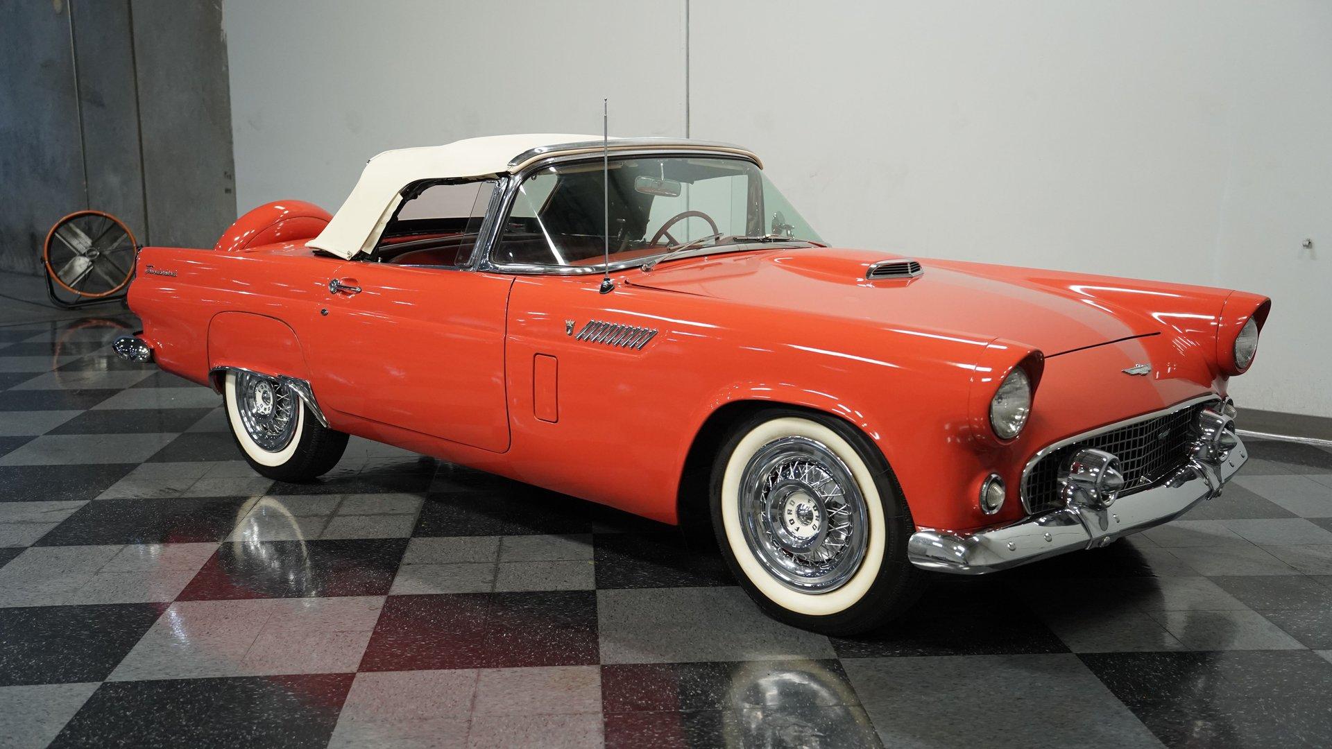 The 1956 Ford Thunderbird offered minimal changes from the previous year, the most notable including a new rear bumper, a winged badge on the nose, new taillights, front fender vents to keep the passenger compartment cooler, new interior seat and door panels as well as new exterior colors. Perhaps the most notable change was the addition of the decorative mounting of the spare tire on the rear of the car outside the trunk. Ford built 15,631 of the two-seat Thunderbirds for the 1956 model year, including this example finished in classic Coral over a white-and-coral interior. Nicely equipped, it features upgraded front disc brakes, power windows, power seat, radio, seat belts, fender skirts, Ford accessory wire wheel covers, continental kit, Coker wide whitewall tires and a white convertible top. HIGHLIGHTS: Optional 312 V-8 Engine Ford-O-Matic Transmission Upgraded Front Disc Brakes Original Radio White Soft Top Power Seat Factory Fender Skirts Factory Engine Dress Up Kit Power Windows Coker Wide Whitewall Tires Seat Belts Continental Kit Like Corvette, Ford quickly learned that more power equated to more sales. This Thunderbird is equipped with the newly optional 312 cubic inch V-8 producing 225 horsepower with a 3-speed Ford-O-Matic automatic transmission. This was also the first year for the 12-volt electrical system. The engine bay is clean and is equipped with the optional engine dress up kit that includes a chrome air cleaner, chrome oil breather cap and cool finned aluminum Thunderbird logo valve covers. Stopping power has been greatly with upgraded front disc brakes. This beautiful and highly-optioned Coral 1956 Ford Thunderbird is ready to take flight with its next lucky owner. Call today!