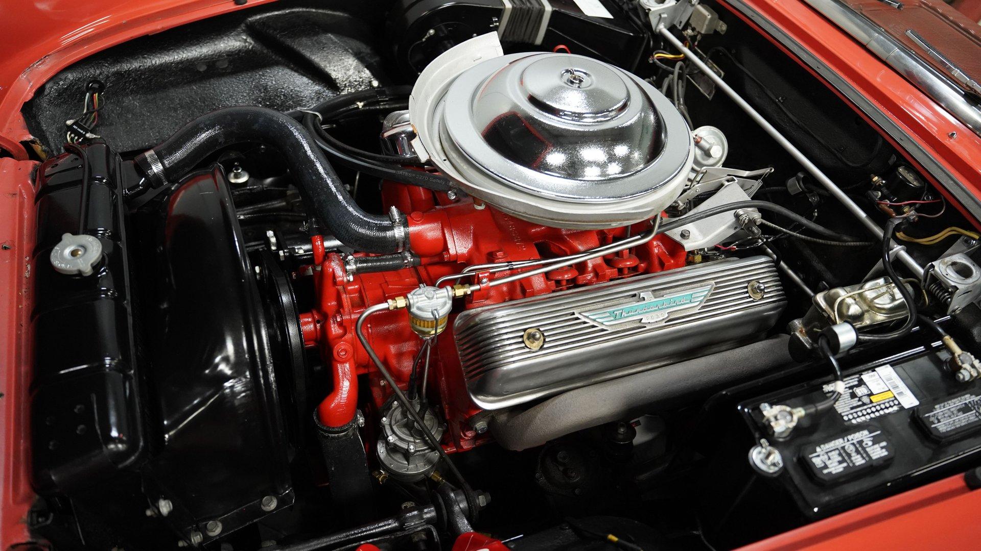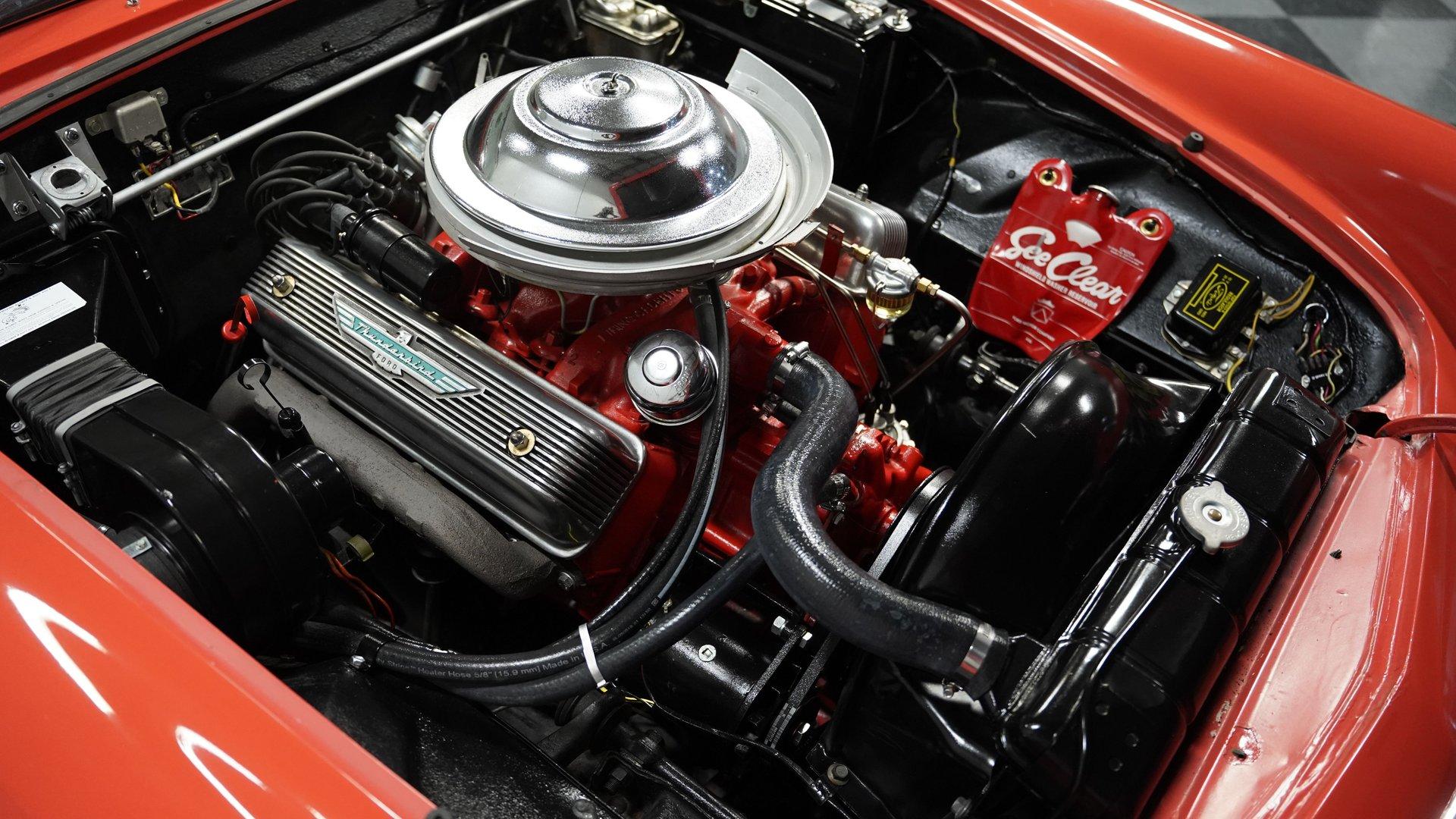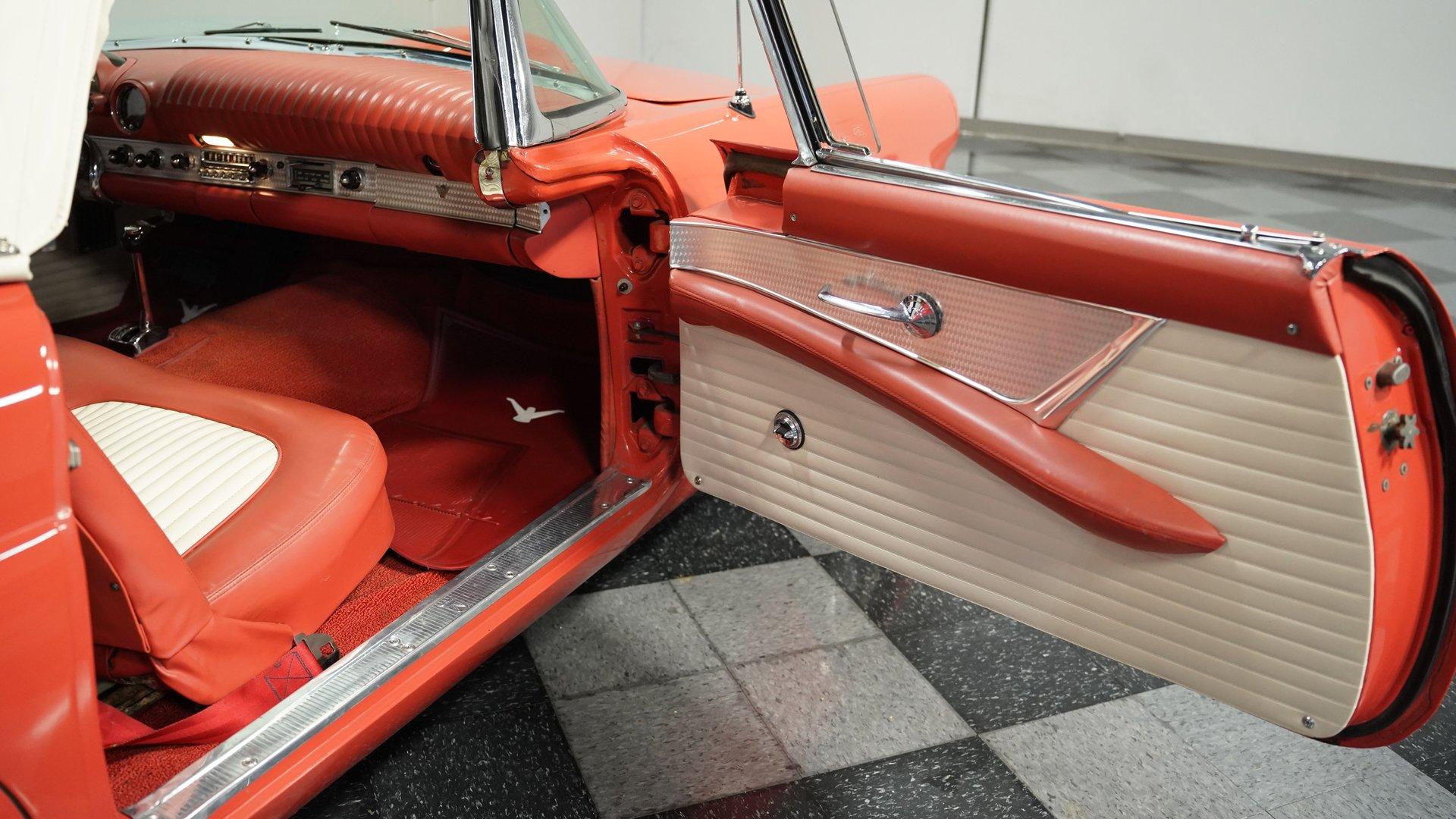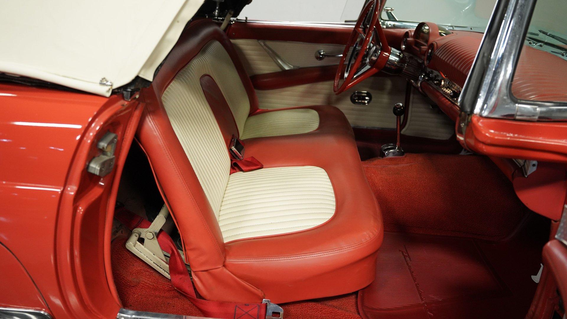 The 1956 Ford Thunderbird offered minimal changes from the previous year, the most notable including a new rear bumper, a winged badge on the nose, new taillights, front fender vents to keep the passenger compartment cooler, new interior seat and door panels as well as new exterior colors. Perhaps the most notable change was the addition of the decorative mounting of the spare tire on the rear of the car outside the trunk. Ford built 15,631 of the two-seat Thunderbirds for the 1956 model year, including this example finished in classic Coral over a white-and-coral interior. Nicely equipped, it features upgraded front disc brakes, power windows, power seat, radio, seat belts, fender skirts, Ford accessory wire wheel covers, continental kit, Coker wide whitewall tires and a white convertible top. HIGHLIGHTS: Optional 312 V-8 Engine Ford-O-Matic Transmission Upgraded Front Disc Brakes Original Radio White Soft Top Power Seat Factory Fender Skirts Factory Engine Dress Up Kit Power Windows Coker Wide Whitewall Tires Seat Belts Continental Kit Like Corvette, Ford quickly learned that more power equated to more sales. This Thunderbird is equipped with the newly optional 312 cubic inch V-8 producing 225 horsepower with a 3-speed Ford-O-Matic automatic transmission. This was also the first year for the 12-volt electrical system. The engine bay is clean and is equipped with the optional engine dress up kit that includes a chrome air cleaner, chrome oil breather cap and cool finned aluminum Thunderbird logo valve covers. Stopping power has been greatly with upgraded front disc brakes. This beautiful and highly-optioned Coral 1956 Ford Thunderbird is ready to take flight with its next lucky owner. Call today!