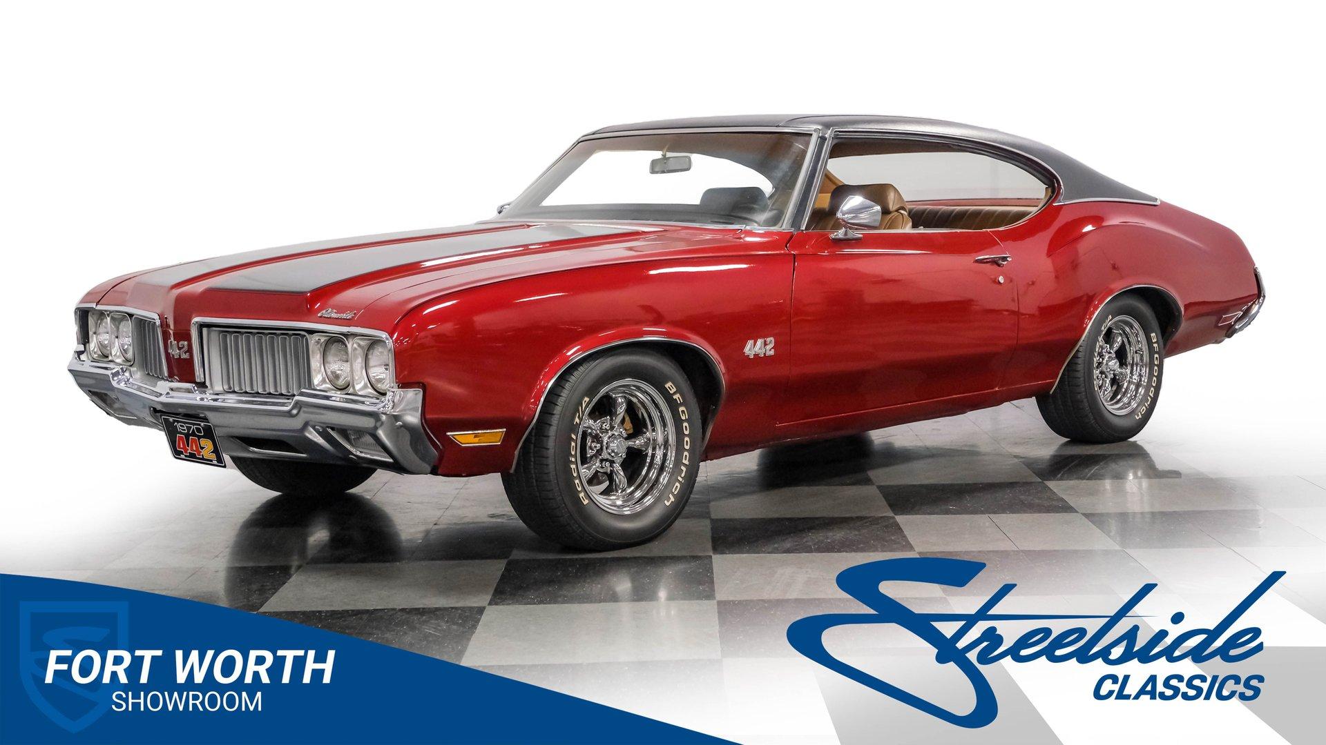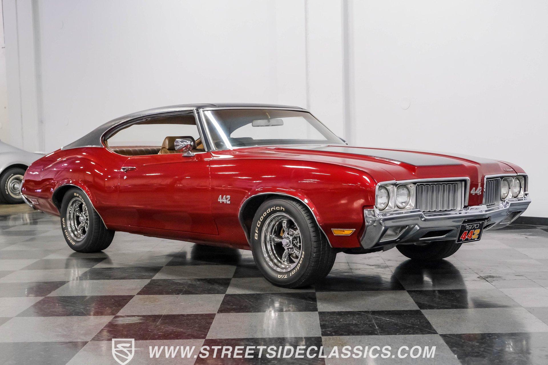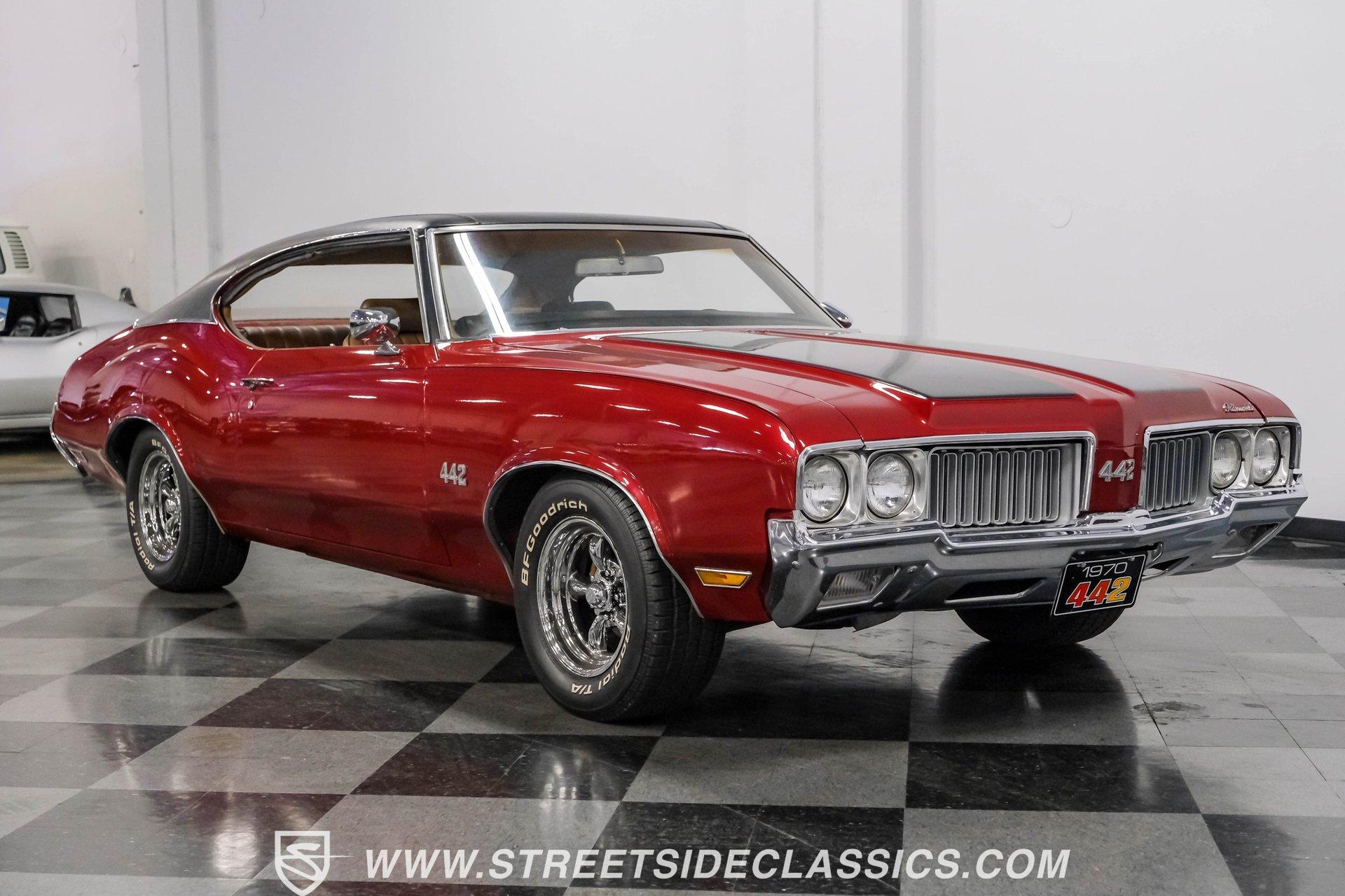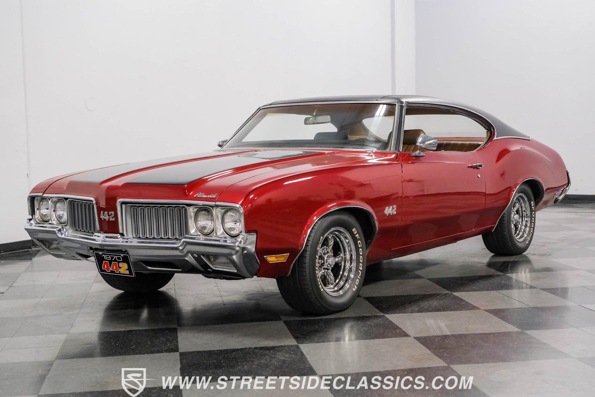 Often considered one of the high points in the muscle car era, and even more so for Oldsmobile, the 442 stands proudly as a flagship car for the Golden Age of high-horsepower vehicles. This particular 1970 Oldsmobile Cutlass 442 has an older repaint in a captivating shade of burgundy, complemented by its matching black hardtop and matching black hood stripes. Thanks to its streamlined Holiday Hardtop design, this awesome Olds look aggressive from any angle. Inside, we find a mostly original stock and correct saddle vinyl interior. A center console separates twin bucket seats, while a trick power-assisted Grant GT wheel sits just ahead of a trio of Rally Pack gauges. At the same time, another triplet of Sunpro auxiliary gauges is mounted under the dashboard, while a Retro Sound AM/FM/AUX head unit with a digital display takes the place of the original unit. Under the hood, we find a custom-built 455 cubic-inch overhead valve V-8 engine. Bored 0.30 over, balanced, and equipped with a mild performance cam, this big block is fed through an ample 750 cfm Edelbrock four-barrel carburetor and air gap intake manifold. Spent gases are expelled through long tube headers before the three-inch exhaust gives way to a set of FlowMaster mufflers, giving this old-school muscle car a growl commensurate with its power. Power is routed through a built TH400 three-speed automatic transmission with a 2500 stall converter before heading out to the 12-bolt rear, which transfers those ponies to the pavement via a set of polished 15-inch American Racing Torq Thrust II wheels shod in 225/60R-15 BFGoodrich rubber. HIGHLIGHTS: Holiday Hardtop Built 455 CID V8, Bored 0.30 Over 750 cfm Edelbrock Carb Air Gap Intake Performance Cam 1000 Miles On Rebuilt Engine Long Tubes Headers w/ H Pipe Three Inch Exhaust w/ FlowMasters Power Front Disc Brakes Polished American Racing Wheels The 1970 Oldsmobile Cutlass 442 is equipped with a suspension system featuring an independent front end and a live axle rear, complemented by coil springs and heavy-duty shocks at all four corners. Power brakes highlighted by a set of front discs stand ready to scrub off speed at a moment's notice. With just 1,000 miles on its newly built engine, this boulevard bruiser has plenty of life left for its new owner to enjoy. But don't wait, call today!