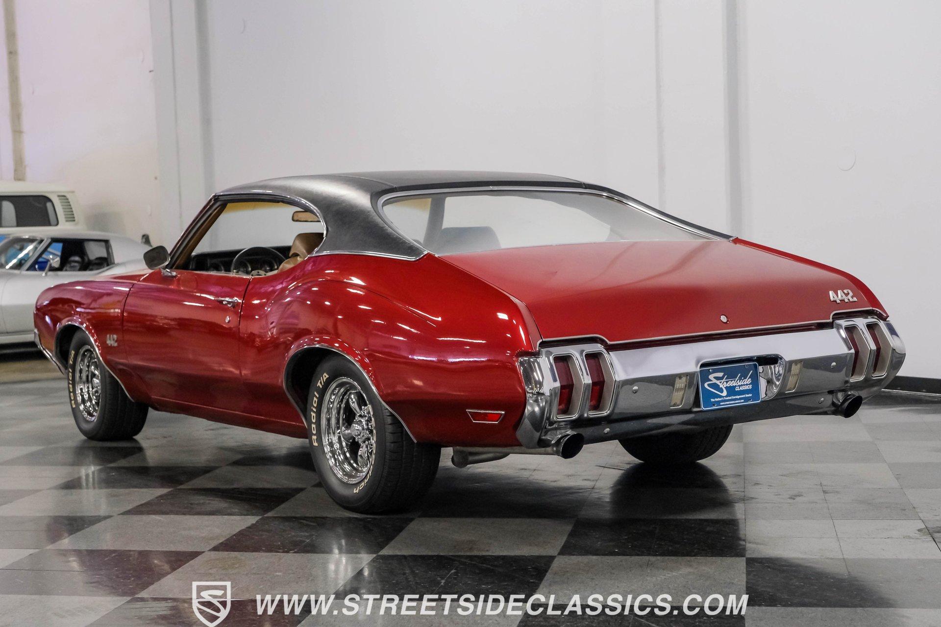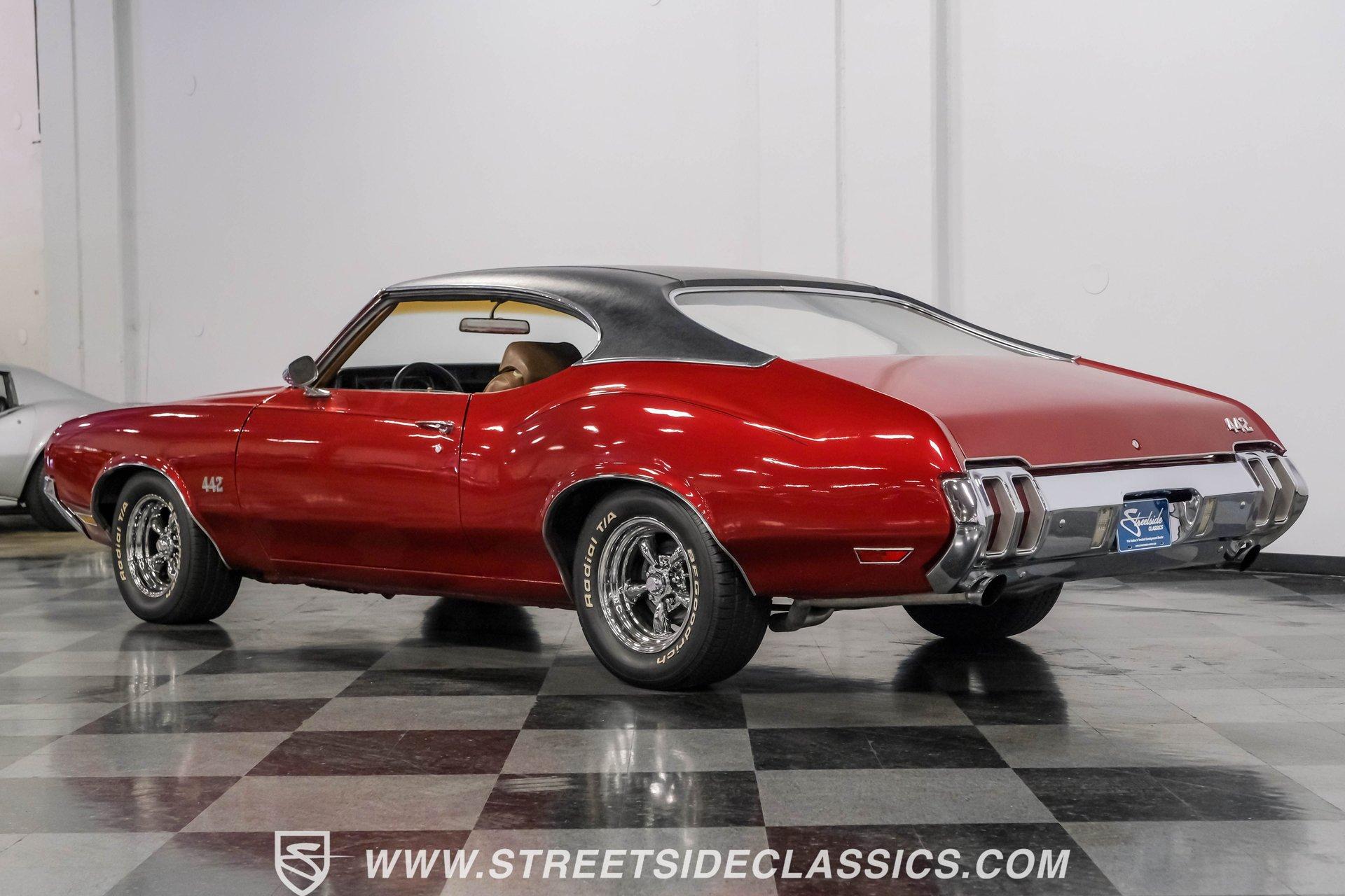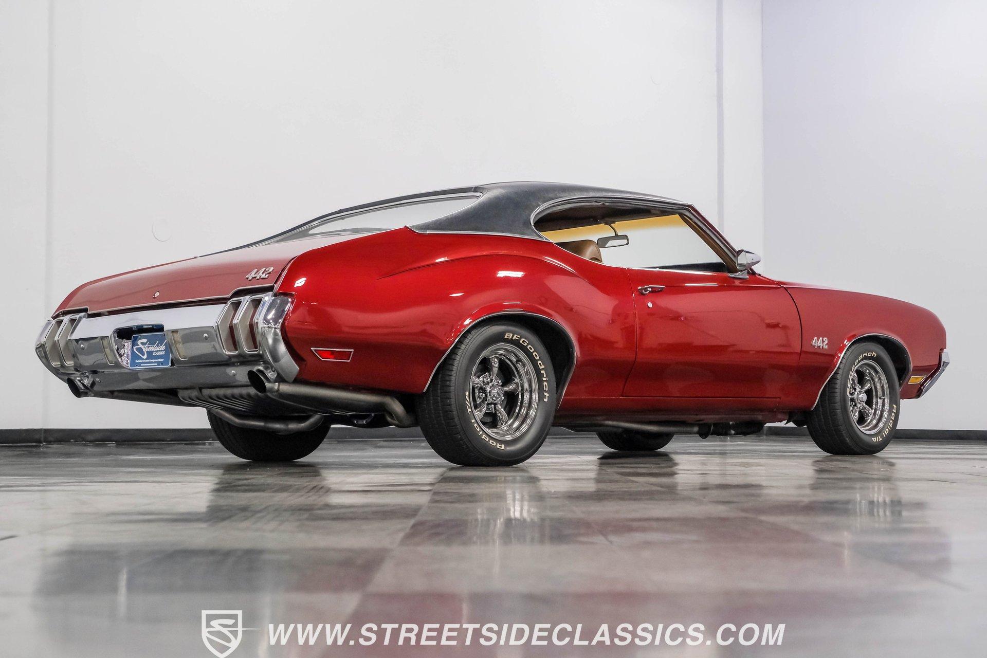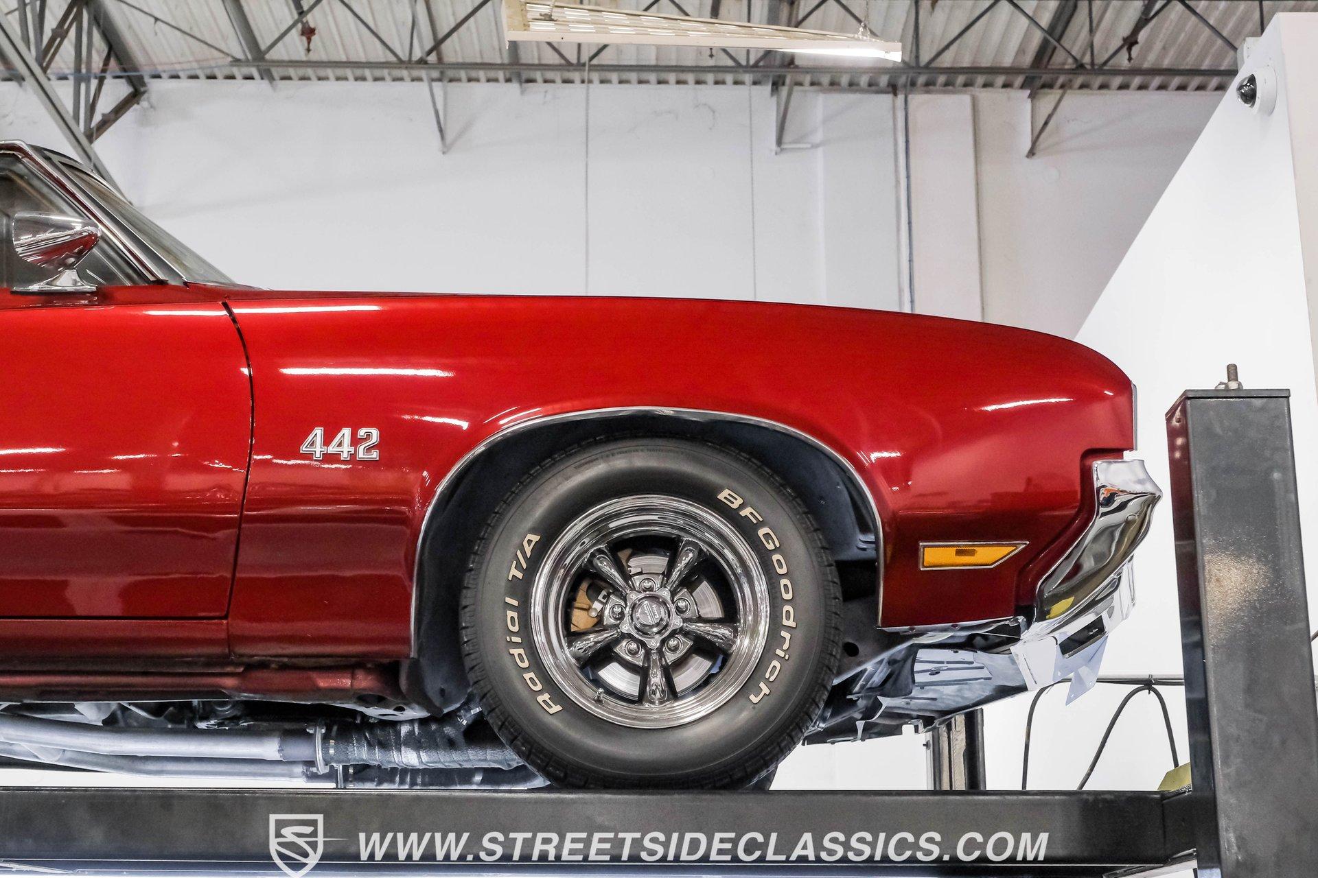 Often considered one of the high points in the muscle car era, and even more so for Oldsmobile, the 442 stands proudly as a flagship car for the Golden Age of high-horsepower vehicles. This particular 1970 Oldsmobile Cutlass 442 has an older repaint in a captivating shade of burgundy, complemented by its matching black hardtop and matching black hood stripes. Thanks to its streamlined Holiday Hardtop design, this awesome Olds look aggressive from any angle. Inside, we find a mostly original stock and correct saddle vinyl interior. A center console separates twin bucket seats, while a trick power-assisted Grant GT wheel sits just ahead of a trio of Rally Pack gauges. At the same time, another triplet of Sunpro auxiliary gauges is mounted under the dashboard, while a Retro Sound AM/FM/AUX head unit with a digital display takes the place of the original unit. Under the hood, we find a custom-built 455 cubic-inch overhead valve V-8 engine. Bored 0.30 over, balanced, and equipped with a mild performance cam, this big block is fed through an ample 750 cfm Edelbrock four-barrel carburetor and air gap intake manifold. Spent gases are expelled through long tube headers before the three-inch exhaust gives way to a set of FlowMaster mufflers, giving this old-school muscle car a growl commensurate with its power. Power is routed through a built TH400 three-speed automatic transmission with a 2500 stall converter before heading out to the 12-bolt rear, which transfers those ponies to the pavement via a set of polished 15-inch American Racing Torq Thrust II wheels shod in 225/60R-15 BFGoodrich rubber. HIGHLIGHTS: Holiday Hardtop Built 455 CID V8, Bored 0.30 Over 750 cfm Edelbrock Carb Air Gap Intake Performance Cam 1000 Miles On Rebuilt Engine Long Tubes Headers w/ H Pipe Three Inch Exhaust w/ FlowMasters Power Front Disc Brakes Polished American Racing Wheels The 1970 Oldsmobile Cutlass 442 is equipped with a suspension system featuring an independent front end and a live axle rear, complemented by coil springs and heavy-duty shocks at all four corners. Power brakes highlighted by a set of front discs stand ready to scrub off speed at a moment's notice. With just 1,000 miles on its newly built engine, this boulevard bruiser has plenty of life left for its new owner to enjoy. But don't wait, call today!