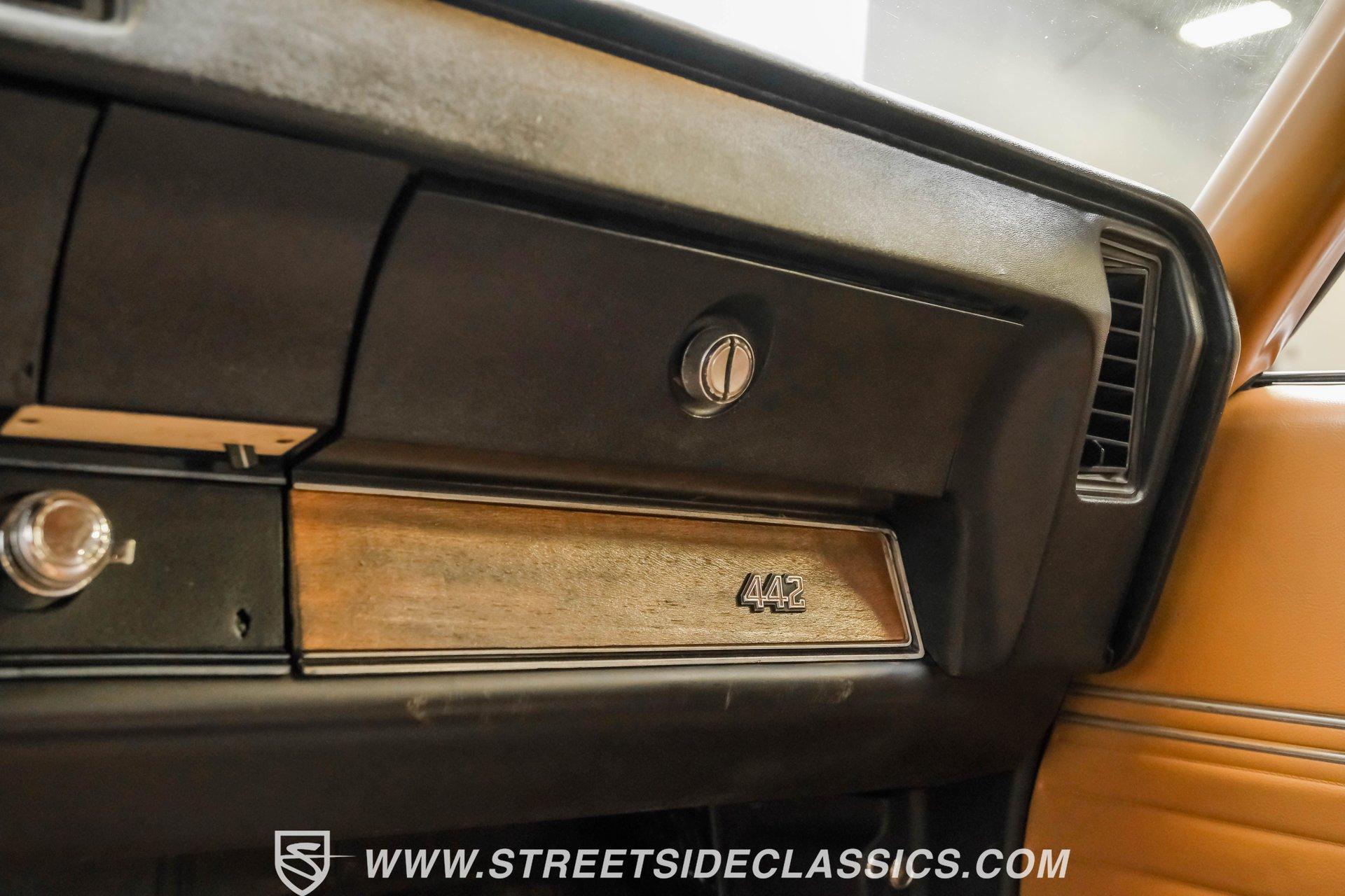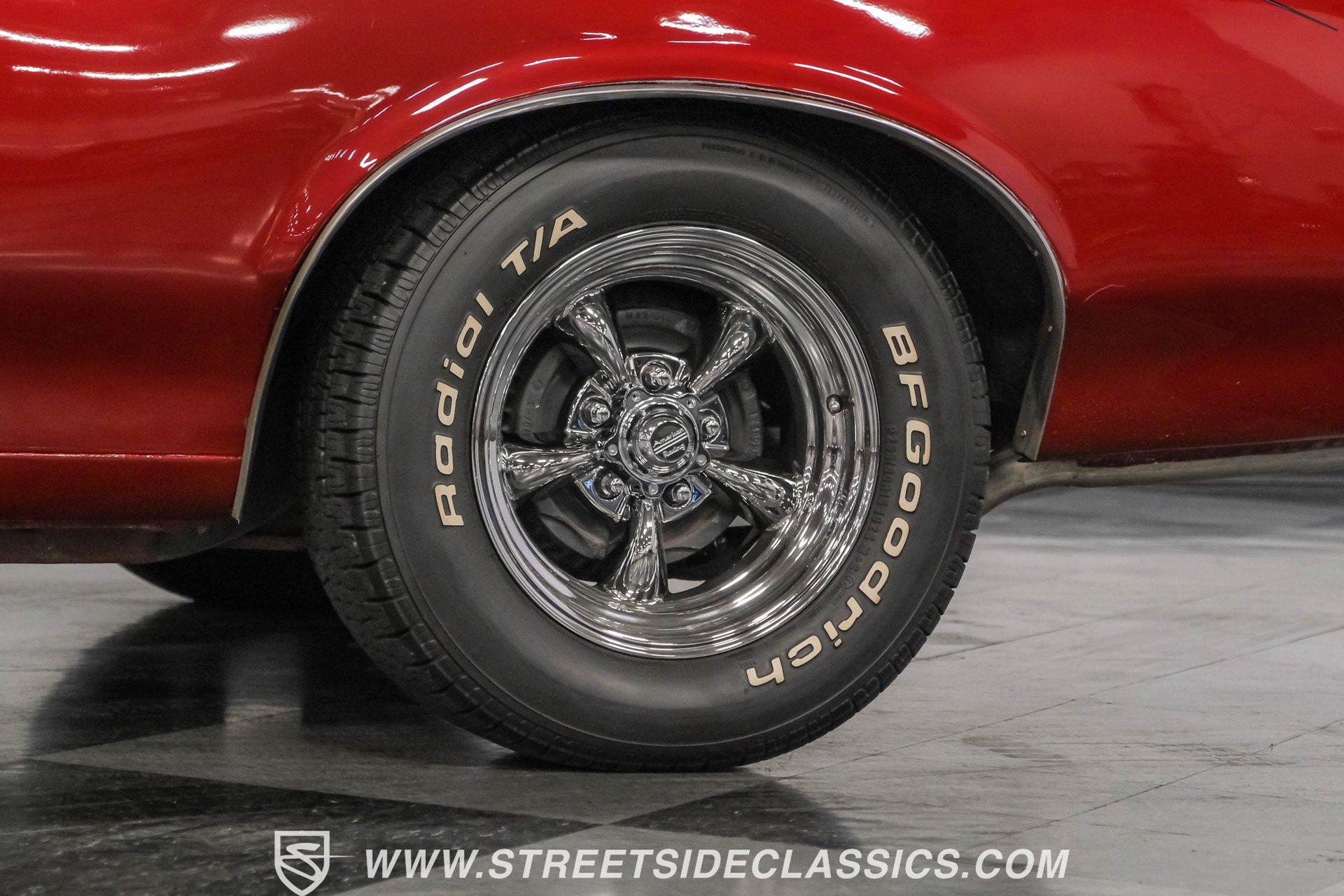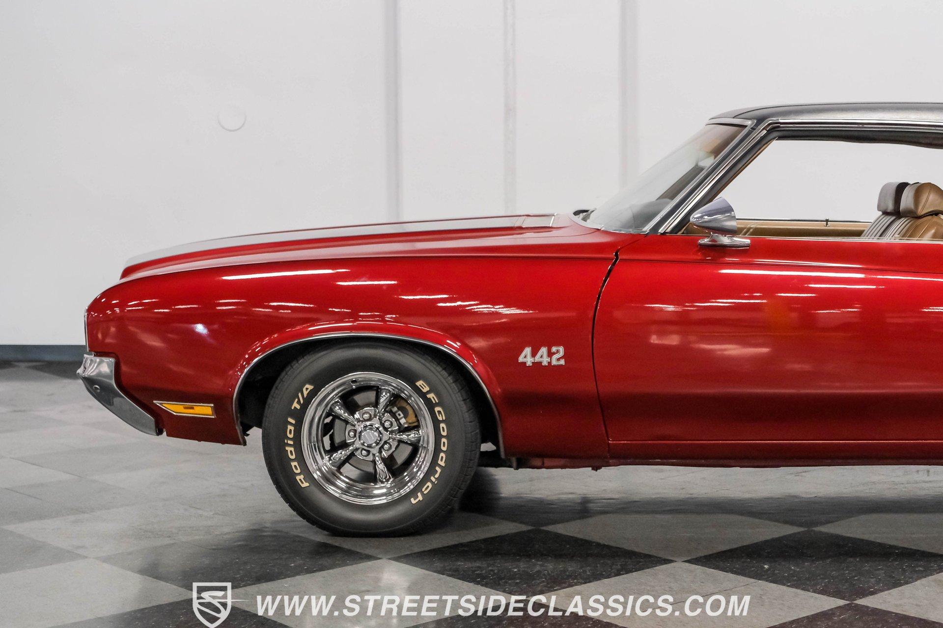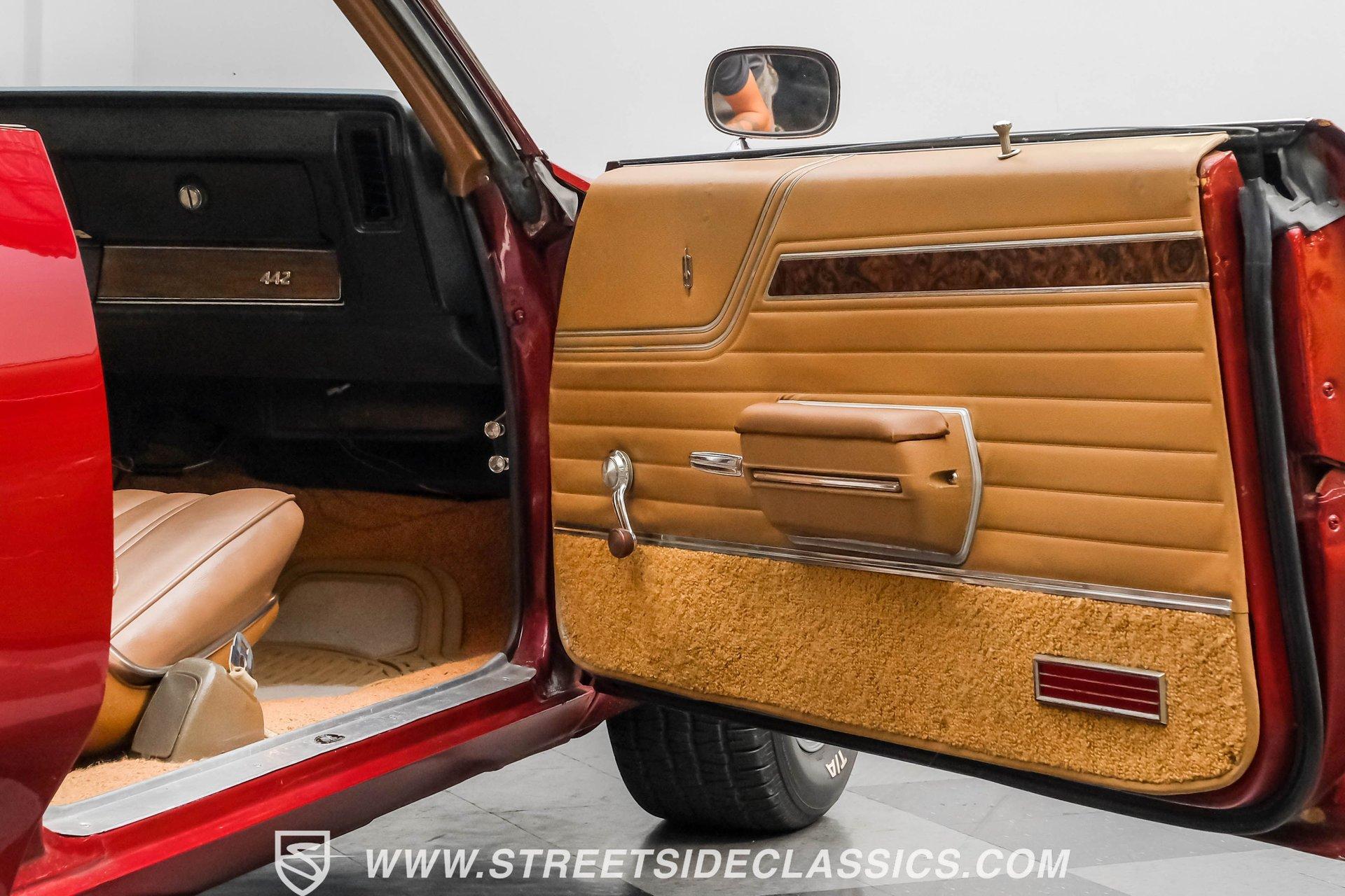 Often considered one of the high points in the muscle car era, and even more so for Oldsmobile, the 442 stands proudly as a flagship car for the Golden Age of high-horsepower vehicles. This particular 1970 Oldsmobile Cutlass 442 has an older repaint in a captivating shade of burgundy, complemented by its matching black hardtop and matching black hood stripes. Thanks to its streamlined Holiday Hardtop design, this awesome Olds look aggressive from any angle. Inside, we find a mostly original stock and correct saddle vinyl interior. A center console separates twin bucket seats, while a trick power-assisted Grant GT wheel sits just ahead of a trio of Rally Pack gauges. At the same time, another triplet of Sunpro auxiliary gauges is mounted under the dashboard, while a Retro Sound AM/FM/AUX head unit with a digital display takes the place of the original unit. Under the hood, we find a custom-built 455 cubic-inch overhead valve V-8 engine. Bored 0.30 over, balanced, and equipped with a mild performance cam, this big block is fed through an ample 750 cfm Edelbrock four-barrel carburetor and air gap intake manifold. Spent gases are expelled through long tube headers before the three-inch exhaust gives way to a set of FlowMaster mufflers, giving this old-school muscle car a growl commensurate with its power. Power is routed through a built TH400 three-speed automatic transmission with a 2500 stall converter before heading out to the 12-bolt rear, which transfers those ponies to the pavement via a set of polished 15-inch American Racing Torq Thrust II wheels shod in 225/60R-15 BFGoodrich rubber. HIGHLIGHTS: Holiday Hardtop Built 455 CID V8, Bored 0.30 Over 750 cfm Edelbrock Carb Air Gap Intake Performance Cam 1000 Miles On Rebuilt Engine Long Tubes Headers w/ H Pipe Three Inch Exhaust w/ FlowMasters Power Front Disc Brakes Polished American Racing Wheels The 1970 Oldsmobile Cutlass 442 is equipped with a suspension system featuring an independent front end and a live axle rear, complemented by coil springs and heavy-duty shocks at all four corners. Power brakes highlighted by a set of front discs stand ready to scrub off speed at a moment's notice. With just 1,000 miles on its newly built engine, this boulevard bruiser has plenty of life left for its new owner to enjoy. But don't wait, call today!