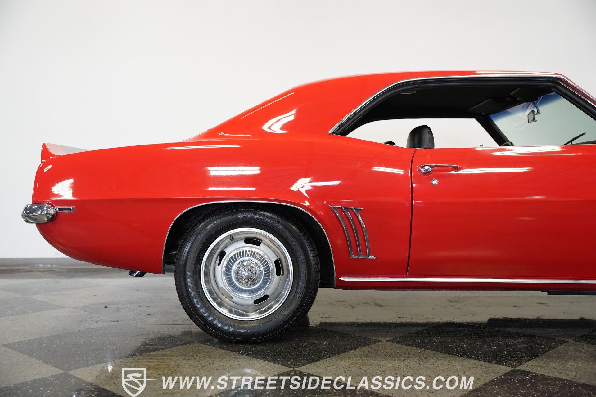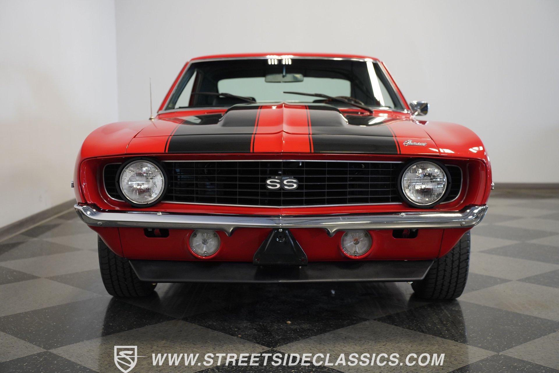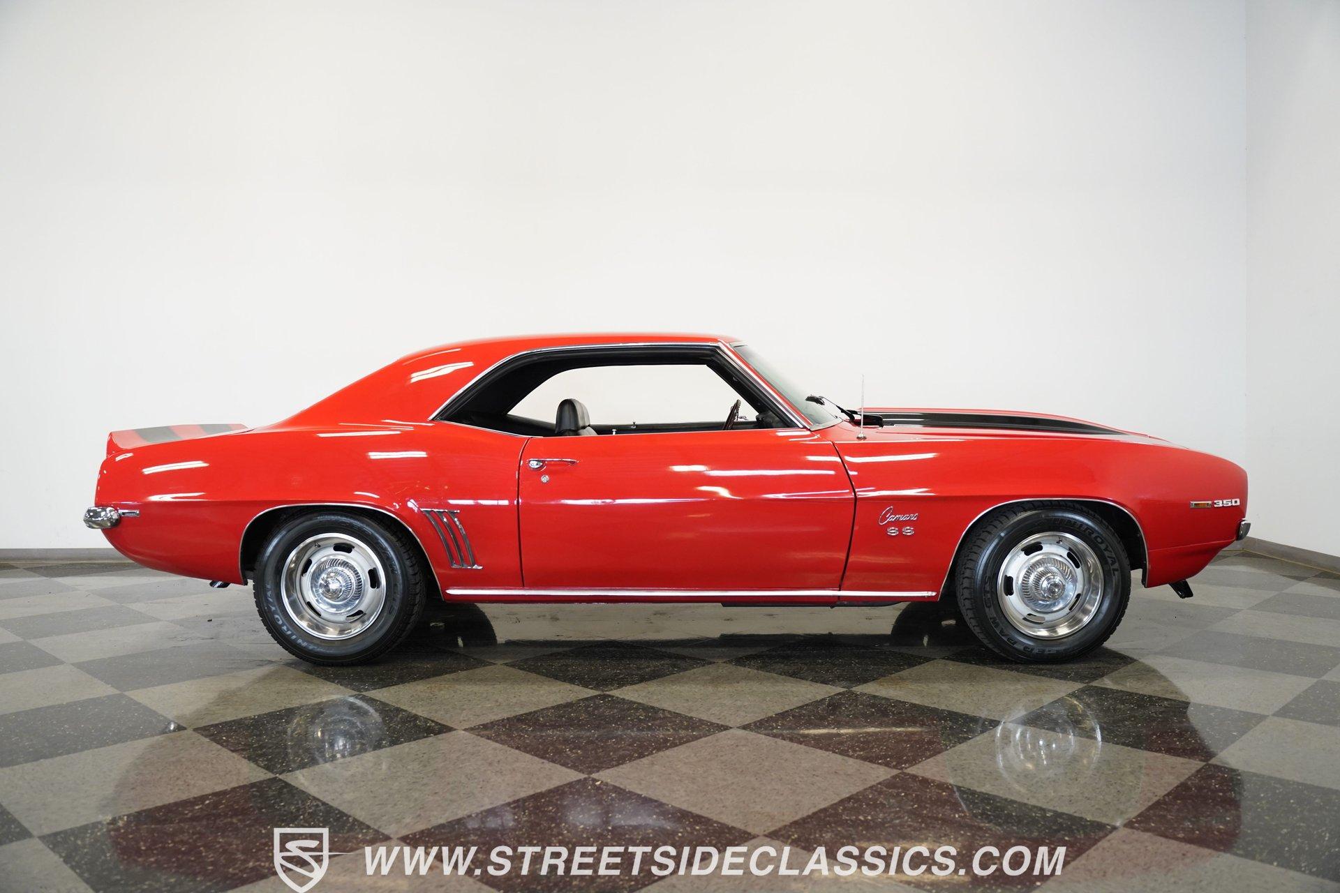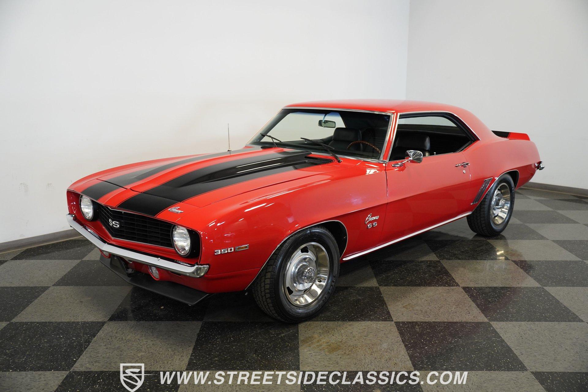 If you've ever wanted to own the classic car of your dreams, here's your chance. This 1969 Chevrolet Camaro SS 350 Tribute has all the attributes of a true SS and is priced to sell. The red paint with black painted stripes looks fantastic. All of the badges, trim, and stance look correct. The Chevy Rally wheels, cowl induction hood, sharp front grille, chin spoiler, and rear spoiler make it almost impossible to tell this is a tribute car. With the interior looking much the same, if you don't tell anyone, no one will ever know it's not a numbers-matching SS 350 The interior is black with vinyl high-back front bucket seats and a rear bench seat. They are in great condition, as are the door panels, carpet, and headliner. The dashboard retains its original look, featuring easy-to-read aftermarket gauges along with an additional set of gauges in the center console: Oil Temp, Trans Temp, Water Temp, and Voltage. The dash pad is in very good shape, as is the center console, which houses the sought-after staple shifter. For audio entertainment, there is a stock-appearing AM/FM/Cassette radio with a CD player mounted under the glove box. Heavy-duty floor mats protect the carpet, while the door sills, door jambs, and weather stripping all look good. Under the hood, the engine bay is well put together with chrome Edelbrock valve covers and an air cleaner cover. A black painted firewall and fenders frame the 350 cubic-inch V8 engine, equipped with an Edelbrock carburetor and intake. Power is delivered through a TH350 3-speed automatic transmission to a 10-bolt solid rear axle. The front suspension is an independent setup with control arms and coil springs, while the rear uses leaf springs and air shocks. The 15-inch Rally wheels with beauty rings and center caps are wrapped in Uniroyal 215/65R15 front tires and 235/60R15 rear tires. For stopping power, front and rear drum brakes handle the duties, while long-tube headers, dual exhaust, and Flowmaster mufflers make this Camaro sound like a true muscle car. HIghlights: 350 Cubic-Inch V8 Engine Edelbrock Carburetor Edelbrock Intake TH350 3-Speed Automatic Transmission 10-Bolt Solid Axle Rear End Front Independent Suspension With Control Arms And Coil Springs Rear Leaf Springs With Air Shocks 15-inch Rally Wheels With Beauty Rings And Center Caps Uniroyal 215/65R15 Front Tires And 235/60R15 Rear Tires Tube Headers, Dual Exhaust, Flowmaster Mufflers Power Steering Heat/Defrost AM/FM/Cassette Radio With CD Changer Center Console With Staple Shifter Aftermarket Gauges In Dash Aftermarket Gauges In Center Console: Oil Temp, Trans Temp, Water Temp, And Voltage This car is solid, clean, and an accurate rendition of what a true SS 350 would look like. Everyone wants to own a numbers-matching classic, but that's not always possible. This 1969 Chevrolet Camaro SS 350 Tribute is an awesome way to make your dream come true. Call Today!