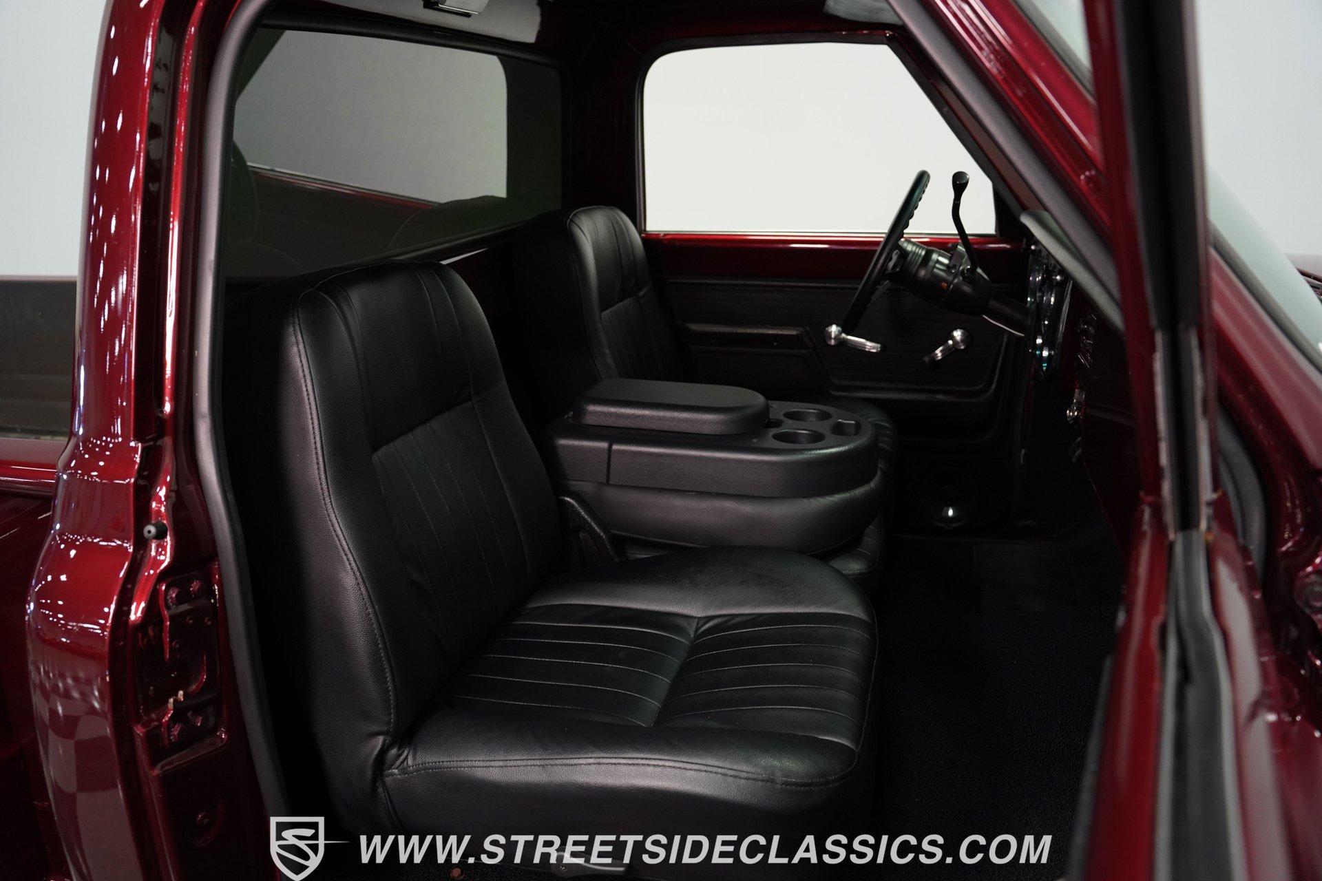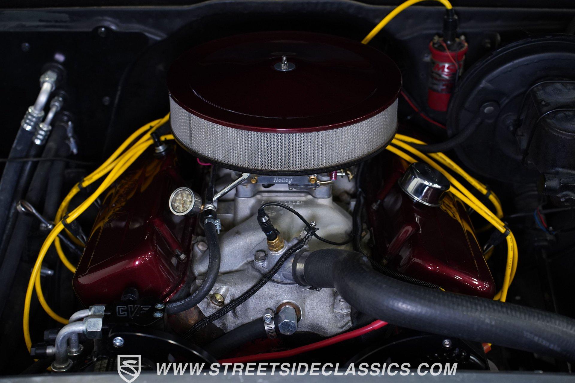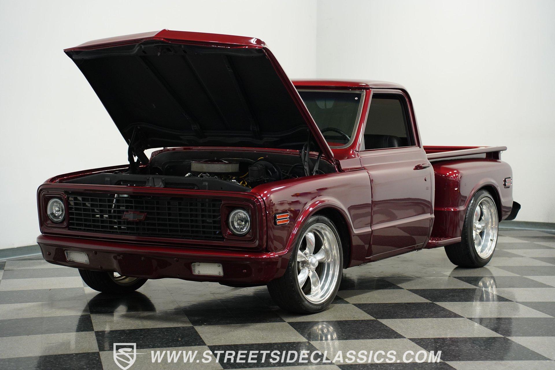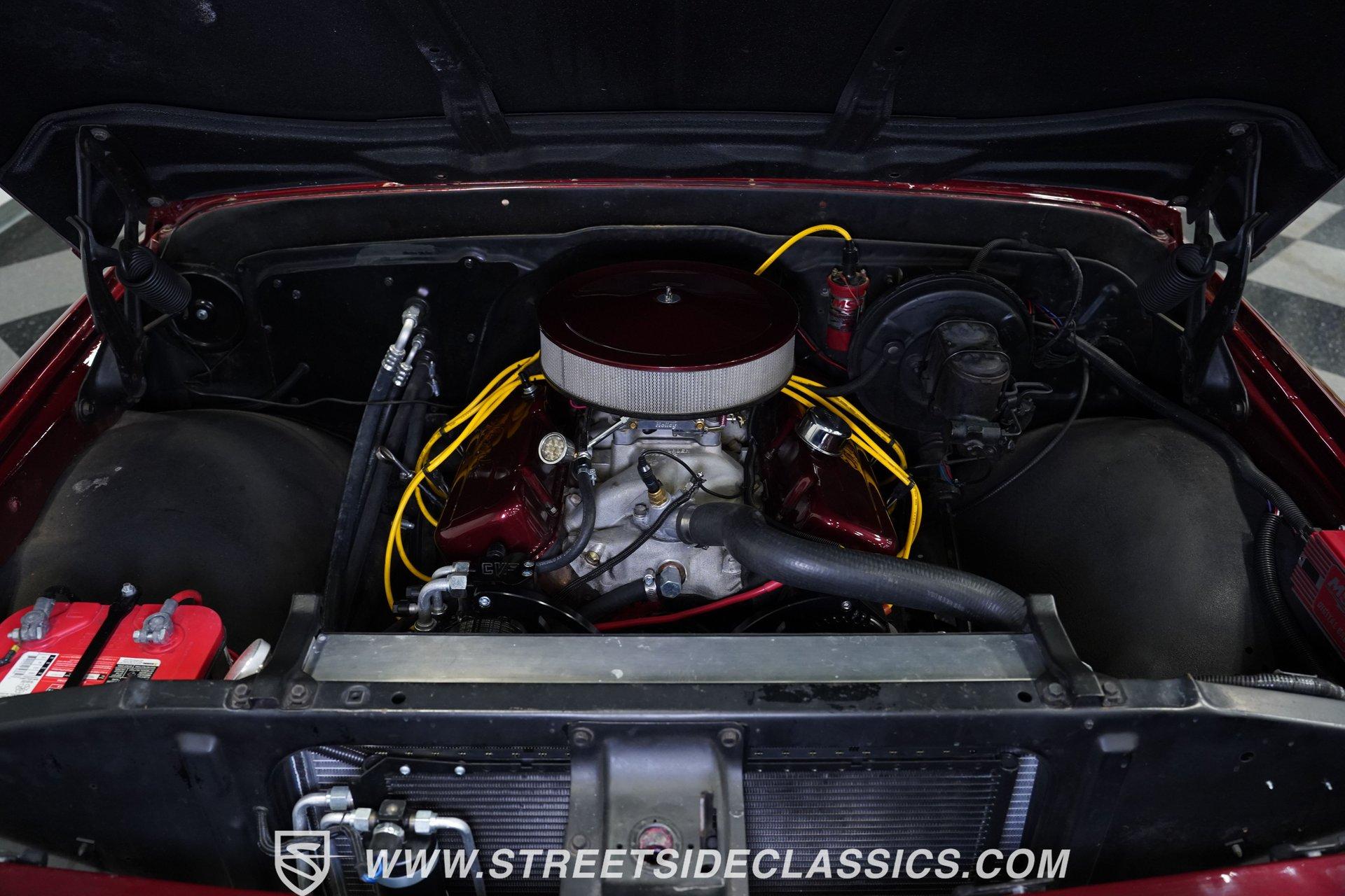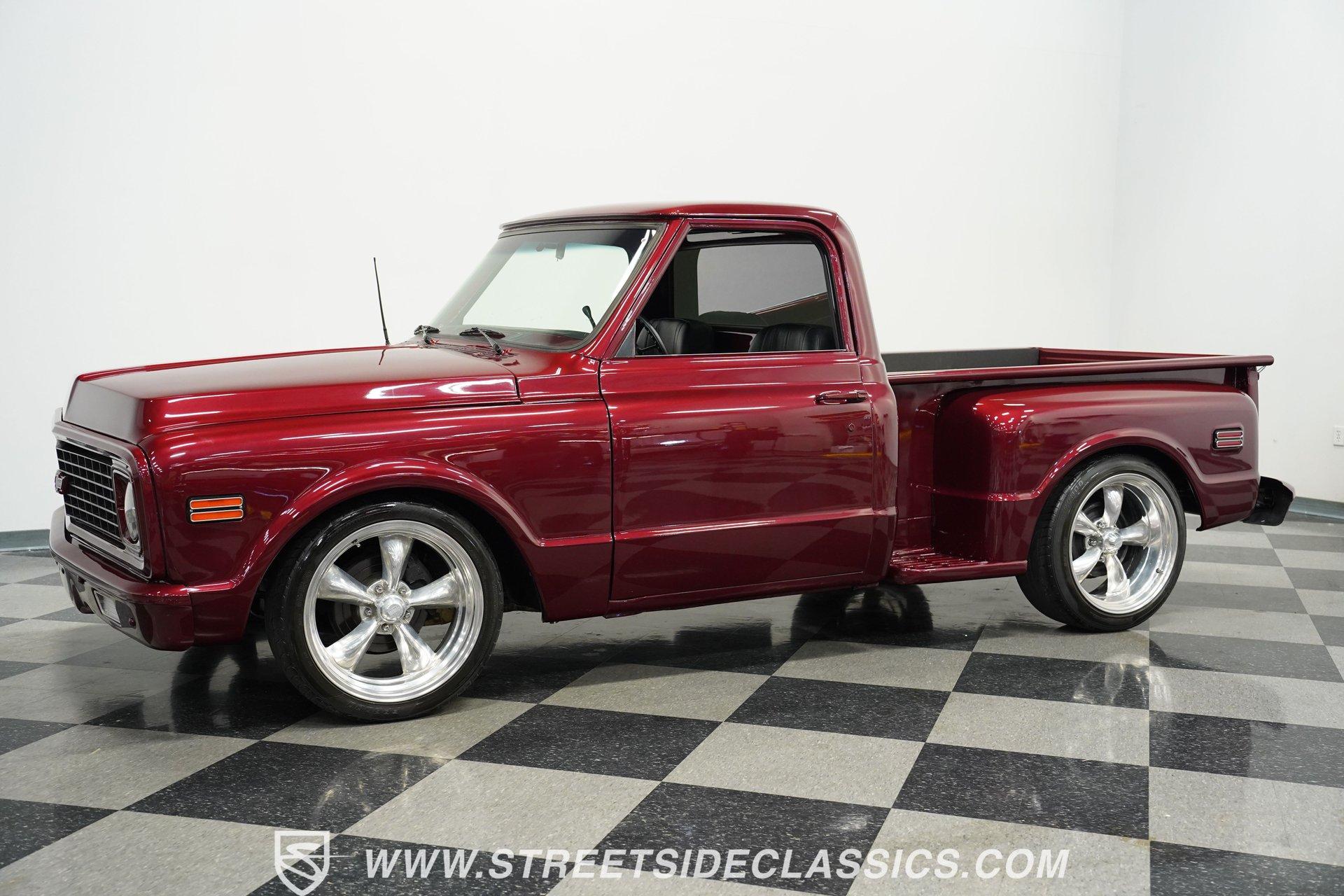 To say that this 1972 Chevrolet C10 Stepside was merely "restored" would be doing it a disservice. It was treated to a complete frame-off build, leaving it with a level of curb appeal that would be pretty hard to match. All the right aesthetic boxes were checked during the process. It boasts an outstanding maroon paint job with a shine that seems to be coming from way beneath the surface. Its color-matched bumpers and door handles combine with deleted chrome from front to back to maximize this Chevy's aggressive appearance. And take a look at that stance! Lowered and leveled, but still leaving enough ground clearance to make for worry-free driving in everyday conditions. This is one very sharp vintage pickup. Inside the doors, you'll find an essentially brand-new interior that features a pair of black vinyl-clad bucket seats sitting astride a center console that blends in perfectly while offering cupholders as well as some welcome interior storage space. The carpet below has a very fresh appearance that indicates it was installed not long ago. An aftermarket tilt column is now in place, putting the steering wheel in just the right position, and the upgraded gauge cluster looks very sharp and complements the painted maroon dash area that surrounds it. The bed area in the back has received its share of attention as well and is lined with wood planks that are in great shape. This classic Stepside is a blast to drive. It features a super-strong 396 cubic-inch V8 that's fed by a Holley Double Pumper carburetor, and its abundant power becomes obvious with just a tap on the accelerator. The engine sits in a very clean engine bay, dressed up with a CVF Front Runner serpentine pulley system, and crowned by an aluminum manifold, and it exhales into a pair of long tube headers that lead out to Flowmaster mufflers for a great, aggressive exhaust tone. Power steering makes this standout truck easy to navigate, while power brakes that include discs up front give it all the fade-resistant stopping ability it needs. HIGHLIGHTS 396 CUBIC-INCH V8 ENGINE NEW CVF FRONT RUNNER SERPENTINE PULLEY SYSTEM ELECTRIC FANS TO KEEP THINGS COOL UNDER THE HOOD ALUMINUM RADIATOR, ALTERNATOR, AND POWER STEERING PUMP 4-BARREL HOLLEY DOUBLE PUMPER CARBURETOR 3-SPEED AUTOMATIC TH350 TRANSMISSION POWER BRAKES, WITH DISCS UP FRONT POWER STEERING DUAL EXHAUST FEATURES FLOWMASTER MUFFLERS LONG TUBE HEADERS 20" AMERICAN RACING TORQ THRUST WHEELS STANDOUT MAROON EXTERIOR BLACK VINYL UPHOLSTERY, FEATURING BUCKET SEATS DAKOTA DIGITAL GAUGES AFTERMARKET TILT COLUMN AND STEERING WHEEL KENWOOD AM/FM STEREO WITH BLUETOOTH CONNECTIVITY AIR CONDITIONING Wielding outstanding power and configured to stand out in any crowd, this skillfully built 1972 Chevrolet C10 Stepside rolls on a set of 20" American Racing Torq Thrust wheels wrapped in beefy 245 series tires that add the perfect finishing touch to its tastefully aggressive look. Call today!