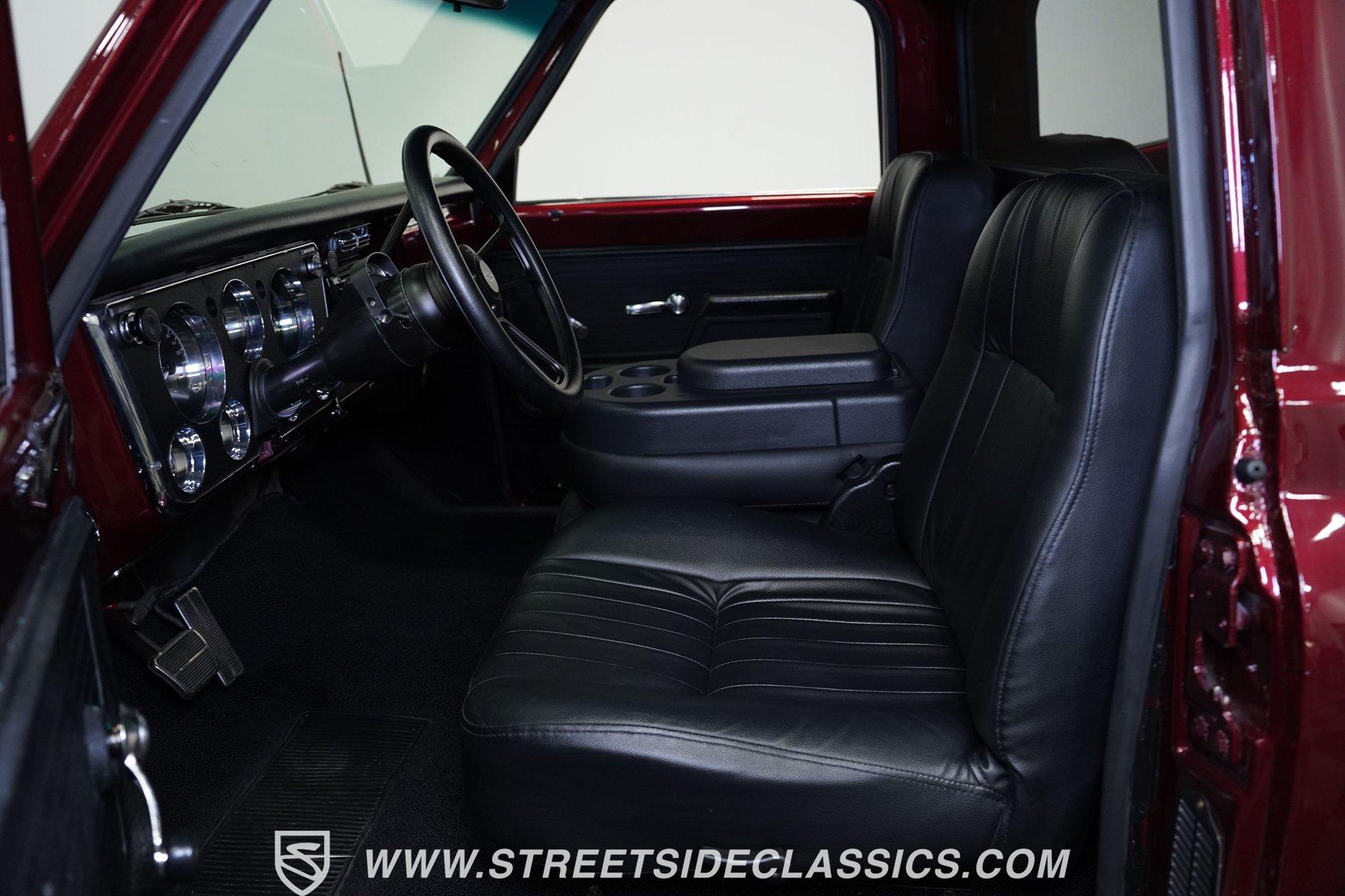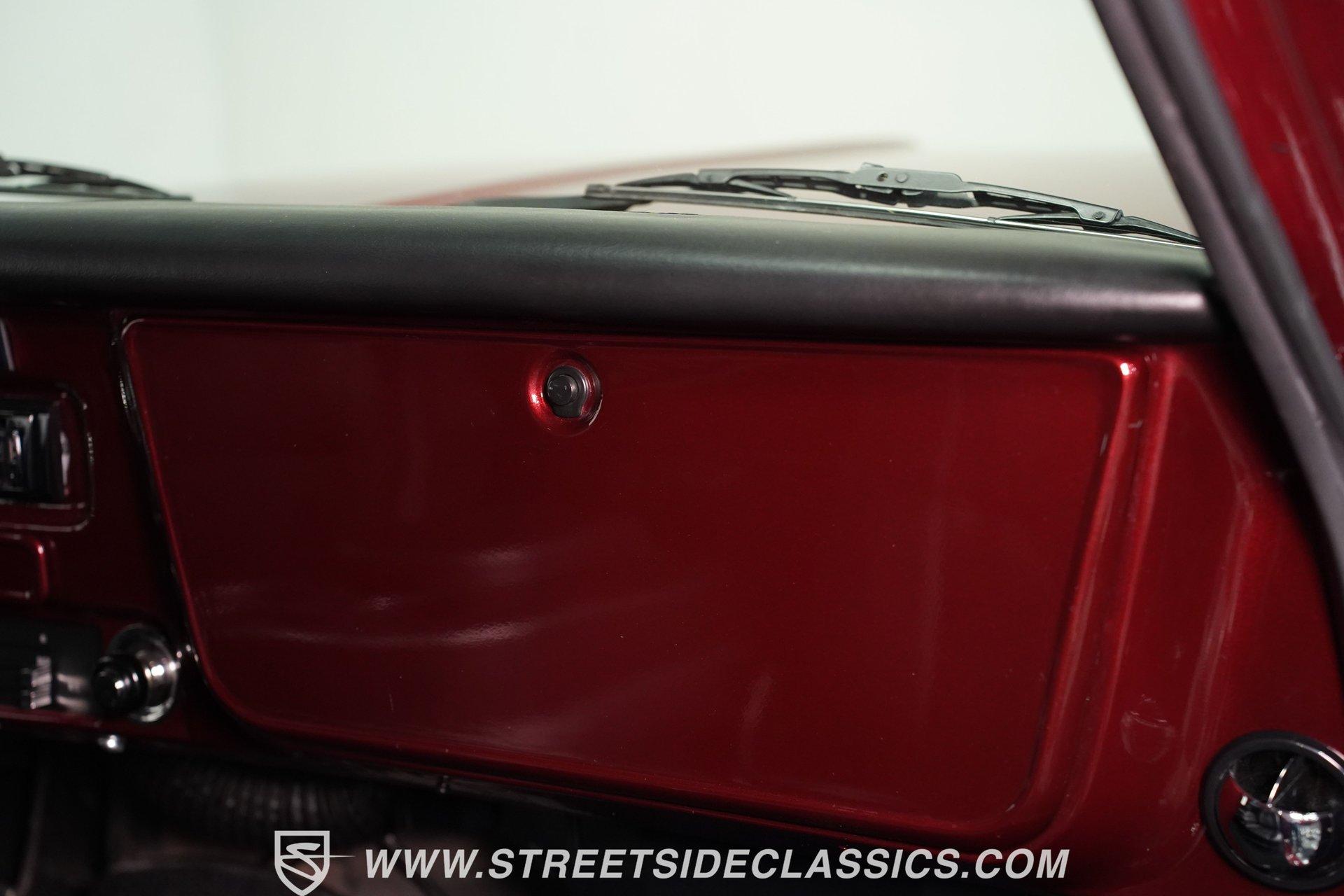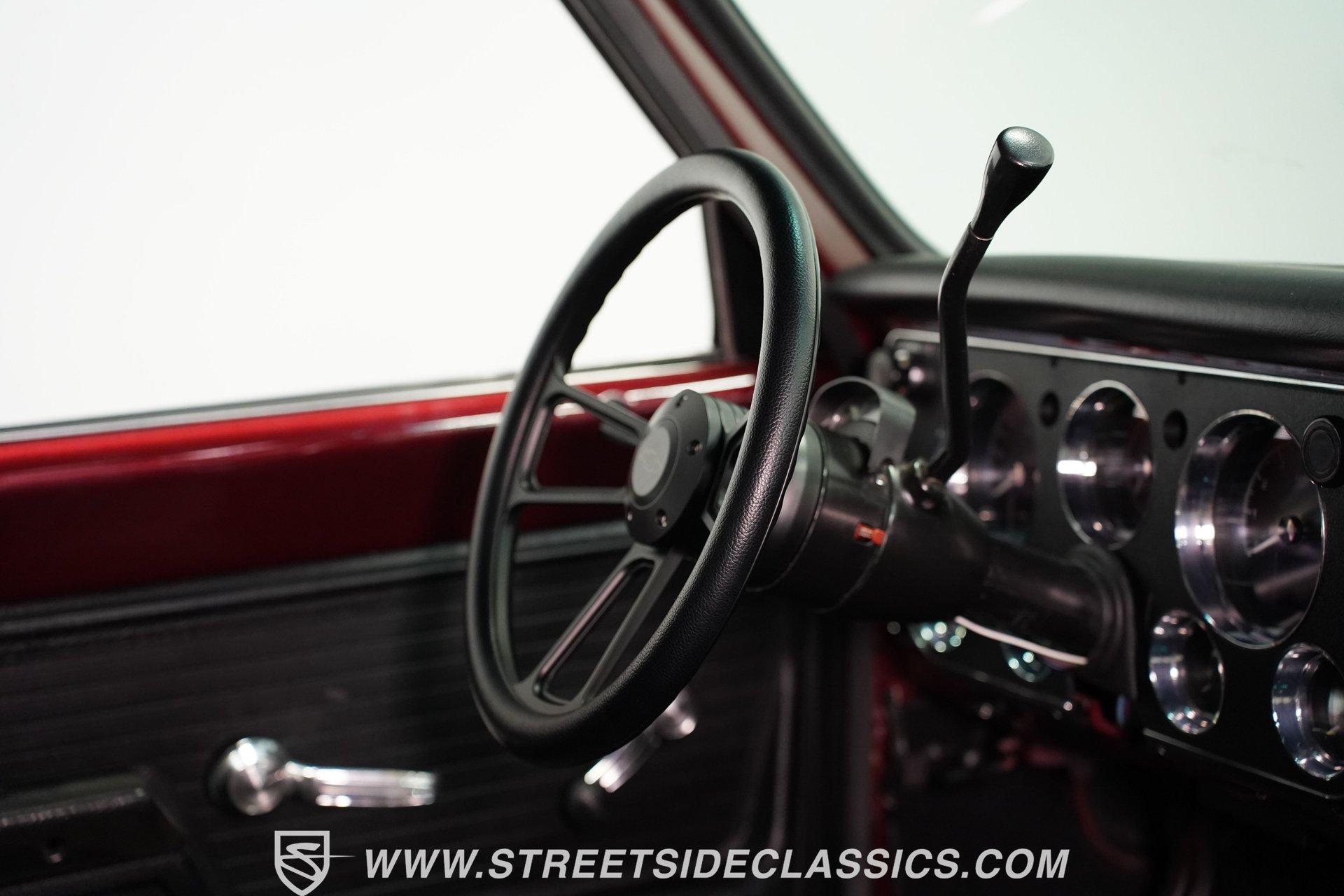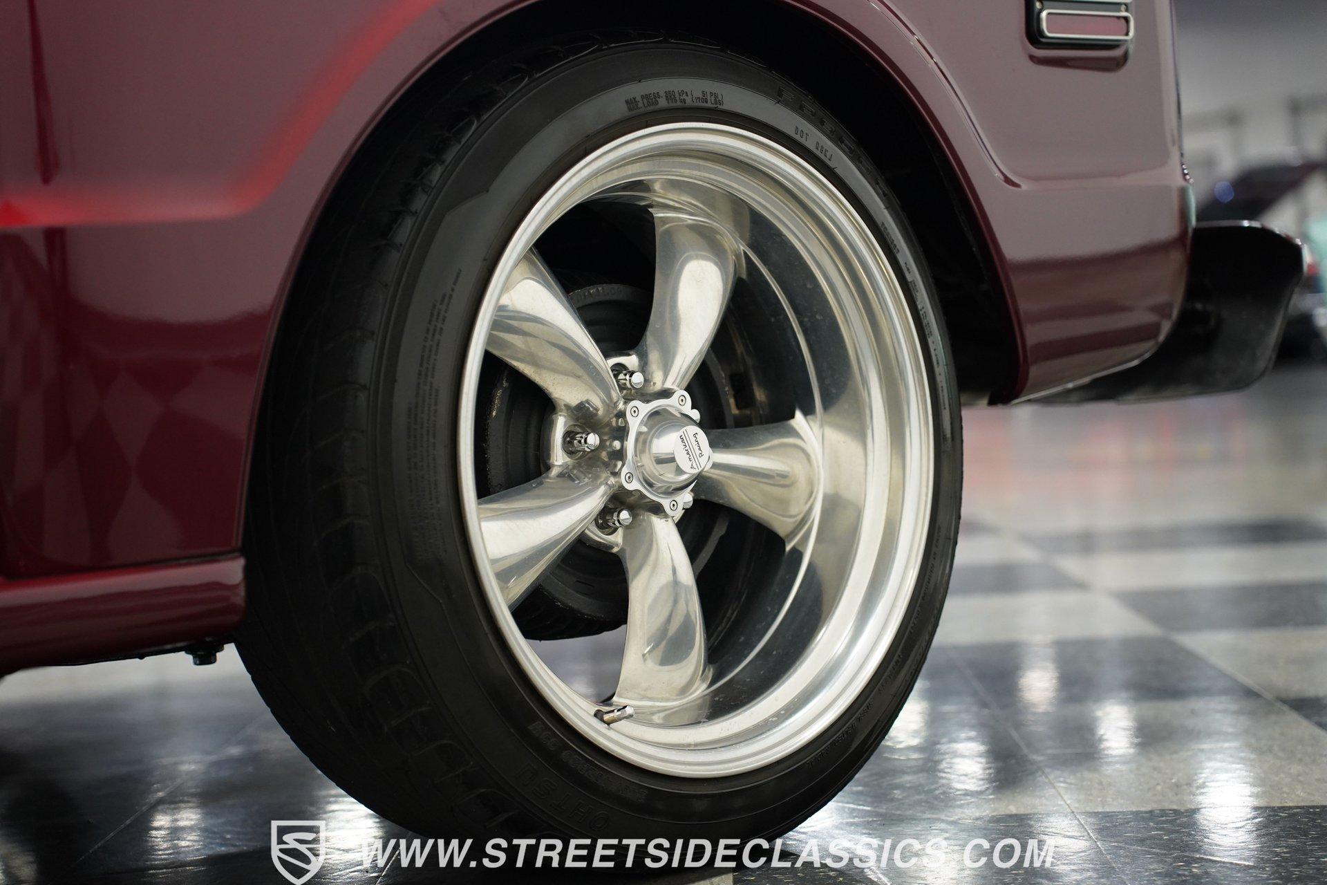 To say that this 1972 Chevrolet C10 Stepside was merely "restored" would be doing it a disservice. It was treated to a complete frame-off build, leaving it with a level of curb appeal that would be pretty hard to match. All the right aesthetic boxes were checked during the process. It boasts an outstanding maroon paint job with a shine that seems to be coming from way beneath the surface. Its color-matched bumpers and door handles combine with deleted chrome from front to back to maximize this Chevy's aggressive appearance. And take a look at that stance! Lowered and leveled, but still leaving enough ground clearance to make for worry-free driving in everyday conditions. This is one very sharp vintage pickup. Inside the doors, you'll find an essentially brand-new interior that features a pair of black vinyl-clad bucket seats sitting astride a center console that blends in perfectly while offering cupholders as well as some welcome interior storage space. The carpet below has a very fresh appearance that indicates it was installed not long ago. An aftermarket tilt column is now in place, putting the steering wheel in just the right position, and the upgraded gauge cluster looks very sharp and complements the painted maroon dash area that surrounds it. The bed area in the back has received its share of attention as well and is lined with wood planks that are in great shape. This classic Stepside is a blast to drive. It features a super-strong 396 cubic-inch V8 that's fed by a Holley Double Pumper carburetor, and its abundant power becomes obvious with just a tap on the accelerator. The engine sits in a very clean engine bay, dressed up with a CVF Front Runner serpentine pulley system, and crowned by an aluminum manifold, and it exhales into a pair of long tube headers that lead out to Flowmaster mufflers for a great, aggressive exhaust tone. Power steering makes this standout truck easy to navigate, while power brakes that include discs up front give it all the fade-resistant stopping ability it needs. HIGHLIGHTS 396 CUBIC-INCH V8 ENGINE NEW CVF FRONT RUNNER SERPENTINE PULLEY SYSTEM ELECTRIC FANS TO KEEP THINGS COOL UNDER THE HOOD ALUMINUM RADIATOR, ALTERNATOR, AND POWER STEERING PUMP 4-BARREL HOLLEY DOUBLE PUMPER CARBURETOR 3-SPEED AUTOMATIC TH350 TRANSMISSION POWER BRAKES, WITH DISCS UP FRONT POWER STEERING DUAL EXHAUST FEATURES FLOWMASTER MUFFLERS LONG TUBE HEADERS 20" AMERICAN RACING TORQ THRUST WHEELS STANDOUT MAROON EXTERIOR BLACK VINYL UPHOLSTERY, FEATURING BUCKET SEATS DAKOTA DIGITAL GAUGES AFTERMARKET TILT COLUMN AND STEERING WHEEL KENWOOD AM/FM STEREO WITH BLUETOOTH CONNECTIVITY AIR CONDITIONING Wielding outstanding power and configured to stand out in any crowd, this skillfully built 1972 Chevrolet C10 Stepside rolls on a set of 20" American Racing Torq Thrust wheels wrapped in beefy 245 series tires that add the perfect finishing touch to its tastefully aggressive look. Call today!