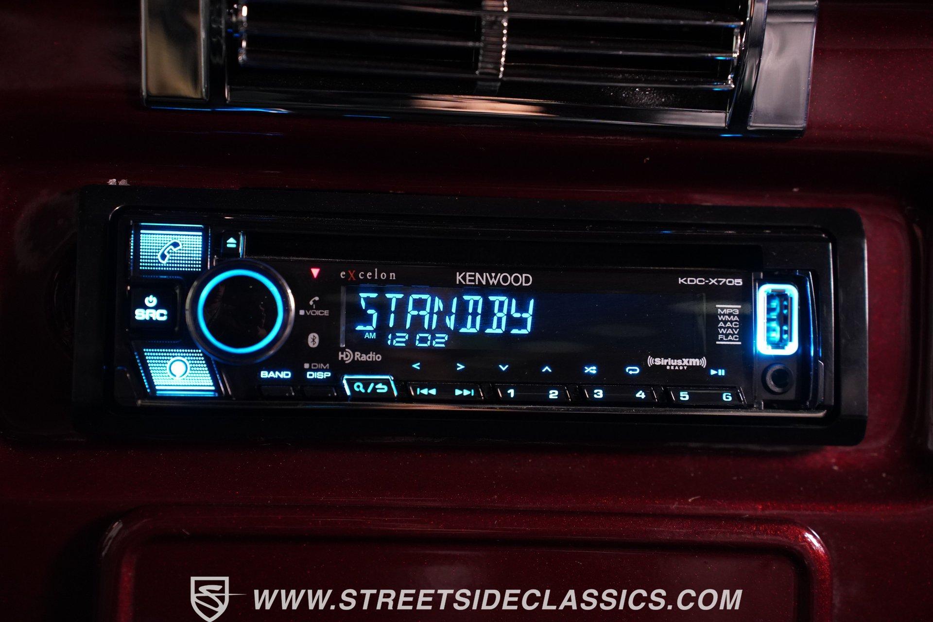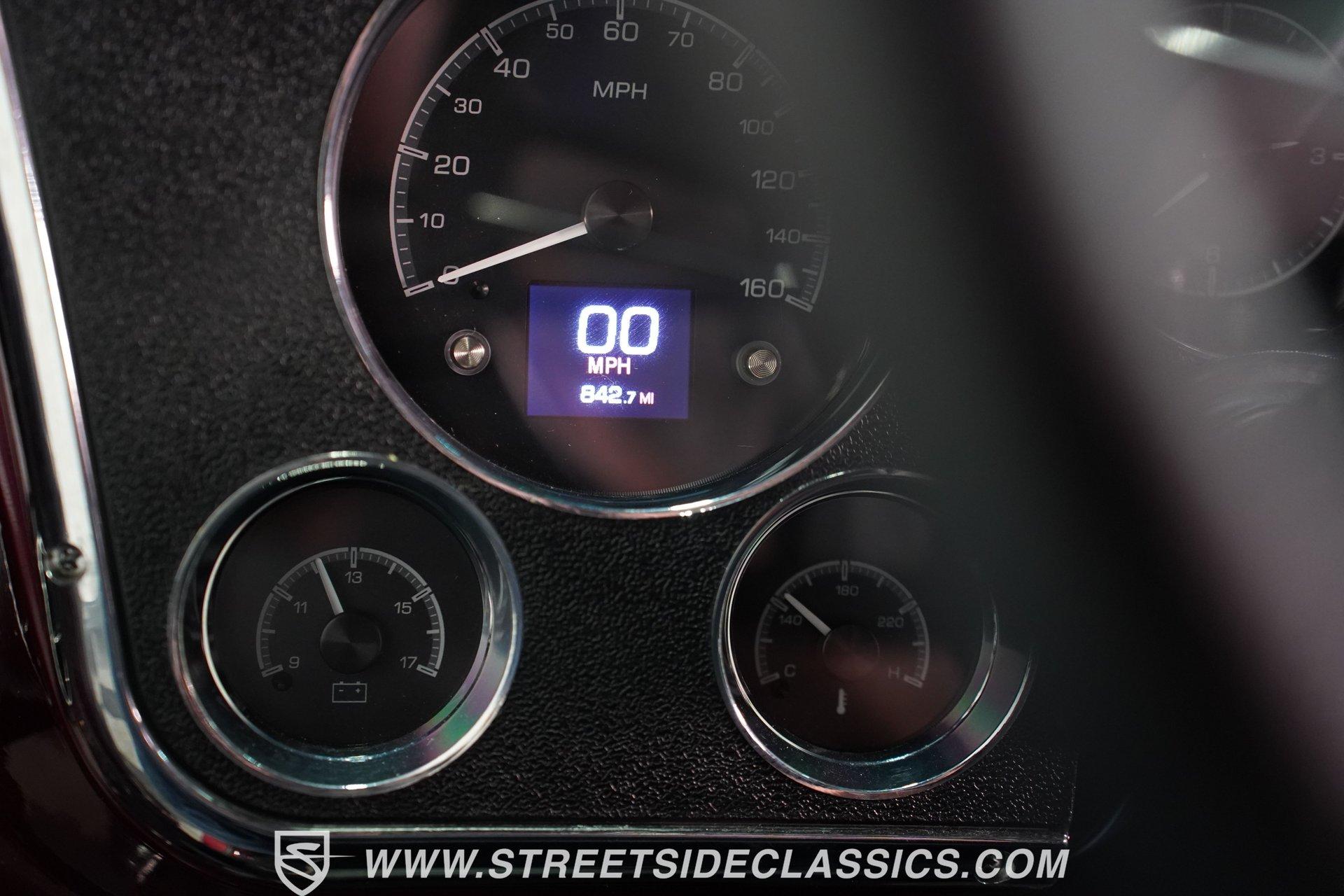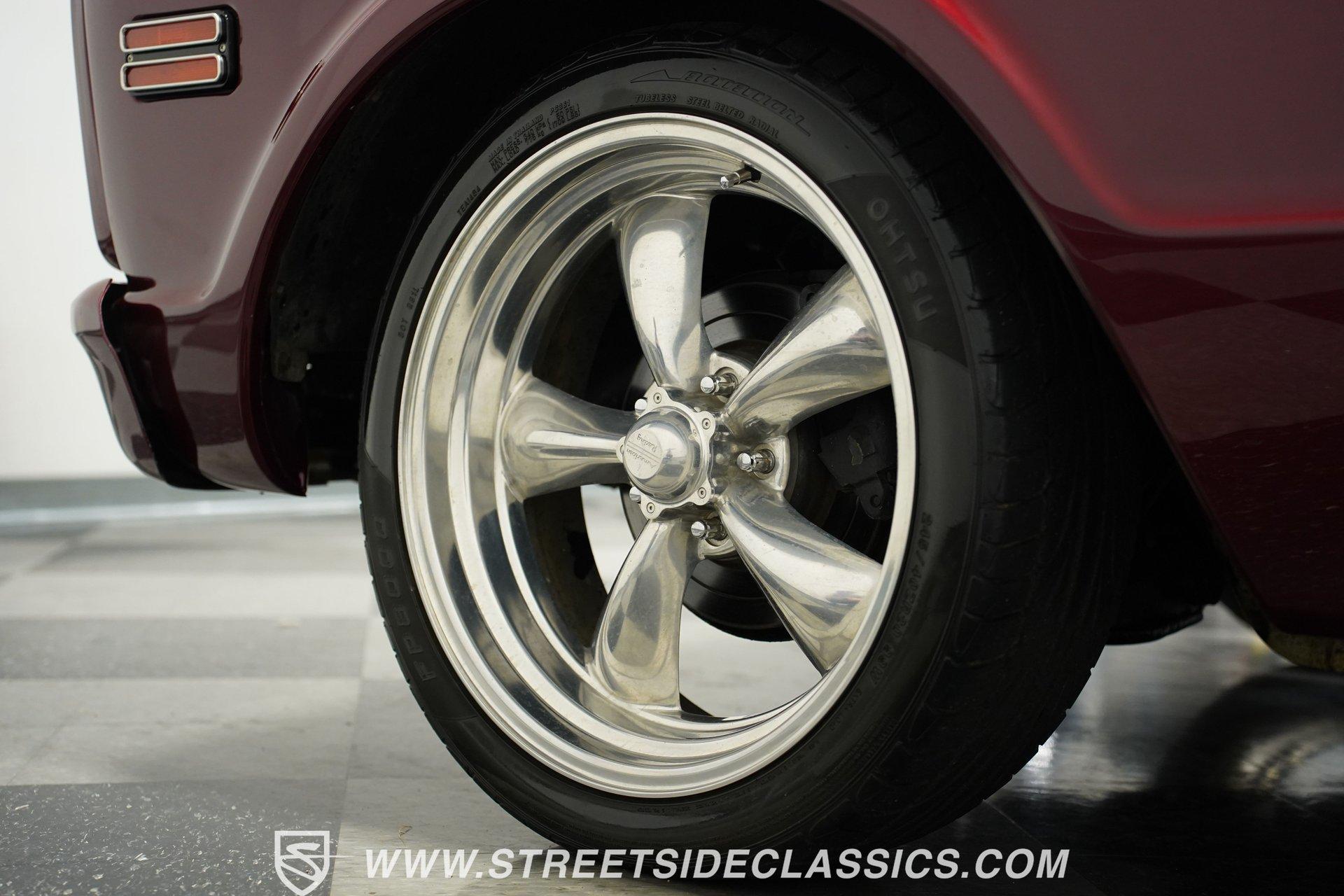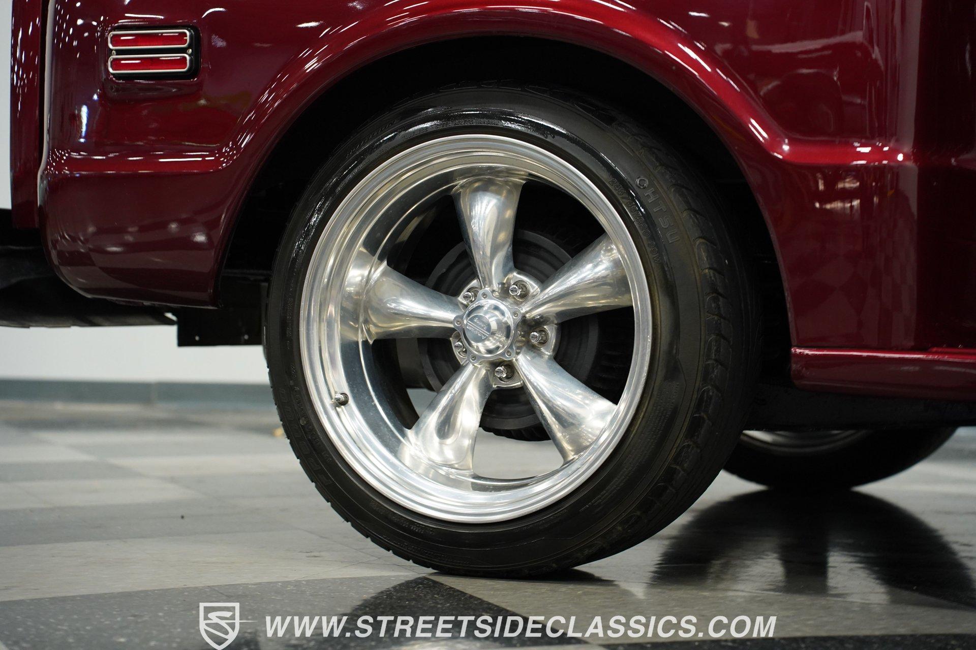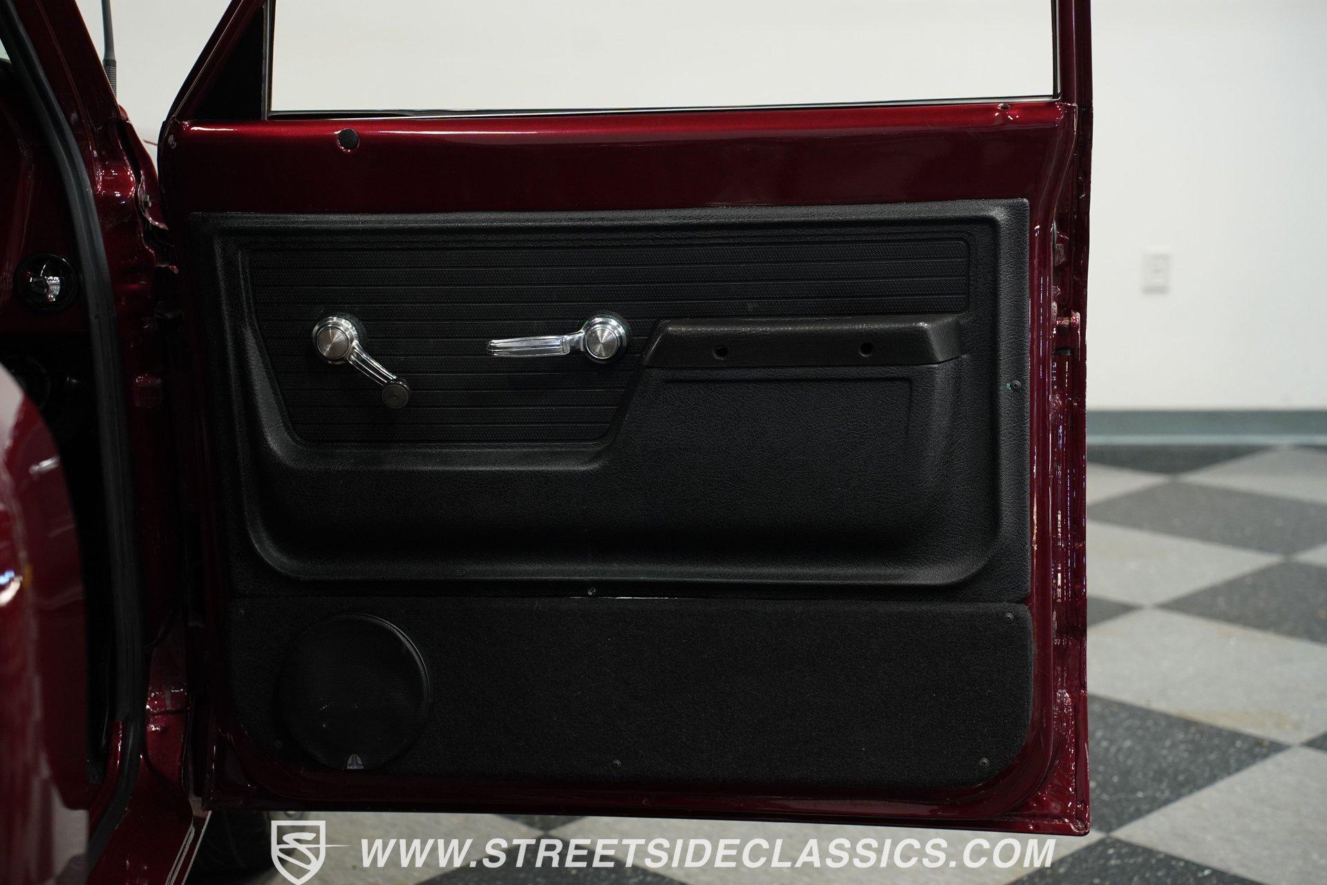 To say that this 1972 Chevrolet C10 Stepside was merely "restored" would be doing it a disservice. It was treated to a complete frame-off build, leaving it with a level of curb appeal that would be pretty hard to match. All the right aesthetic boxes were checked during the process. It boasts an outstanding maroon paint job with a shine that seems to be coming from way beneath the surface. Its color-matched bumpers and door handles combine with deleted chrome from front to back to maximize this Chevy's aggressive appearance. And take a look at that stance! Lowered and leveled, but still leaving enough ground clearance to make for worry-free driving in everyday conditions. This is one very sharp vintage pickup. Inside the doors, you'll find an essentially brand-new interior that features a pair of black vinyl-clad bucket seats sitting astride a center console that blends in perfectly while offering cupholders as well as some welcome interior storage space. The carpet below has a very fresh appearance that indicates it was installed not long ago. An aftermarket tilt column is now in place, putting the steering wheel in just the right position, and the upgraded gauge cluster looks very sharp and complements the painted maroon dash area that surrounds it. The bed area in the back has received its share of attention as well and is lined with wood planks that are in great shape. This classic Stepside is a blast to drive. It features a super-strong 396 cubic-inch V8 that's fed by a Holley Double Pumper carburetor, and its abundant power becomes obvious with just a tap on the accelerator. The engine sits in a very clean engine bay, dressed up with a CVF Front Runner serpentine pulley system, and crowned by an aluminum manifold, and it exhales into a pair of long tube headers that lead out to Flowmaster mufflers for a great, aggressive exhaust tone. Power steering makes this standout truck easy to navigate, while power brakes that include discs up front give it all the fade-resistant stopping ability it needs. HIGHLIGHTS 396 CUBIC-INCH V8 ENGINE NEW CVF FRONT RUNNER SERPENTINE PULLEY SYSTEM ELECTRIC FANS TO KEEP THINGS COOL UNDER THE HOOD ALUMINUM RADIATOR, ALTERNATOR, AND POWER STEERING PUMP 4-BARREL HOLLEY DOUBLE PUMPER CARBURETOR 3-SPEED AUTOMATIC TH350 TRANSMISSION POWER BRAKES, WITH DISCS UP FRONT POWER STEERING DUAL EXHAUST FEATURES FLOWMASTER MUFFLERS LONG TUBE HEADERS 20" AMERICAN RACING TORQ THRUST WHEELS STANDOUT MAROON EXTERIOR BLACK VINYL UPHOLSTERY, FEATURING BUCKET SEATS DAKOTA DIGITAL GAUGES AFTERMARKET TILT COLUMN AND STEERING WHEEL KENWOOD AM/FM STEREO WITH BLUETOOTH CONNECTIVITY AIR CONDITIONING Wielding outstanding power and configured to stand out in any crowd, this skillfully built 1972 Chevrolet C10 Stepside rolls on a set of 20" American Racing Torq Thrust wheels wrapped in beefy 245 series tires that add the perfect finishing touch to its tastefully aggressive look. Call today!
