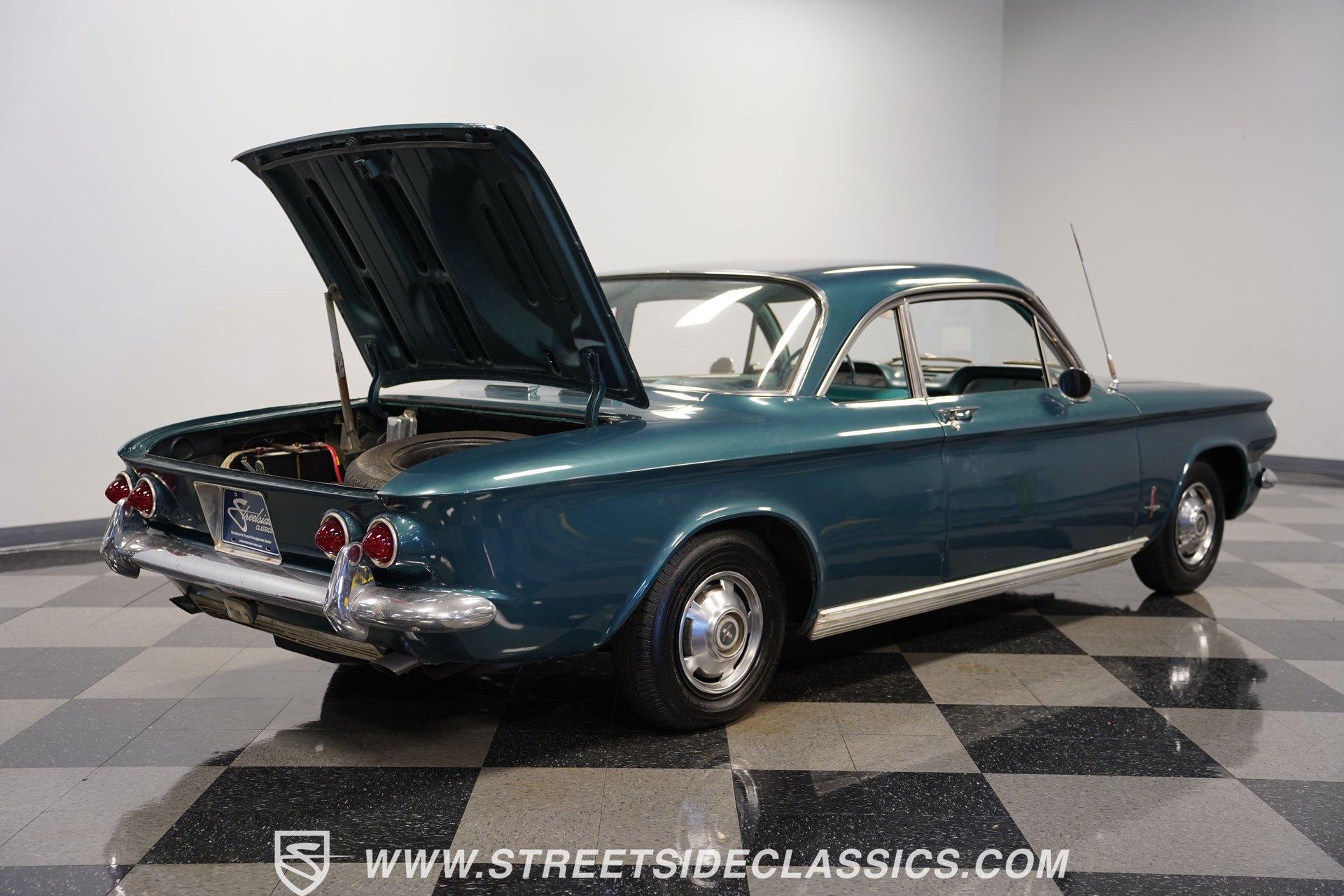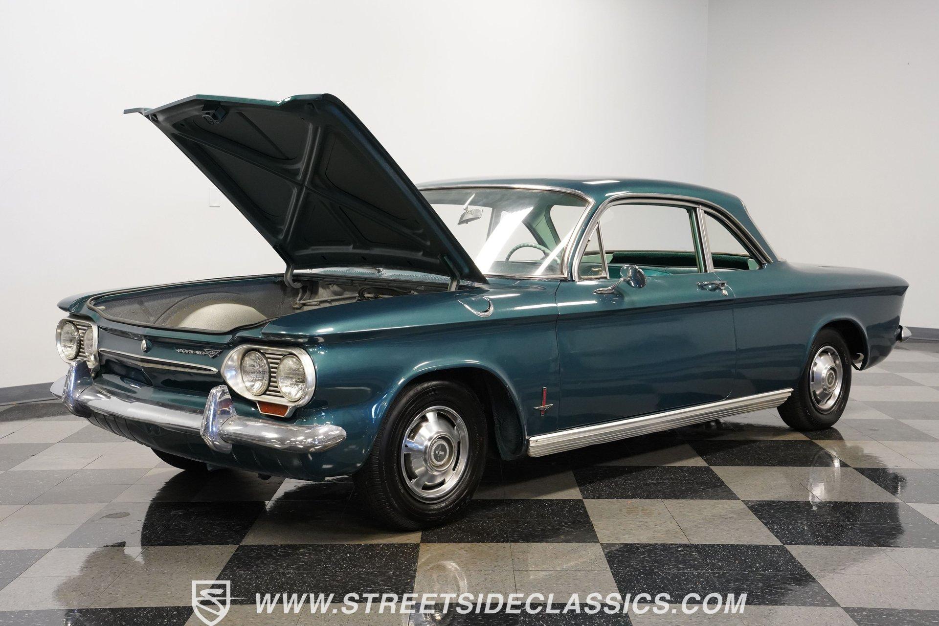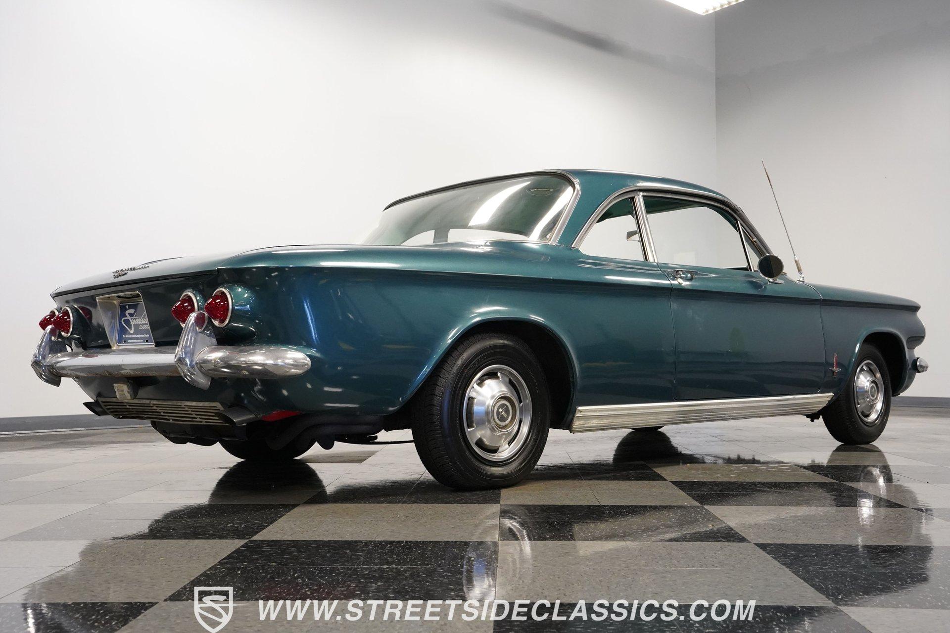 Here is a car you don't see every day, and one that doesn't get much attention or recognition in the antique classic car world. Nonetheless, this 1963 Chevrolet Corvair Monza still gets its share of looks for the obvious reason-it doesn't look like a modern car. The Aqua Green paint has its own uniqueness and character, while the steel body and chrome bumpers reflect a time when plastic and fiberglass were not the main sources of vehicle body structure. Although it may not be the main spectacle at car shows or cruises, it's still a fun and different car to drive. The Aqua interior has its high points. The seats appear to have been redone and are in good shape. The door panels and door cards fit well and look nice. Both the headliner and carpeting are fitted tightly and are in decent shape. The steering wheel is in good shape, and for their age, the original dashboard cluster, radio, and glove box are holding up nicely. Under the front storage lid is a clean, solid area that could handle plenty of storage, and the spare tire if you wanted to relocate it from the engine bay. In the back, the Corvair is powered by a flat-6 cylinder engine with dual 2-barrel carburetors. Power is delivered through a 4-speed manual transmission to a rear swing-axle independent suspension with transverse leaf springs. The front suspension is also independent, using coil springs and shocks. The 13-inch wheels wear stock-appearing hubcaps and are wrapped in P155/80R13 tires. Drum brakes all the way around stop this antique, while long tube headers with a glasspack muffler add a bit of sound to this Monza. Highlights: Flat-6 Cylinder Engine Dual 2-Barrel Carburetors 4-Speed Manual Transmission Front Independent Suspension With Coil Springs And Shocks Rear Swing-Axle Suspension With Transverse Leaf Springs 13-Inch Tires With Hubcaps P155/80R13 Tires And Matching Spare In Engine Bay Long Tube Headers With Glasspack Muffler Good-Looking Seats, Door Panels, And Door Cards AM/FM/Cassette Radio Heat And Defrost Cruising this 1963 Chevrolet Corvair Monza can be a fun way to spend the day. It's low-key, easy to drive, and by most accounts, light on gas. It may not be a show winner, but there are still plenty of people out there who enjoy seeing these cars around. For a good price, Call Today!