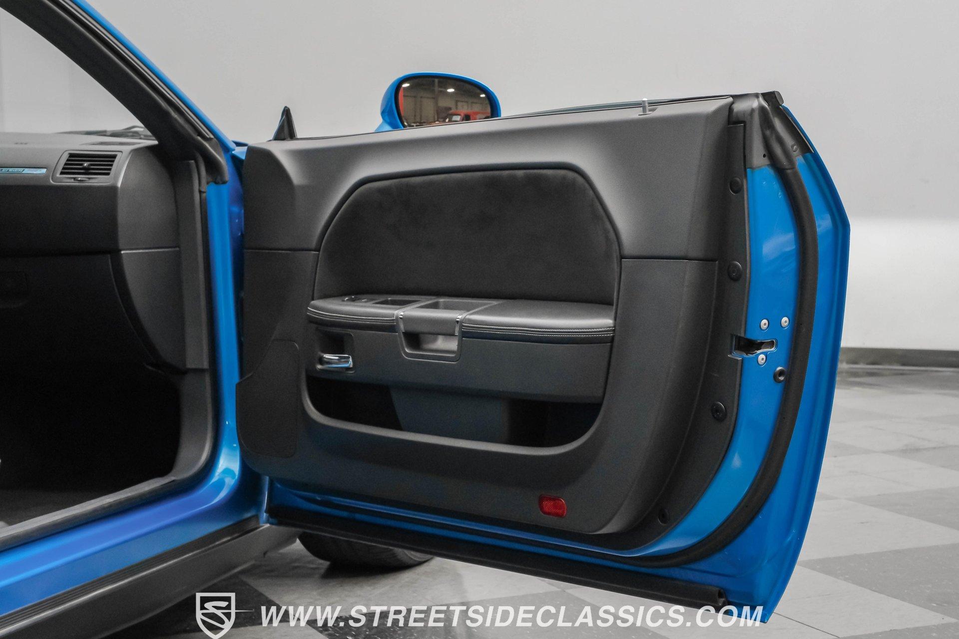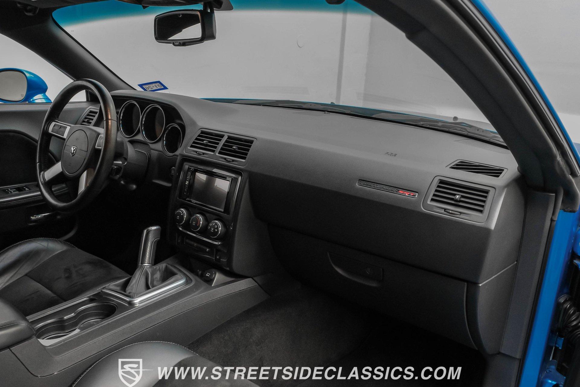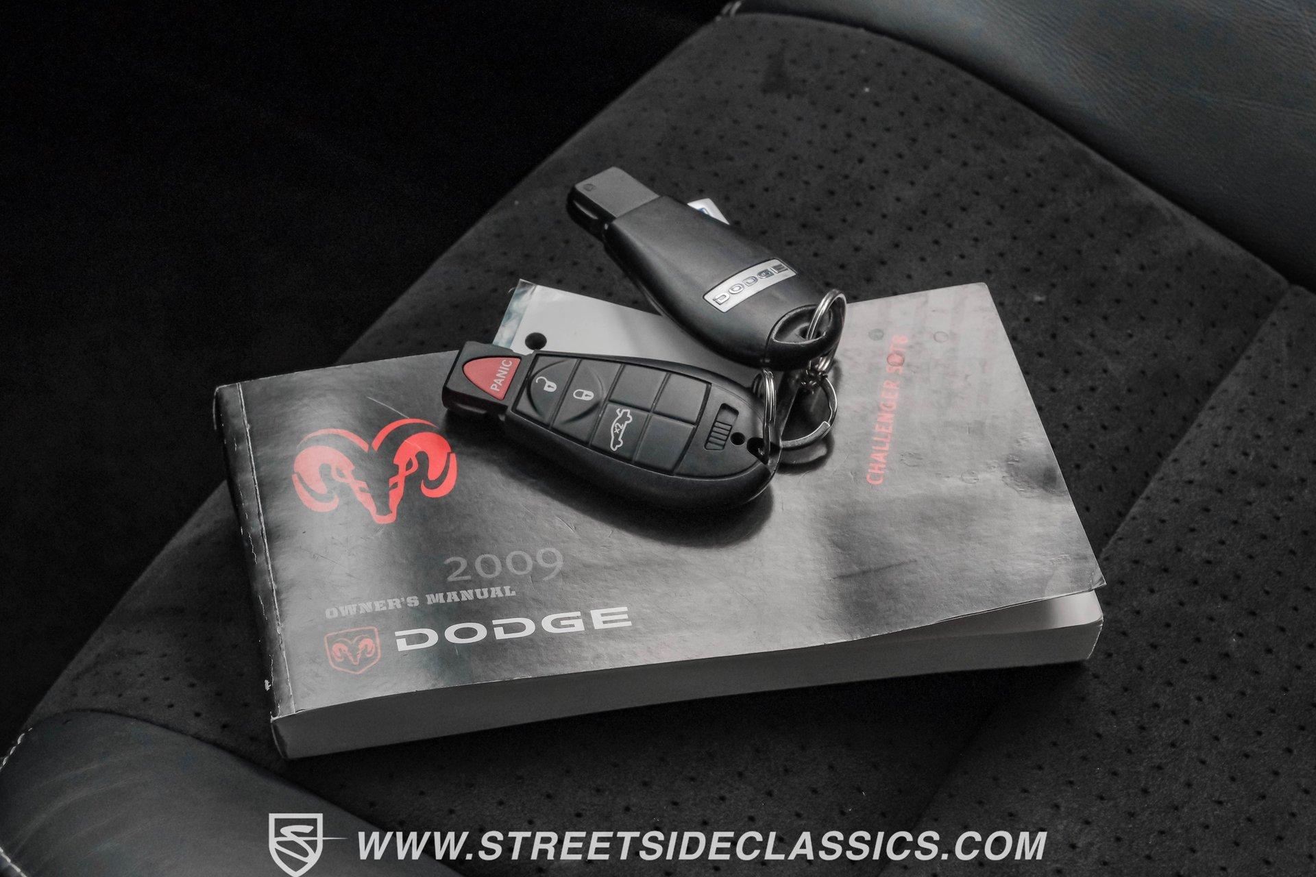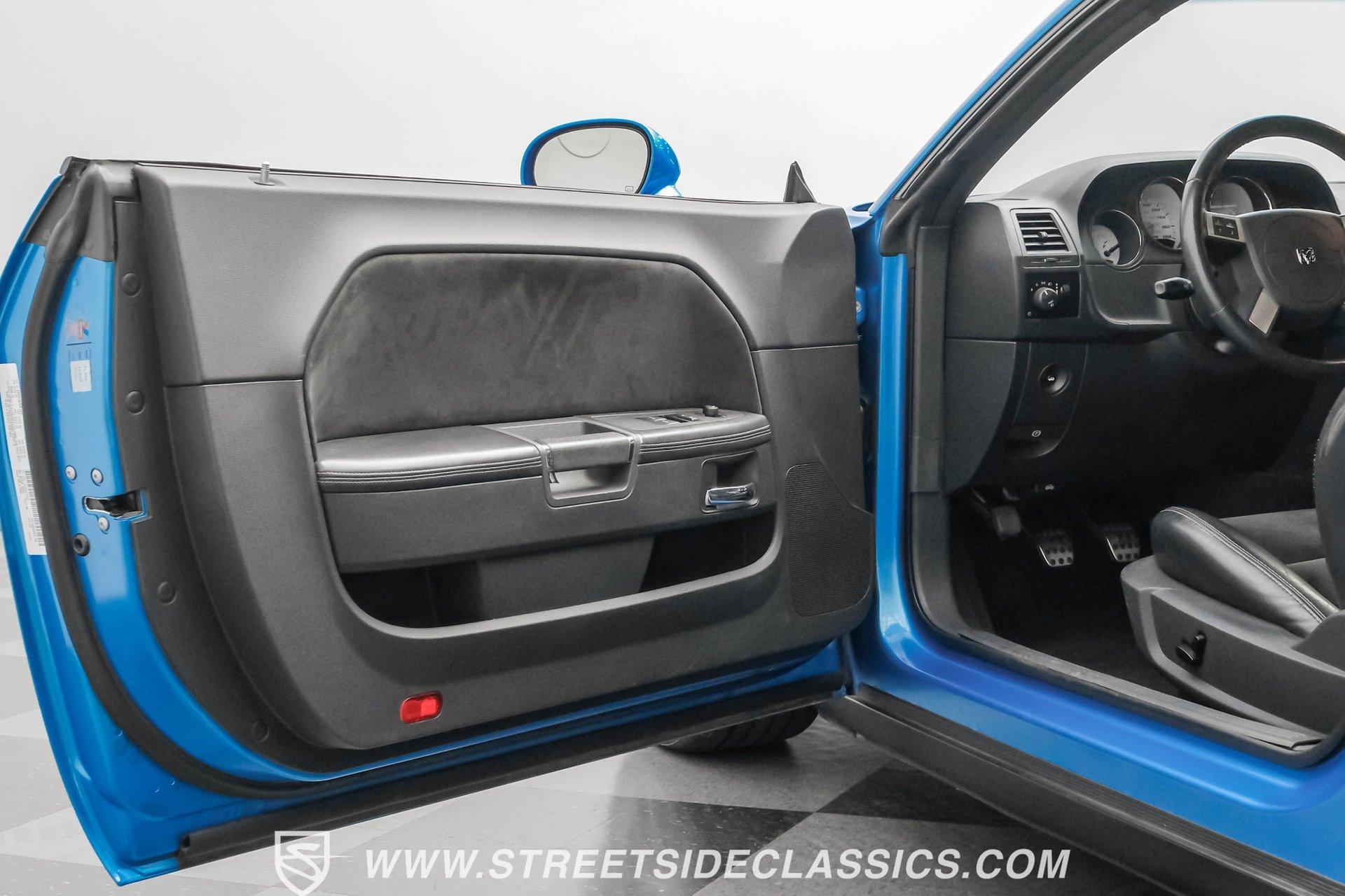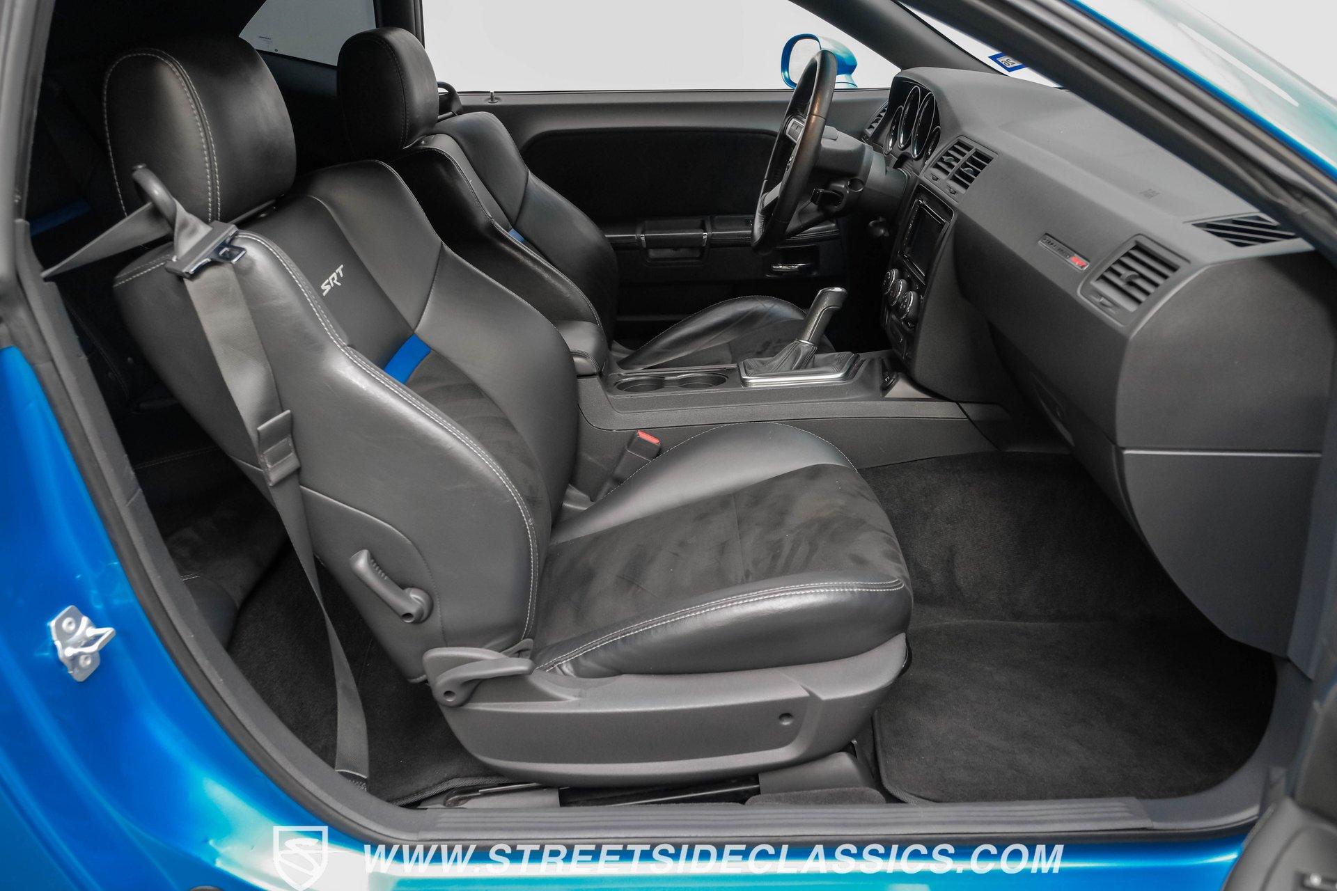 One look at this 2009 Dodge Challenger and you know it's a future classic. The tire-burning 425 hp HEMI V8 is a true modern interpretation of the best from the muscle car era, but now it comes with A/C, leather seats, sat-nav, and plenty of other comfortable features. This ultra-low mileage example is the perfect car to enjoy today and appreciate tomorrow. B5 Blue is not only a great factory color, but it is a throwback to the High Impact colors that helped make these Mopar muscle cars so striking back in the height of the muscle car era. This color is very rare as well. Only 236 B5 Blue SRT8 were produced for the 2009 model year, and of these, only 153 B5 colored SRT8 6-speeds were made according to ChallengerTalk.com. It is not just the paint that makes this one so special; it is the exceptional level of care. Averaging only less than 2,500 miles annually means this was someone's baby, and it shows in every inch of this car's shining presentation. Being a top-of-the-line SRT model, it is equipped with chin spoiler, classic fuel filler cap, carbon fiber hood stripes, HEMI vented hood complete w/callouts and the full-length spoiler - all clear indications this is a muscle car for the modern era. Dodge got the details right by striking a perfect balance between retro design and modern attraction. The wheels on this rare Challenger have been upgraded to 20-inch Milanni wheels wrapped with 245/45R20 Goodyear radials. Inside, the leather bucket seats with comfortable suede inserts match the rest of this deep black interior. It really lets you know this Challenger has a dark side, and there is even an aggressive blue streak across the seatbacks to back it all up. This is a loaded modern muscle machine with all the features you would expect, including power heated seats, heated mirrors, power windows, power locks, keyless entry and ignition, cruise control, dual airbags and side airbags. The AM/FM/CD/XM Bluetooth stereo is a premium touchscreen unit that includes everything from satellite navigation to a subwoofer speaker system. Highlights: Rare and desirable B5 Blue 32,196 miles from new 6.1-litre HEMI 425 Horsepower 6-Speed manual transmission 20-Inch Milanni wheels Goodyear Eagle RS tires Brembo 4-wheel disc brakes Leather interior Satellite navigation The SRT8 package includes a 6.1-liter HEMI V8 under the hood that growls to life like no other car out there, and with 425 hp and 420 lb-ft of torque straight from the factory, this one will outrun its muscle car ancestry. But serious power is only part of this car's story. As a modern computer-controlled and fuel-injected powerplant, it can settle into everyday life with ease. The smooth shifting 6-speed manual transmission makes this muscle car a thrill to drive. Great driving features such as the fully independent suspension, power steering, and big Brembo four-wheel disc brakes w/ABS add to the pleasurable driving experience. With low miles, a high level of quality and originality, as well as being one of only a handful of cars produced in classic B5 Blue, this 2009 Dodge Challenger SRT-8 is a rare and highly desirable example, presenting a unique opportunity to own one of the best of the breed. Call today!