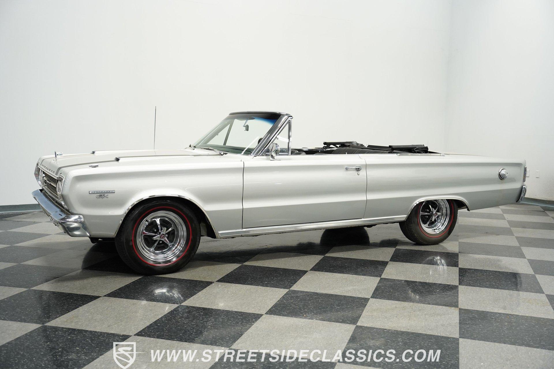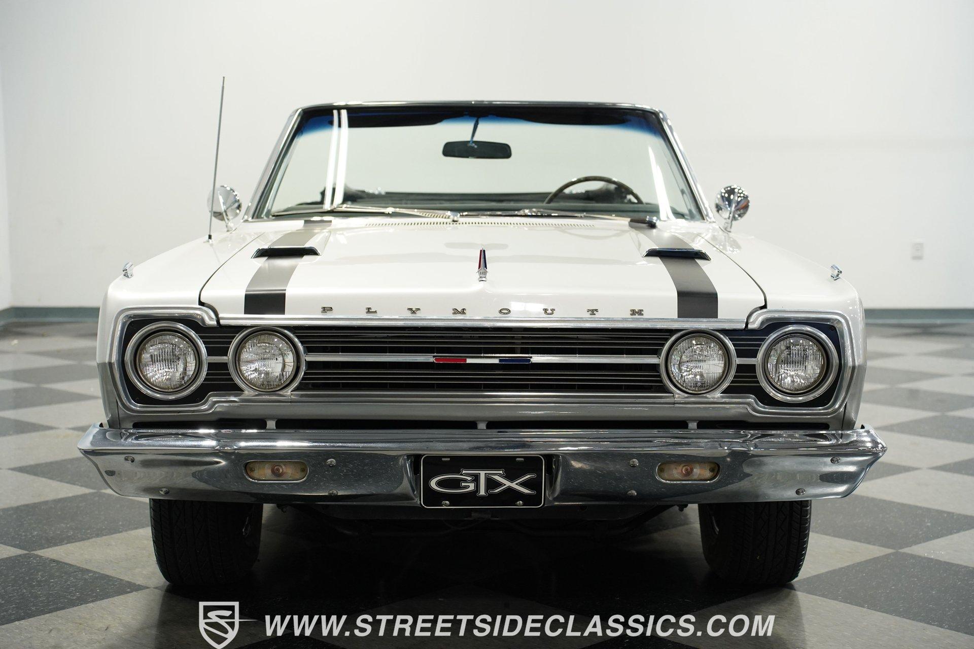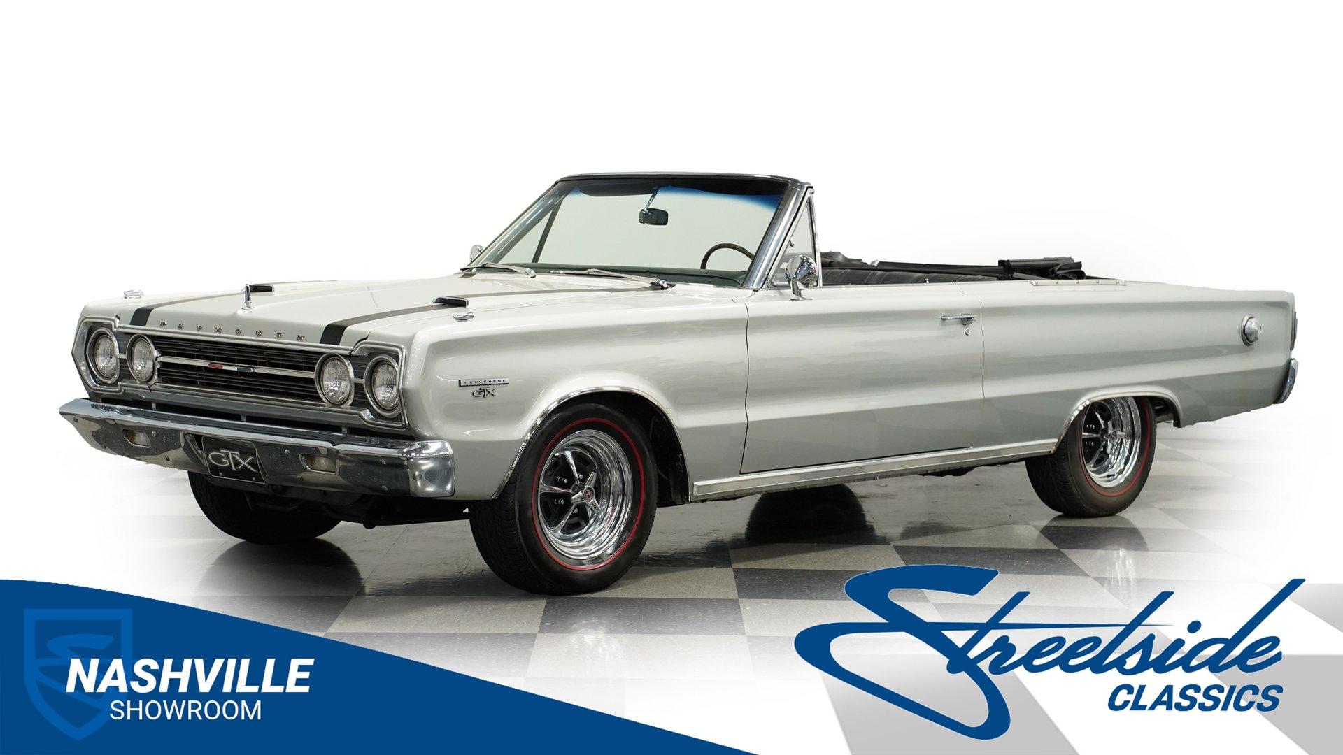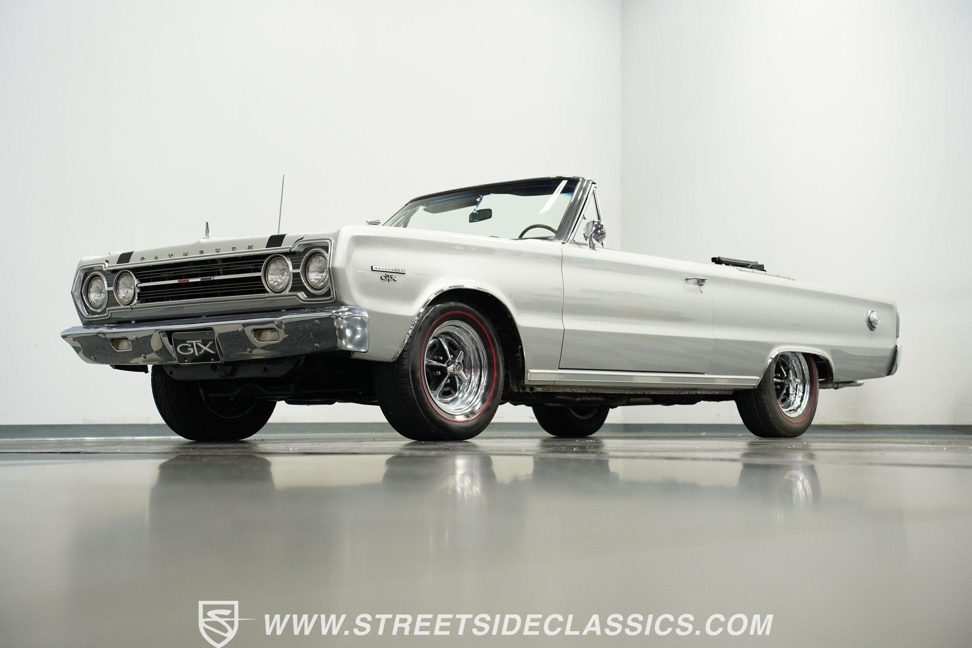 If style points were being awarded for 1960s muscle cars, then this 1967 Plymouth Belvedere GTX 440 Convertible would be at the top of the list. A sub-model of the Belvedere, the GTX debuted in 1967 and took everything Mopar fans liked about the base car and ratcheted it up to muscle car status. Fully repainted in its original Silver Metallic and complemented by dual full-length black racing stripes, this droptop looks ready to go from any angle, and with as few as 680 GTX convertibles made for its inaugural year, you're not likely to see another one of these any time soon. Inside, we find out why the GTX was oftentimes referred to as "the gentleman's muscle car." Restored to its factory black vinyl, its chrome trim gives this car an upmarket vibe. Its three-spoke, wood-rimmed, power-assisted steering wheel sits just ahead of a five-pod rectangular gauge cluster, featuring a large, easy-to-read 150 mph speedometer that takes center stage, while a pair of auxiliary gauges flank it on either side. An original-looking AM radio works well, while a rotary-knob-based setup is used for HVAC controls to keep things simple and easy. Under that expansive scooped hood, we find a (believed) original 440 cubic-inch V-8 engine. Topped with a single four-barrel Carter carburetor, this big V-8 is believed also to contain its stock internals. That massive power is routed through an A727 TorqueFlite three-speed automatic transmission before heading out to an 8.75-inch rear end that houses a set of 3.23:1 gears. Those ponies are transferred to the pavement via a set of 15-inch Magnum 500 wheels shod in 255/70R-15 Redline tires. First Year GTX One of Approx 680 Convertibles Made for 1967 Numbers Matching 440 CID V8 Believed Stock Internals A727 TorqueFlite Carter Four Barrel Carb 3.23 Rear Gears Power Brakes Power Steering Magnum 500 Wheels Redline Tires Full Silver Metallic Repaint Black Racing Stripes Power Top This 1967 Plymouth Belvedere GTX 440 Convertible comes equipped with a factory heavy-duty suspension. Featuring heavy-duty shocks, six-leaf rear springs, front torsion bars, and ball joints, this optional setup enables the GTX to handle more aggressively and ride better than many of its contemporaries. If you want a Golden Age numbers-matching muscle car that is as scarce as it is fun, and also happens to have one of the coolest names in the history of the autoverse, this is the one you've been waiting for. Don't wait, call today!