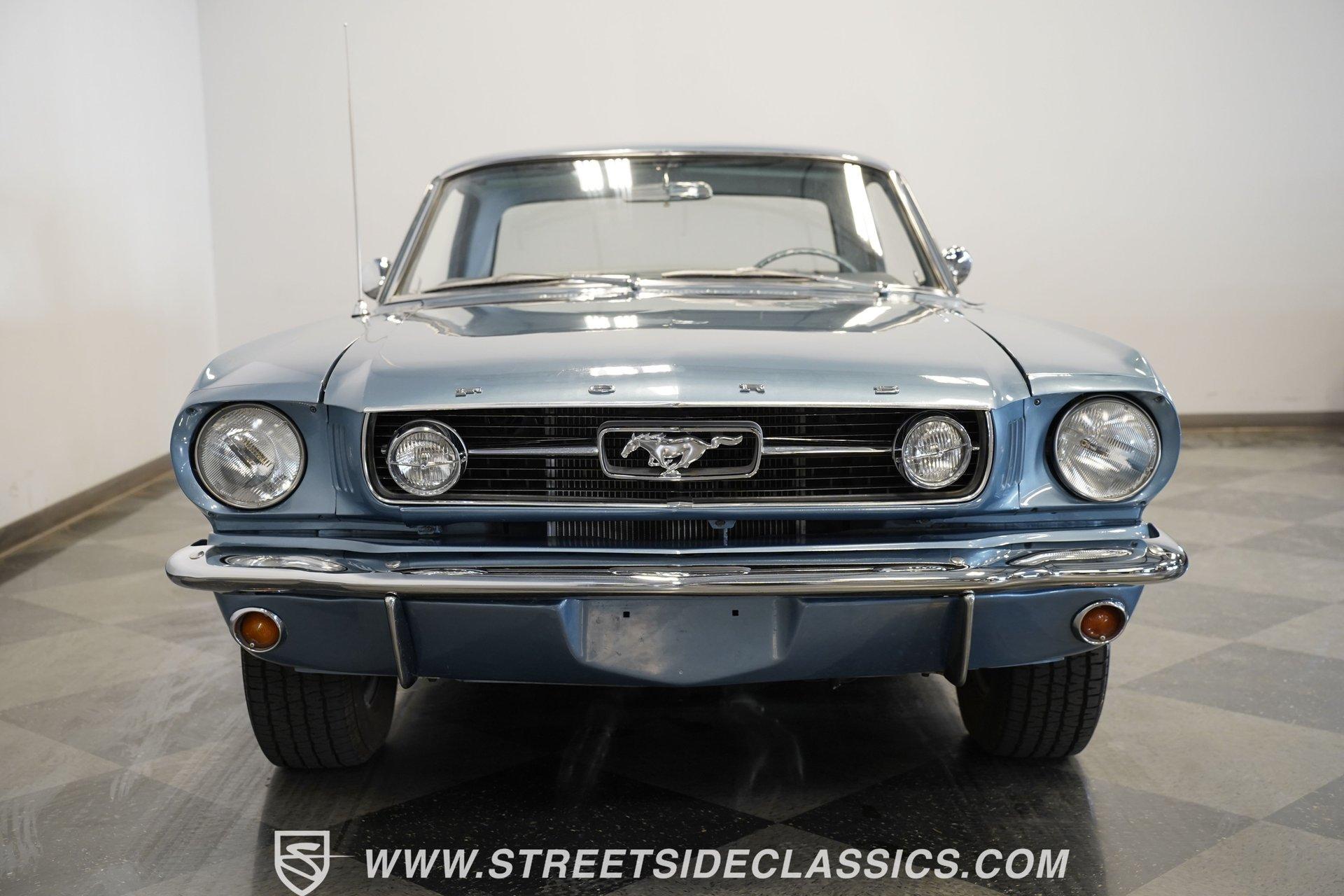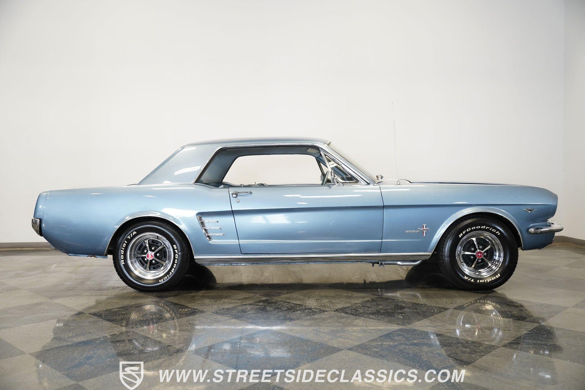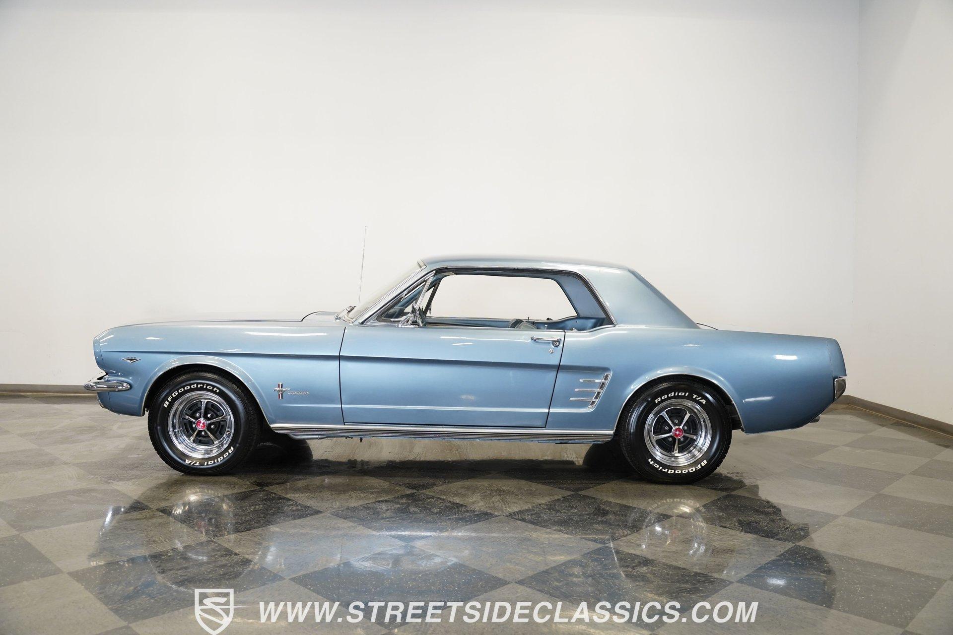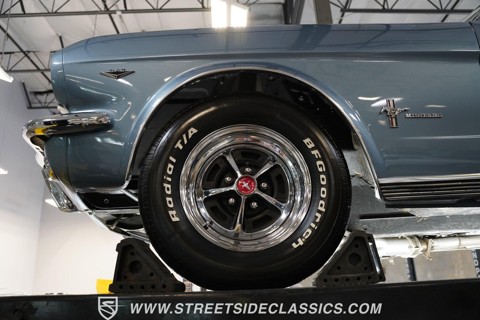 Arguably, the only thing that may make rowing through the gears of a first-generation Pony Car is driving behind the wheel of a classic muscle car that has been the beneficiary of a few modern upgrades. This particular 1966 Ford Mustang comes decked out in a full Silver Blue repaint, which complements the GT-style front grille, fog lights, and rear valance. And as pretty as this Mustang is on the surface, it is what lies under that shimmering exterior that makes this car a genuine Grand Tourer. Inside, we find a gorgeous blue and white Pony Interior. An aftermarket center console provides storage, a comfortable armrest, and a pair of cup holders. The GT theme is continued with a five-pod gauge cluster, along with a column-mounted tachometer offset to the left of the steering wheel. A sneaky retro-style head unit resembles an AM radio, but actually offers satellite and Bluetooth connectivity, a CD player, and an AUX input providing all the soundtrack options anyone could wish for. The real soundtrack, however, is situated beneath that steel hood. A Blueprint Engines 347 cubic-inch stroker V-8 engine. Equipped with Blueprint aluminum heads, a performance-oriented cam, a Holley four-barrel carburetor, a Blueprint aluminum intake manifold, and long-tube headers, this built small block has been dyno-proven to produce 416 horsepower and 433 pound-feet of torque at the rear wheels. That massive power is routed through a Tremec TR3551 five-speed manual transmission before being sent out to an eight-inch rear end. HIGHLIGHTS: Full Silver Blue Repaint GT Style Grille GT Style Fog Lights GT Style Rear Valance Blueprint 347 Stroker V8 Holley Four Barrel Blueprint Aluminum Heads Performance Cam Blueprint Aluminum Intake Long Tube Headers FlowMasters 416 RWHP 433 RWTQ Tremec Five Speed Manual Magnum 500 Wheels BFG Tires Pony Interior GT Style Gauges Column Mounted Tach AM/FM/CD/AUX/Satellite Bluetooth Center Console Cupholders This 1966 Ford Mustang rides on a suspension consisting of an independent front and a solid axle, leaf spring rear. The front end benefits from the addition of a beefed-up sway bar and a strut tower brace. Trick 14-inch Magnum 500 wheels are shod in 215/70R-14 BFGoodrich rubber, providing a solid contact patch for all those galloping ponies under the hood. If you've never experienced the thrill of a classic Pony Car, this restomodded Mustang will help you make up for lost time and then some. But don't wait, call today!