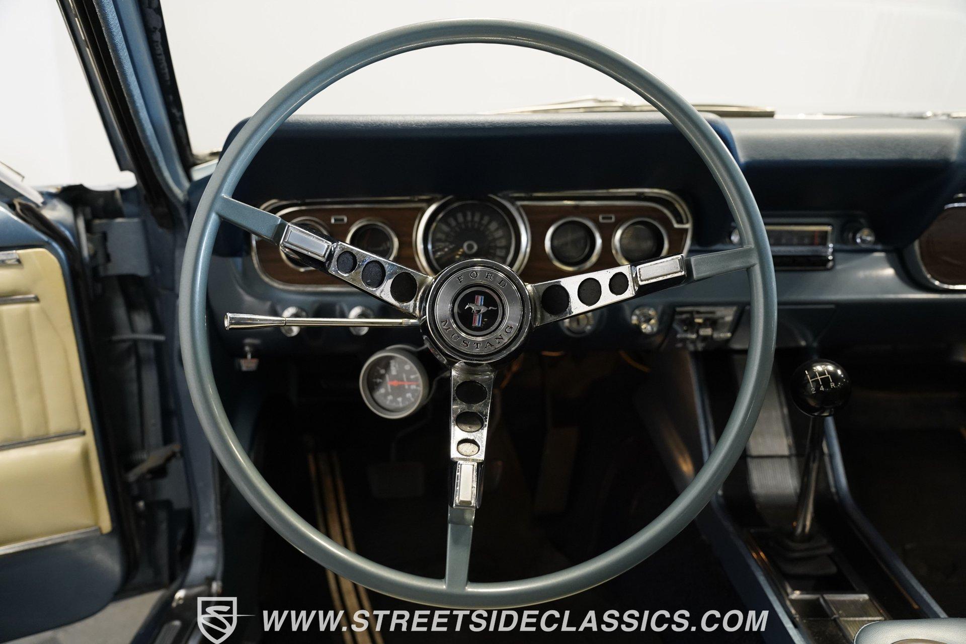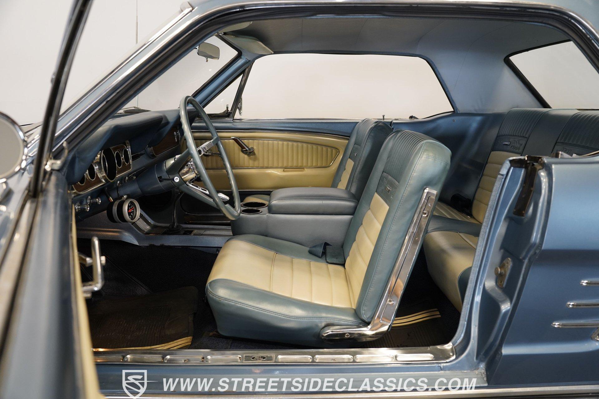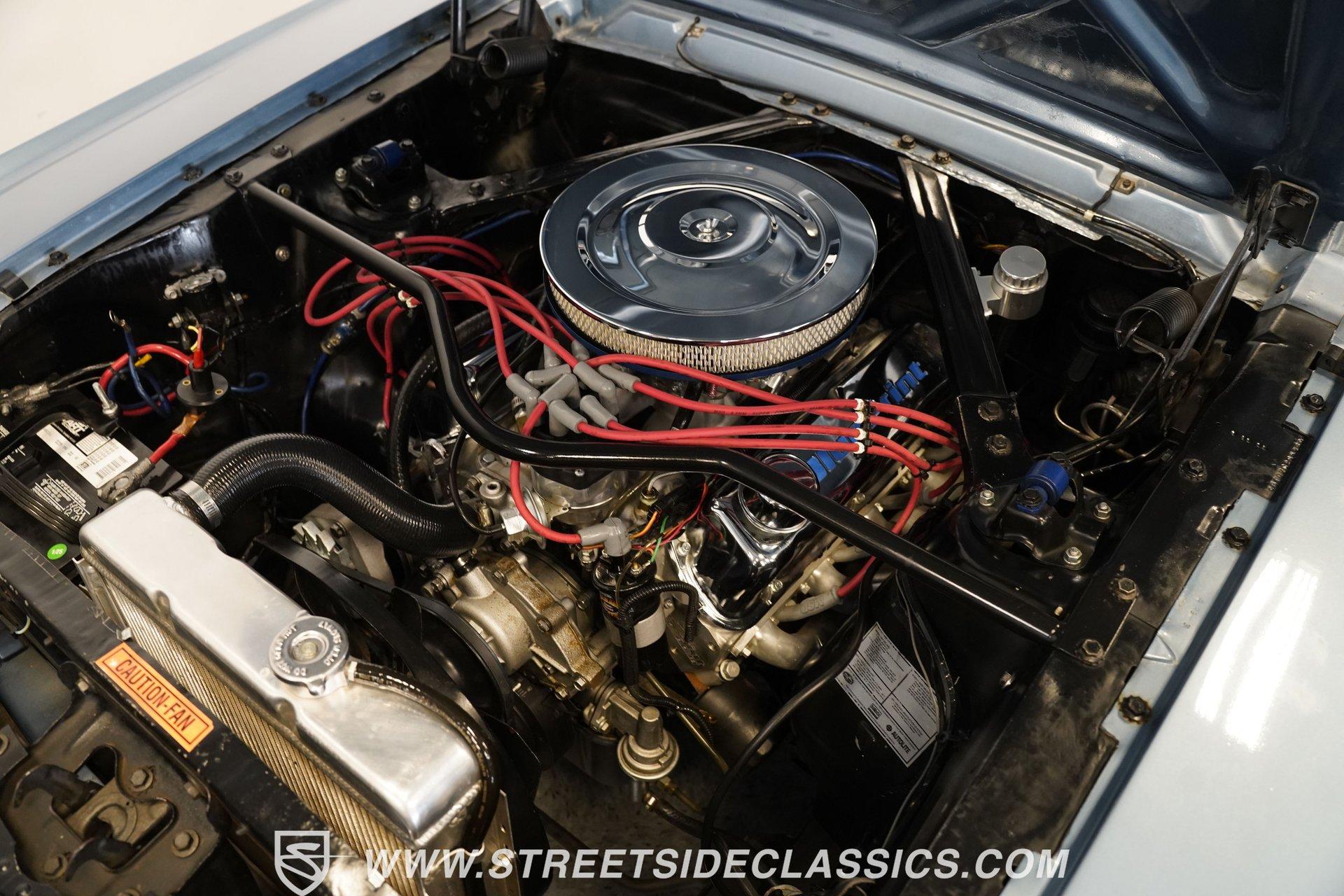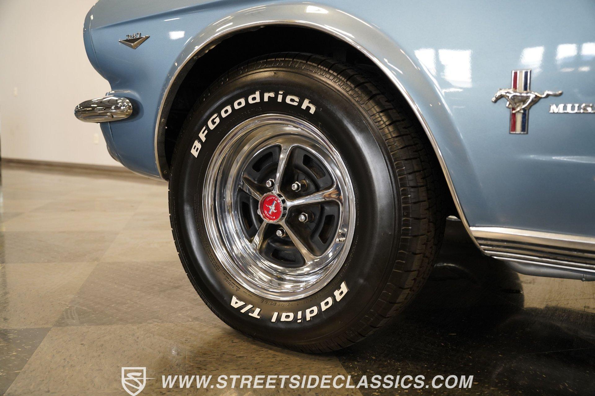 Arguably, the only thing that may make rowing through the gears of a first-generation Pony Car is driving behind the wheel of a classic muscle car that has been the beneficiary of a few modern upgrades. This particular 1966 Ford Mustang comes decked out in a full Silver Blue repaint, which complements the GT-style front grille, fog lights, and rear valance. And as pretty as this Mustang is on the surface, it is what lies under that shimmering exterior that makes this car a genuine Grand Tourer. Inside, we find a gorgeous blue and white Pony Interior. An aftermarket center console provides storage, a comfortable armrest, and a pair of cup holders. The GT theme is continued with a five-pod gauge cluster, along with a column-mounted tachometer offset to the left of the steering wheel. A sneaky retro-style head unit resembles an AM radio, but actually offers satellite and Bluetooth connectivity, a CD player, and an AUX input providing all the soundtrack options anyone could wish for. The real soundtrack, however, is situated beneath that steel hood. A Blueprint Engines 347 cubic-inch stroker V-8 engine. Equipped with Blueprint aluminum heads, a performance-oriented cam, a Holley four-barrel carburetor, a Blueprint aluminum intake manifold, and long-tube headers, this built small block has been dyno-proven to produce 416 horsepower and 433 pound-feet of torque at the rear wheels. That massive power is routed through a Tremec TR3551 five-speed manual transmission before being sent out to an eight-inch rear end. HIGHLIGHTS: Full Silver Blue Repaint GT Style Grille GT Style Fog Lights GT Style Rear Valance Blueprint 347 Stroker V8 Holley Four Barrel Blueprint Aluminum Heads Performance Cam Blueprint Aluminum Intake Long Tube Headers FlowMasters 416 RWHP 433 RWTQ Tremec Five Speed Manual Magnum 500 Wheels BFG Tires Pony Interior GT Style Gauges Column Mounted Tach AM/FM/CD/AUX/Satellite Bluetooth Center Console Cupholders This 1966 Ford Mustang rides on a suspension consisting of an independent front and a solid axle, leaf spring rear. The front end benefits from the addition of a beefed-up sway bar and a strut tower brace. Trick 14-inch Magnum 500 wheels are shod in 215/70R-14 BFGoodrich rubber, providing a solid contact patch for all those galloping ponies under the hood. If you've never experienced the thrill of a classic Pony Car, this restomodded Mustang will help you make up for lost time and then some. But don't wait, call today!