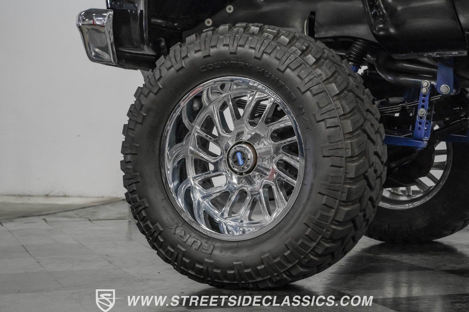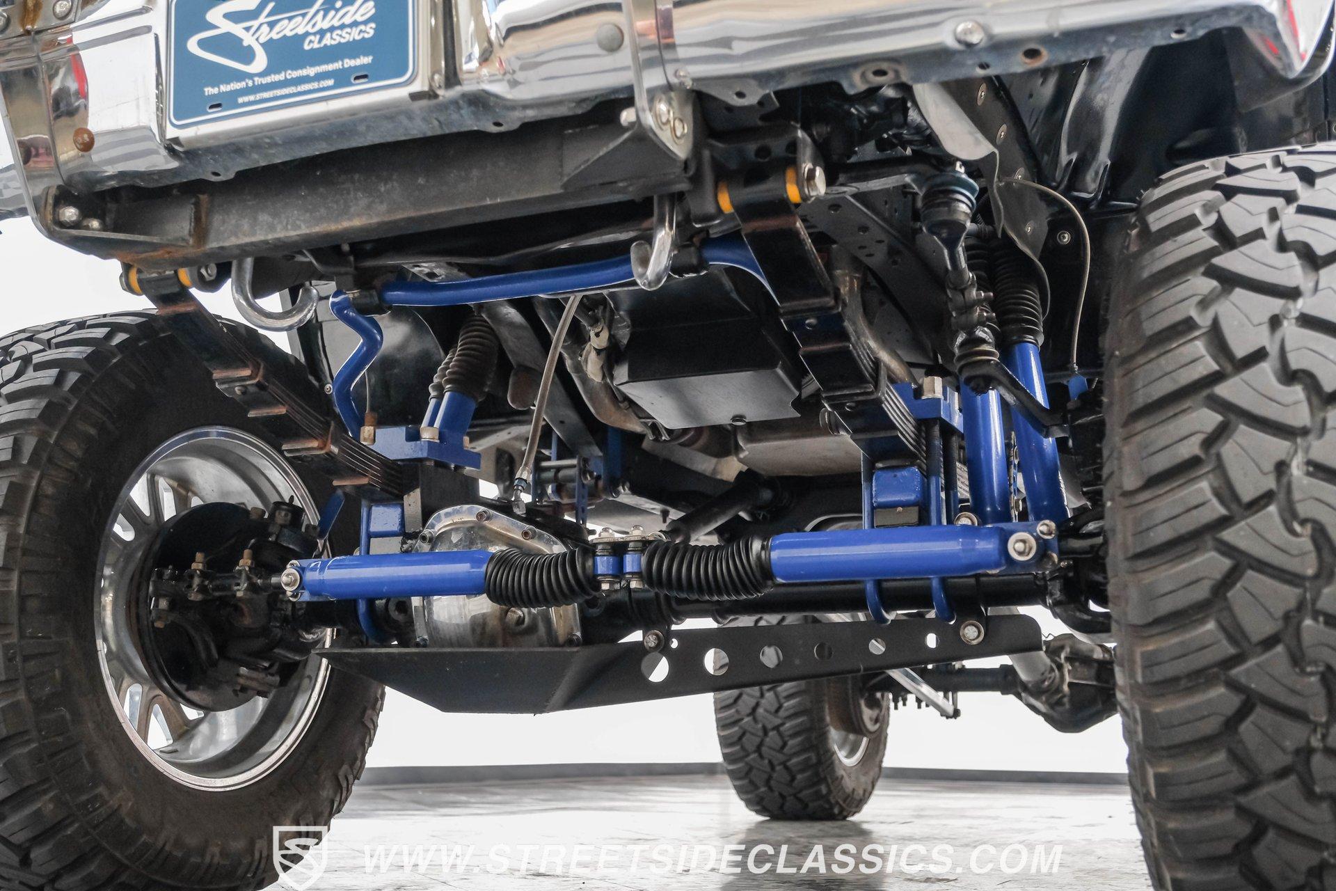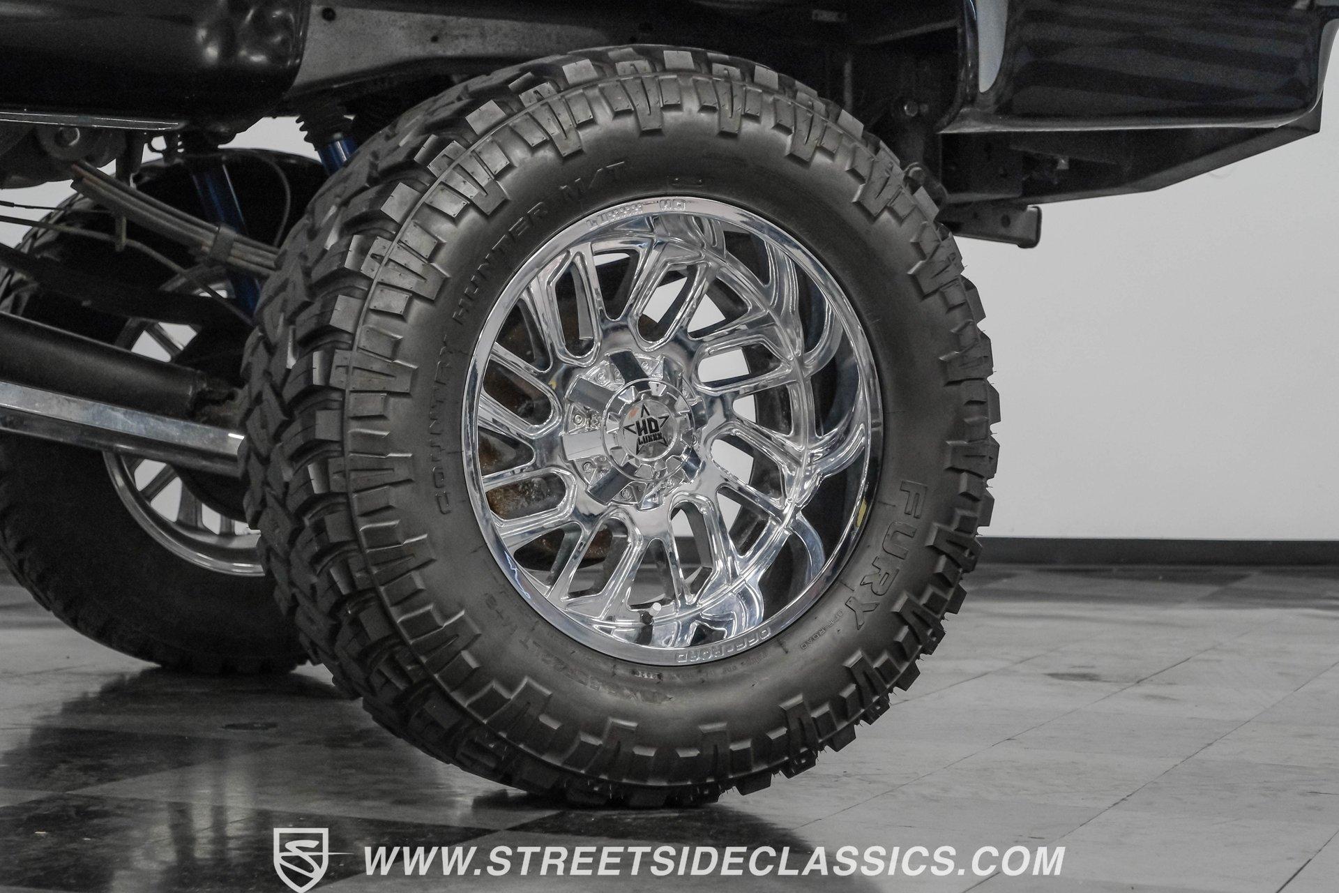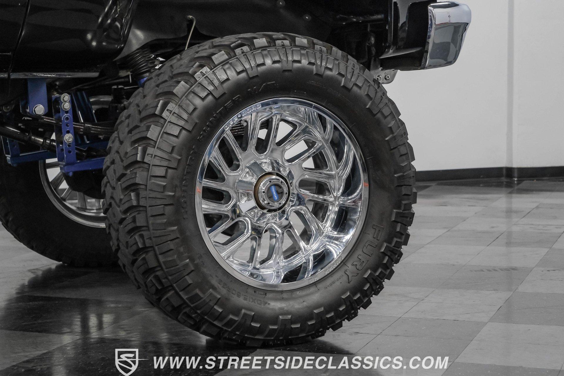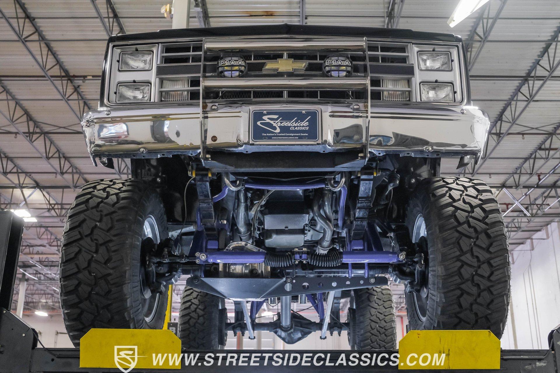 Here is one big, big truck that looks awesome and mean at the same time. It's a 1986 Chevrolet K30 Silverado 4x4 that has all the goodies a truck enthusiast would want. The paint job is excellent and pairs perfectly with the chrome. The wheels and tires give this beast a menacing look, and with four-wheel drive, it probably can go anywhere it wants. The chrome front bumper looks great and the rear has a flush mounted black steel custom bumper, and when you tie that in with the cowl induction hood, you have one well-put-together truck. There are also clearance lights on top and PIAA lights on the grille for added visibility. And for extra protection, it comes with a spray-in bed liner and two functional fuel tanks. The interior is very nicely done with a Charcoal Gray and Black color theme. The gauge cluster holds its original configuration, with a mounted AutoGauge tachometer on top of the dashboard. Just off to the right are your heat and air conditioning controls, and below that is a JVC AM/FM radio with Aux inputs and Bluetooth. For steering, you get a GT steering wheel and a tilt steering column with column shifting, while engaging four-wheel drive requires the floor shifter. The bench seats look to be in very good shape, as do the dash, headliner, carpets, and door panels. And along with the bench seat, it features a center console above for those little things you usually keep in one. A big truck like this needs big power, and that's exactly what this Chevy has. Under the hood is a BluePrint 540 cubic-inch crate engine that's been dynoed at 704 horsepower and 703 lb-ft of torque. This engine is equipped with aluminum BluePrint heads, a healthy cam, and a Weiand intake with a Holley 4-barrel carburetor. Power is sent through a TH400 transmission that connects to axles that harbor 4.56 gears. For suspension, both the front and rear use leaf springs and shocks-two sets of shocks per side in the front and three shocks per side in the rear. This beautiful truck rides on 22-inch Luxx wheels wrapped in massive 40x15.50R22 Fury tires. Front power disc brakes combined with rear power drum brakes bring this beast to a stop. And for a sound that matches its monstrous vibe, the engine exhales through long-tube headers, dual exhaust, and a set of Flowmasters. Highlights: BluePrint 540 Cubic-Inch Crate Engine Dynoed At 704 Horsepower And 703 LB-FT Of Torque (With Dyno Sheet) Aluminum BluePrint Heads Healthy Camshaft Weiand Intake With Holley 4-Barrel Carburetor TH400 4-Speed Transmission 4.56 Gears Front And Rear Leaf Springs Two Shocks In The Front On Each Side And Three On Each Side For The Rear Front Power Disc Brakes 22-Inch Luxx Wheels With 40x15.50R22 Fury Tires Power Windows And Locks Functional Dual Fuel Tanks Heat And Air Conditioning Tilt Steering Wheel Overhead Console For Storage Aftermarket Rearview Mirror With Temp Readouts and Compass GT Steering Wheel Aftermarket Clearance Lights And PIAA Lights Big, bold, and in control-that's what this 1986 Chevrolet K30 Silverado 4x4 is all about. If you like driving above traffic, you'll feel like the king of the road in this monster. For more info, Call Us Today!
